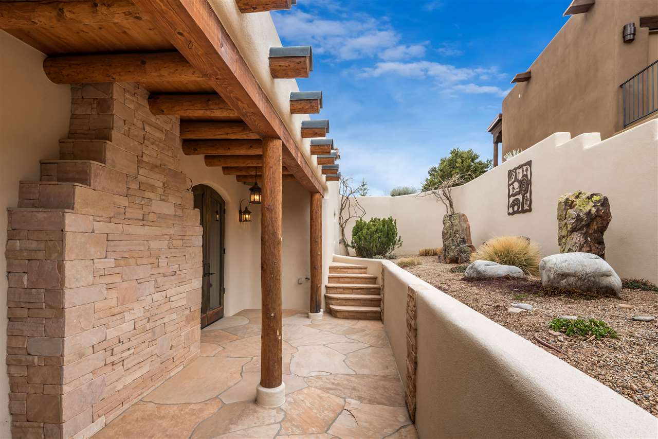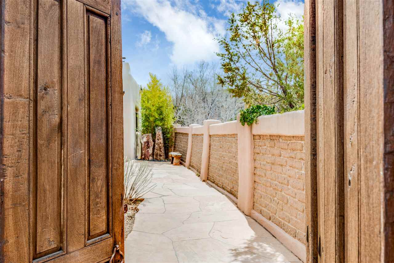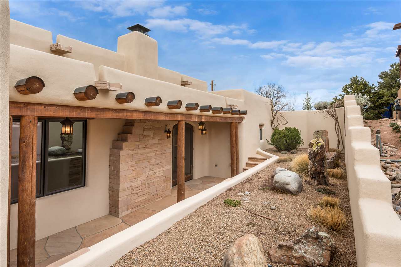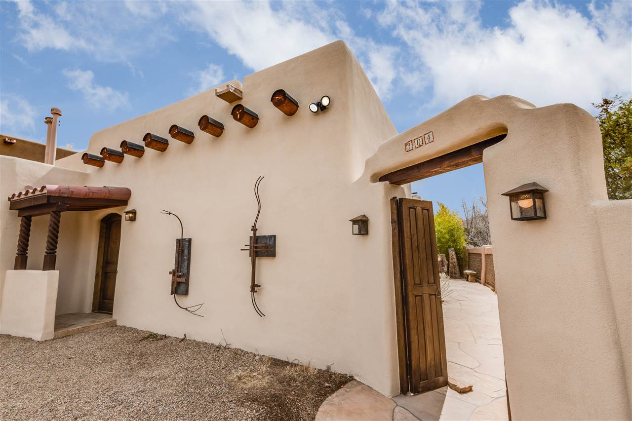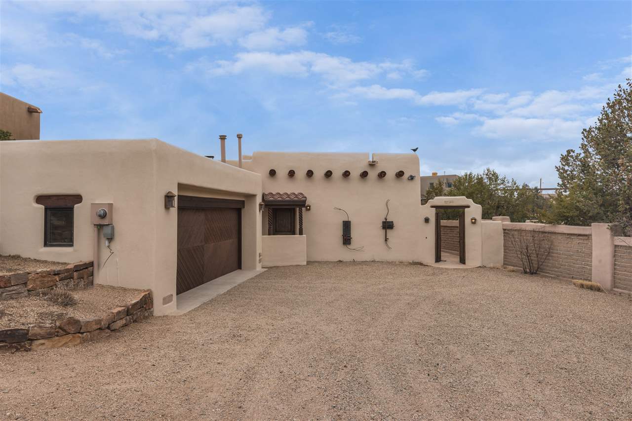 FANTASTIC DOWNTOWN LIVING OPPORTUNITY - this 3 BR home on upper Callecita Place up the hill from Fort Marcy off Bishops Lodge Road showcases extraordinary architectural features including high ceilings in the living room, plaster walls, numerous fireplaces, gated entry courtyard, private portals, patios, and gardens with thoughtful, low maintenance landscaping, a sophisticated gourmet kitchen with granite countertops and copper sinks, and a large wine cooler within the pantry. A two car garage, multi-purpose extensive laundry room, and an expansive, surprising view of daily sunsets and the western sky further add to the appeal and grandeur of this north side home. All on one level (NO STEPS), this is easy living and Santa Fe style at its best.