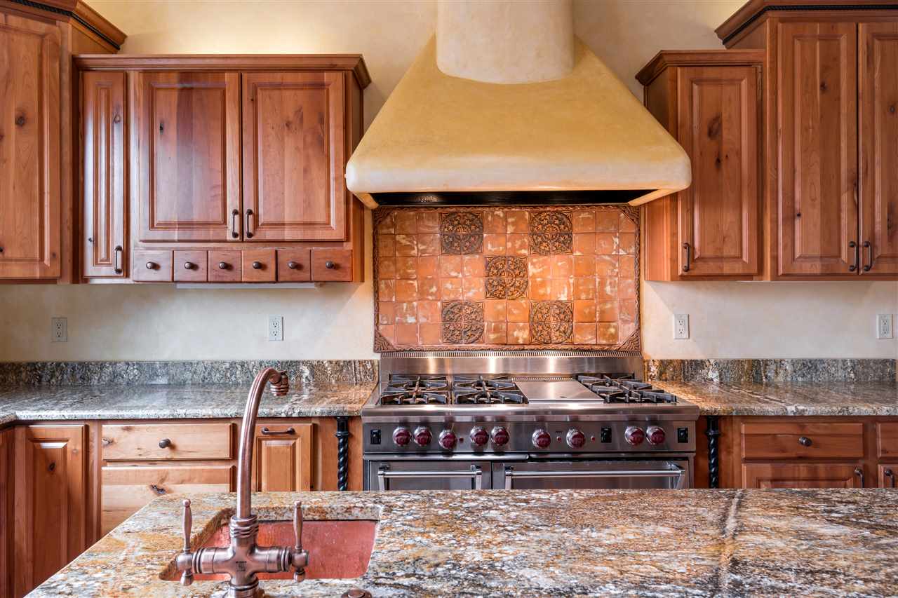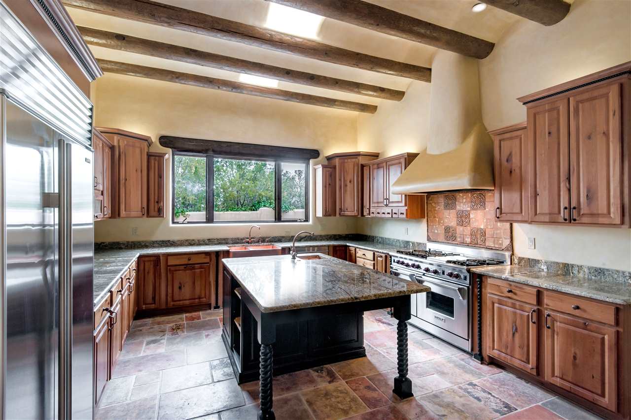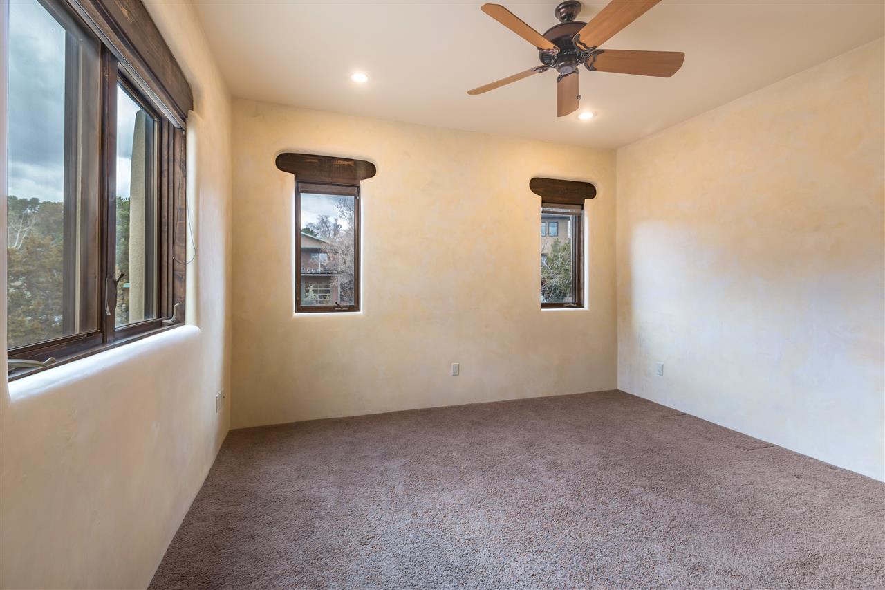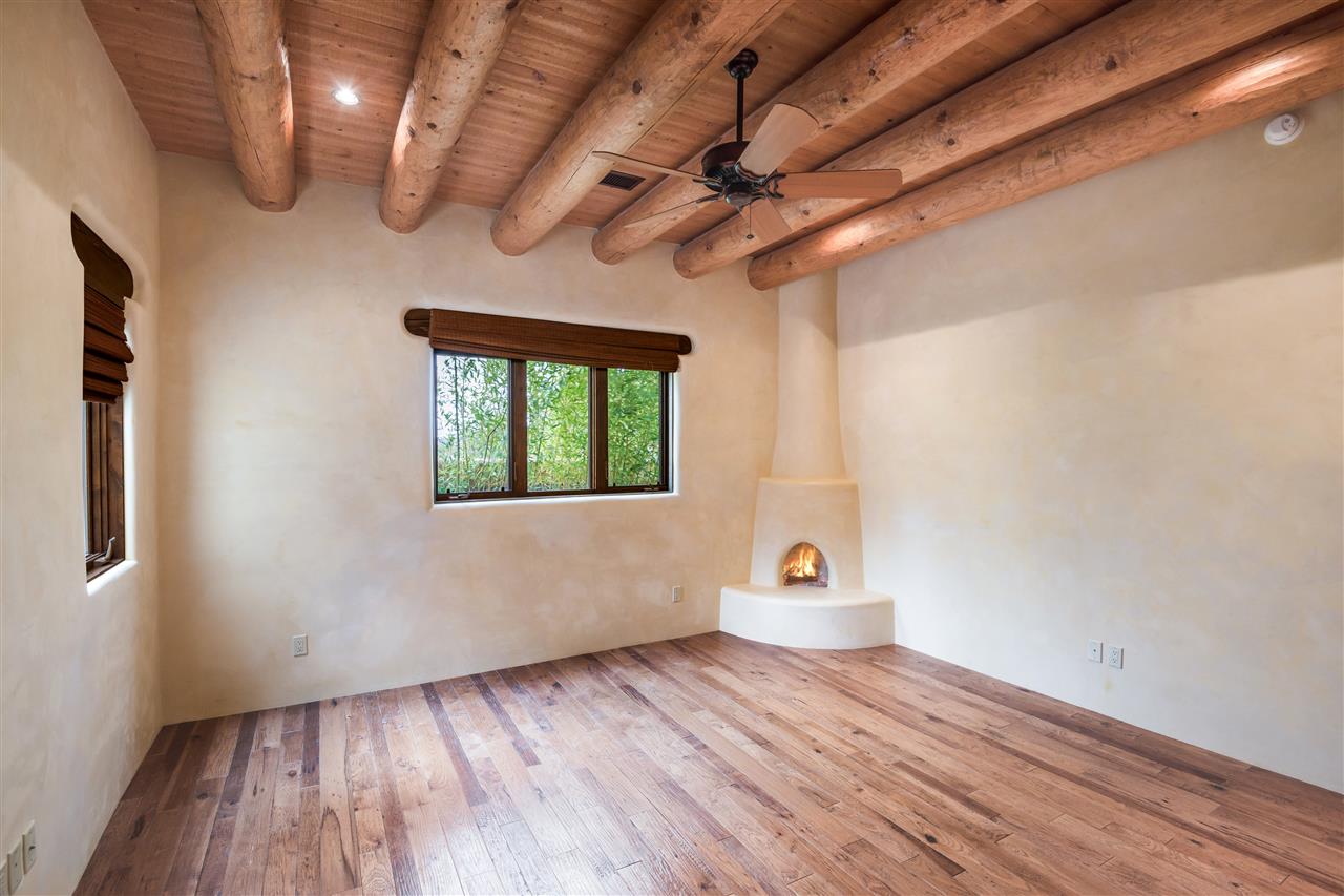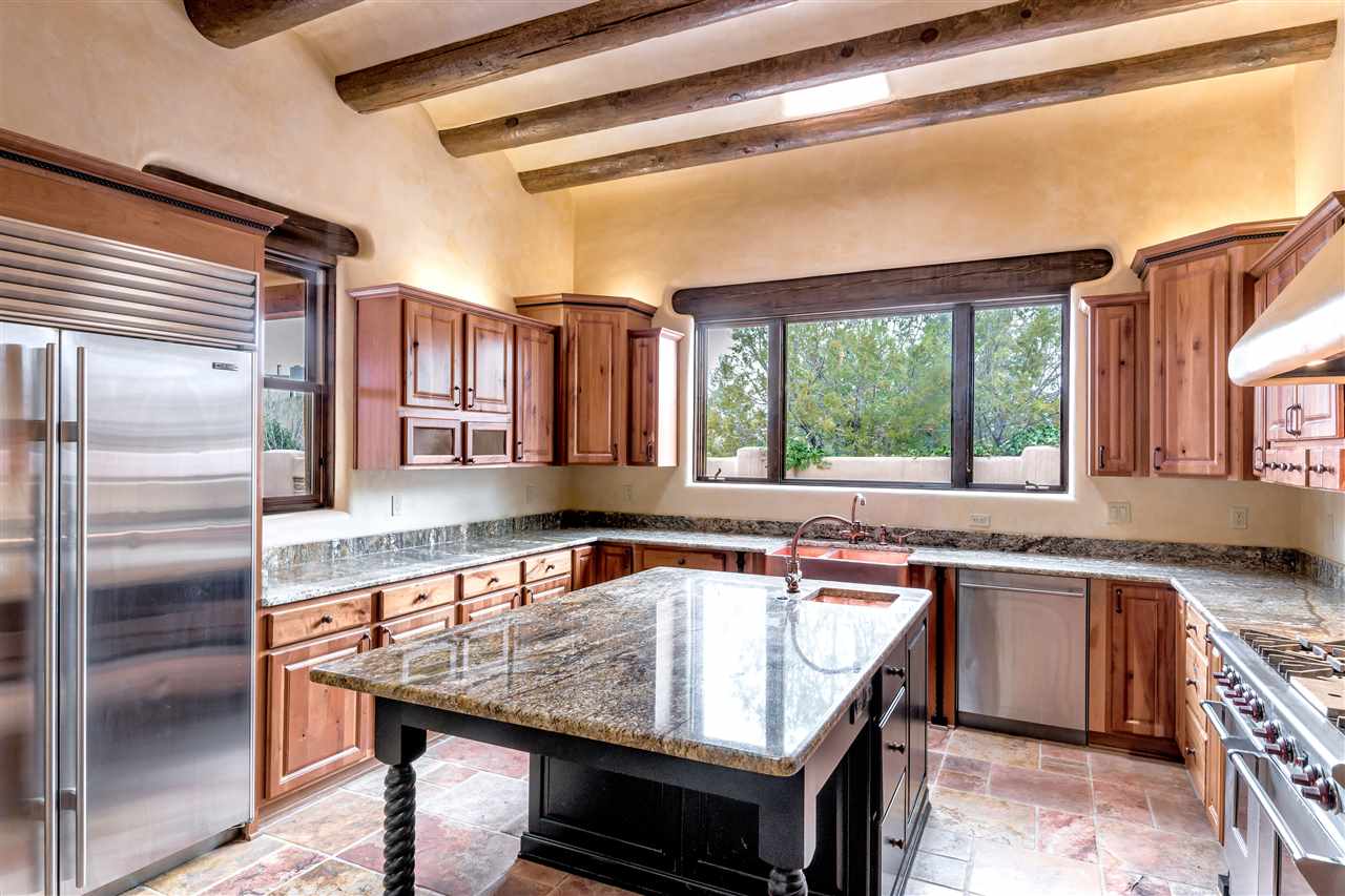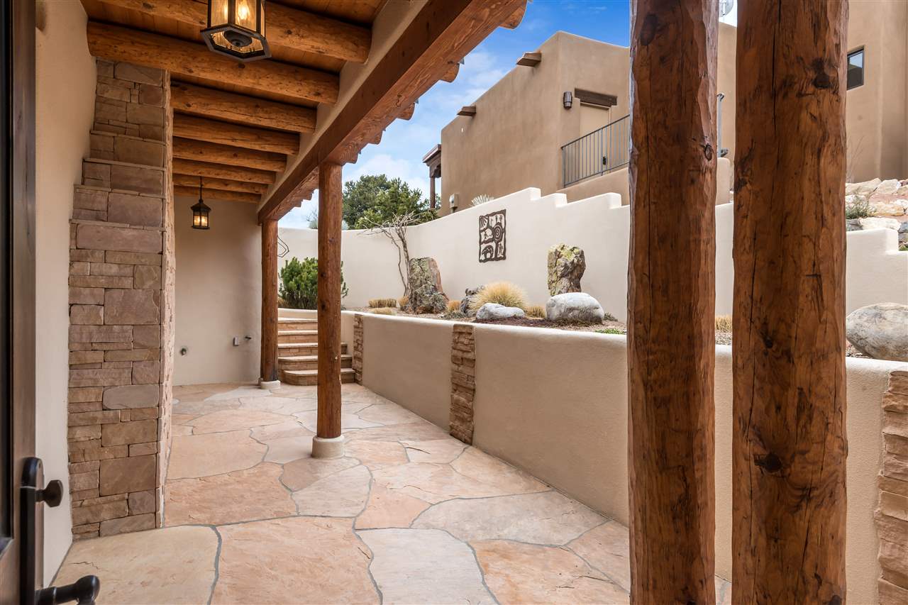 FANTASTIC DOWNTOWN LIVING OPPORTUNITY - this 3 BR home on upper Callecita Place up the hill from Fort Marcy off Bishops Lodge Road showcases extraordinary architectural features including high ceilings in the living room, plaster walls, numerous fireplaces, gated entry courtyard, private portals, patios, and gardens with thoughtful, low maintenance landscaping, a sophisticated gourmet kitchen with granite countertops and copper sinks, and a large wine cooler within the pantry. A two car garage, multi-purpose extensive laundry room, and an expansive, surprising view of daily sunsets and the western sky further add to the appeal and grandeur of this north side home. All on one level (NO STEPS), this is easy living and Santa Fe style at its best.