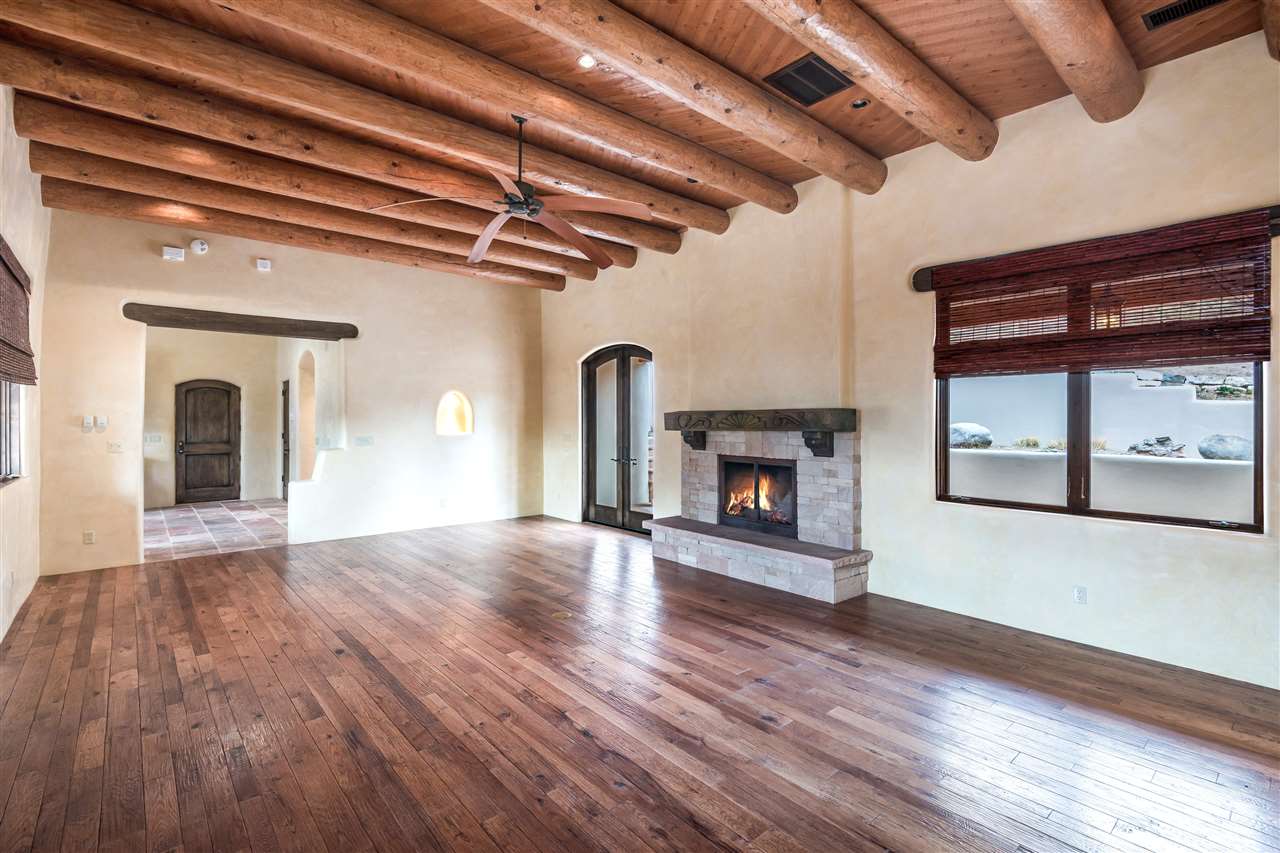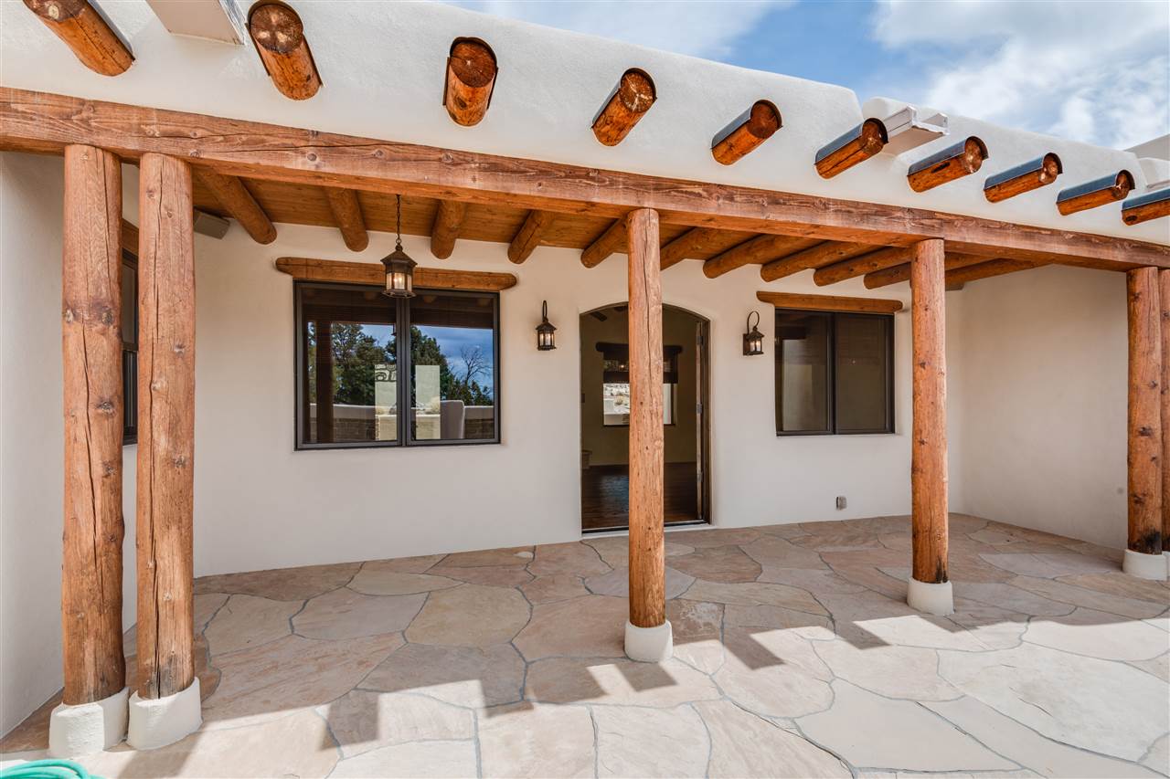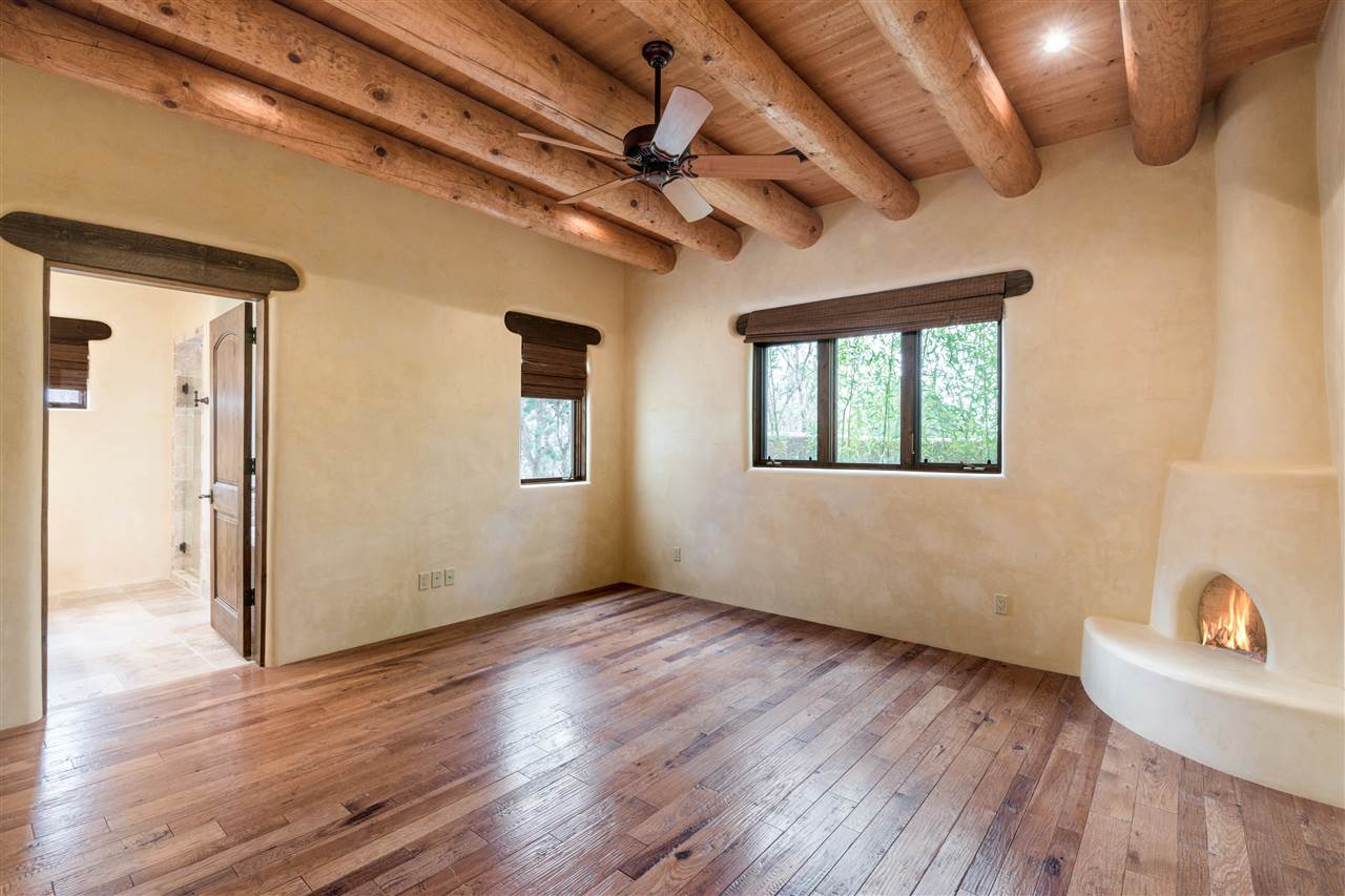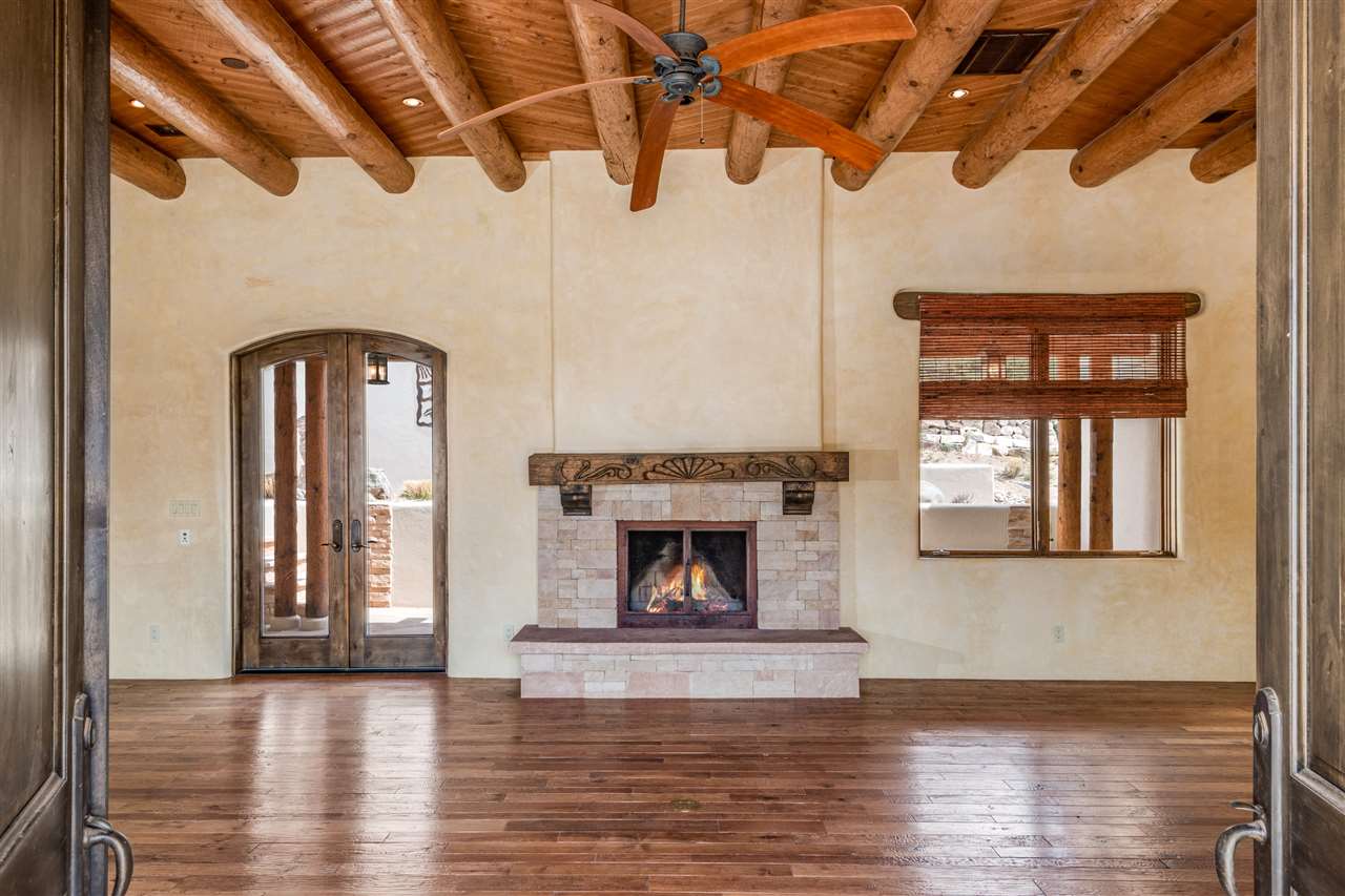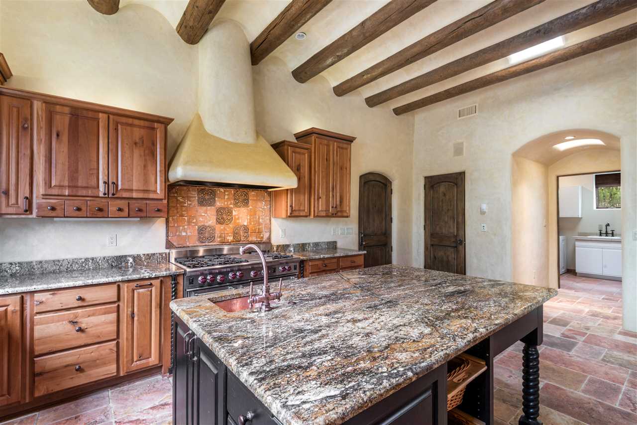 FANTASTIC DOWNTOWN LIVING OPPORTUNITY - this 3 BR home on upper Callecita Place up the hill from Fort Marcy off Bishops Lodge Road showcases extraordinary architectural features including high ceilings in the living room, plaster walls, numerous fireplaces, gated entry courtyard, private portals, patios, and gardens with thoughtful, low maintenance landscaping, a sophisticated gourmet kitchen with granite countertops and copper sinks, and a large wine cooler within the pantry. A two car garage, multi-purpose extensive laundry room, and an expansive, surprising view of daily sunsets and the western sky further add to the appeal and grandeur of this north side home. All on one level (NO STEPS), this is easy living and Santa Fe style at its best.