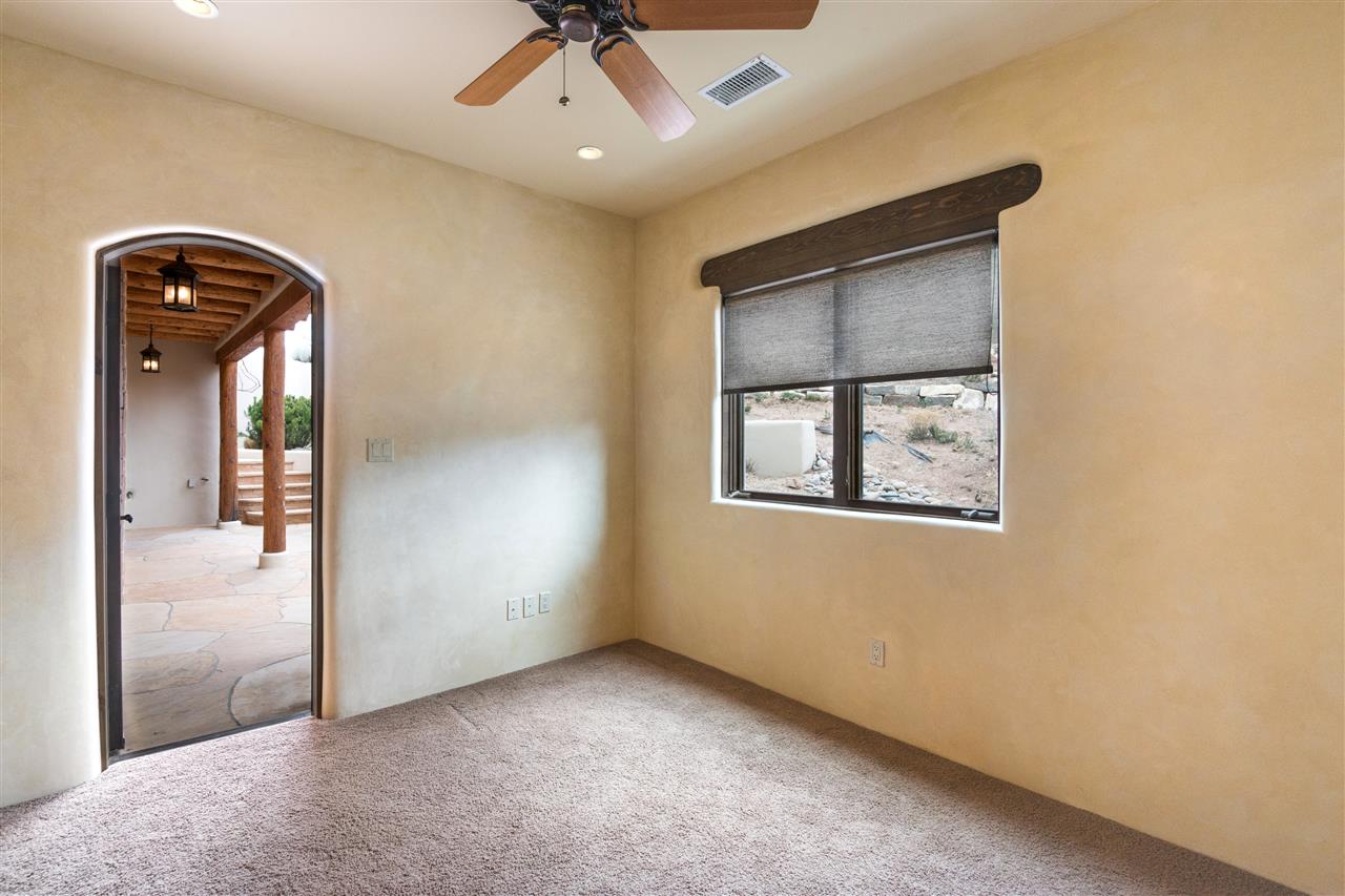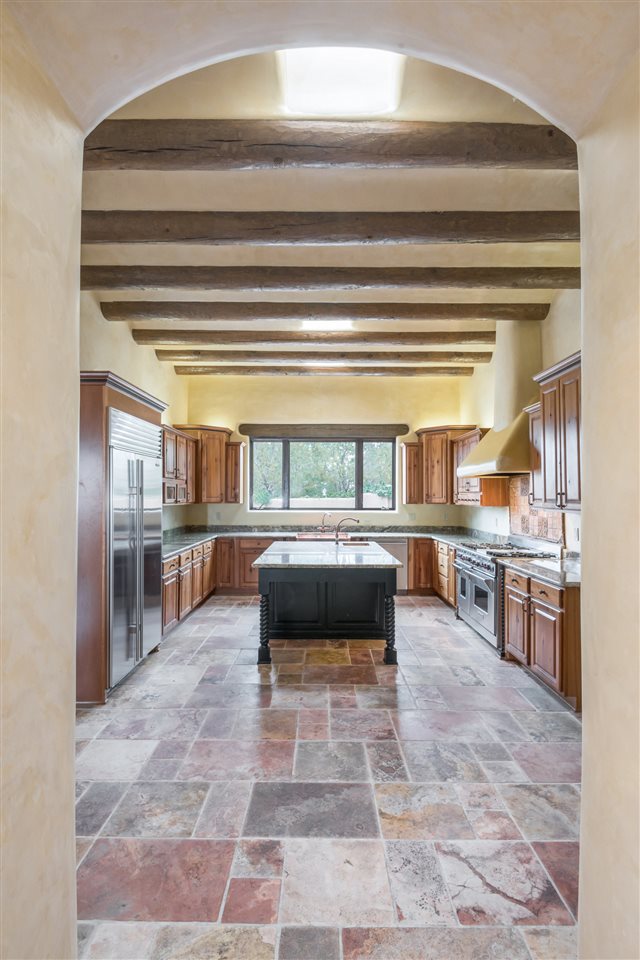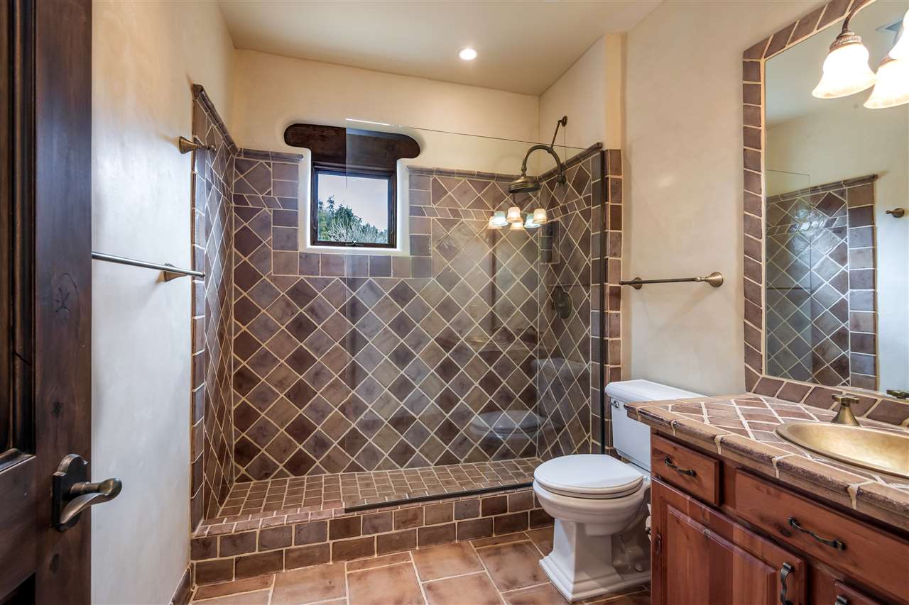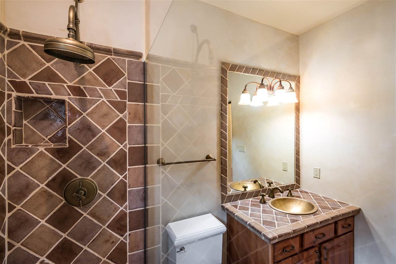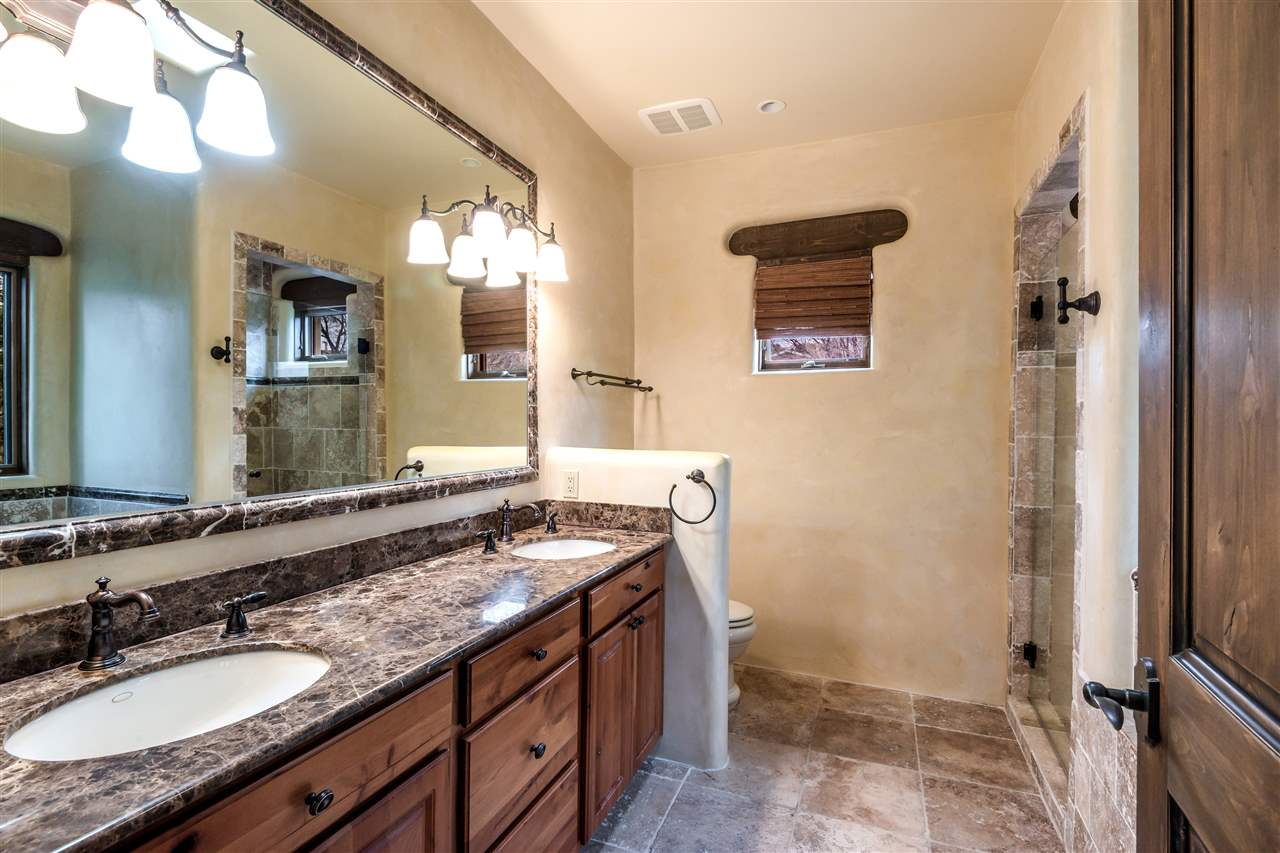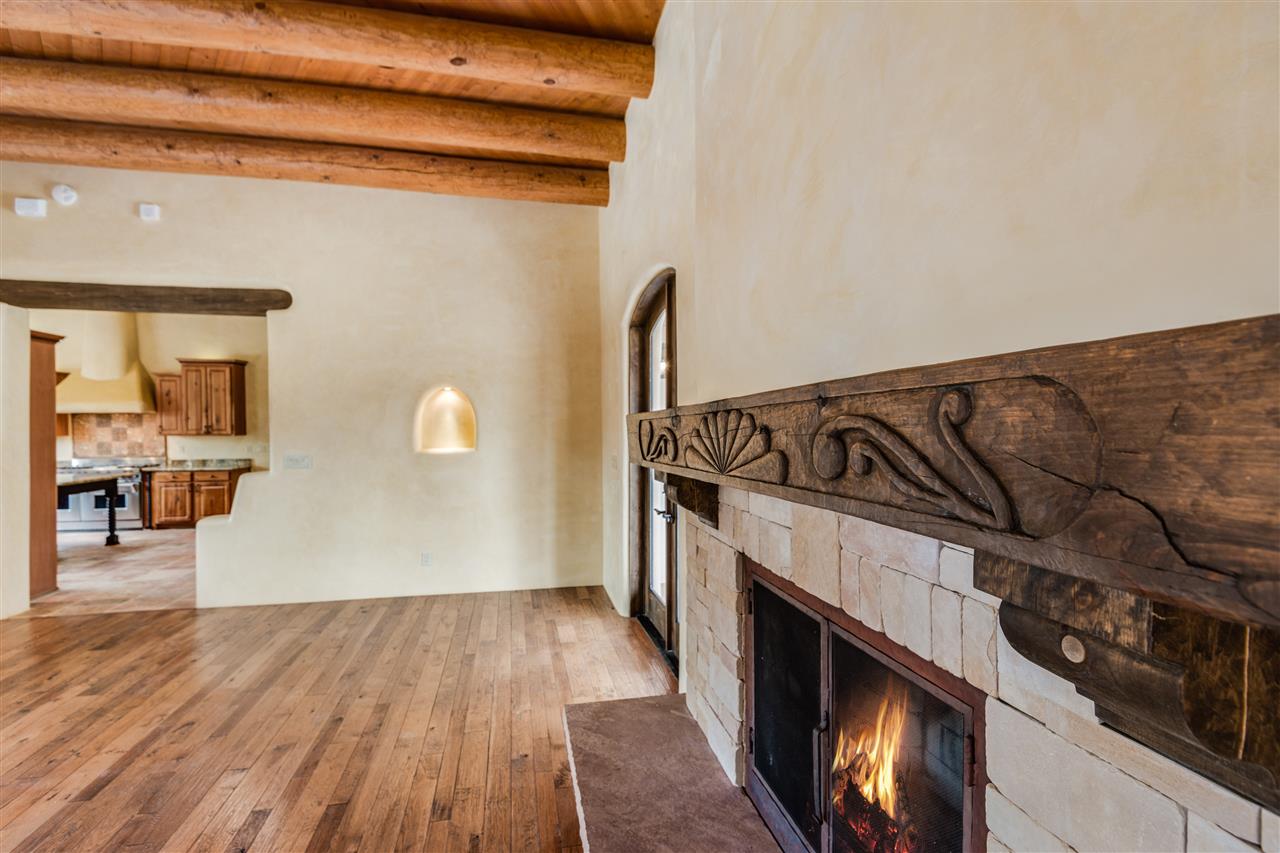 FANTASTIC DOWNTOWN LIVING OPPORTUNITY - this 3 BR home on upper Callecita Place up the hill from Fort Marcy off Bishops Lodge Road showcases extraordinary architectural features including high ceilings in the living room, plaster walls, numerous fireplaces, gated entry courtyard, private portals, patios, and gardens with thoughtful, low maintenance landscaping, a sophisticated gourmet kitchen with granite countertops and copper sinks, and a large wine cooler within the pantry. A two car garage, multi-purpose extensive laundry room, and an expansive, surprising view of daily sunsets and the western sky further add to the appeal and grandeur of this north side home. All on one level (NO STEPS), this is easy living and Santa Fe style at its best.