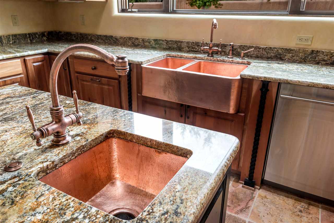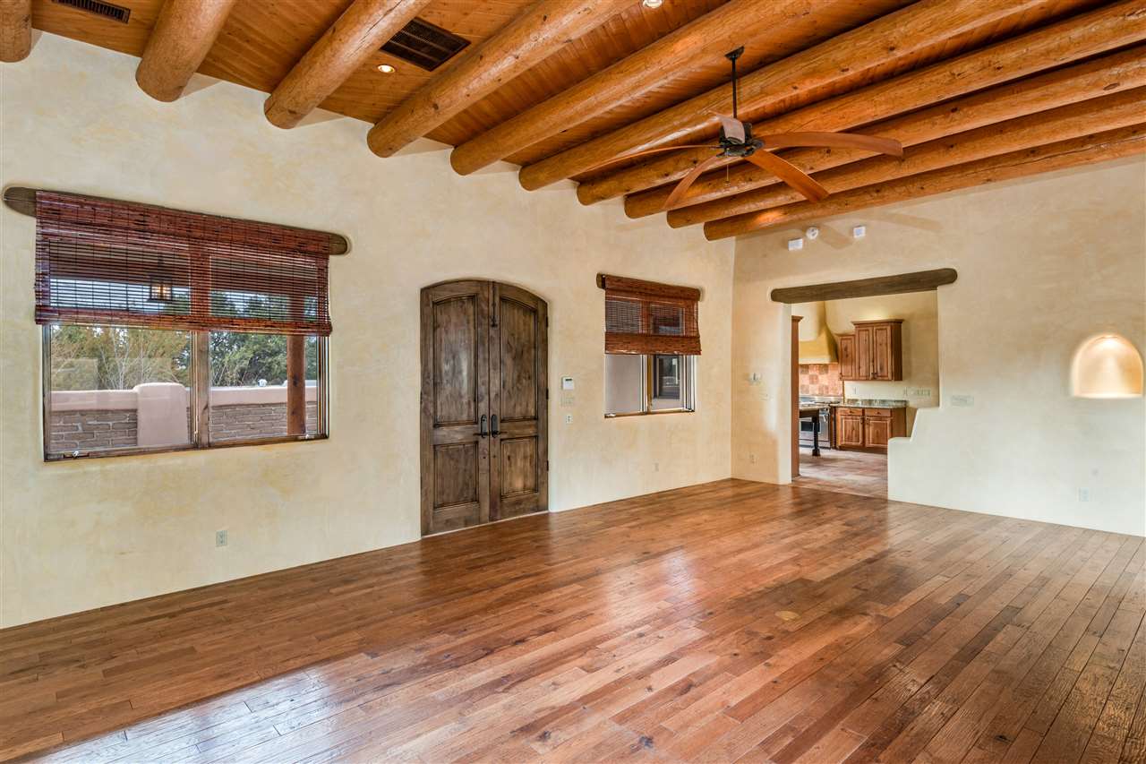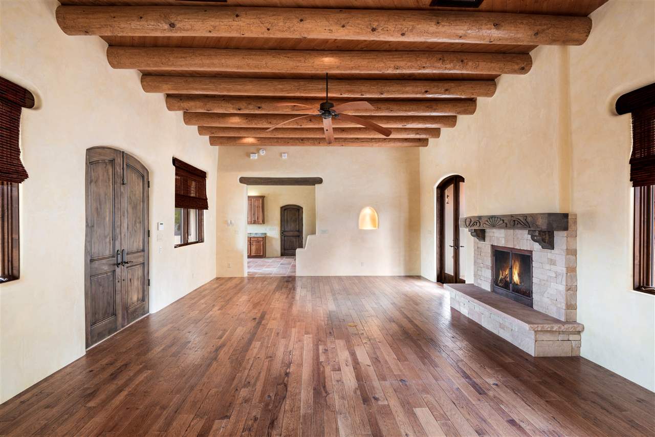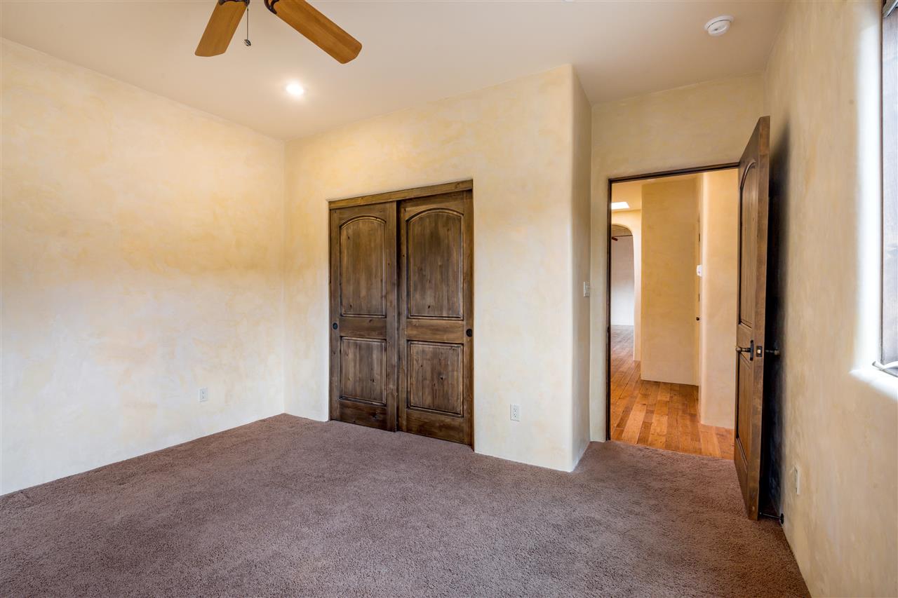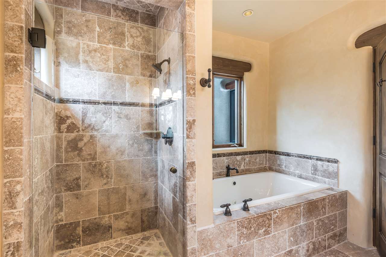 FANTASTIC DOWNTOWN LIVING OPPORTUNITY - this 3 BR home on upper Callecita Place up the hill from Fort Marcy off Bishops Lodge Road showcases extraordinary architectural features including high ceilings in the living room, plaster walls, numerous fireplaces, gated entry courtyard, private portals, patios, and gardens with thoughtful, low maintenance landscaping, a sophisticated gourmet kitchen with granite countertops and copper sinks, and a large wine cooler within the pantry. A two car garage, multi-purpose extensive laundry room, and an expansive, surprising view of daily sunsets and the western sky further add to the appeal and grandeur of this north side home. All on one level (NO STEPS), this is easy living and Santa Fe style at its best.
