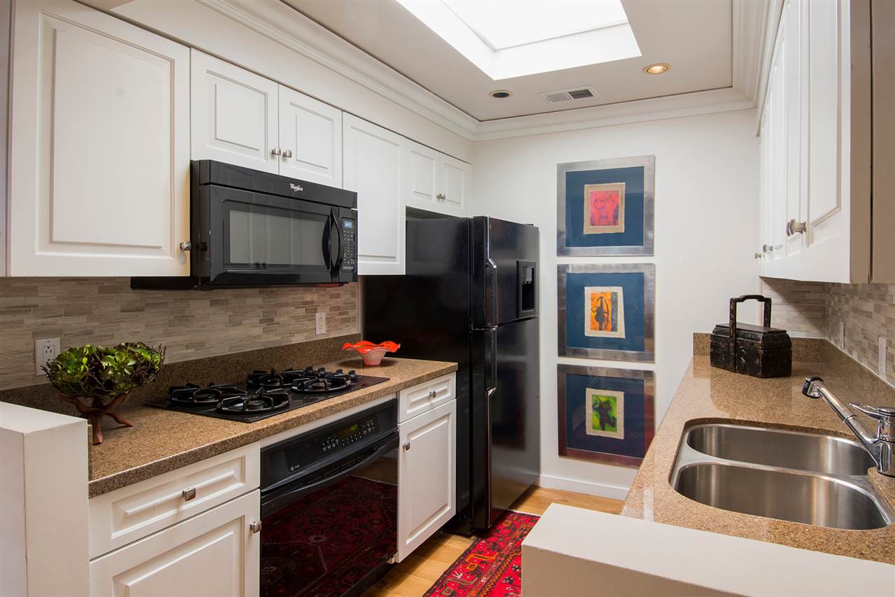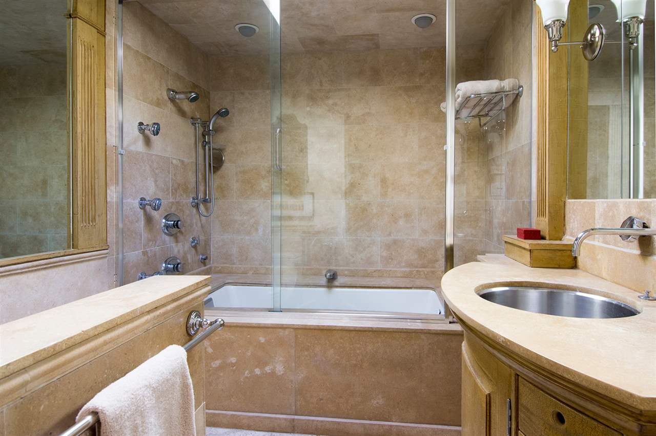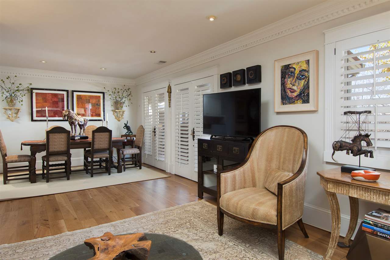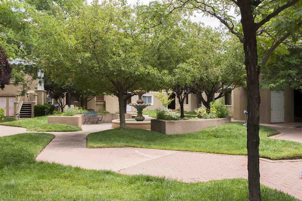 One of El Matador's most exceptional and beautifully finished 2 Bedroom, 1 Bath condo units. This top level, second floor condo was one belonging to the complex developer, and used as a personal residence. It features many fine upgrades, and distinguishing finishes that separate it from the other units in the complex, and indeed other homes in the area. Located within close proximity, approx. 5 blocks, to the historic downtown plaza and some of the finest art galleries and restaurants Santa Fe has to offer. This condo has tons of features - cherry hardwood floors; custom closet built-ins in both bedrooms; one bedroom with private patio balcony, the other with a Juliet balcony; skylights; granite counters; crown molding throughout with dental details; custom wood shutters; stone finished Jacuzzi tub/shower; and a gas log fireplace make this is a very special property. French doors open to a portal overlooking the charming hacienda style inner courtyard. Included are two designated covered parking spaces and two outdoor storage closets, both great and unusual amenities for this area.