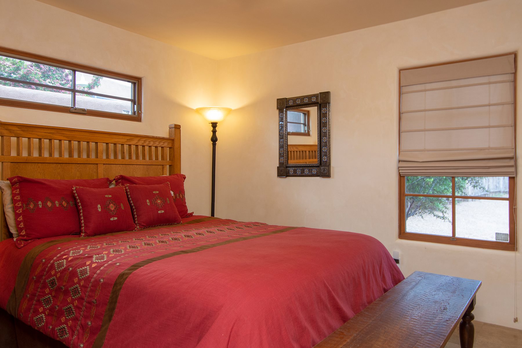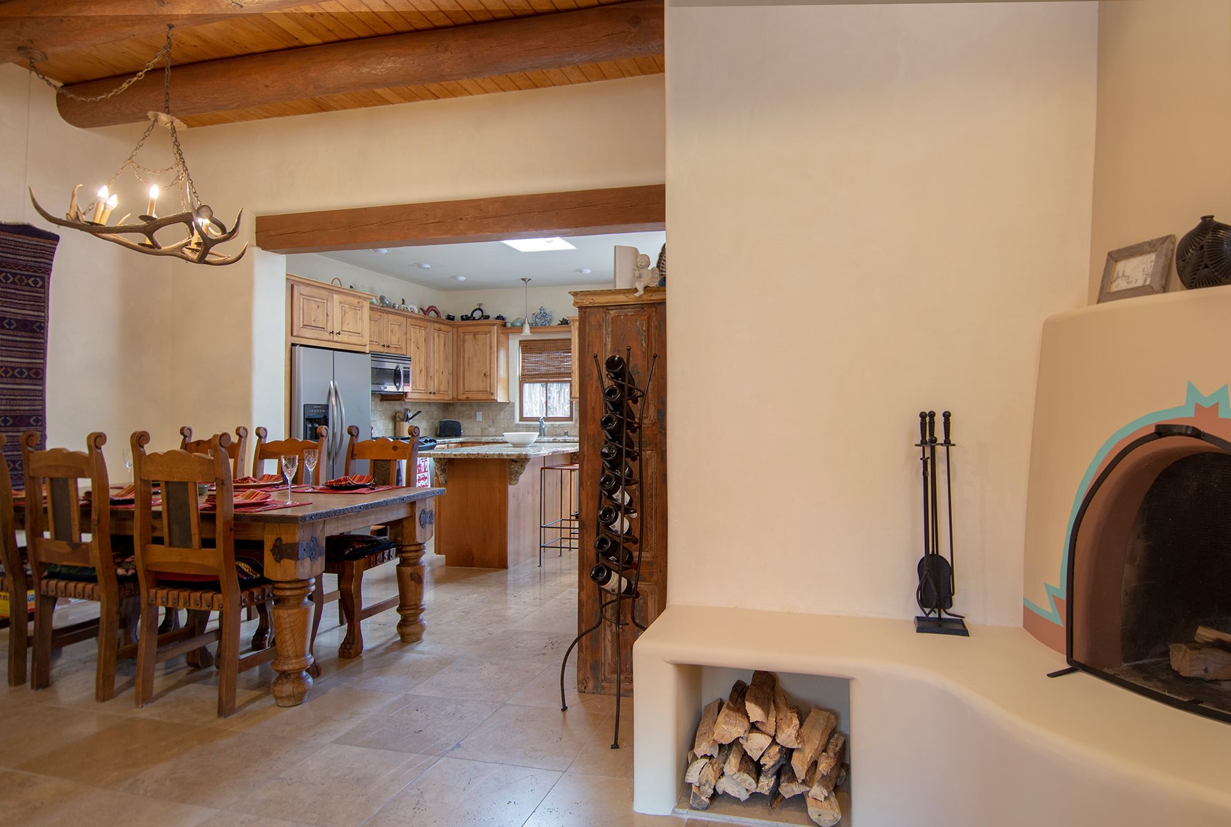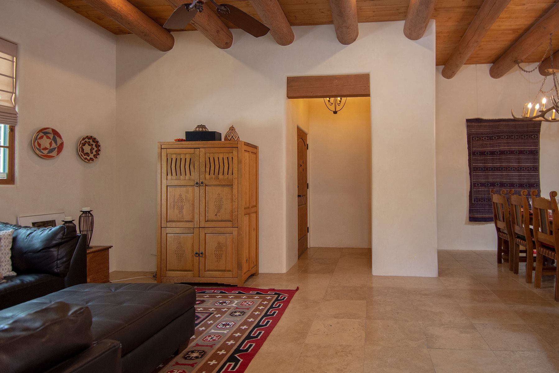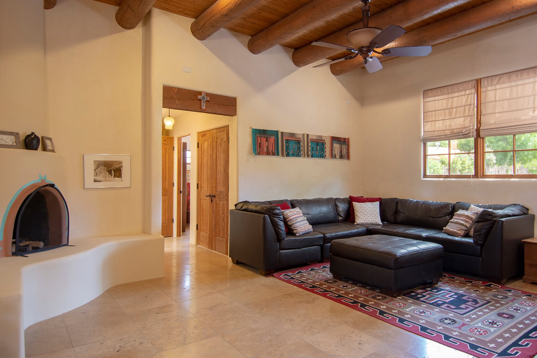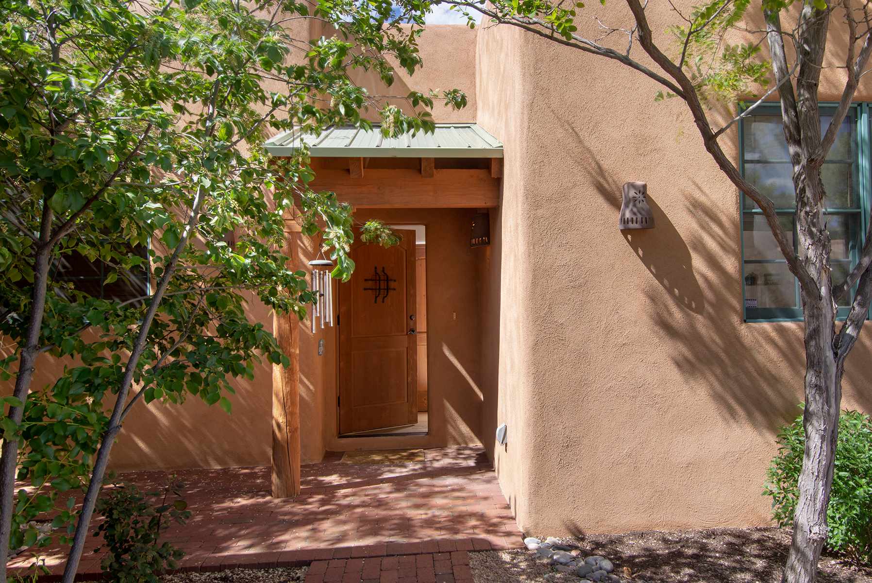 FABULOUSLY FINISHED PUEBLO PIED-A-TERRE Immaculately finished, this single level, 3 bedroom, 2 bathroom condo has all the quintessential qualities of an old Santa Fe pueblo pied-a-terre, with all the desirability of a recently constructed low-maintenance turn key build. Located in an intimate 4 unit complex, this condo features modern open concept living, beautiful travertine tile floors, all hard-trowel diamond plaster finished walls, substantial vigas, tall ceilings, large insulated double paned windows throughout, wood burning kiva fireplace, evaporative cooling, security system, multiple skylights, and a great kitchen including wood cabinetry, gorgeous granite slab counter tops, and stainless steel appliances. Stone counter tops and high end finished tiling grace both bathrooms. The very spacious wrap-around back yard is privately walled, and with native landscaping on drip system. This fantastic property is tucked away, off-set from the street on a quiet lane in the heart of the historic Guadalupe district, conveniently located within walking distance to the Plaza and the nearby Railyard. Manageable HOA fees in this private 4-unit complex, make this a dream for both full and part time residences.