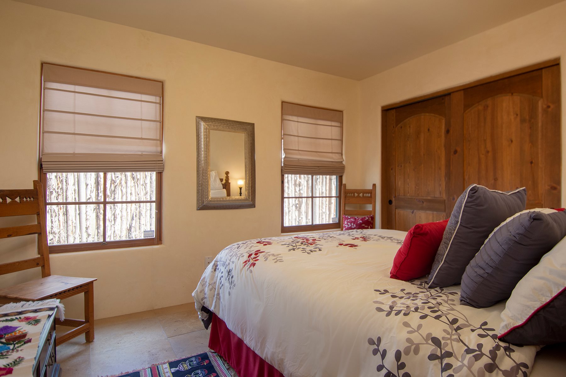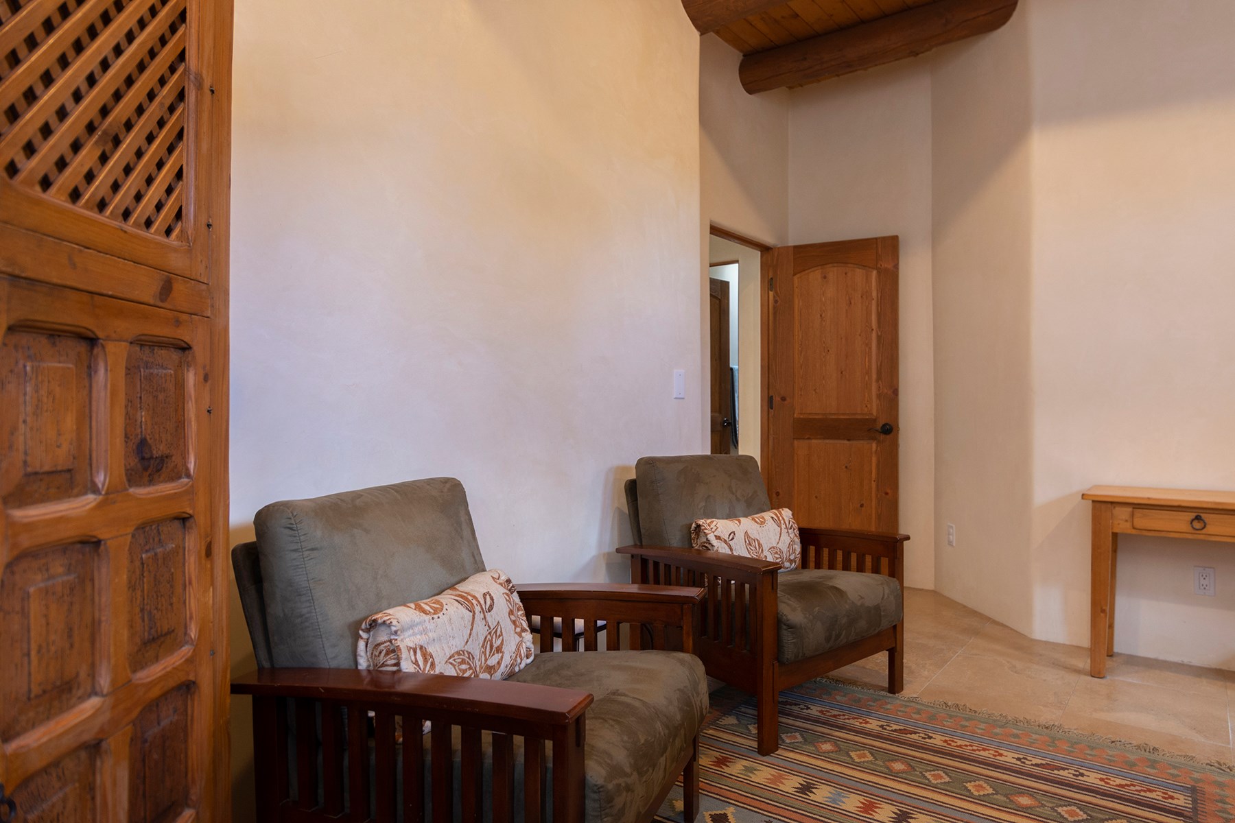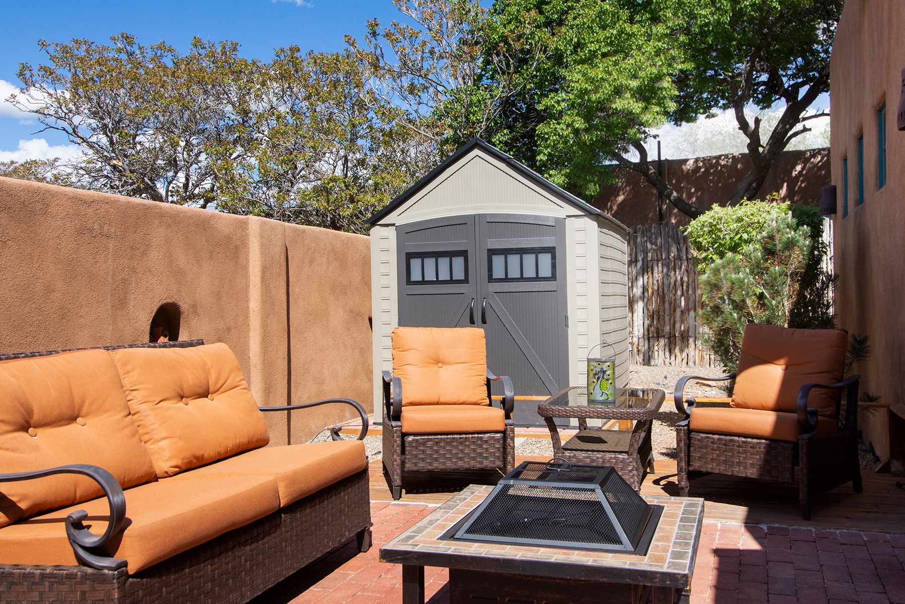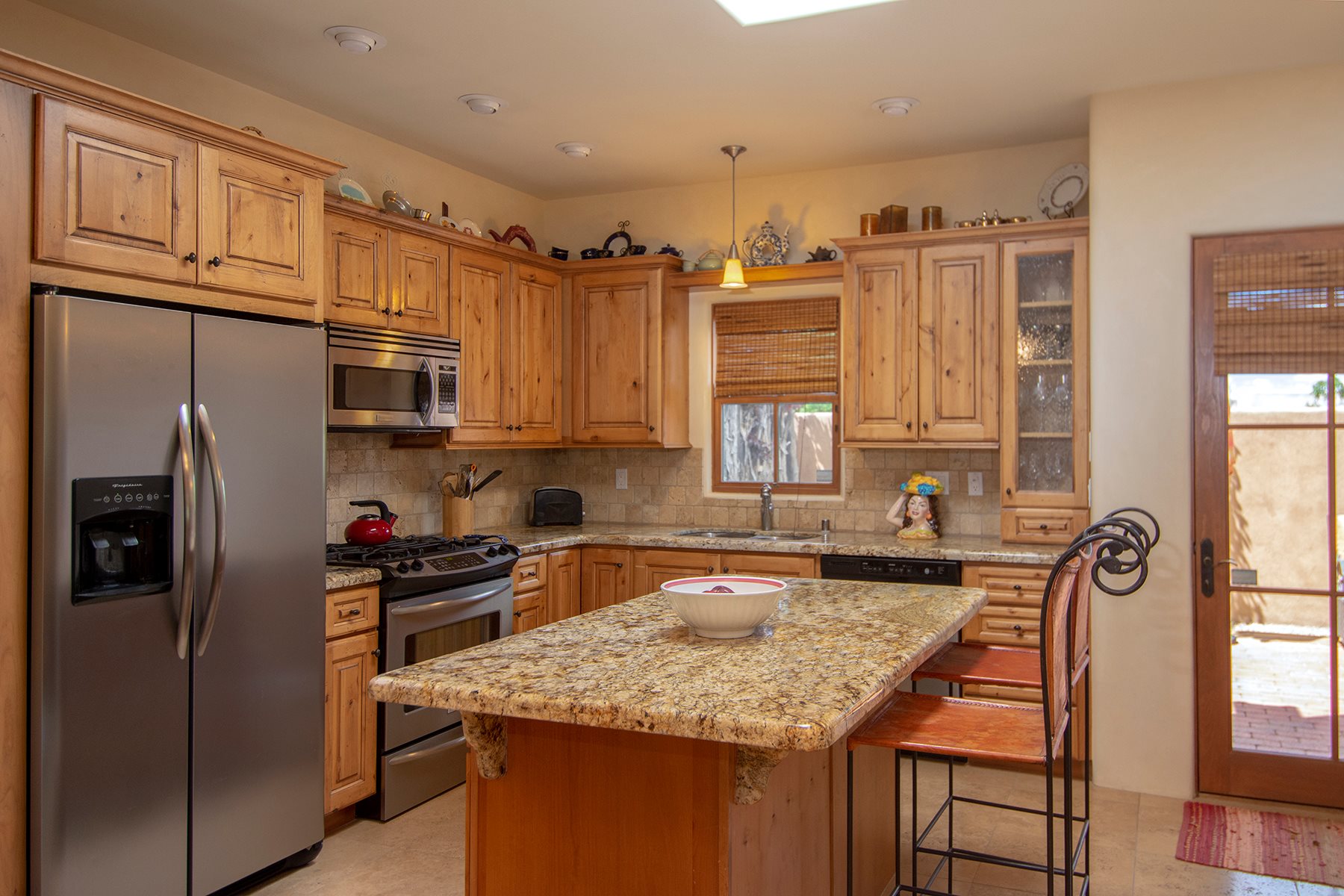 FABULOUSLY FINISHED PUEBLO PIED-A-TERRE Immaculately finished, this single level, 3 bedroom, 2 bathroom condo has all the quintessential qualities of an old Santa Fe pueblo pied-a-terre, with all the desirability of a recently constructed low-maintenance turn key build. Located in an intimate 4 unit complex, this condo features modern open concept living, beautiful travertine tile floors, all hard-trowel diamond plaster finished walls, substantial vigas, tall ceilings, large insulated double paned windows throughout, wood burning kiva fireplace, evaporative cooling, security system, multiple skylights, and a great kitchen including wood cabinetry, gorgeous granite slab counter tops, and stainless steel appliances. Stone counter tops and high end finished tiling grace both bathrooms. The very spacious wrap-around back yard is privately walled, and with native landscaping on drip system. This fantastic property is tucked away, off-set from the street on a quiet lane in the heart of the historic Guadalupe district, conveniently located within walking distance to the Plaza and the nearby Railyard. Manageable HOA fees in this private 4-unit complex, make this a dream for both full and part time residences.