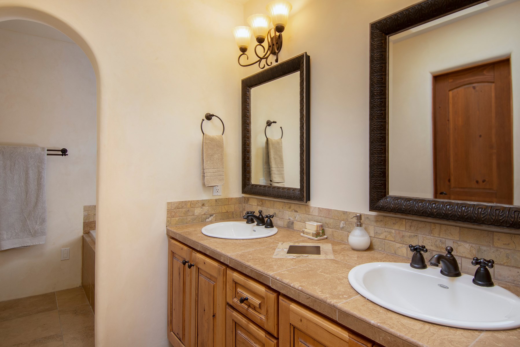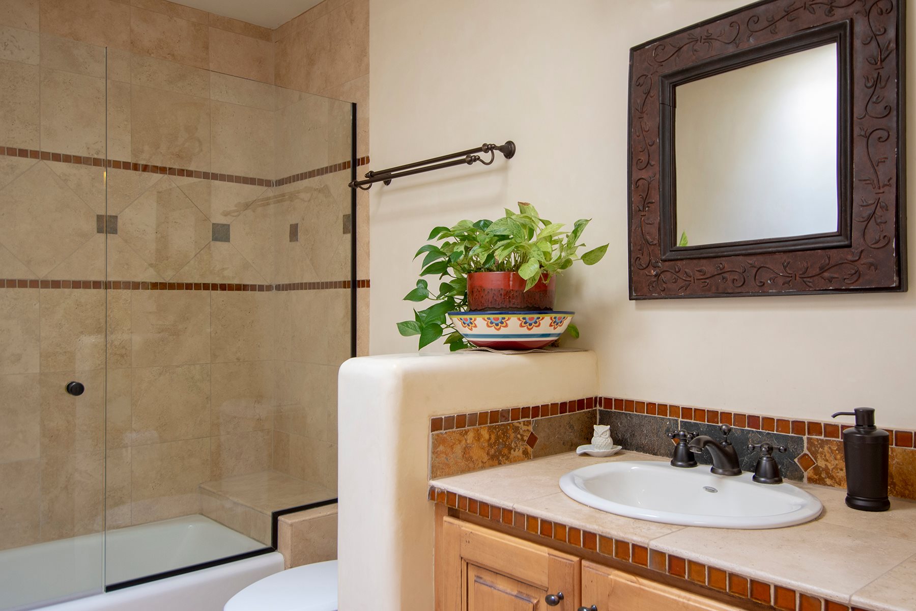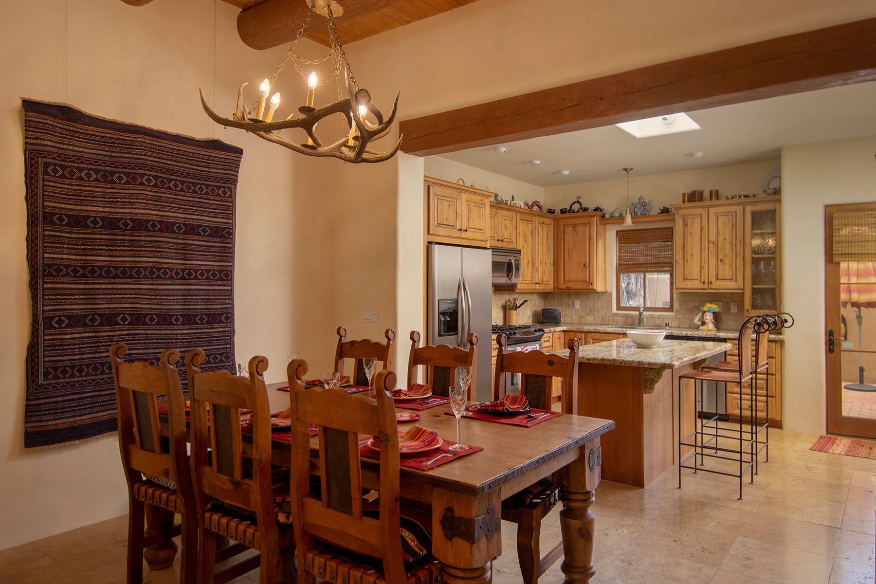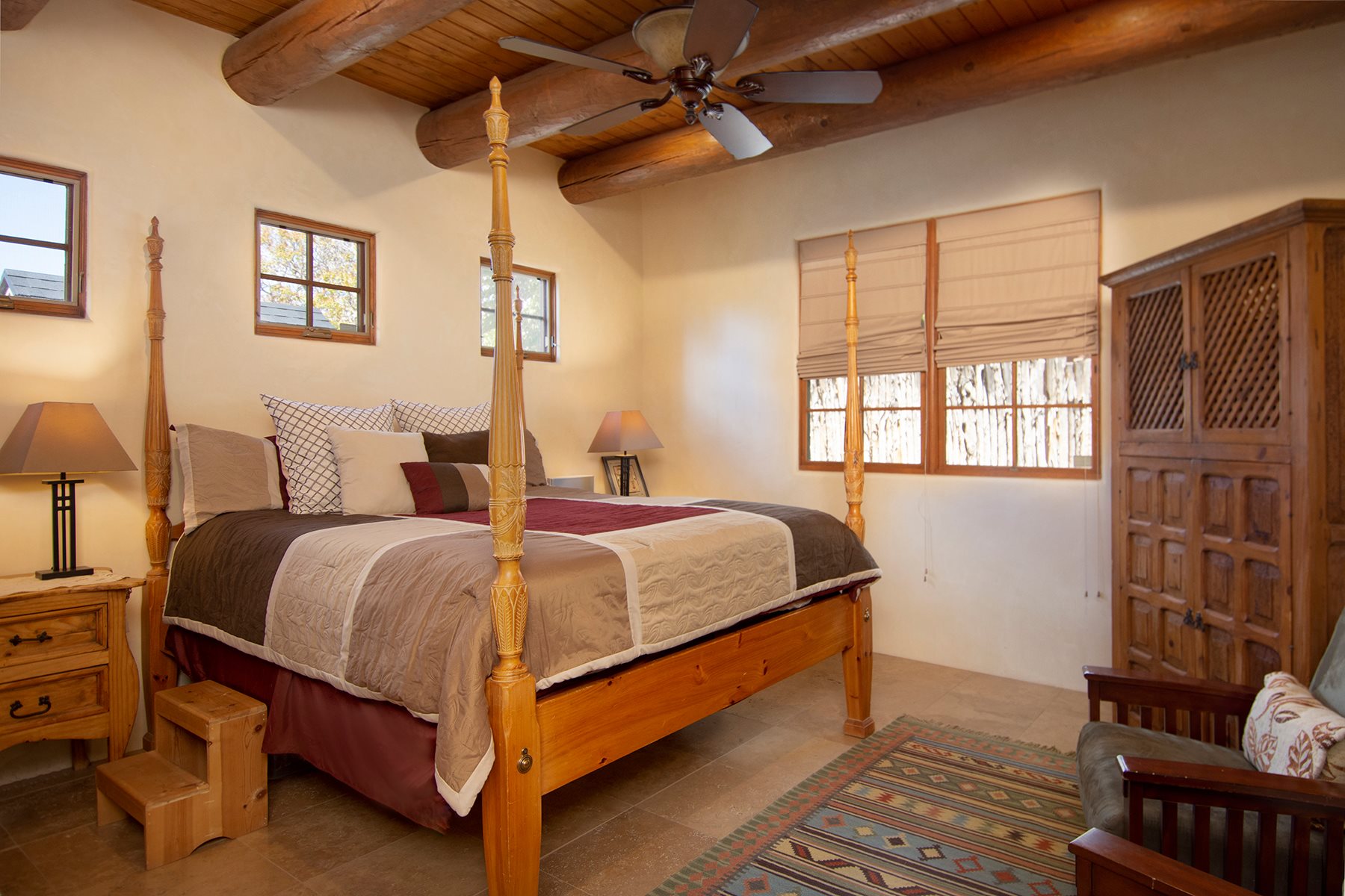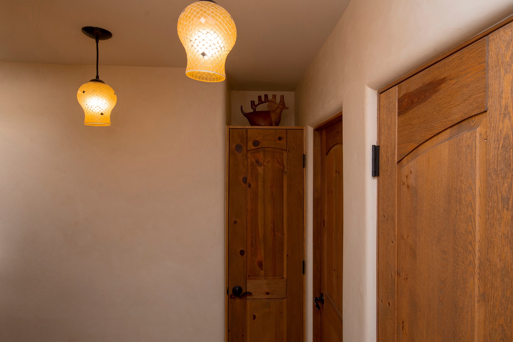 FABULOUSLY FINISHED PUEBLO PIED-A-TERRE Immaculately finished, this single level, 3 bedroom, 2 bathroom condo has all the quintessential qualities of an old Santa Fe pueblo pied-a-terre, with all the desirability of a recently constructed low-maintenance turn key build. Located in an intimate 4 unit complex, this condo features modern open concept living, beautiful travertine tile floors, all hard-trowel diamond plaster finished walls, substantial vigas, tall ceilings, large insulated double paned windows throughout, wood burning kiva fireplace, evaporative cooling, security system, multiple skylights, and a great kitchen including wood cabinetry, gorgeous granite slab counter tops, and stainless steel appliances. Stone counter tops and high end finished tiling grace both bathrooms. The very spacious wrap-around back yard is privately walled, and with native landscaping on drip system. This fantastic property is tucked away, off-set from the street on a quiet lane in the heart of the historic Guadalupe district, conveniently located within walking distance to the Plaza and the nearby Railyard. Manageable HOA fees in this private 4-unit complex, make this a dream for both full and part time residences.