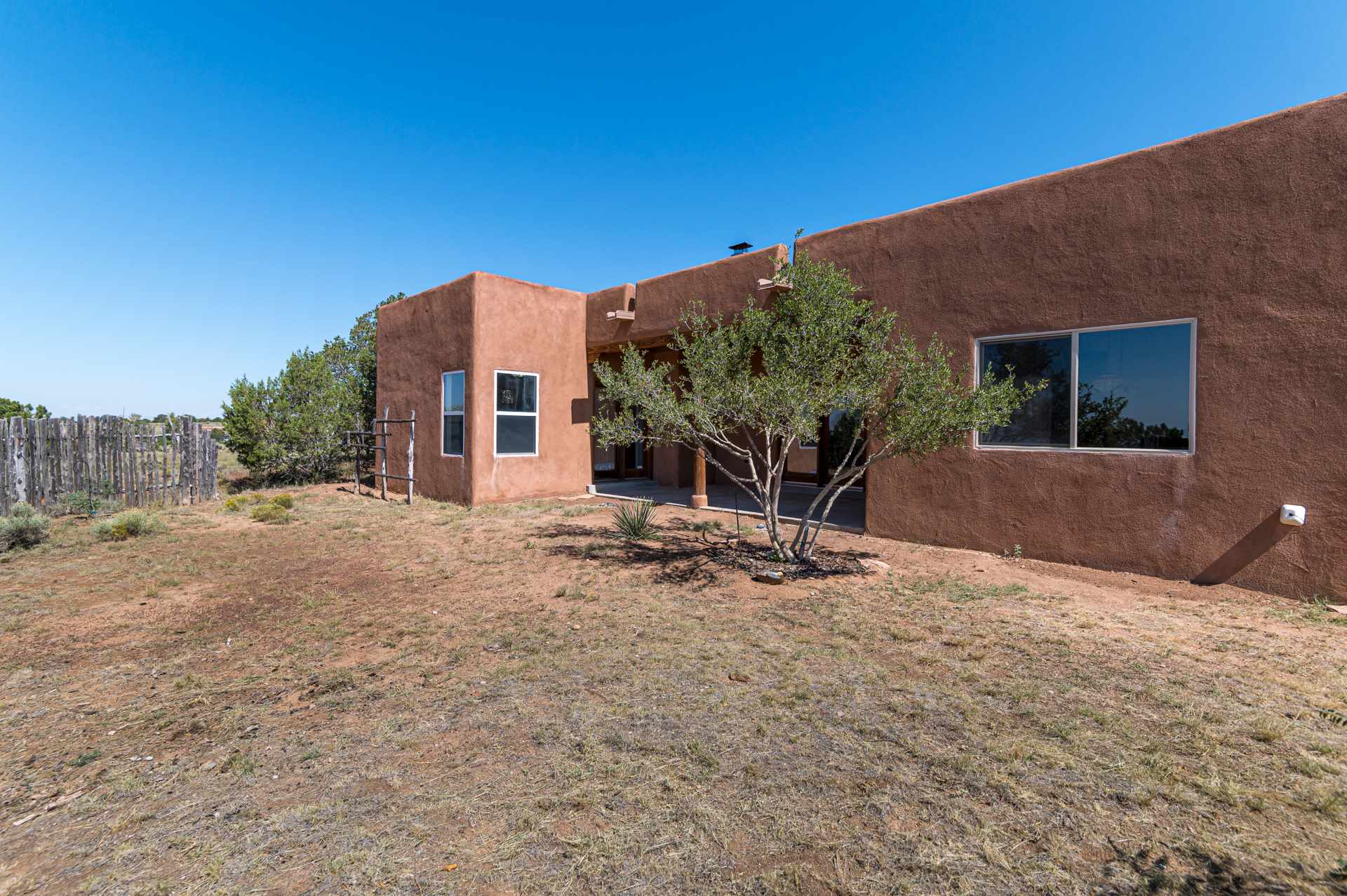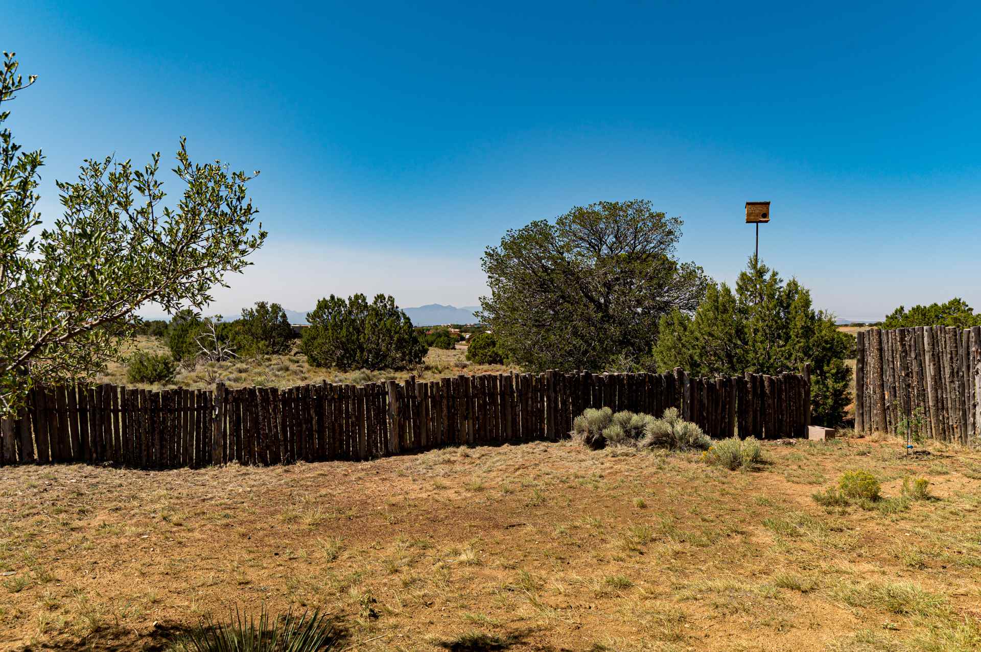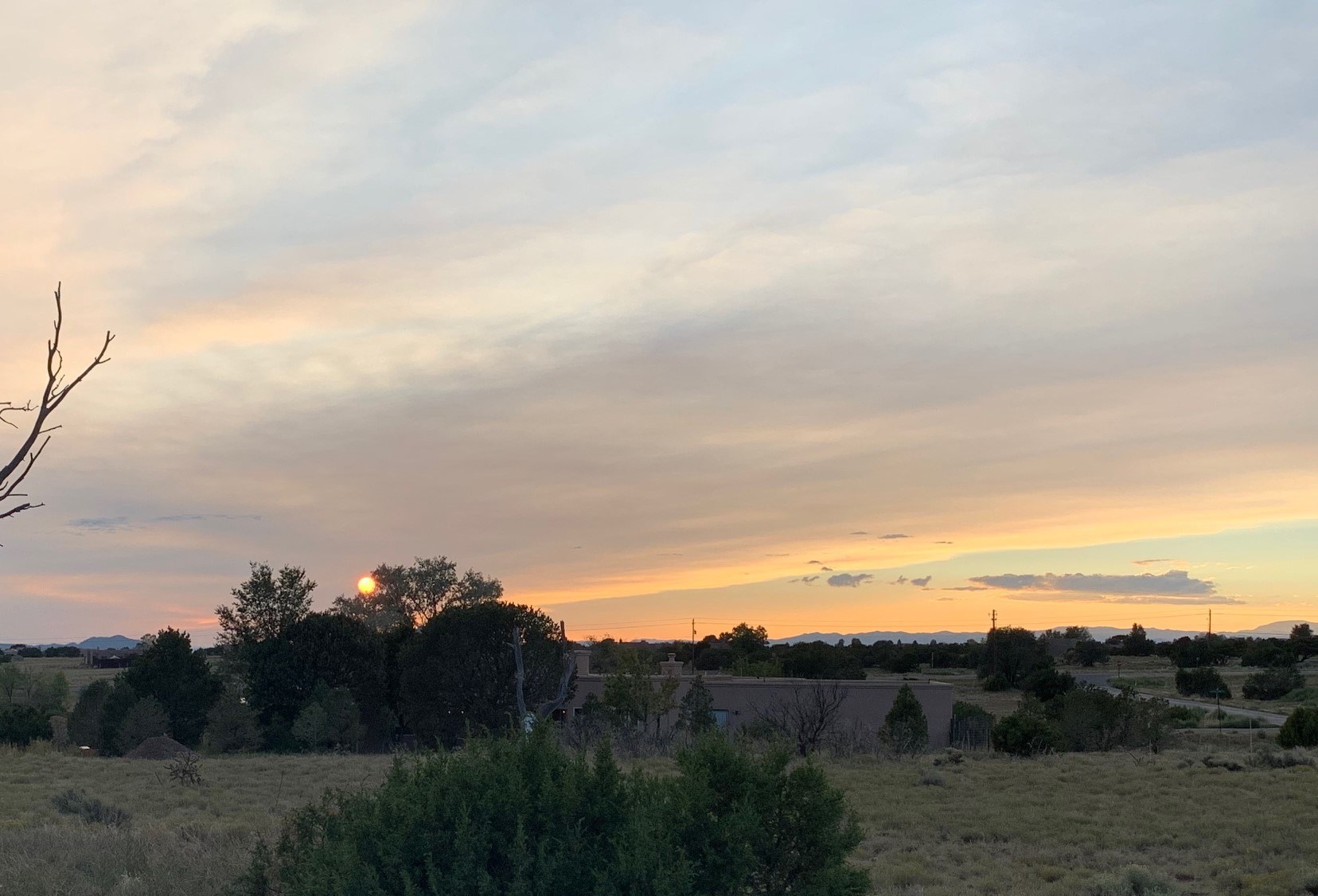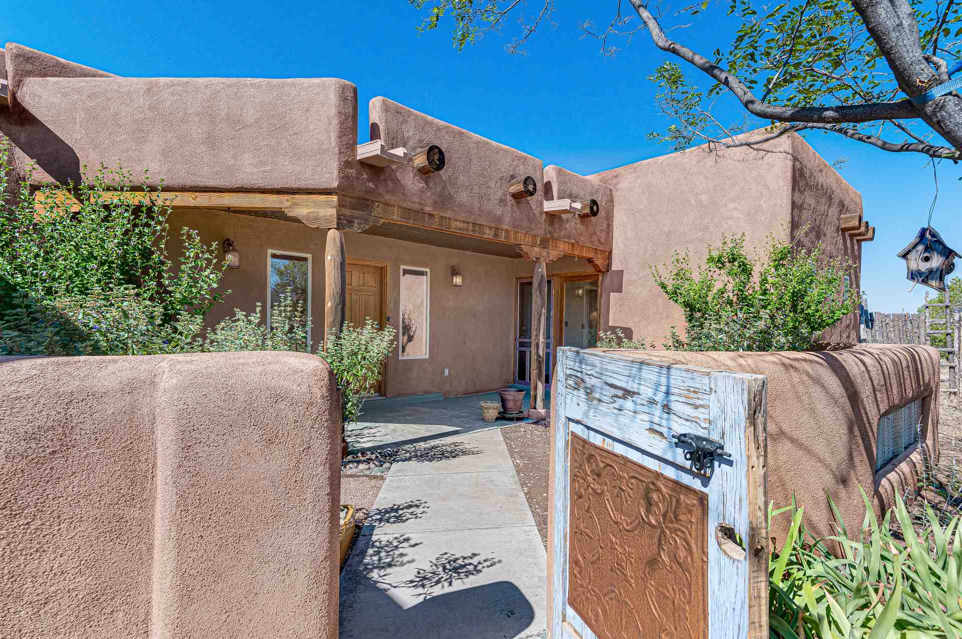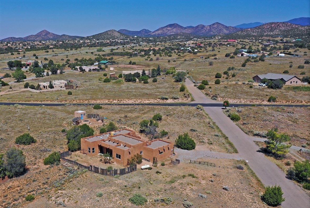 Escape to the wide open spaces and blue skies of New Mexico. Don't miss this well maintained, Santa Fe Style home. Lovely setting with VIEWS! Open floor plan, light and bright with vigas, nichos and a kiva fireplace. New Furnace! Freshly painted and spruced up! Front courtyard, covered back portal, plus a spacious back yard with a coyote fence arbor and an horno. Fabulous studio space with two, 220V outlets for artists and or the entrepreneur. Maple cabinets in the kitchen and enough room to add an island. This gem is off of 285 and close to the Agora Shopping Center, Eldorado Community School, restaurants and I-25. NO HOA. This property is move-in ready; WORK from home!