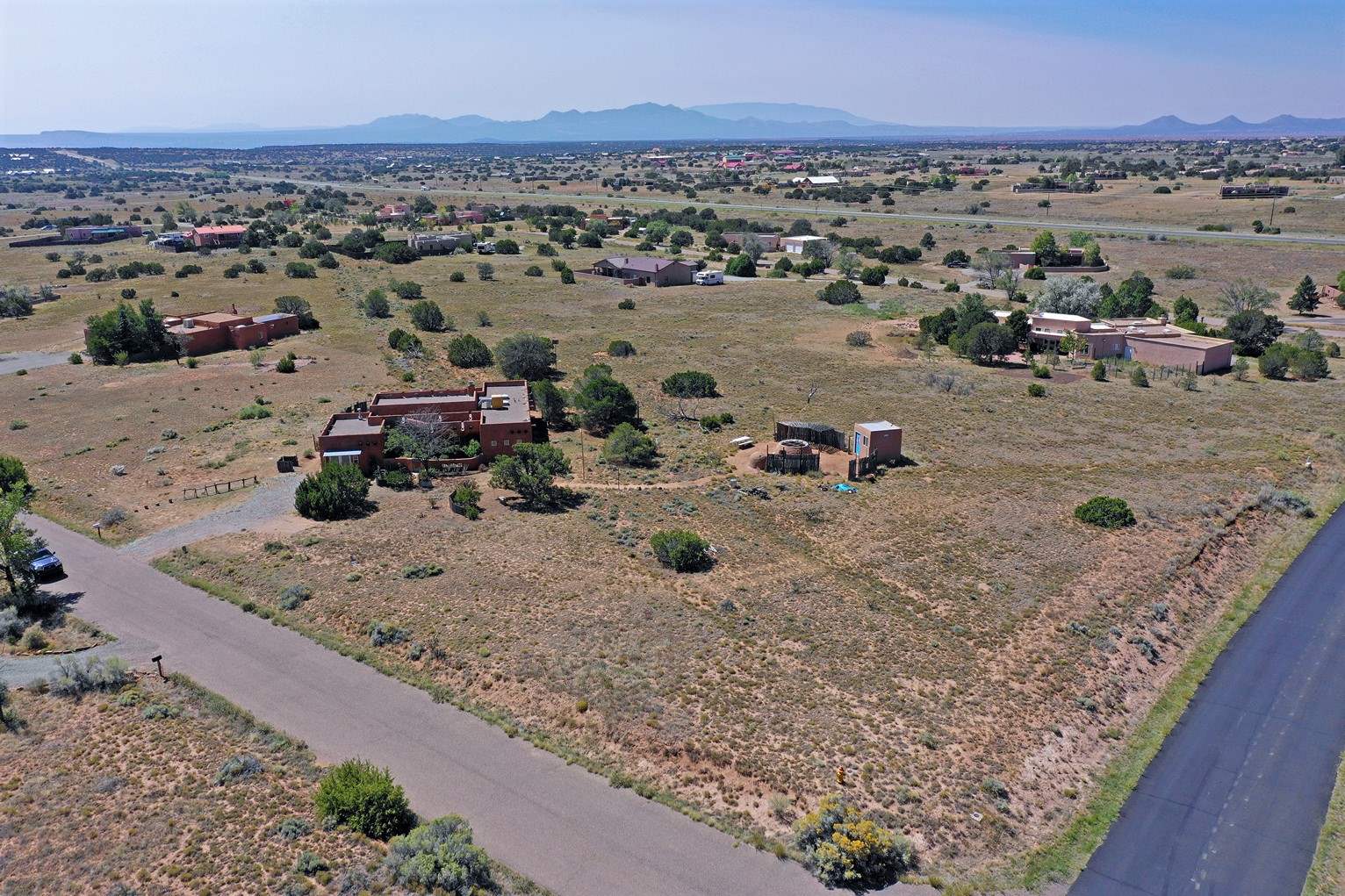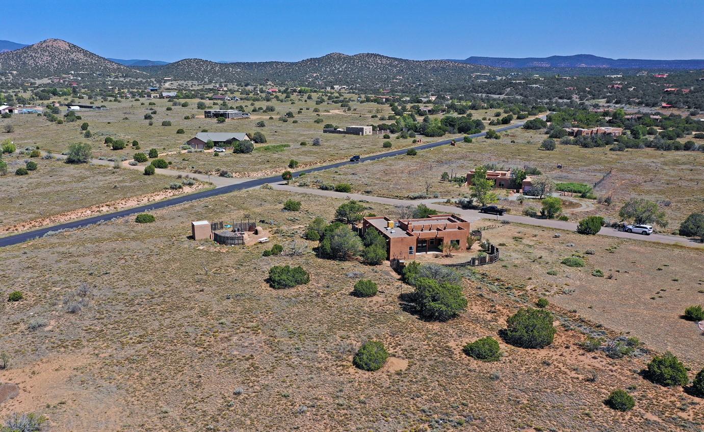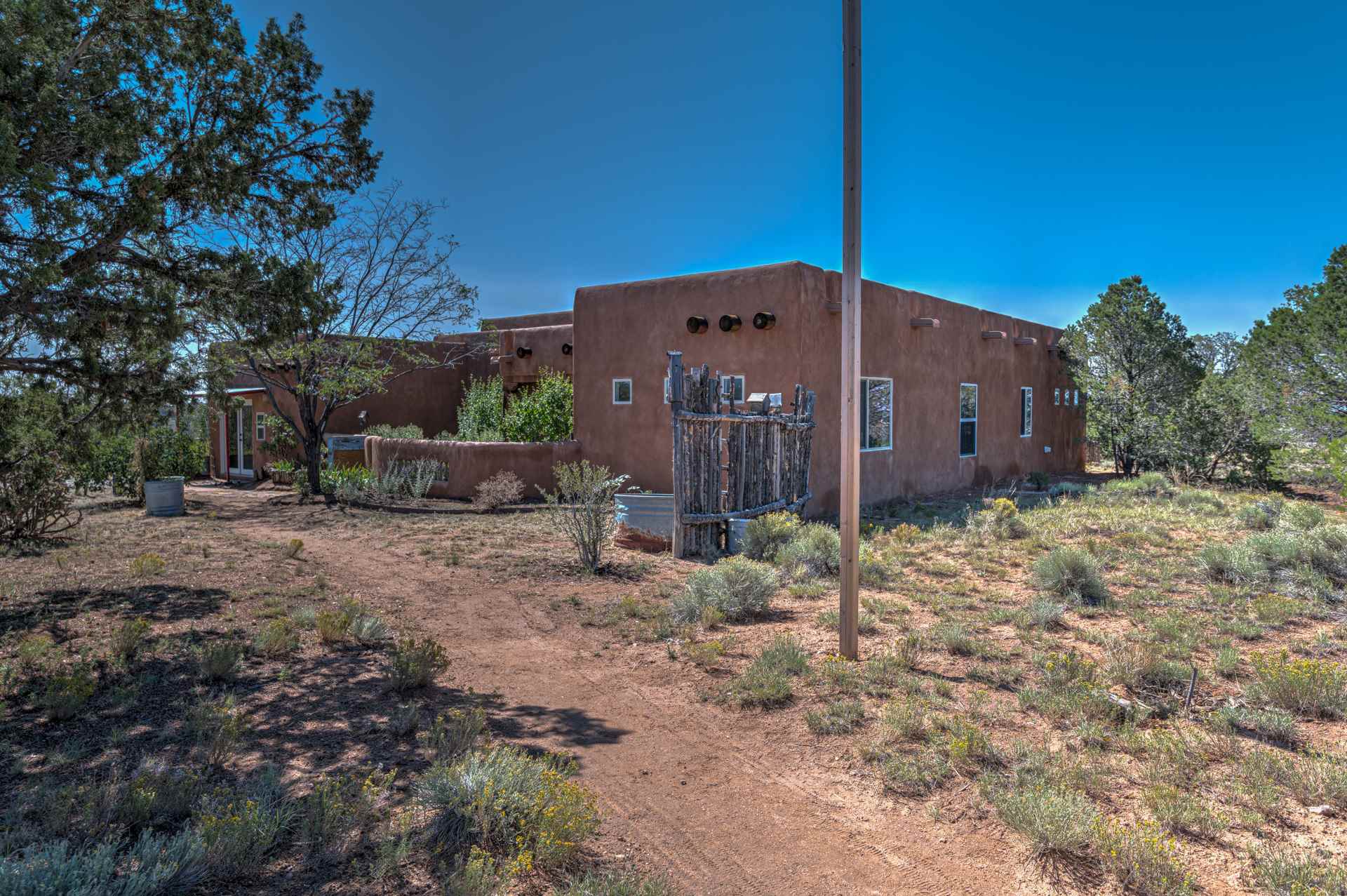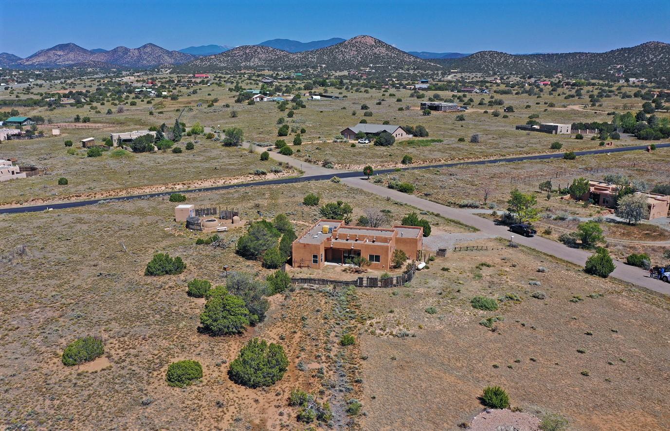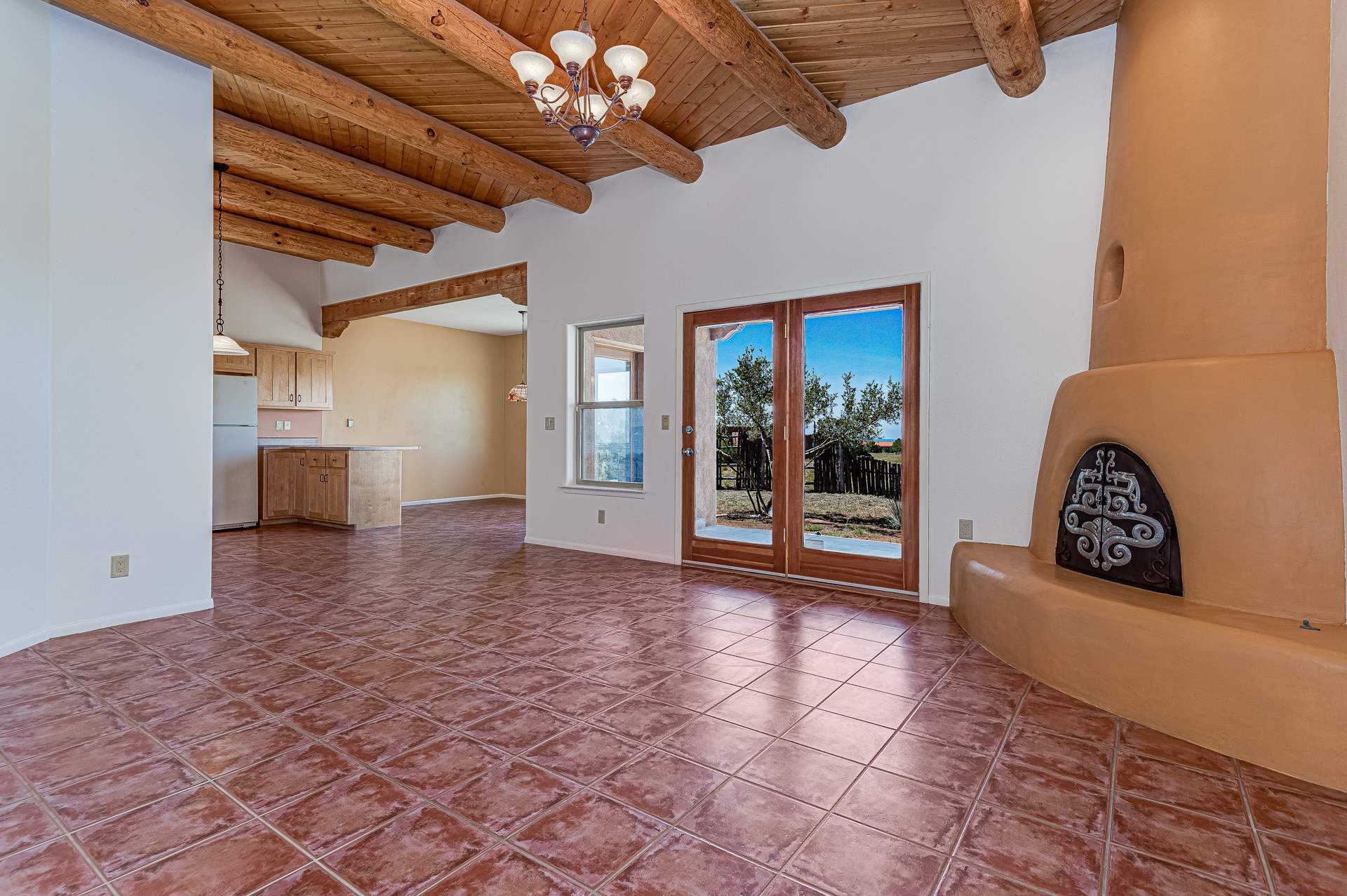 Escape to the wide open spaces and blue skies of New Mexico. Don't miss this well maintained, Santa Fe Style home. Lovely setting with VIEWS! Open floor plan, light and bright with vigas, nichos and a kiva fireplace. New Furnace! Freshly painted and spruced up! Front courtyard, covered back portal, plus a spacious back yard with a coyote fence arbor and an horno. Fabulous studio space with two, 220V outlets for artists and or the entrepreneur. Maple cabinets in the kitchen and enough room to add an island. This gem is off of 285 and close to the Agora Shopping Center, Eldorado Community School, restaurants and I-25. NO HOA. This property is move-in ready; WORK from home!