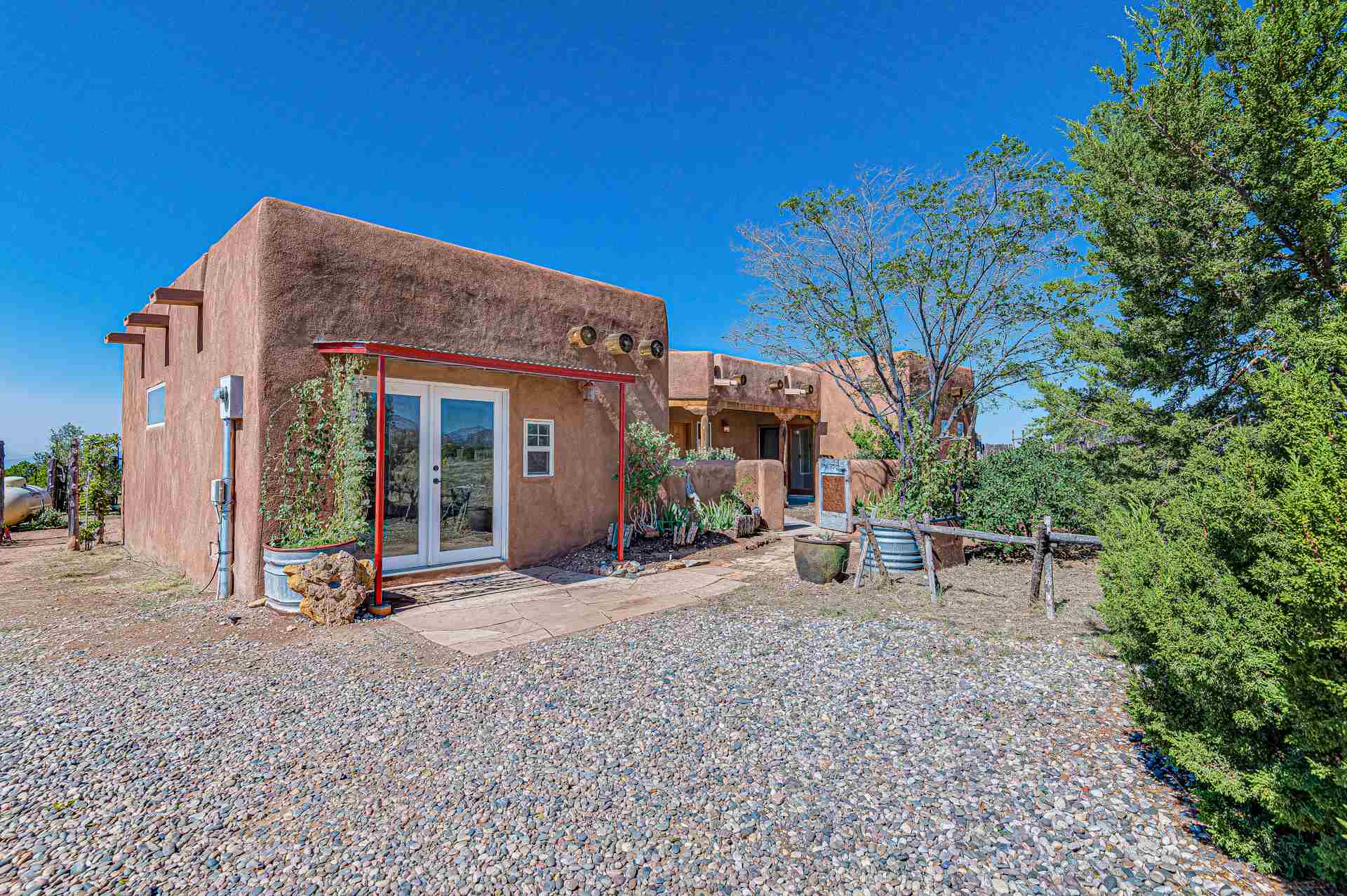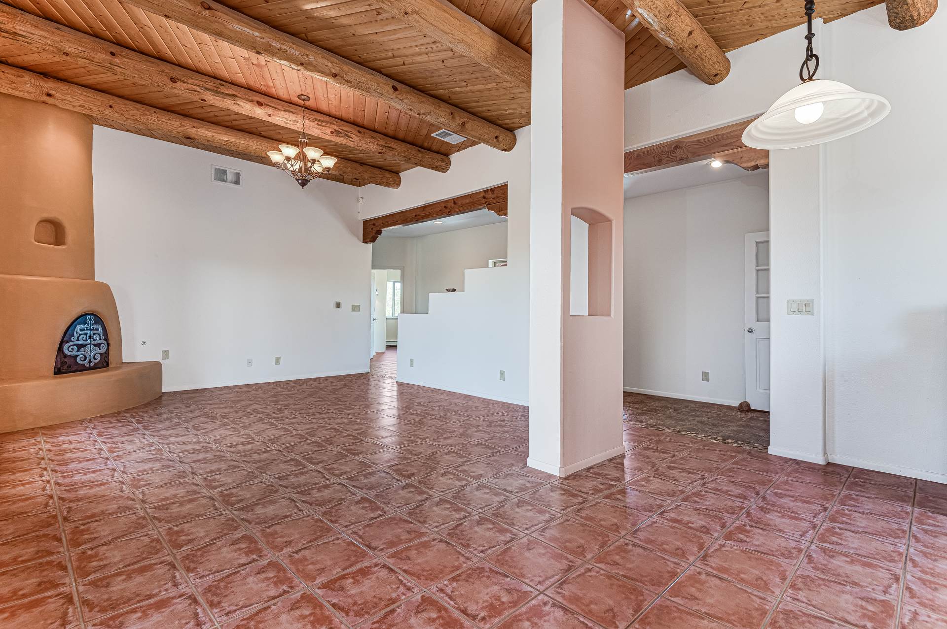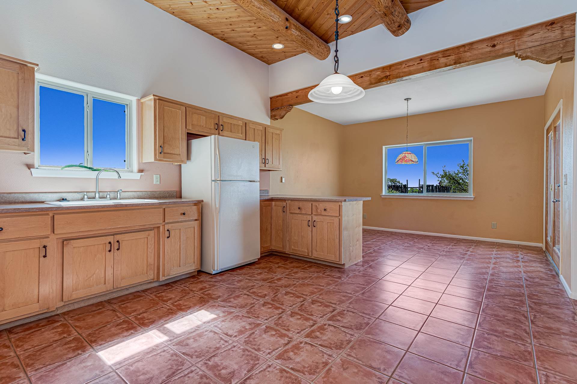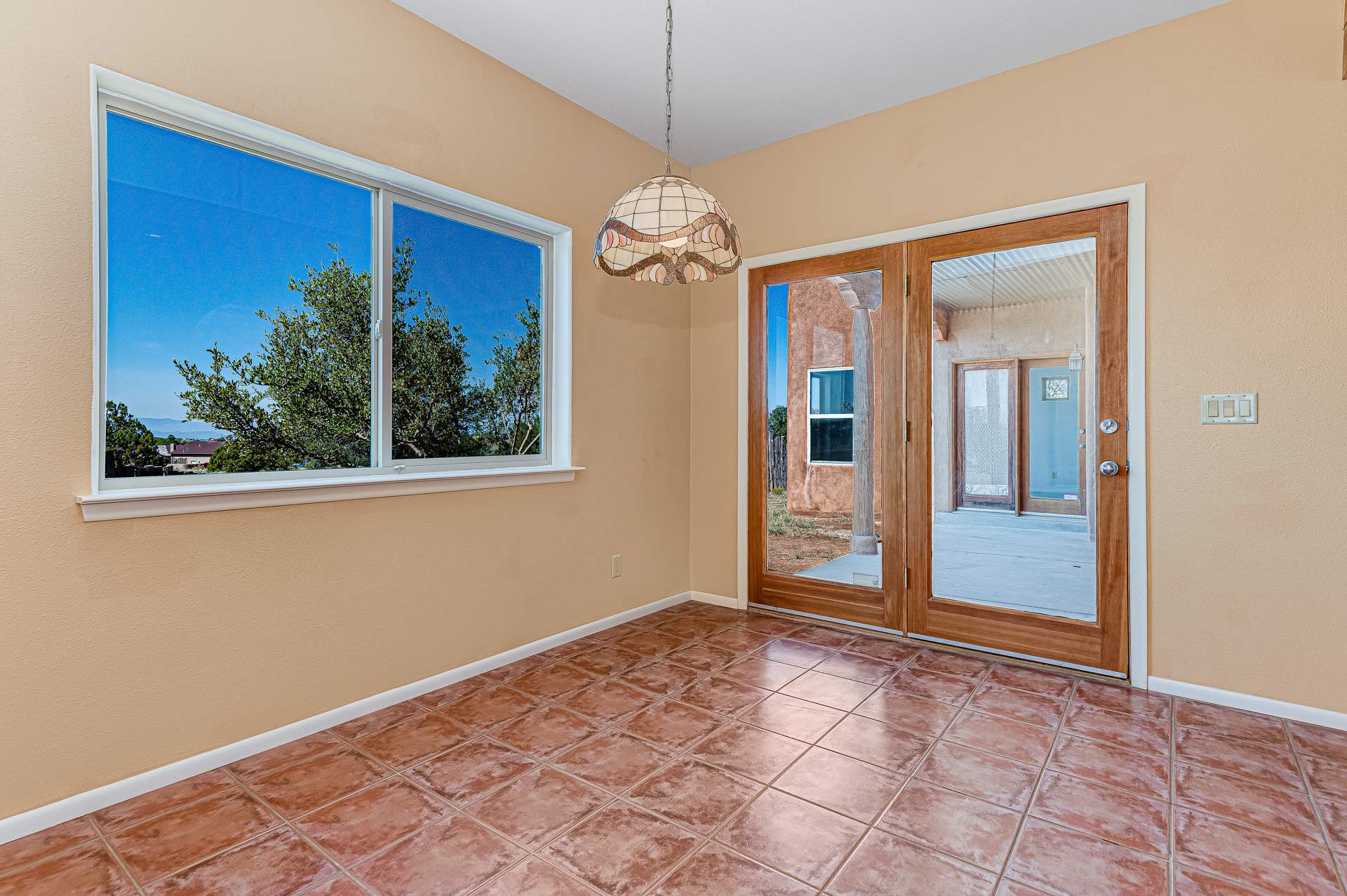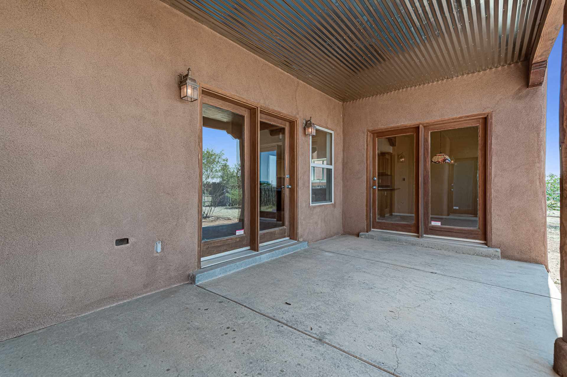 Escape to the wide open spaces and blue skies of New Mexico. Don't miss this well maintained, Santa Fe Style home. Lovely setting with VIEWS! Open floor plan, light and bright with vigas, nichos and a kiva fireplace. New Furnace! Freshly painted and spruced up! Front courtyard, covered back portal, plus a spacious back yard with a coyote fence arbor and an horno. Fabulous studio space with two, 220V outlets for artists and or the entrepreneur. Maple cabinets in the kitchen and enough room to add an island. This gem is off of 285 and close to the Agora Shopping Center, Eldorado Community School, restaurants and I-25. NO HOA. This property is move-in ready; WORK from home!