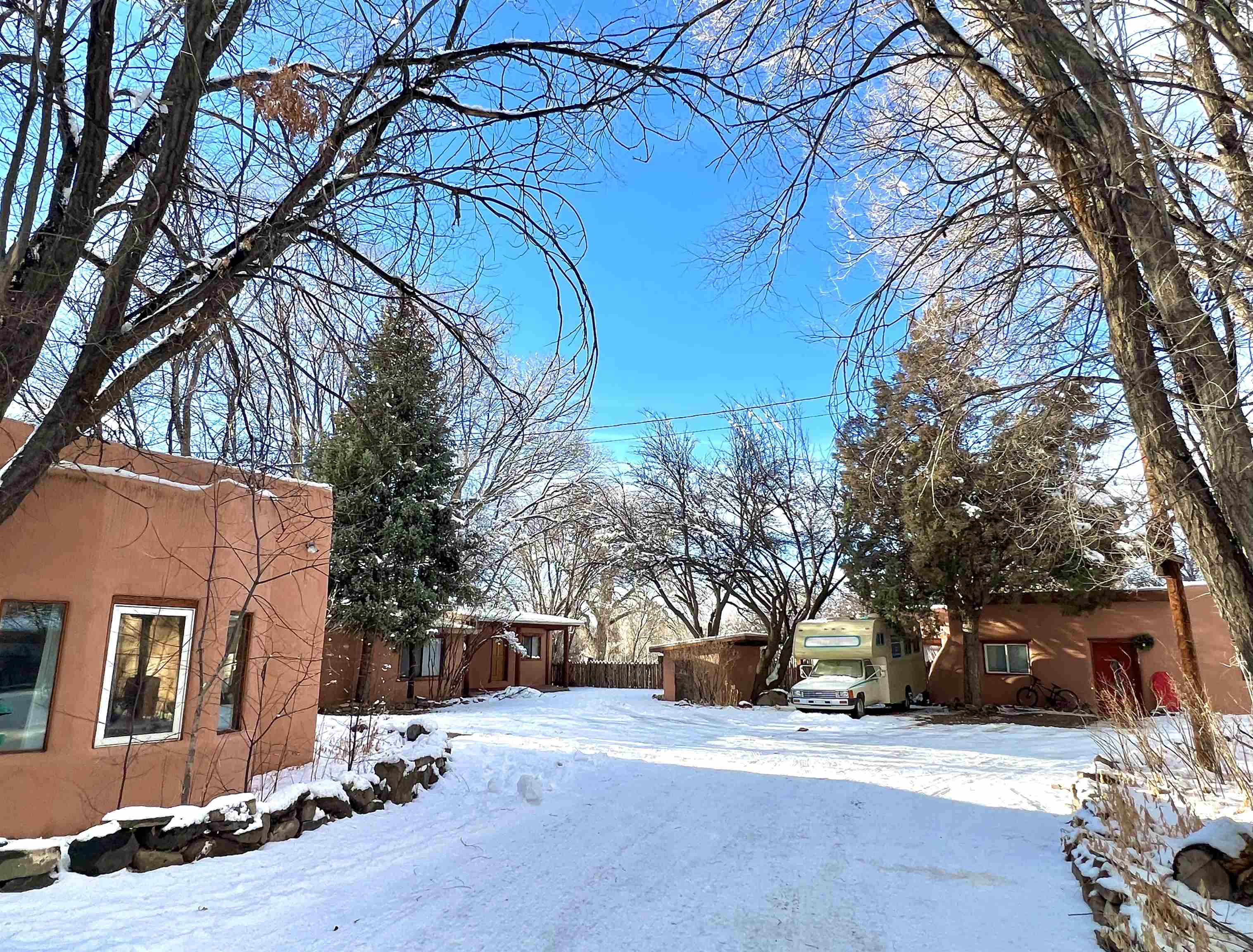 PhenomenalMulti-Family or Investment Opportunity just a few minutes from town...This triplex property is nestled at the end of a quiet and private street regarded as one of the original historic plazas in the region. The grounds themselves contain a variety of trees and well-maintained gardens sprawling with lush greenery during the warm months. All three homes have been thoughtfully updated, each possessing many customqualities with private yards perfect for the pets to roam, or kids to play. The main home has an open floor plan with centralheating, beautiful tile-work, and a mix of milled wood & plaster ceilings. The layout consists of two sizable living areas -- one with an efficient wood-burning stove and pergo flooring -- a spacious kitchen, three bedrooms, two bathrooms, and a large office, art studio, or yoga room. Fully equipped with appliances, ample storage, and washer/dryer hookups. The second home to the North is adobe and has a wide-open layout with a combined kitchen, dining room, office & living area kept warm by the radiant heated floors and kiva fireplace. Gorgeous finishing throughout -- vigas, T&G, and herringbonecedar ceilings. The bedroom and bathroom are spacious, well designed, and obtain plenty of natural light. The third adobe casita to the South is cozy & custom with beautiful woodwork. Establishedand consistent rental income stream is already in place; or perhaps make this your own private residence. Endless opportunities here!