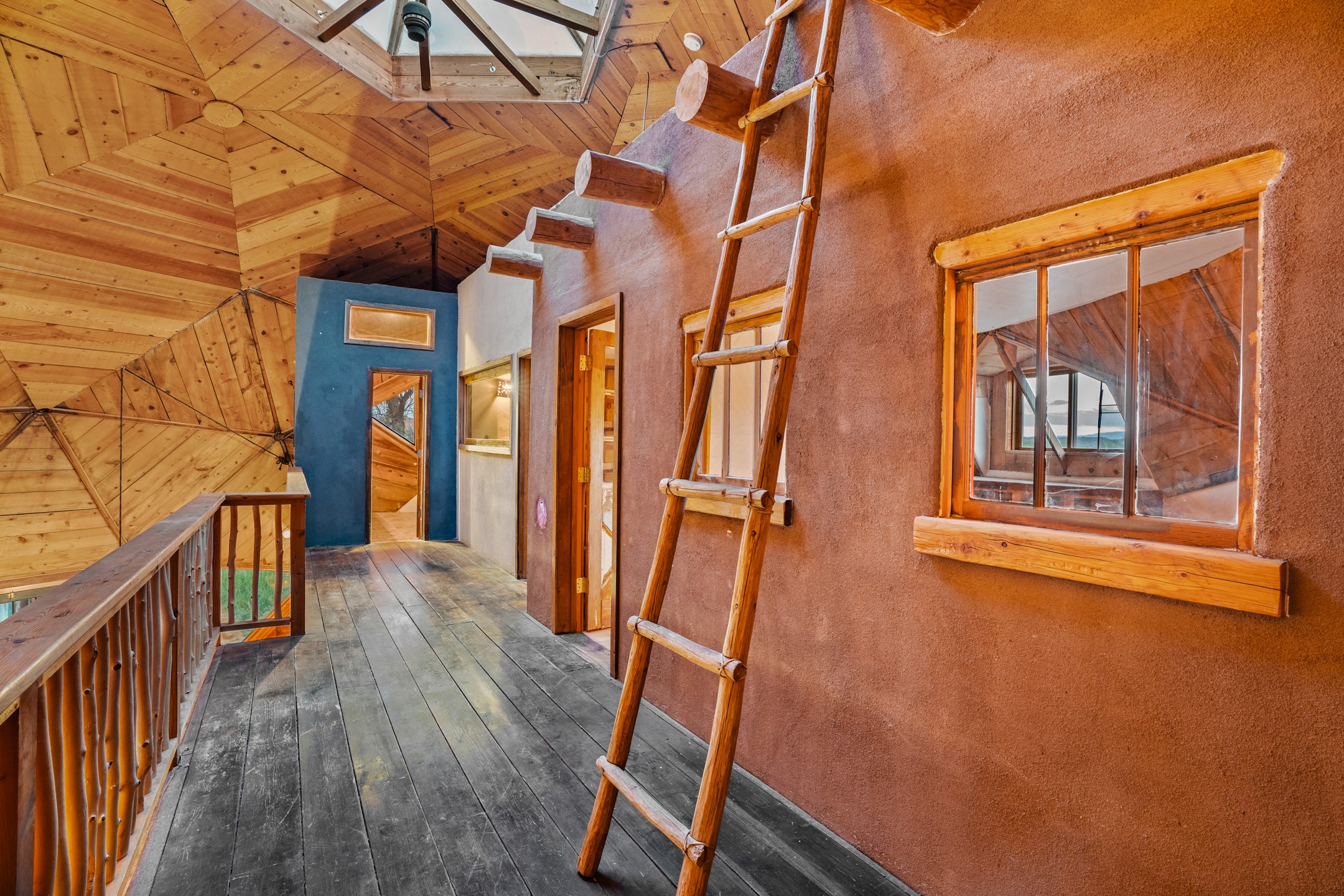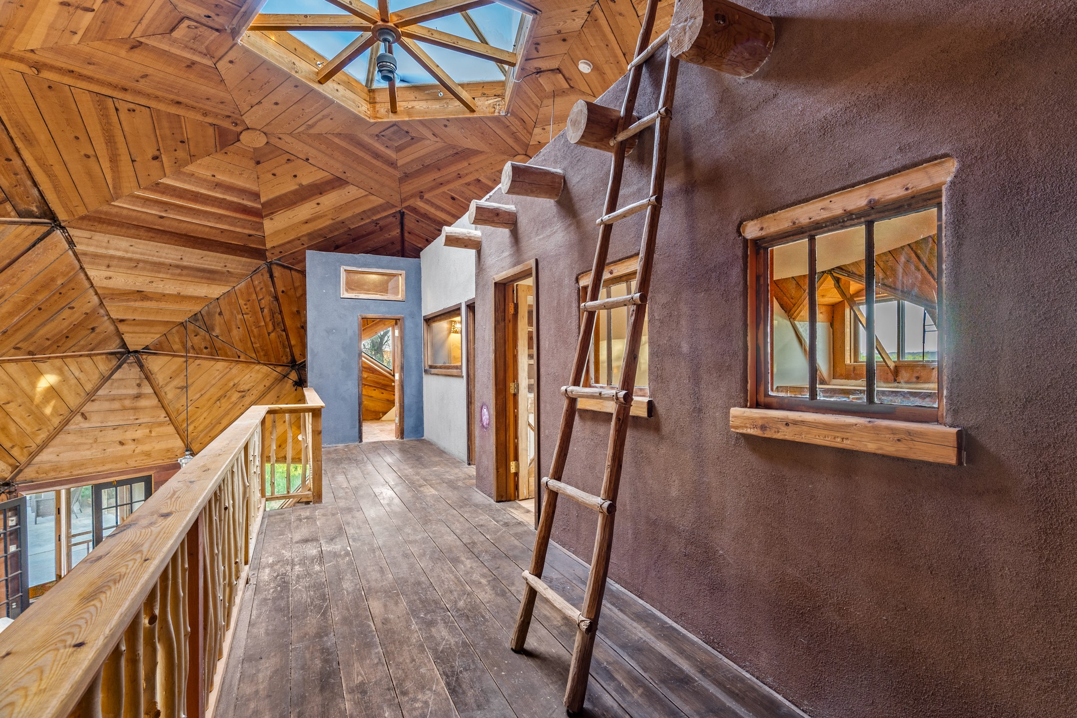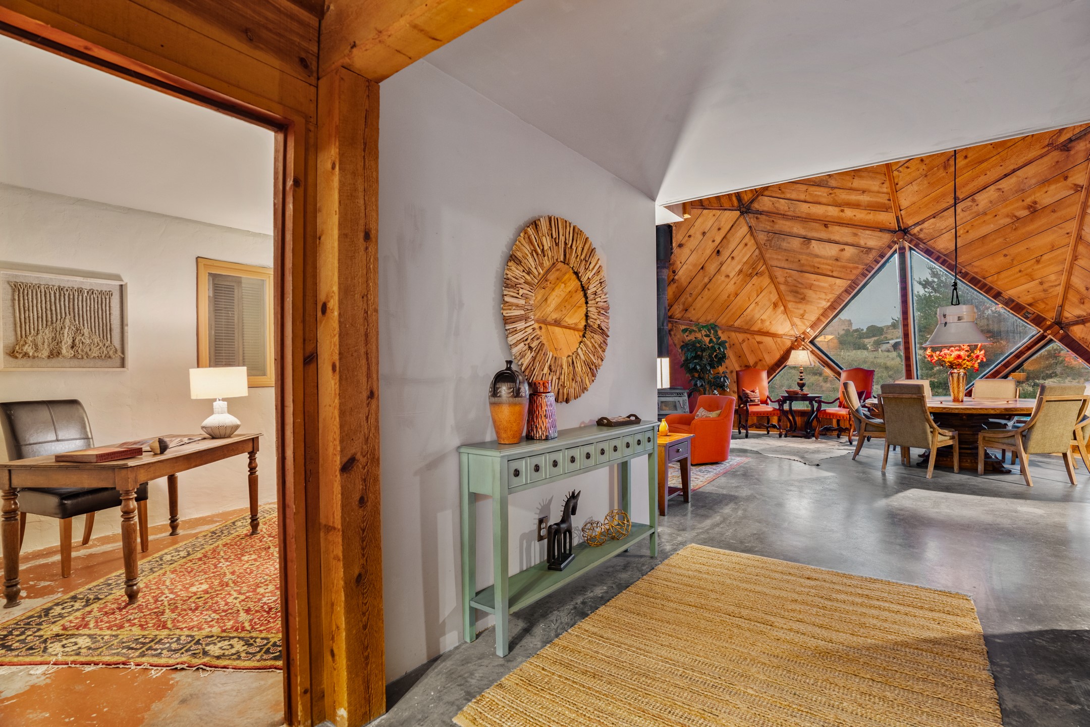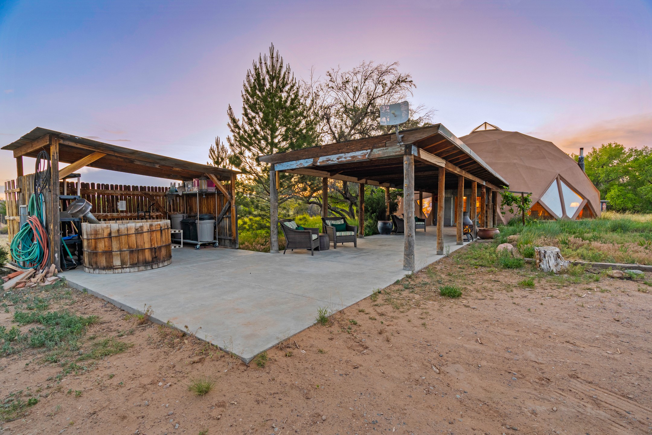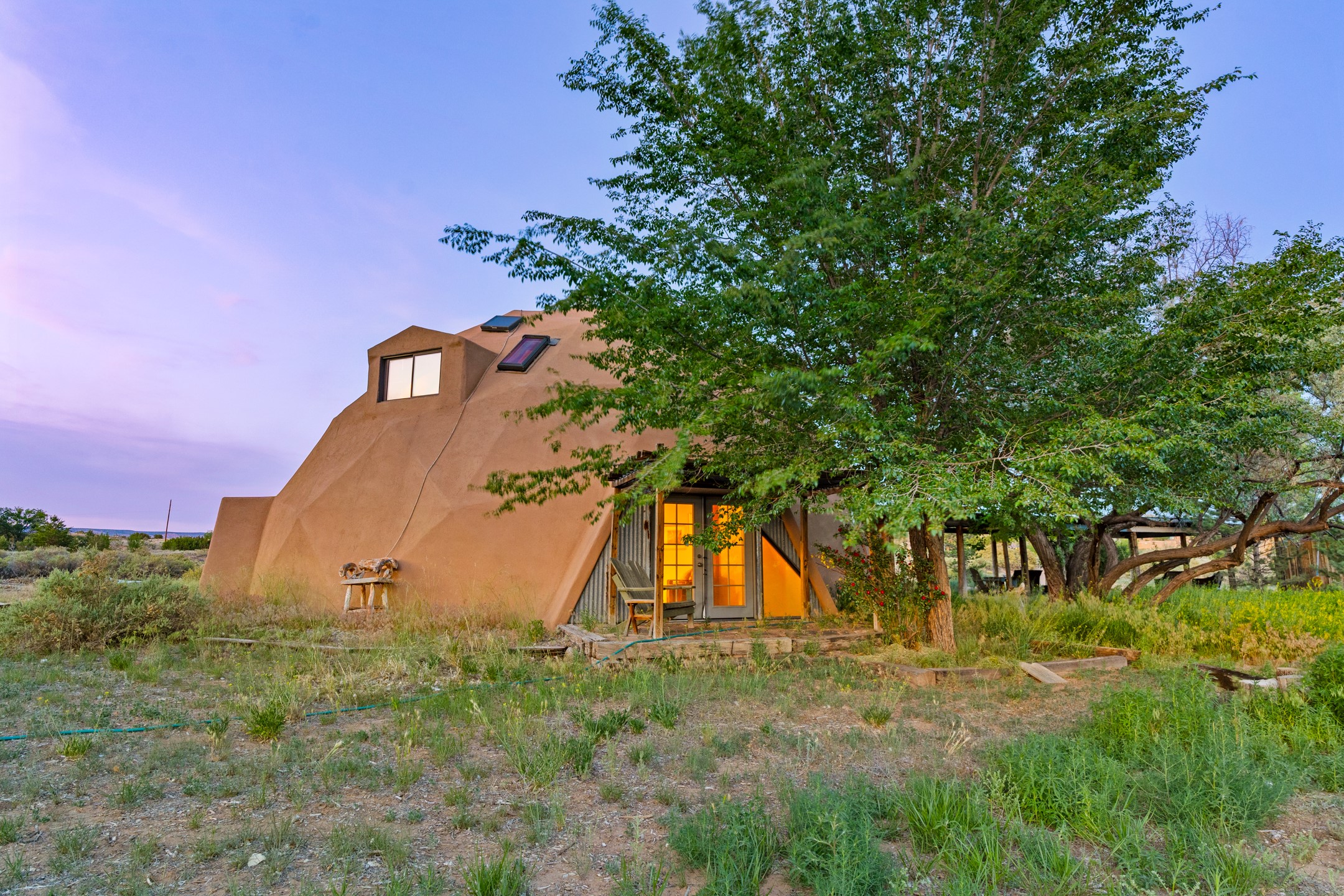 At the end of the road, you will find a singularly unique property in all of Northern New Mexico. This whimsical dome is sure to inspire! Lovingly built in the 1970's, this 3 bedroom, 2 bathroom property has been a place of gathering and community building for many years. A very spacious open concept living area provides kitchen, living and dining spaces with high ceilings and lots of natural light. The wooden ceilings provides a warm ambience. There is one large bedroom and a 3/4 bath downstairs. Upstairs you will find a full bath and one bedroom, plus an additional space for an office or flex room. There are so many possibilities with this beautiful land. Outside, new roof coating has been put on in the last few years. There are plenty of options for projects, horses, cattle or just hanging out by the bonfire and looking at the stars. There is a 720 square foot artist's studio on property, which has been an incubator for some of Santa Fe's great local artists. This property is a short walk to BLM land with many hoodoos and other interesting rock formations. Hiking, riding and enjoying the great outdoors is easy from this gem of a property. Don't miss the opportunity of a lifetime, schedule a showing today!