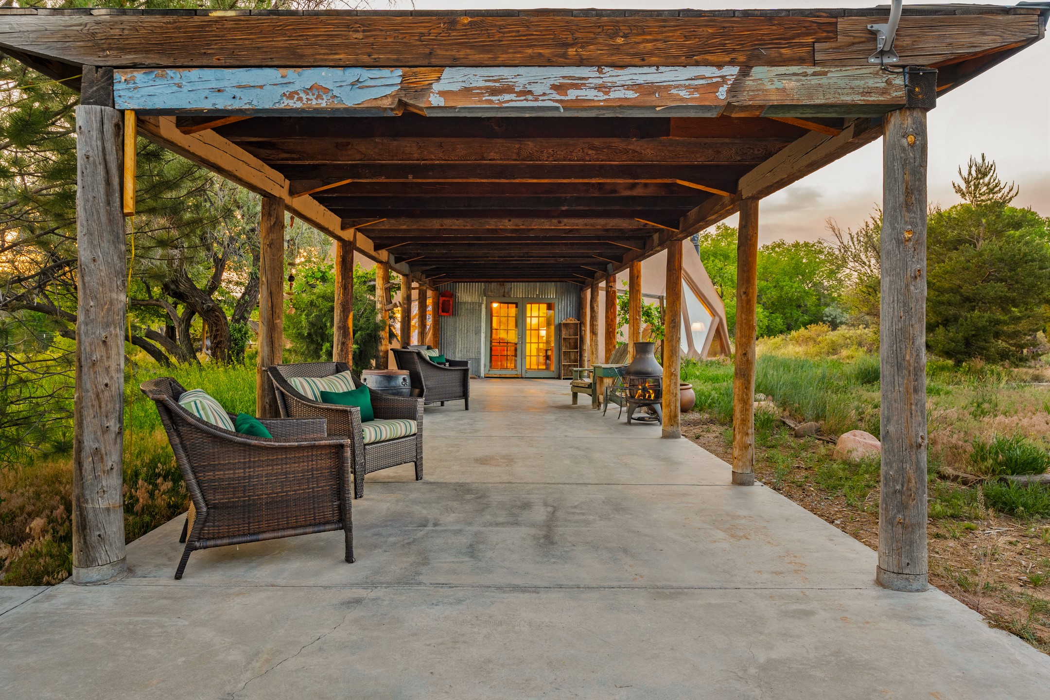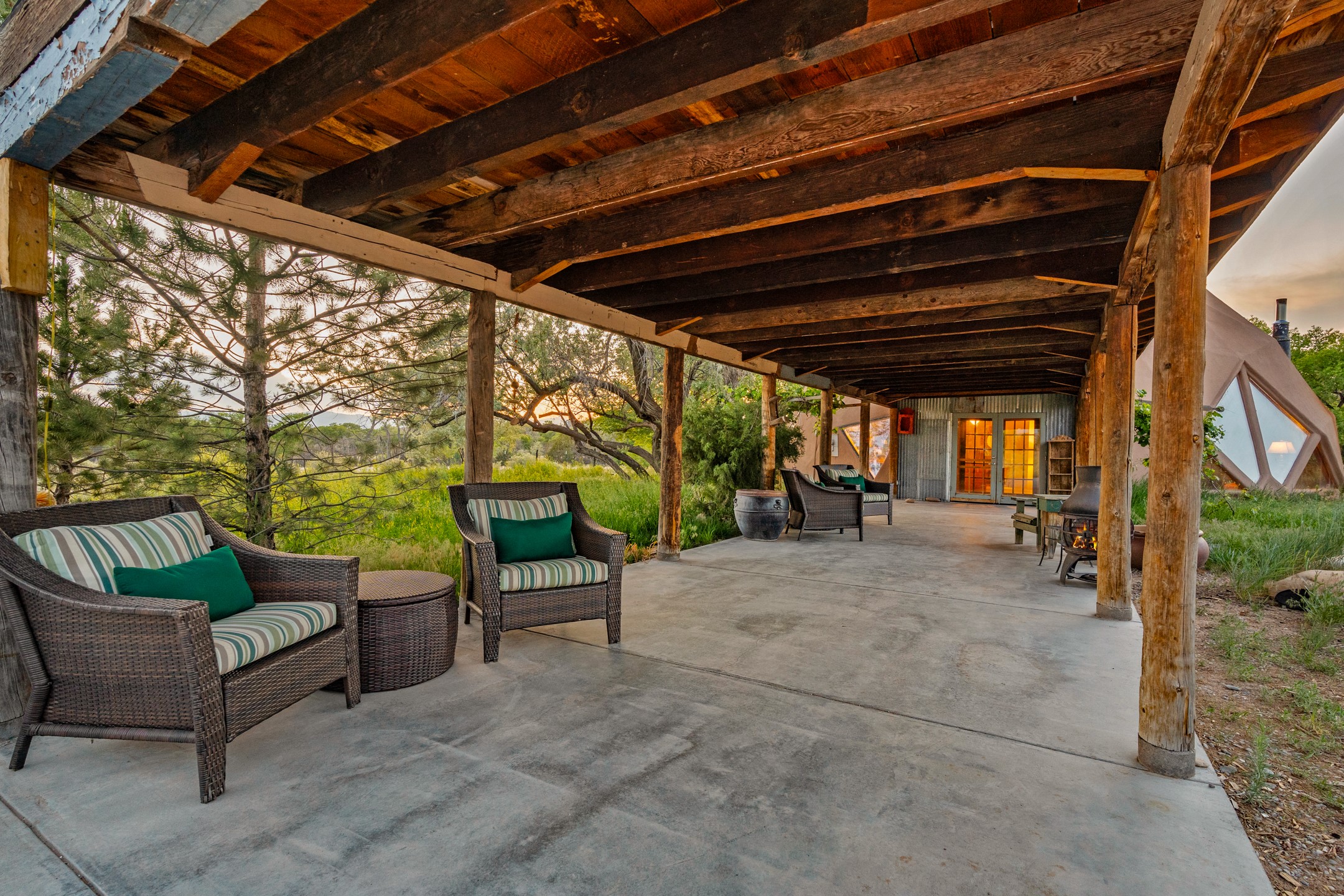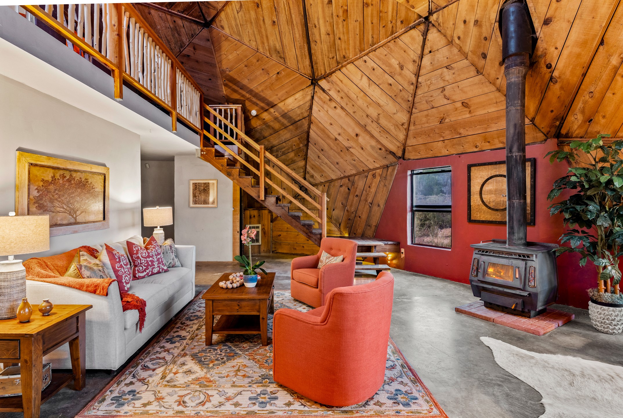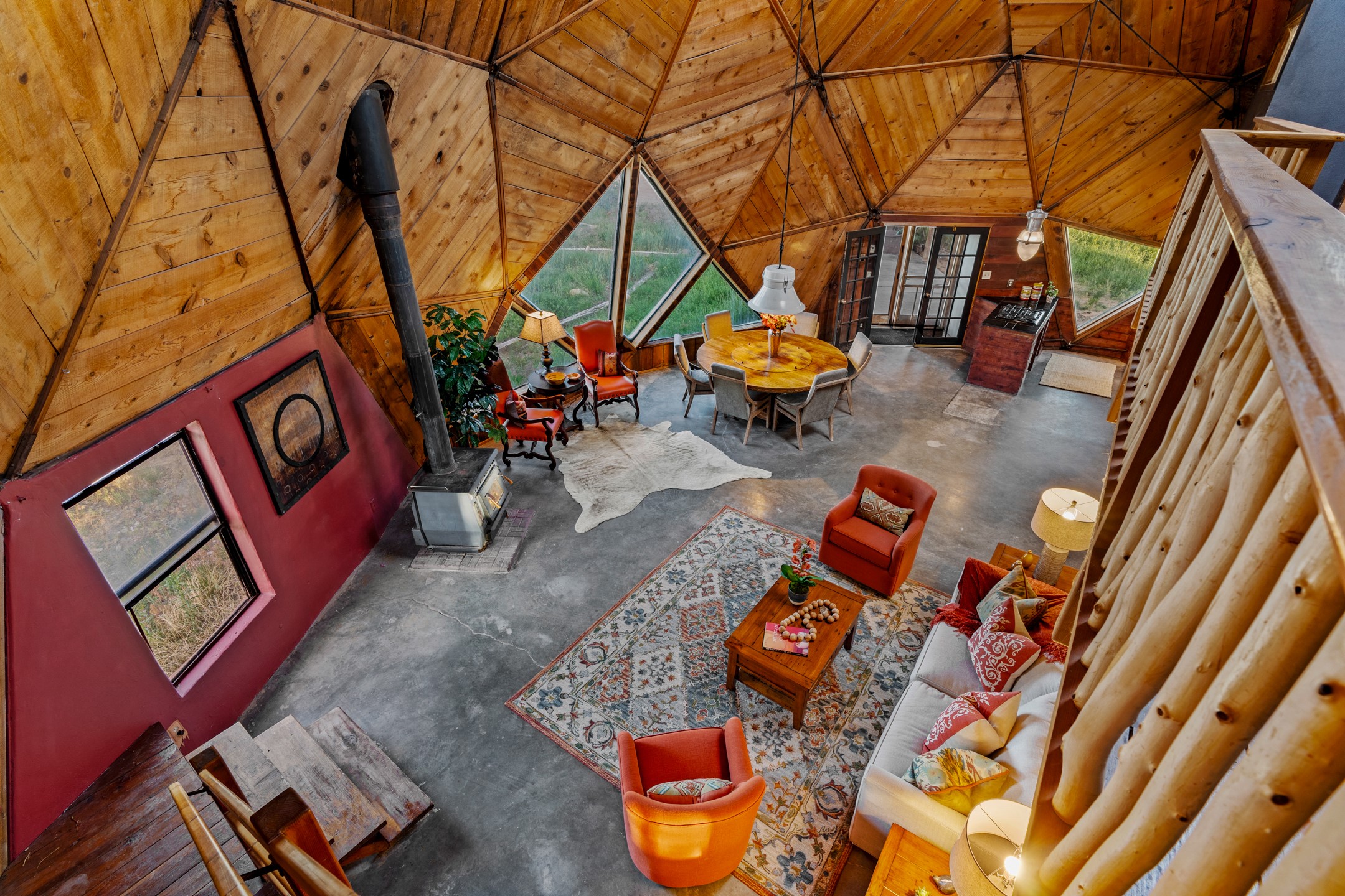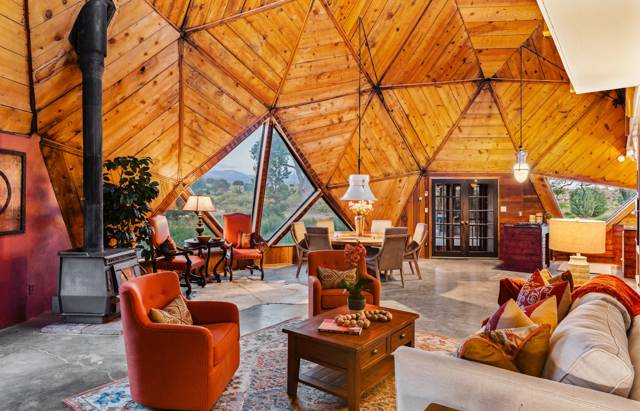At the end of the road, you will find a singularly unique property in all of Northern New Mexico. This whimsical dome is sure to inspire! Lovingly built in the 1970's, this 3 bedroom, 2 bathroom property has been a place of gathering and community building for many years. A very spacious open concept living area provides kitchen, living and dining spaces with high ceilings and lots of natural light. The wooden ceilings provides a warm ambience. There is one large bedroom and a 3/4 bath downstairs. Upstairs you will find a full bath and one bedroom, plus an additional space for an office or flex room. There are so many possibilities with this beautiful land. Outside, new roof coating has been put on in the last few years. There are plenty of options for projects, horses, cattle or just hanging out by the bonfire and looking at the stars. There is a 720 square foot artist's studio on property, which has been an incubator for some of Santa Fe's great local artists. This property is a short walk to BLM land with many hoodoos and other interesting rock formations. Hiking, riding and enjoying the great outdoors is easy from this gem of a property. Don't miss the opportunity of a lifetime, schedule a showing today!