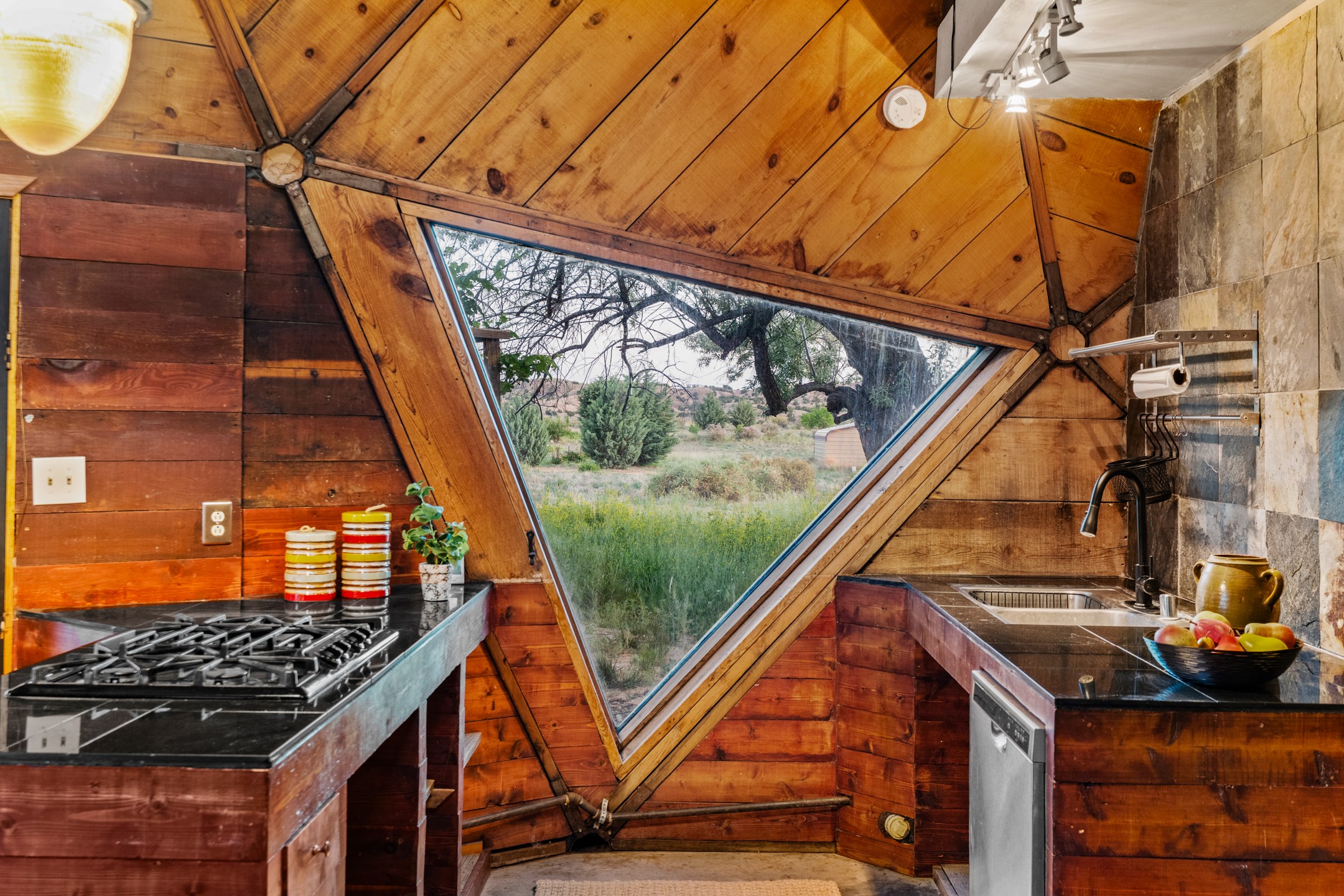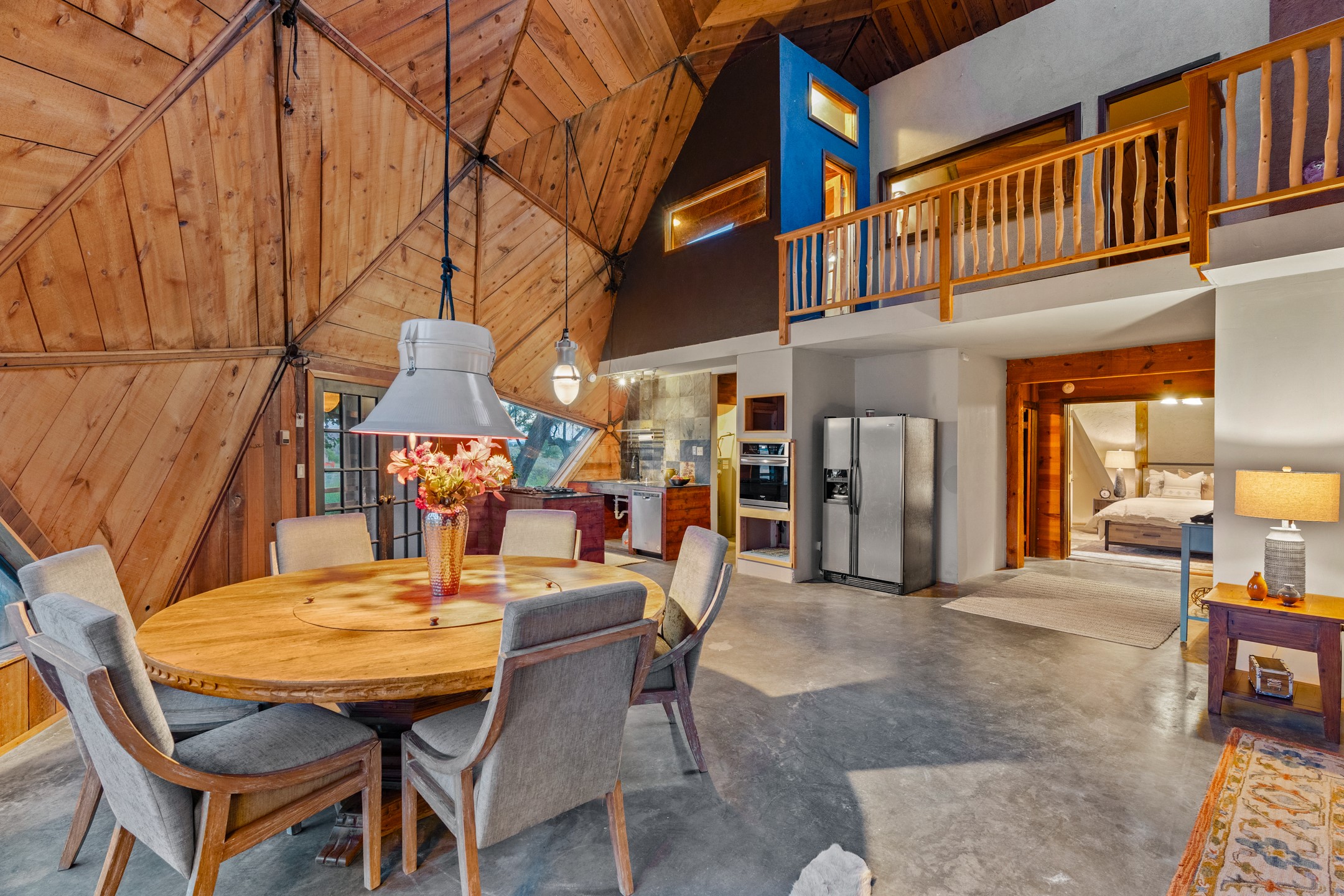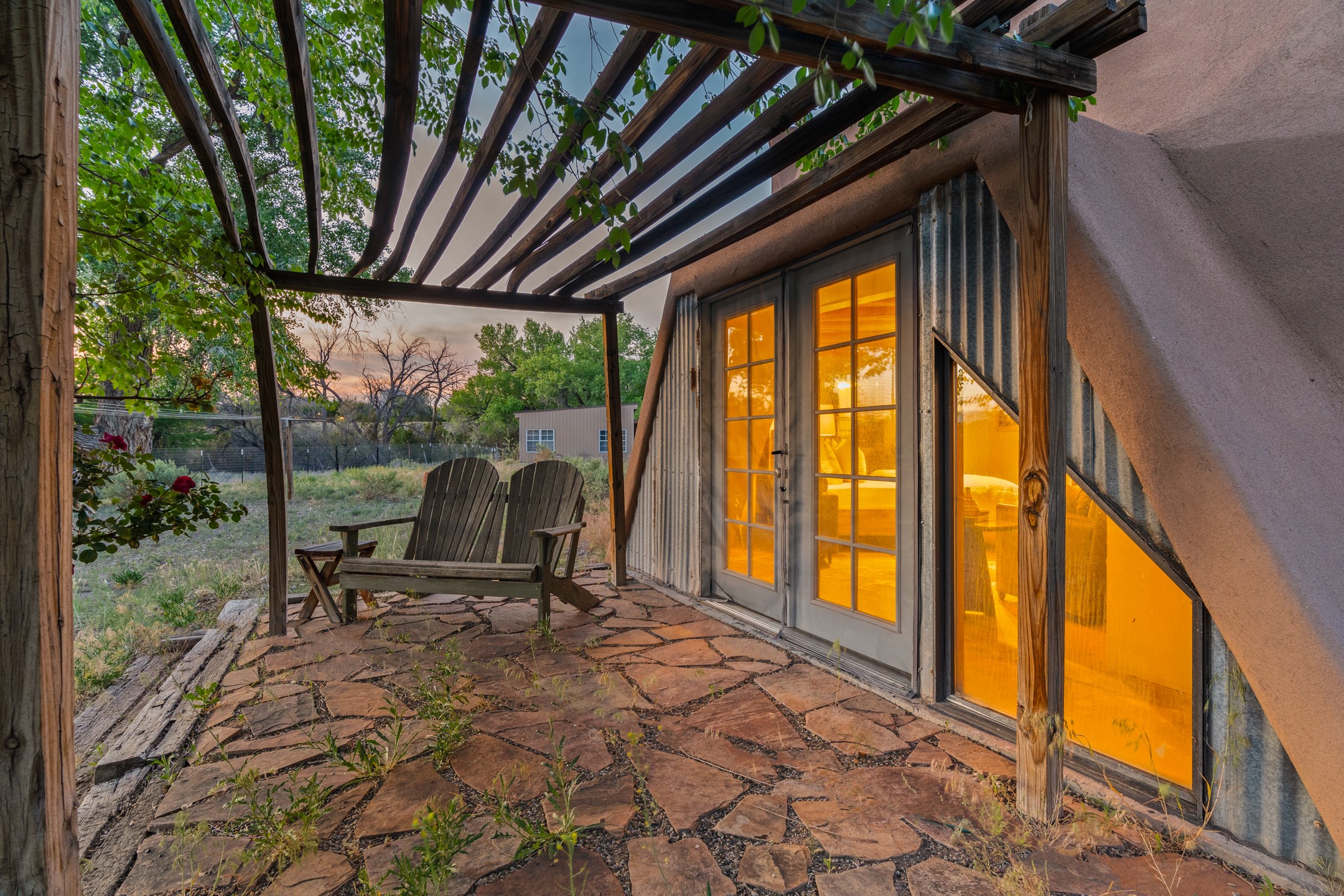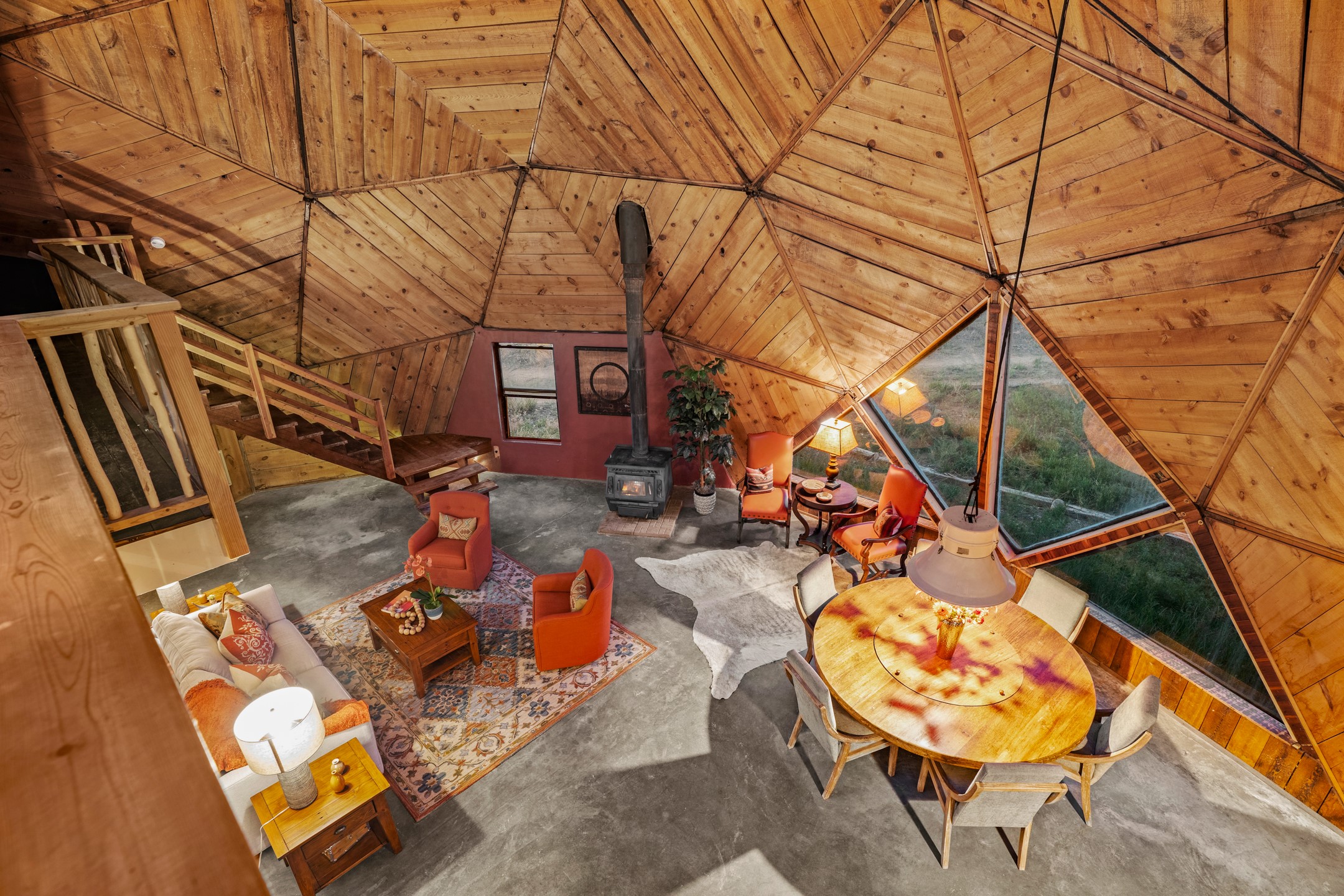 At the end of the road, you will find a singularly unique property in all of Northern New Mexico. This whimsical dome is sure to inspire! Lovingly built in the 1970's, this 3 bedroom, 2 bathroom property has been a place of gathering and community building for many years. A very spacious open concept living area provides kitchen, living and dining spaces with high ceilings and lots of natural light. The wooden ceilings provides a warm ambience. There is one large bedroom and a 3/4 bath downstairs. Upstairs you will find a full bath and one bedroom, plus an additional space for an office or flex room. There are so many possibilities with this beautiful land. Outside, new roof coating has been put on in the last few years. There are plenty of options for projects, horses, cattle or just hanging out by the bonfire and looking at the stars. There is a 720 square foot artist's studio on property, which has been an incubator for some of Santa Fe's great local artists. This property is a short walk to BLM land with many hoodoos and other interesting rock formations. Hiking, riding and enjoying the great outdoors is easy from this gem of a property. Don't miss the opportunity of a lifetime, schedule a showing today!