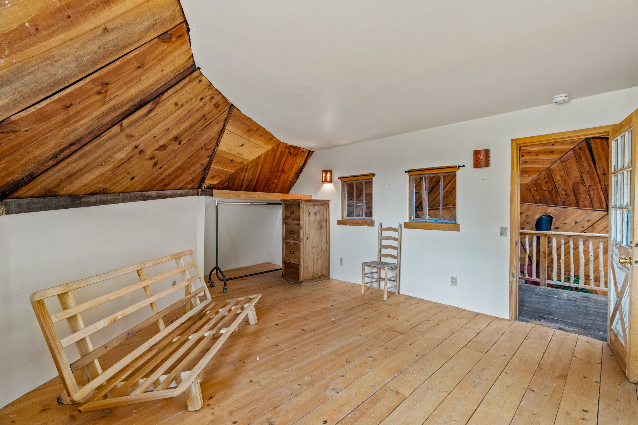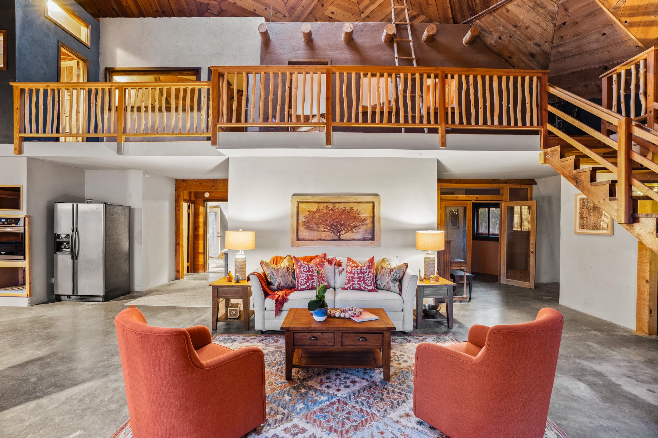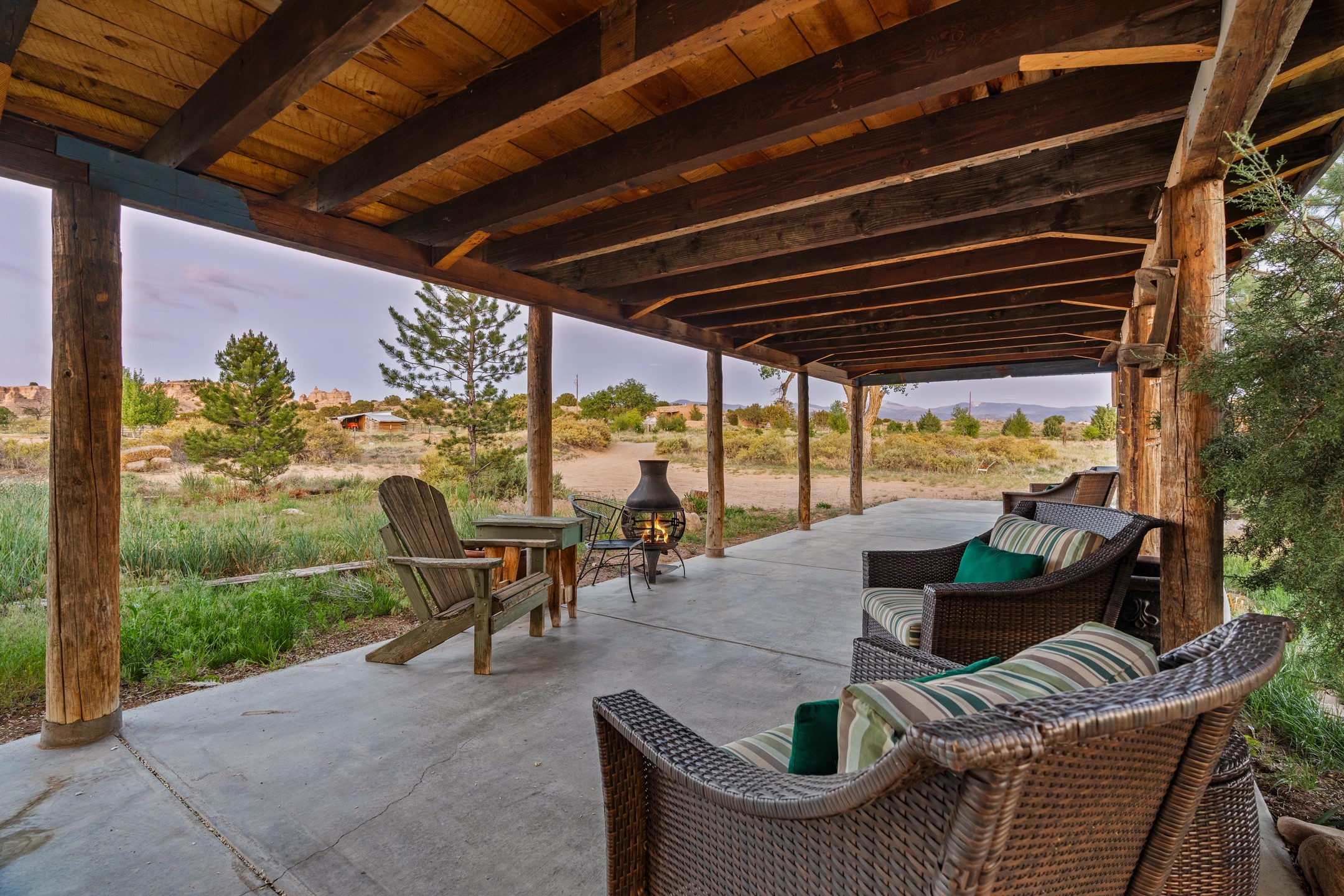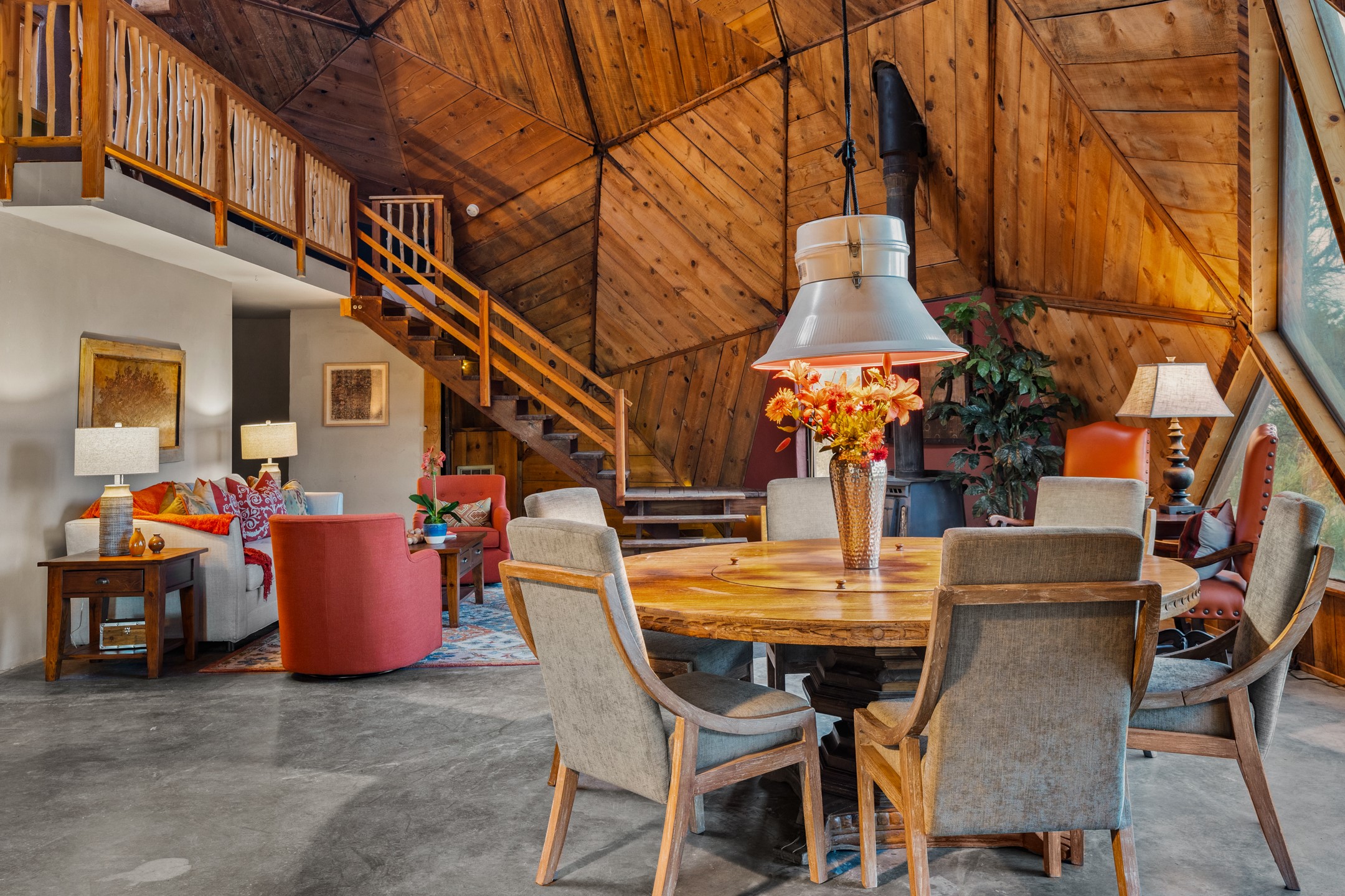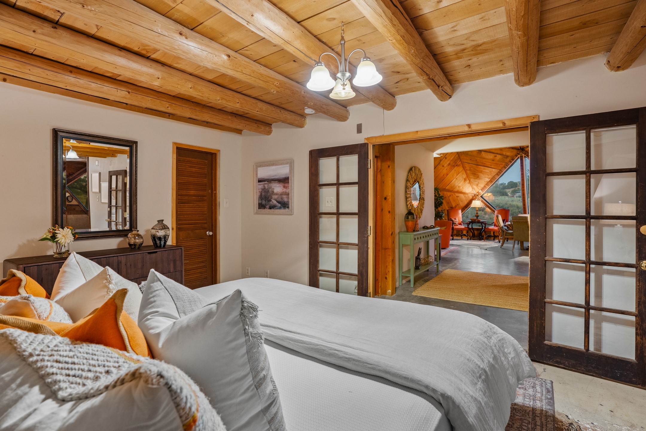 At the end of the road, you will find a singularly unique property in all of Northern New Mexico. This whimsical dome is sure to inspire! Lovingly built in the 1970's, this 3 bedroom, 2 bathroom property has been a place of gathering and community building for many years. A very spacious open concept living area provides kitchen, living and dining spaces with high ceilings and lots of natural light. The wooden ceilings provides a warm ambience. There is one large bedroom and a 3/4 bath downstairs. Upstairs you will find a full bath and one bedroom, plus an additional space for an office or flex room. There are so many possibilities with this beautiful land. Outside, new roof coating has been put on in the last few years. There are plenty of options for projects, horses, cattle or just hanging out by the bonfire and looking at the stars. There is a 720 square foot artist's studio on property, which has been an incubator for some of Santa Fe's great local artists. This property is a short walk to BLM land with many hoodoos and other interesting rock formations. Hiking, riding and enjoying the great outdoors is easy from this gem of a property. Don't miss the opportunity of a lifetime, schedule a showing today!
