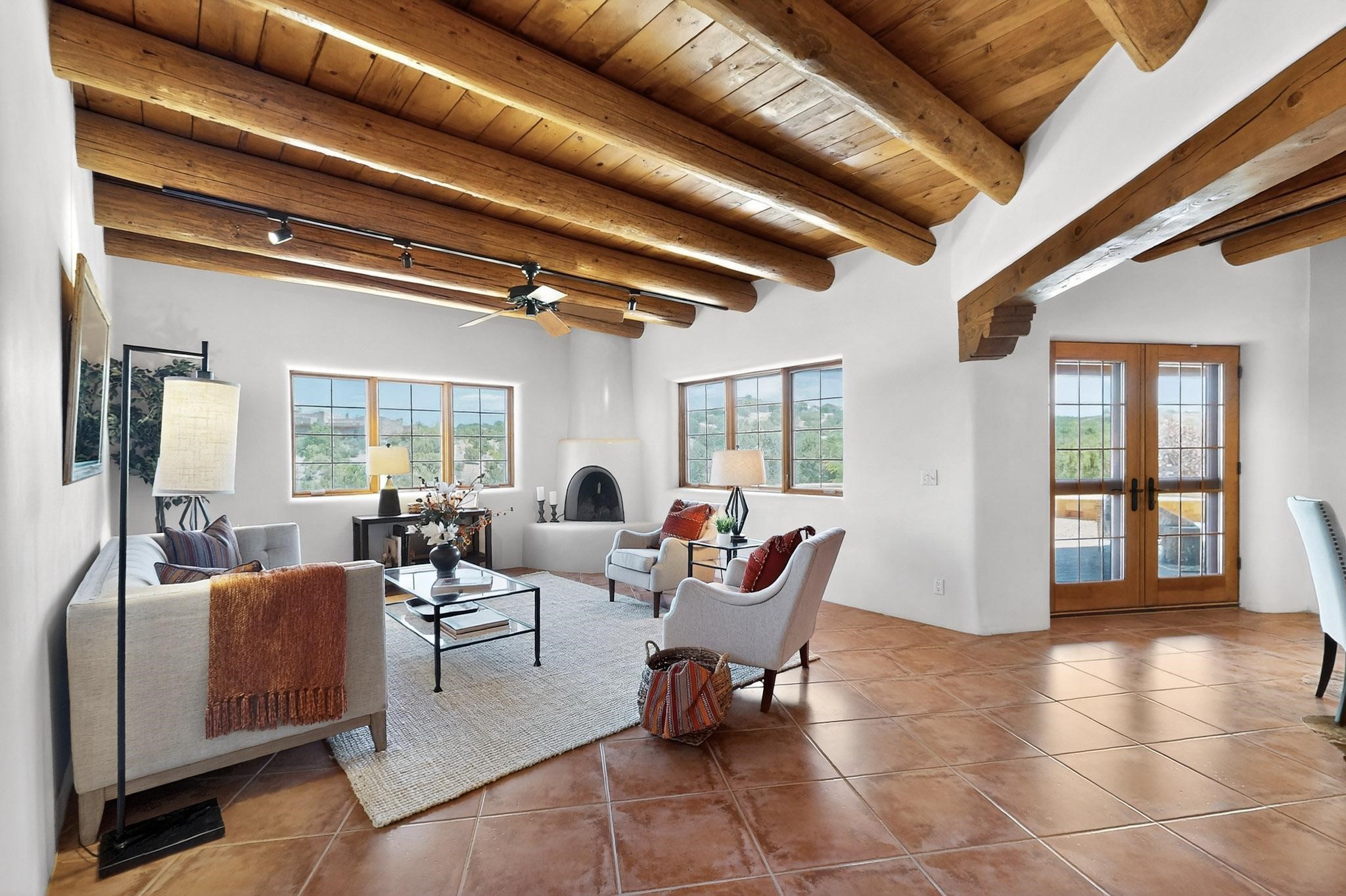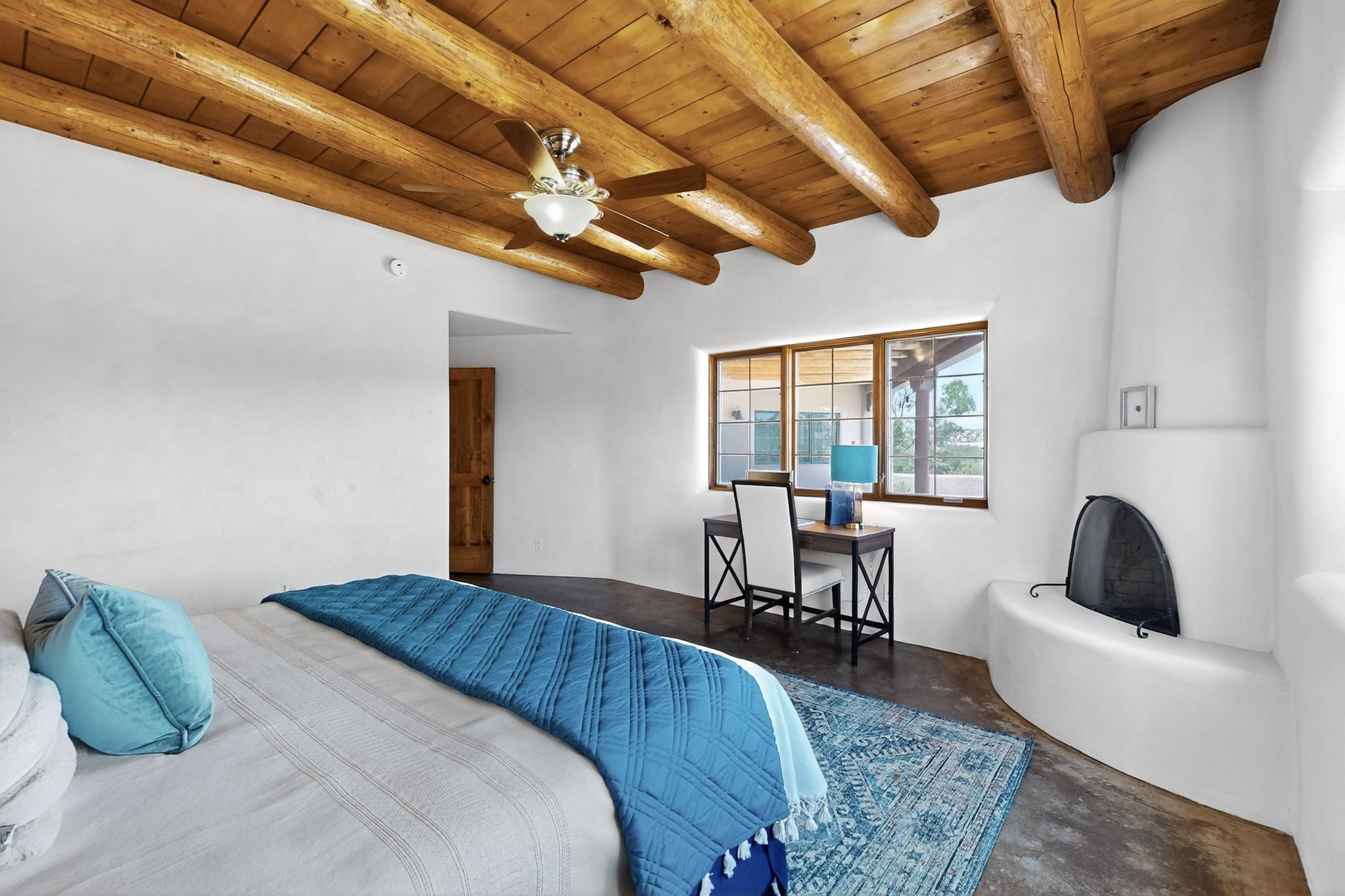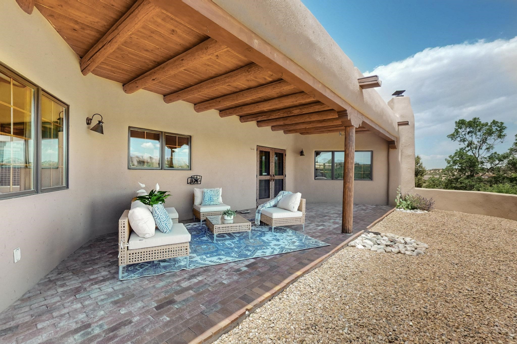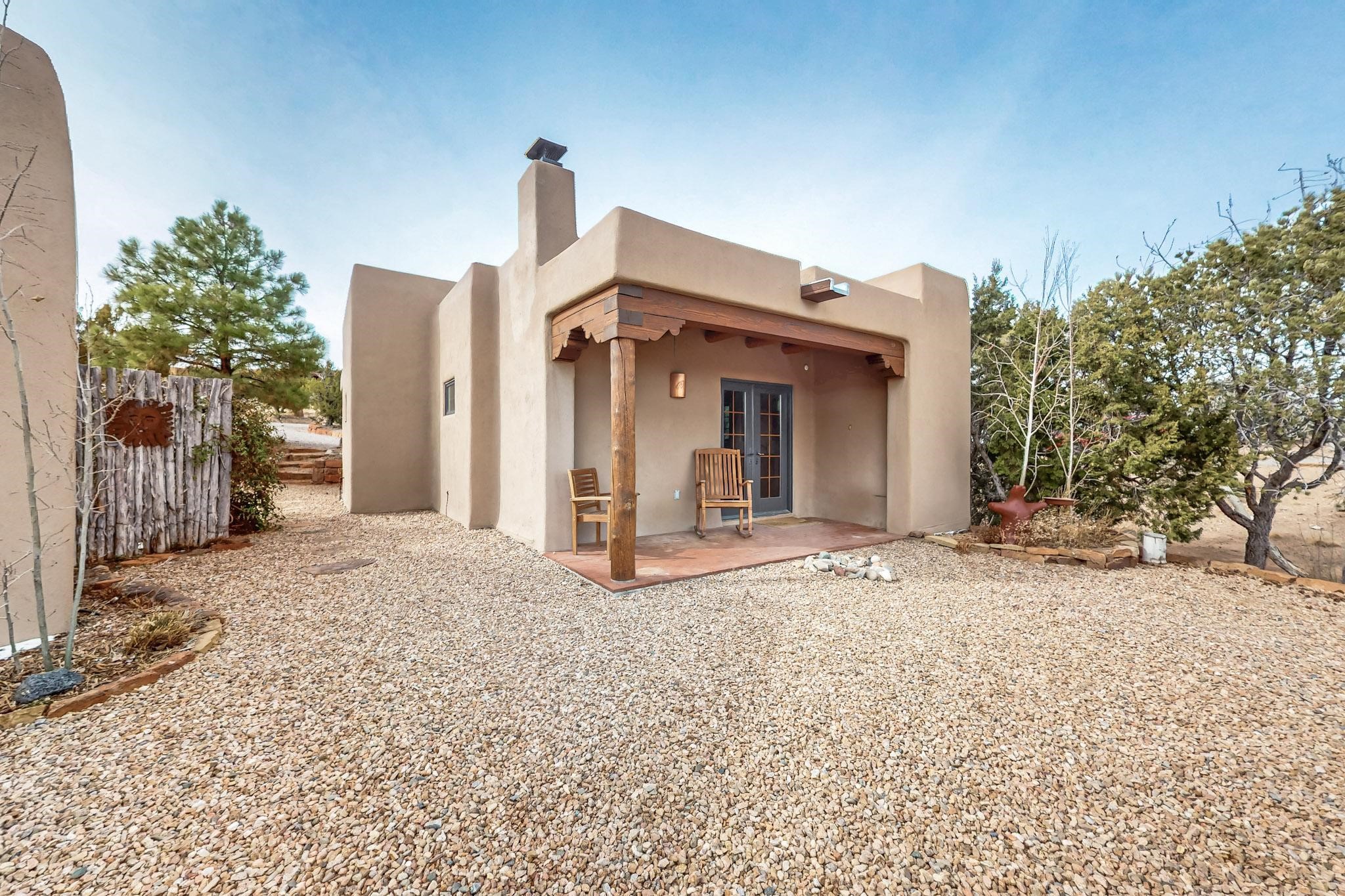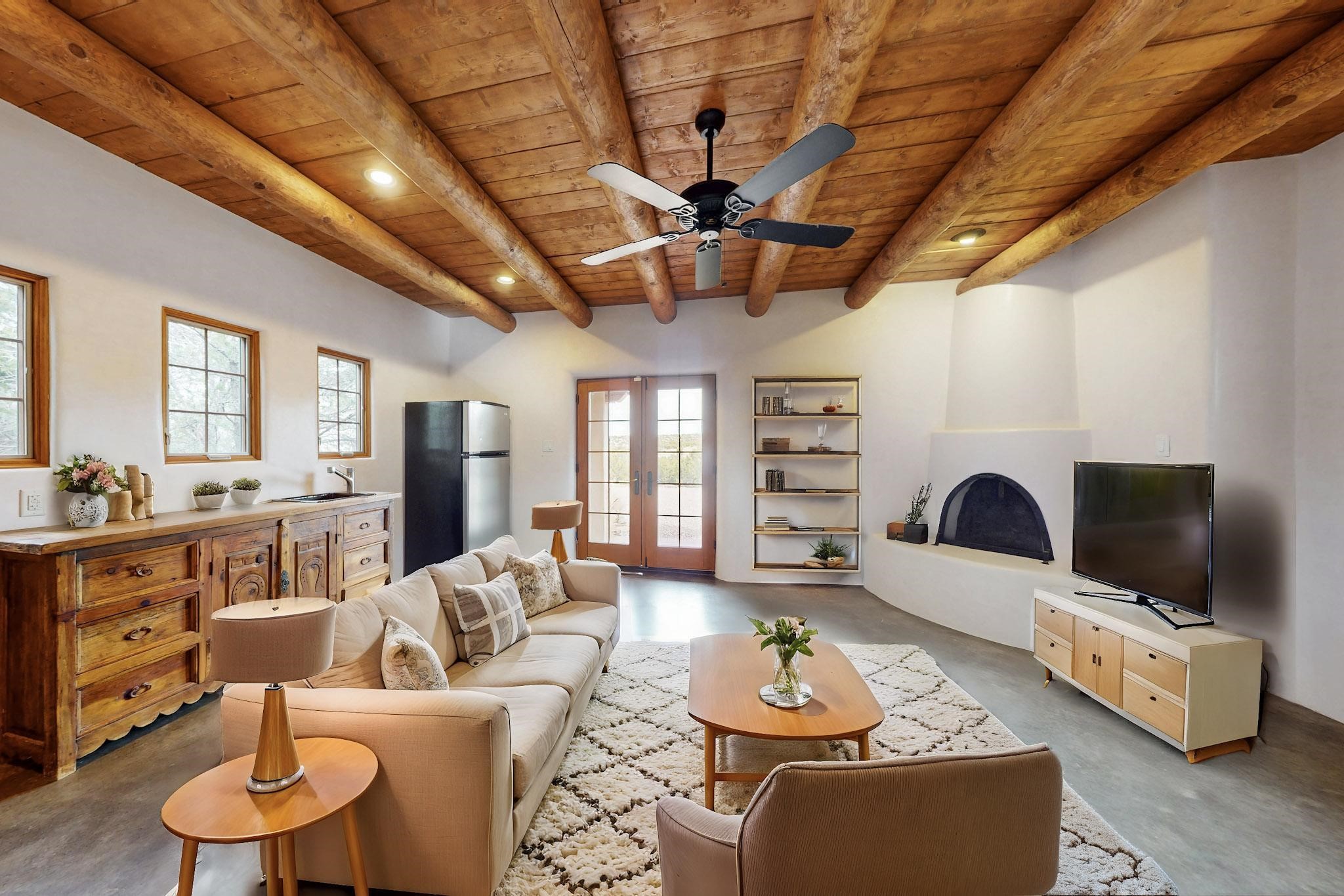This Pueblo Revival style home features three bedrooms in the main house along with a detached, one-bedroom studio/casita. Situated in the beautiful La Tierra area, this adobe home is set on over two acres of land and is conveniently located just 15 minutes from downtown. The main home, spanning just over 2,000 sq ft, offers a private retreat with an open concept layout, high ceilings, vigas, wood decked ceilings, plastered walls, and two kiva fireplaces. You'll find panoramic views of the Sangre de Cristo Mountains from the large portal off the dining area, which creates a perfect setting for entertaining. The kitchen is well-appointed with a Wolf range, stainless steel appliances, colorful tile, Alder cabinets, and plenty of storage. The property also includes a heated garage for your convenience. The one-bedroom casita features similar finishes and a kiva fireplace, offering flexible options for use.