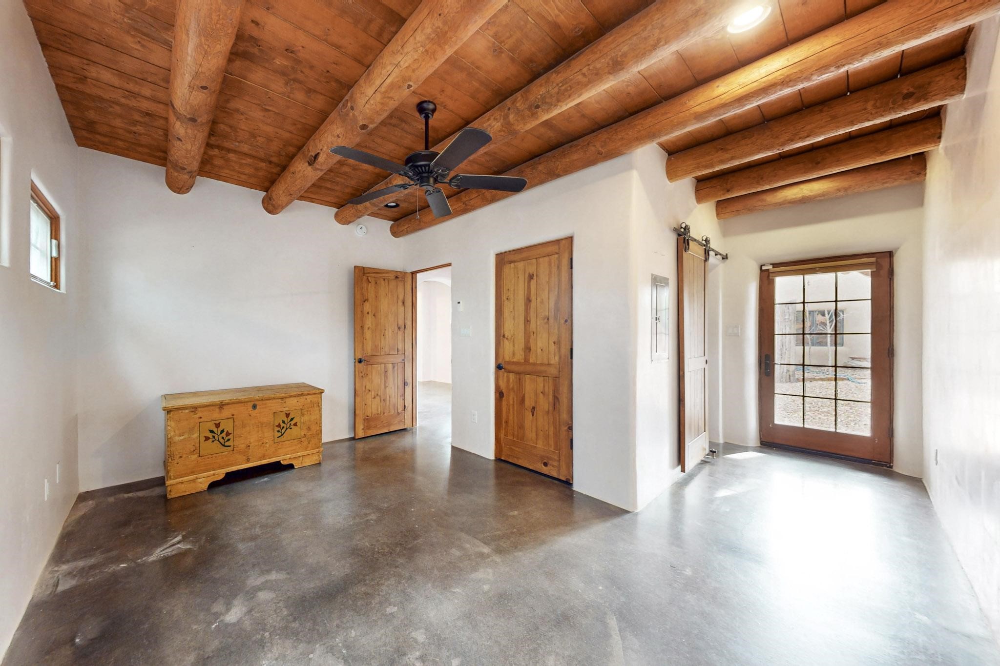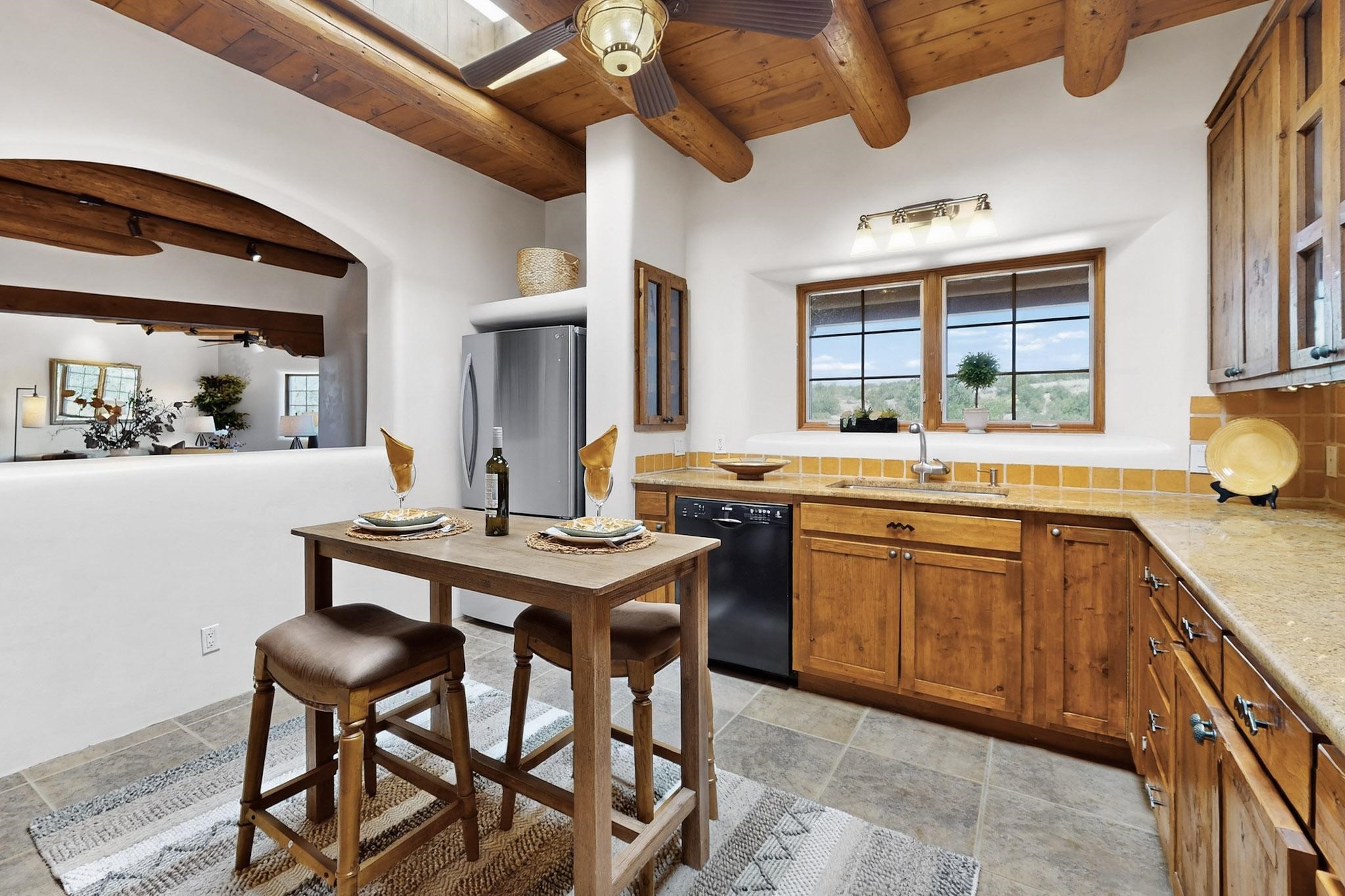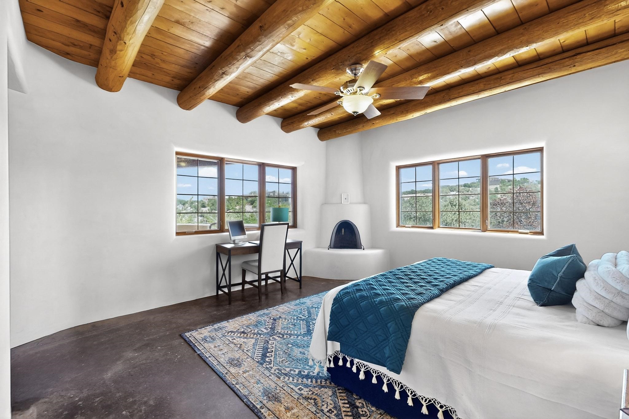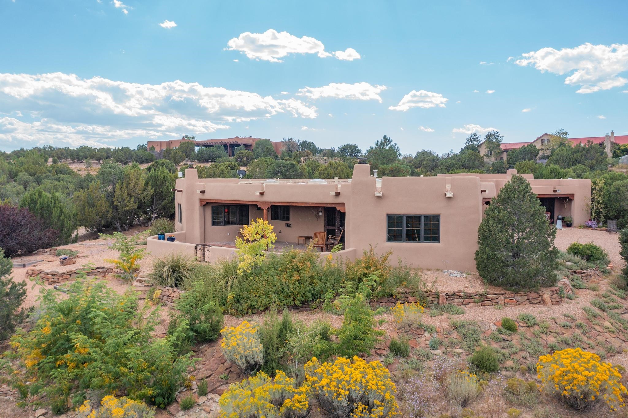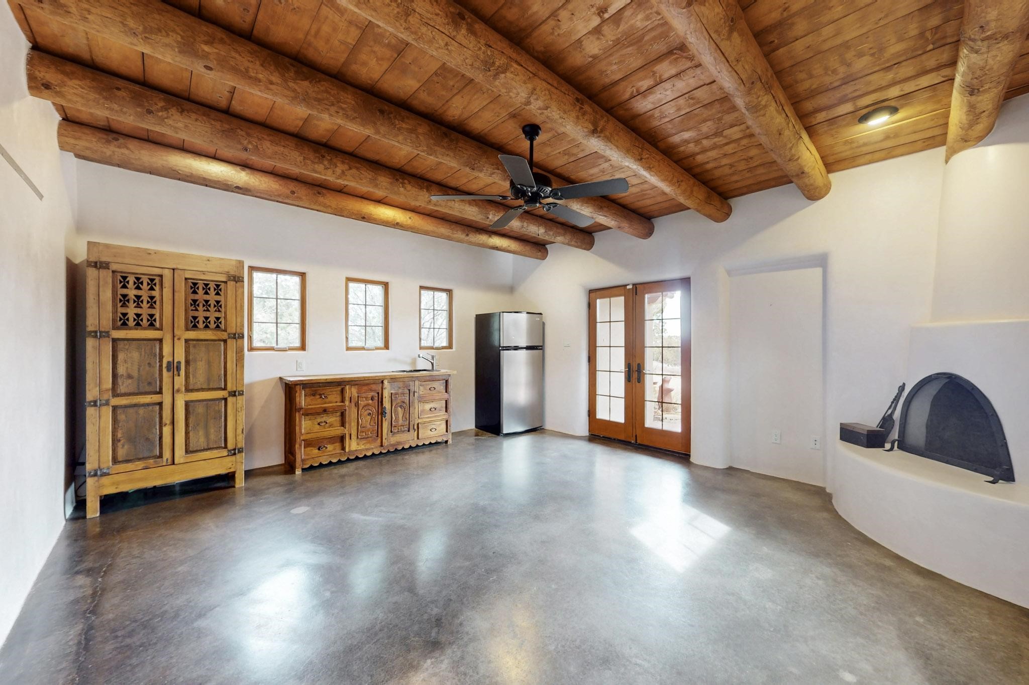 This Pueblo Revival style home features three bedrooms in the main house along with a detached, one-bedroom studio/casita. Situated in the beautiful La Tierra area, this adobe home is set on over two acres of land and is conveniently located just 15 minutes from downtown. The main home, spanning just over 2,000 sq ft, offers a private retreat with an open concept layout, high ceilings, vigas, wood decked ceilings, plastered walls, and two kiva fireplaces. You'll find panoramic views of the Sangre de Cristo Mountains from the large portal off the dining area, which creates a perfect setting for entertaining. The kitchen is well-appointed with a Wolf range, stainless steel appliances, colorful tile, Alder cabinets, and plenty of storage. The property also includes a heated garage for your convenience. The one-bedroom casita features similar finishes and a kiva fireplace, offering flexible options for use.