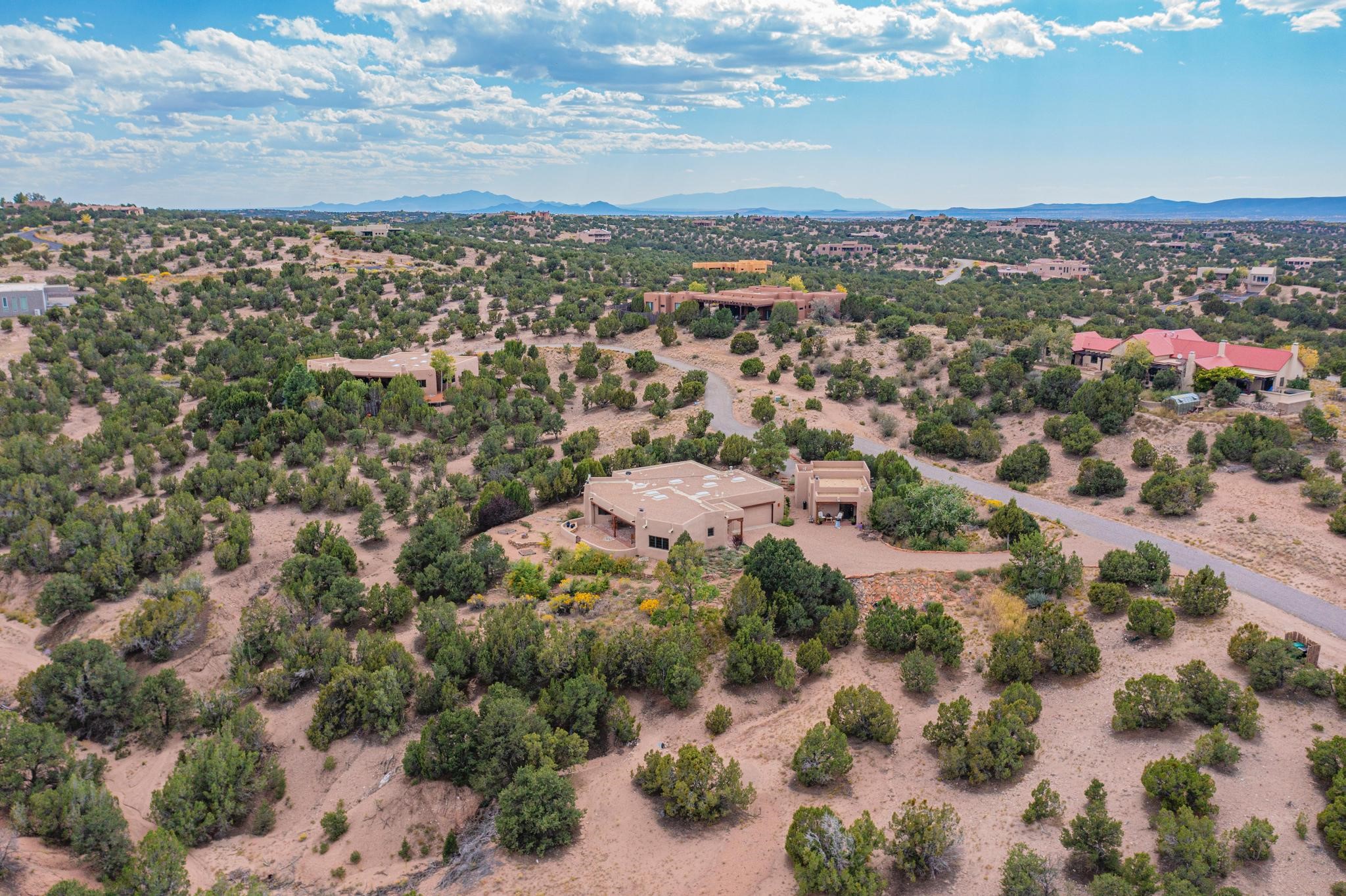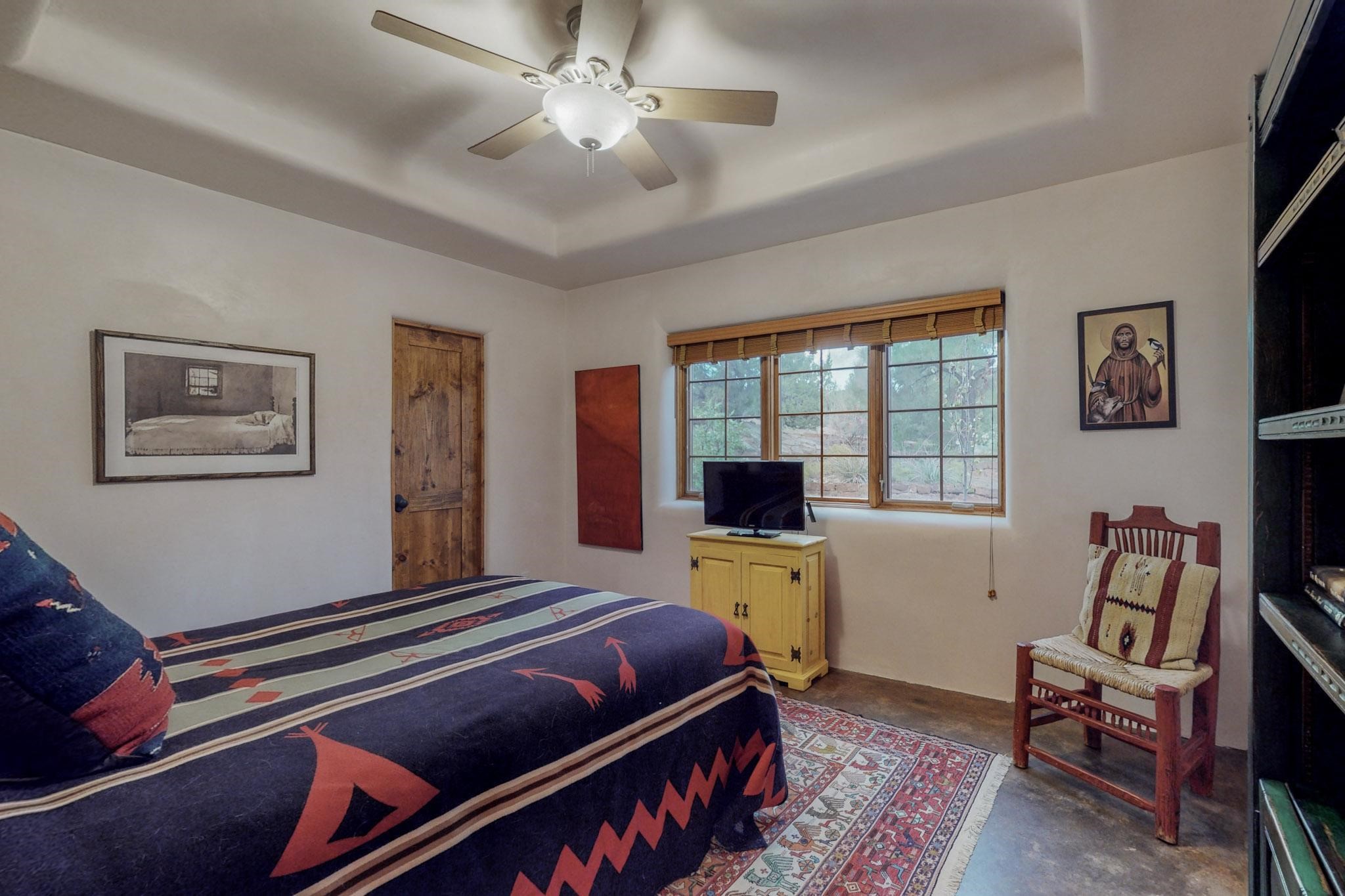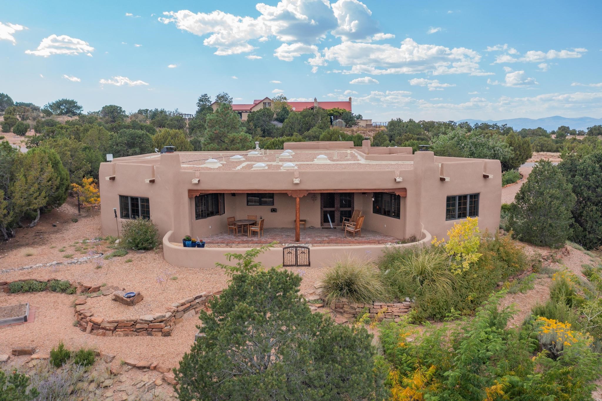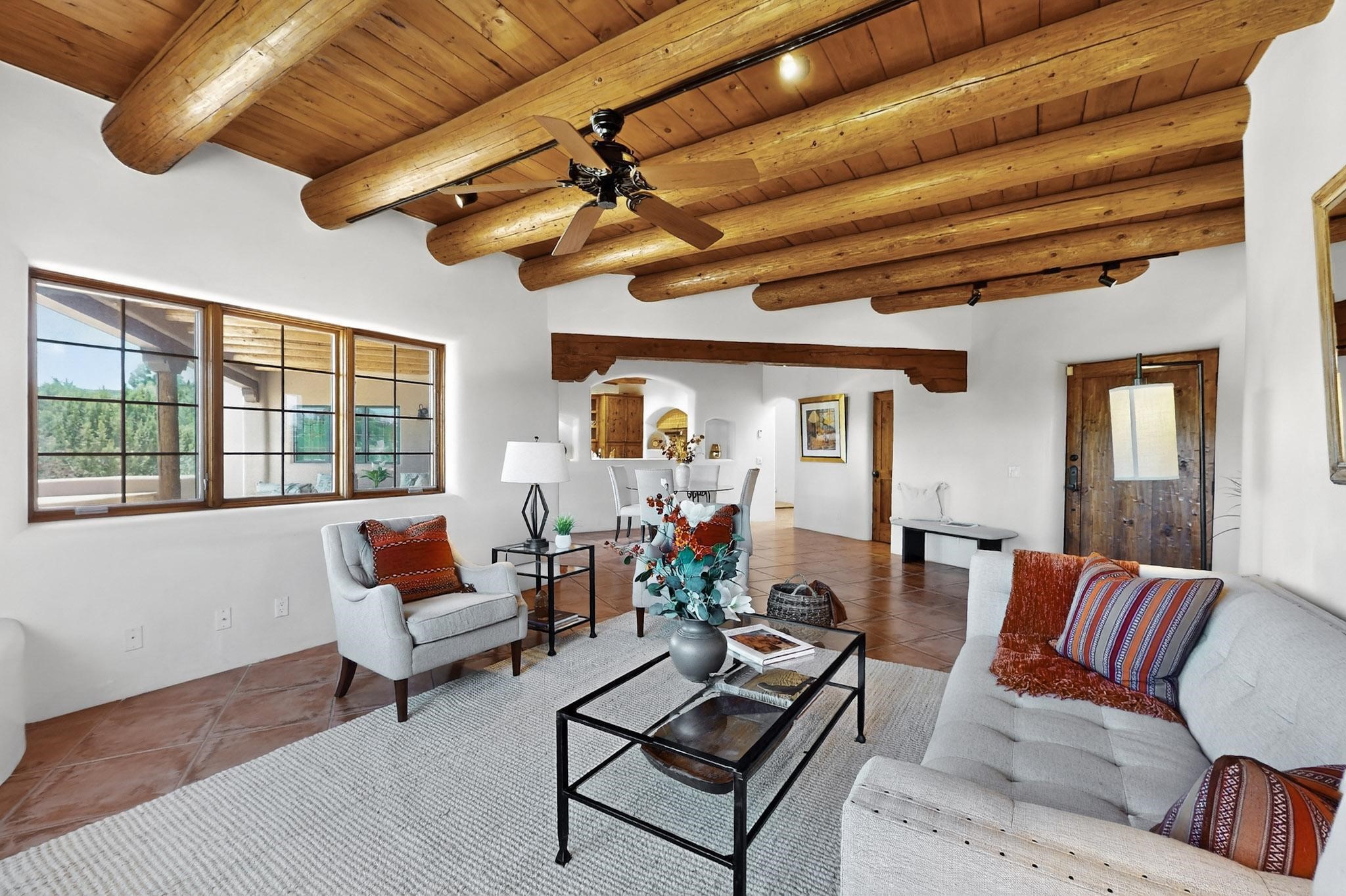 This Pueblo Revival style home features three bedrooms in the main house along with a detached, one-bedroom studio/casita. Situated in the beautiful La Tierra area, this adobe home is set on over two acres of land and is conveniently located just 15 minutes from downtown. The main home, spanning just over 2,000 sq ft, offers a private retreat with an open concept layout, high ceilings, vigas, wood decked ceilings, plastered walls, and two kiva fireplaces. You'll find panoramic views of the Sangre de Cristo Mountains from the large portal off the dining area, which creates a perfect setting for entertaining. The kitchen is well-appointed with a Wolf range, stainless steel appliances, colorful tile, Alder cabinets, and plenty of storage. The property also includes a heated garage for your convenience. The one-bedroom casita features similar finishes and a kiva fireplace, offering flexible options for use.