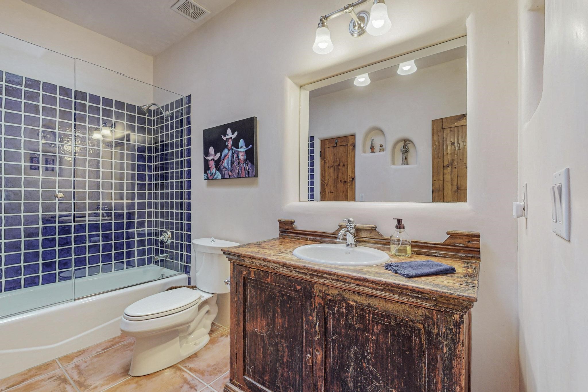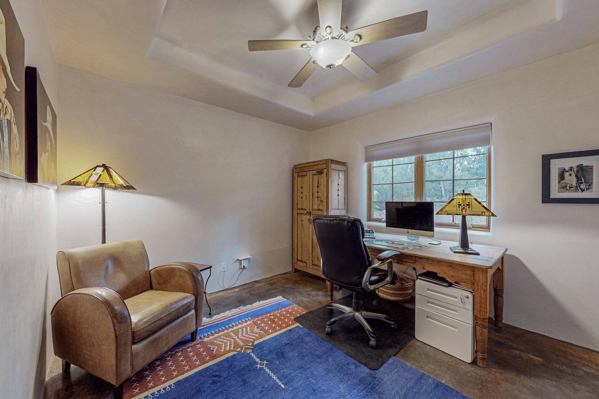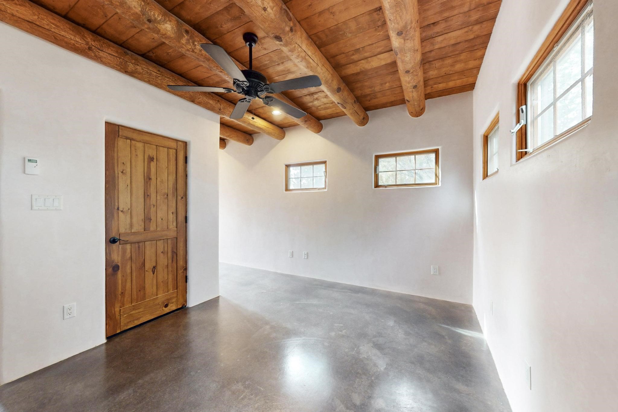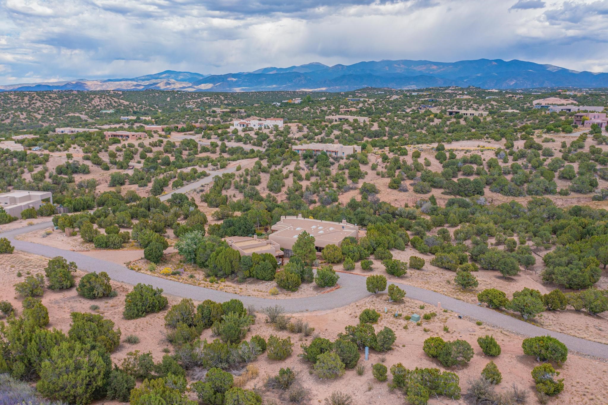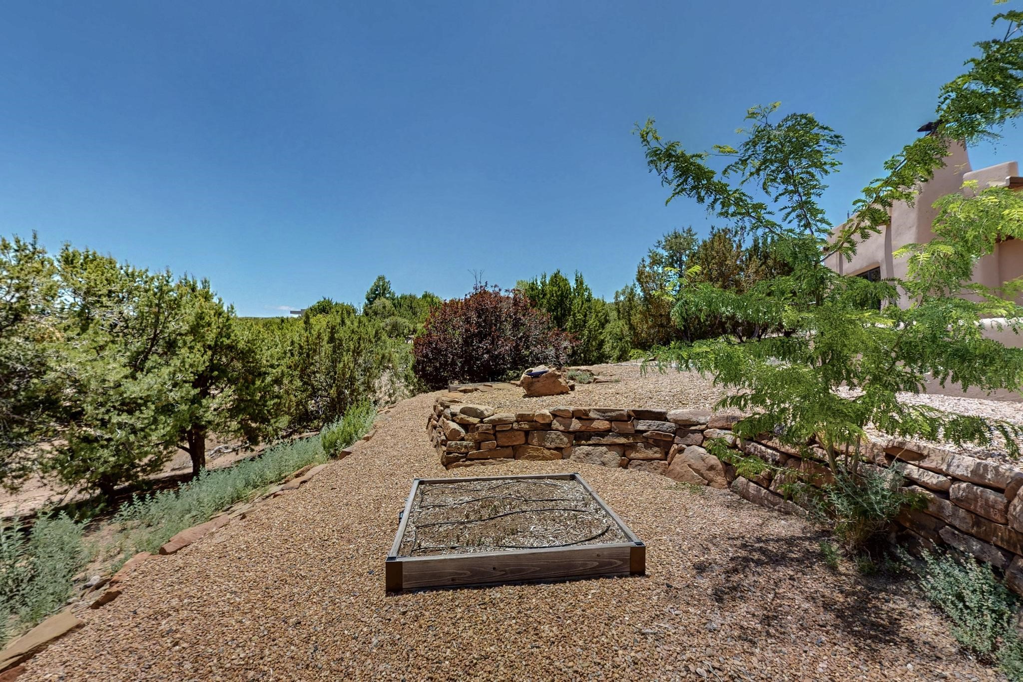 This Pueblo Revival style home features three bedrooms in the main house along with a detached, one-bedroom studio/casita. Situated in the beautiful La Tierra area, this adobe home is set on over two acres of land and is conveniently located just 15 minutes from downtown. The main home, spanning just over 2,000 sq ft, offers a private retreat with an open concept layout, high ceilings, vigas, wood decked ceilings, plastered walls, and two kiva fireplaces. You'll find panoramic views of the Sangre de Cristo Mountains from the large portal off the dining area, which creates a perfect setting for entertaining. The kitchen is well-appointed with a Wolf range, stainless steel appliances, colorful tile, Alder cabinets, and plenty of storage. The property also includes a heated garage for your convenience. The one-bedroom casita features similar finishes and a kiva fireplace, offering flexible options for use.