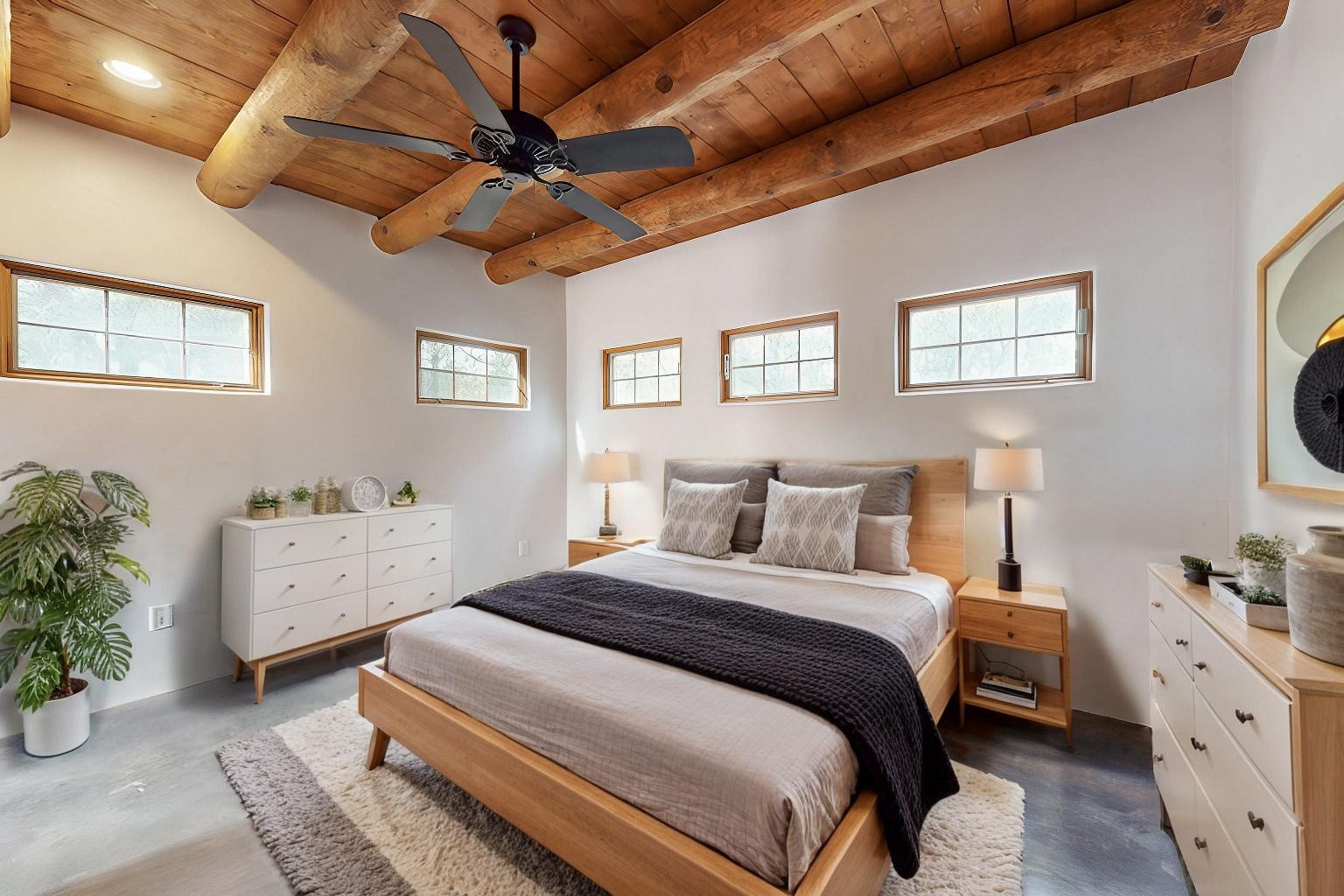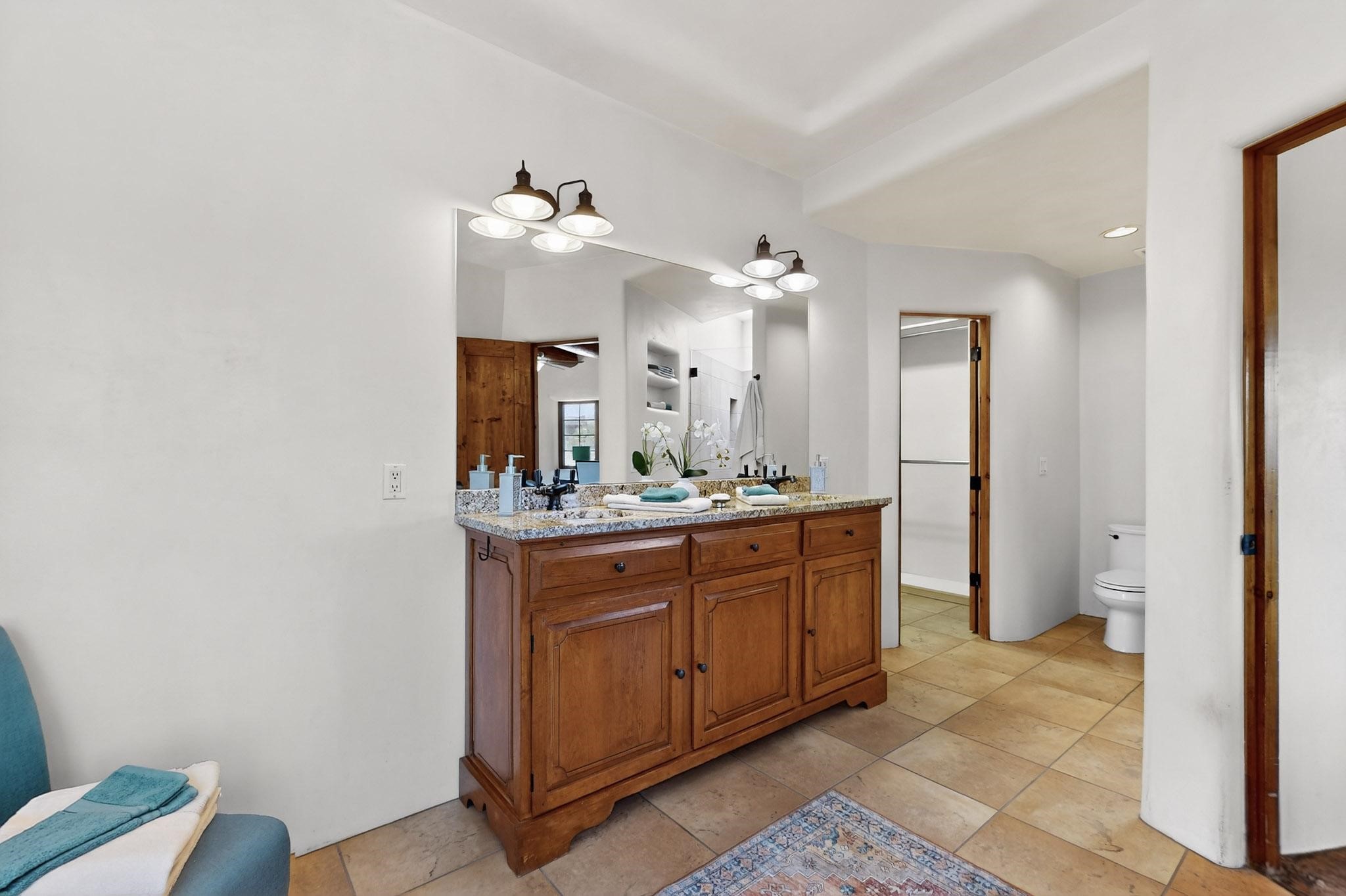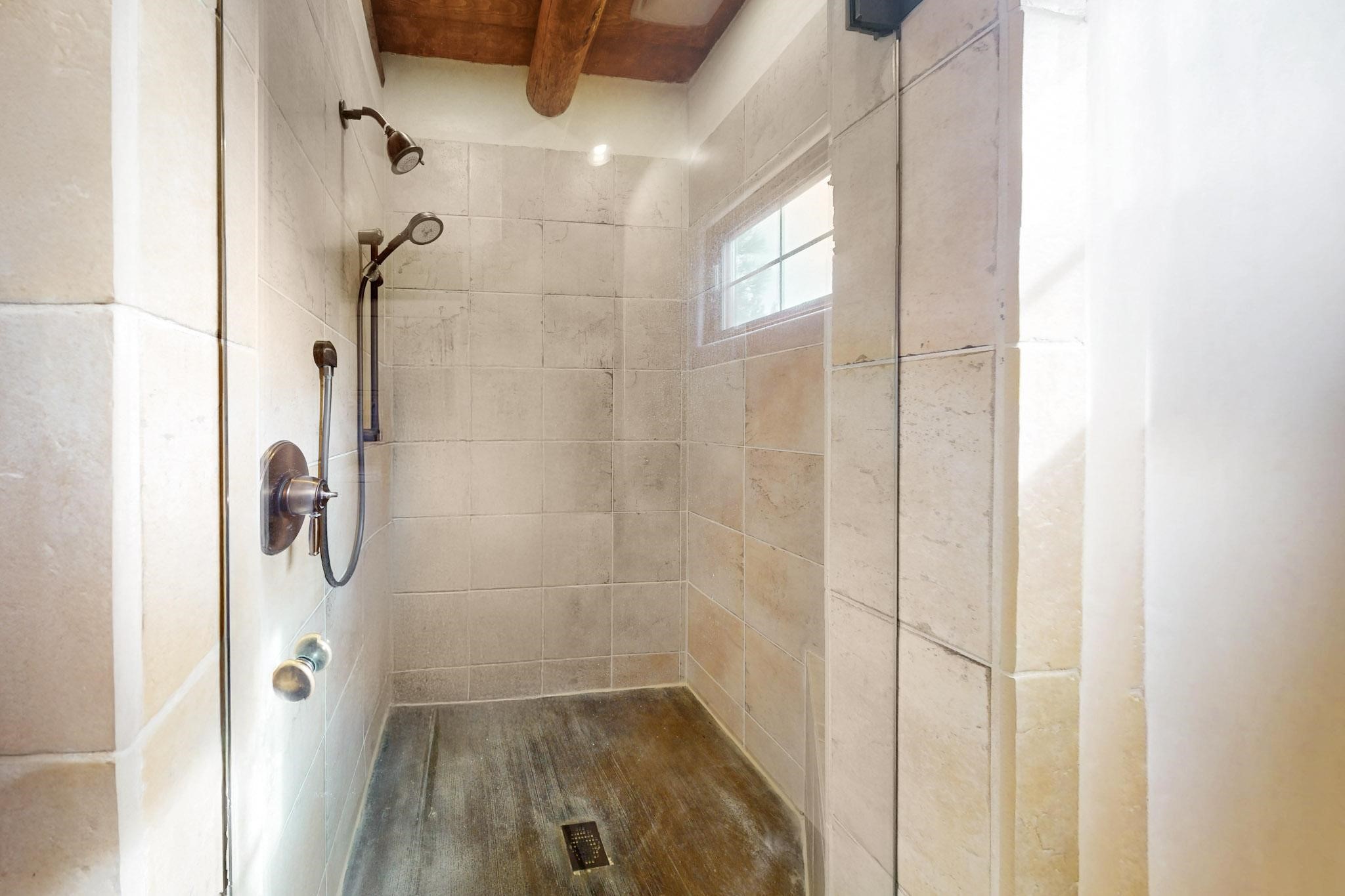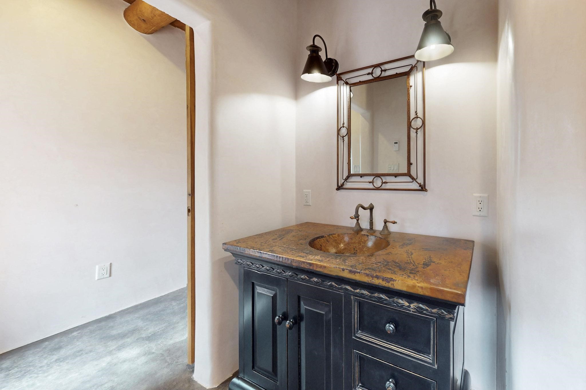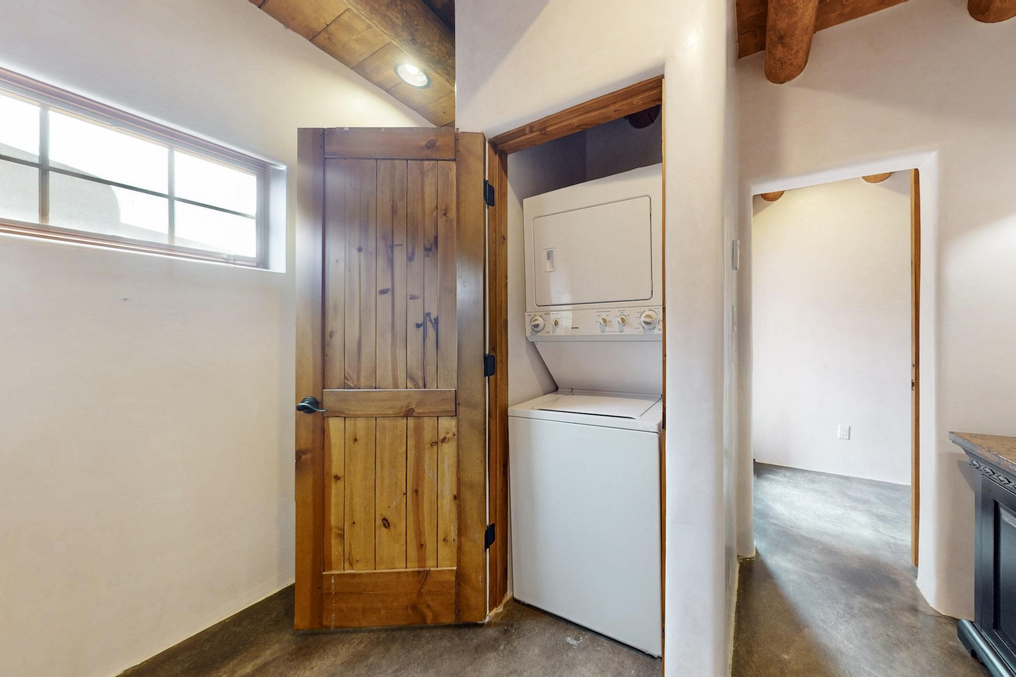 This Pueblo Revival style home features three bedrooms in the main house along with a detached, one-bedroom studio/casita. Situated in the beautiful La Tierra area, this adobe home is set on over two acres of land and is conveniently located just 15 minutes from downtown. The main home, spanning just over 2,000 sq ft, offers a private retreat with an open concept layout, high ceilings, vigas, wood decked ceilings, plastered walls, and two kiva fireplaces. You'll find panoramic views of the Sangre de Cristo Mountains from the large portal off the dining area, which creates a perfect setting for entertaining. The kitchen is well-appointed with a Wolf range, stainless steel appliances, colorful tile, Alder cabinets, and plenty of storage. The property also includes a heated garage for your convenience. The one-bedroom casita features similar finishes and a kiva fireplace, offering flexible options for use.