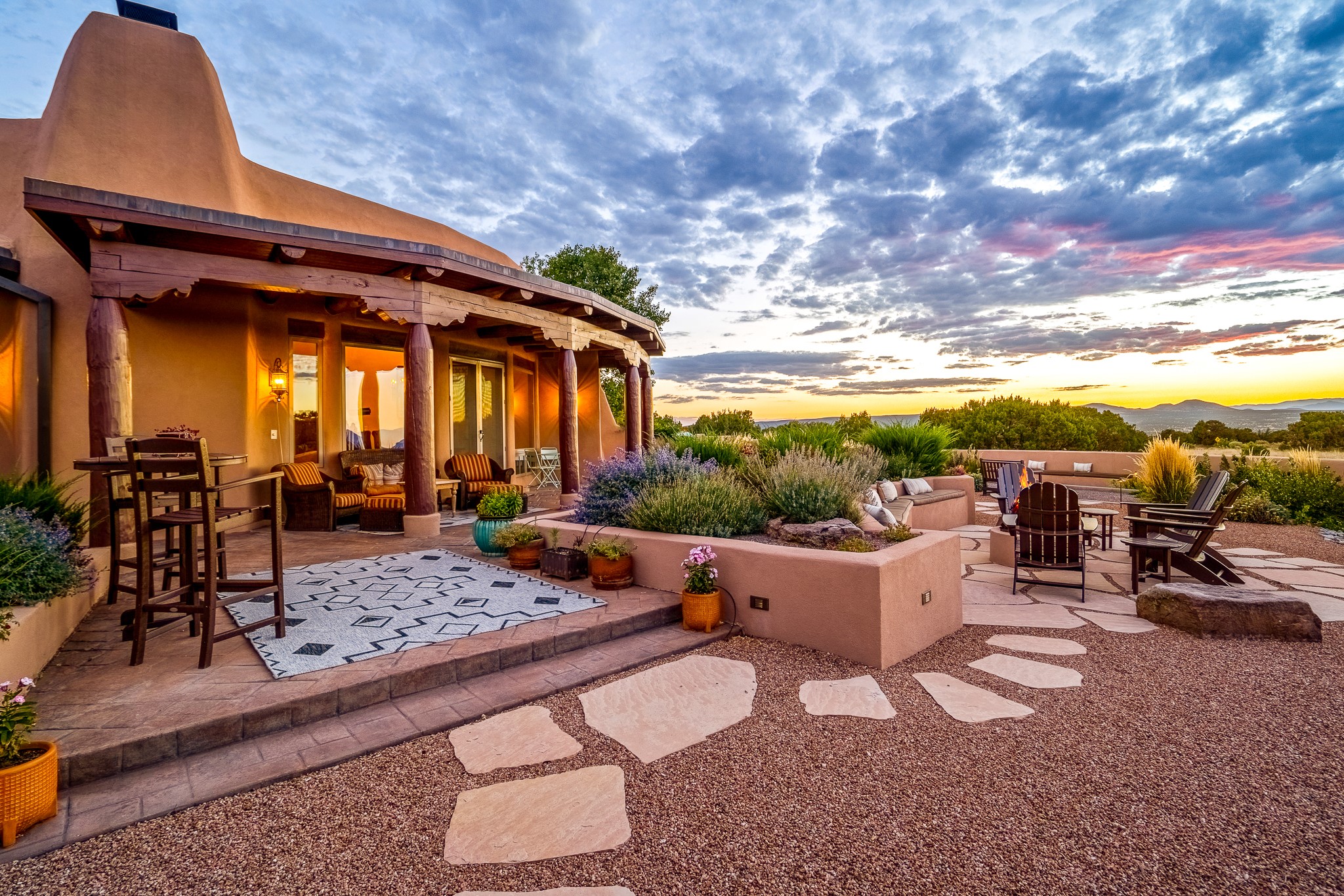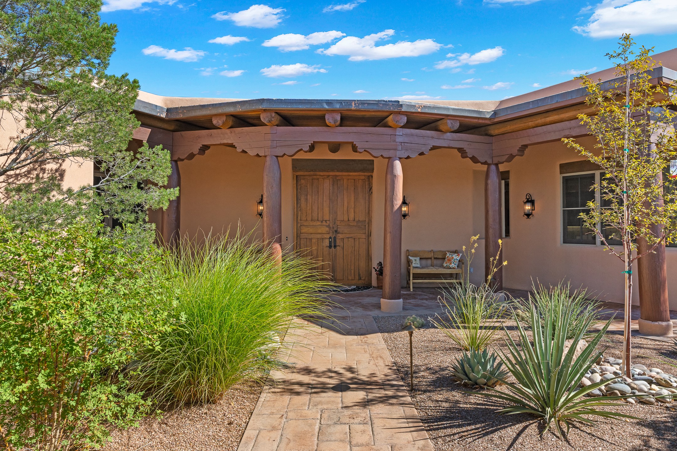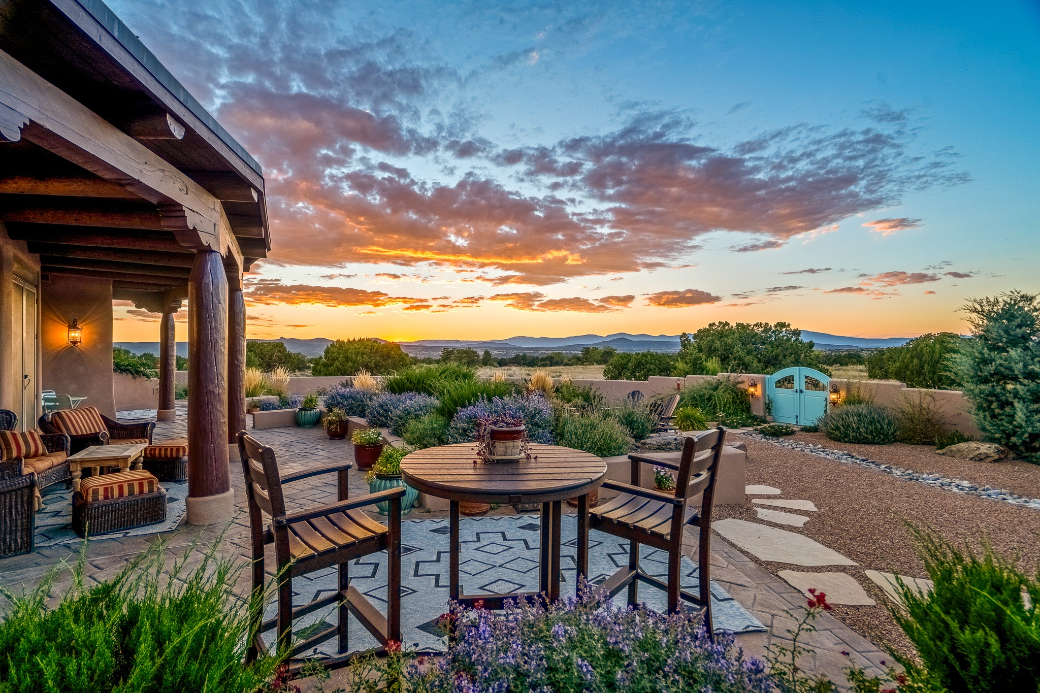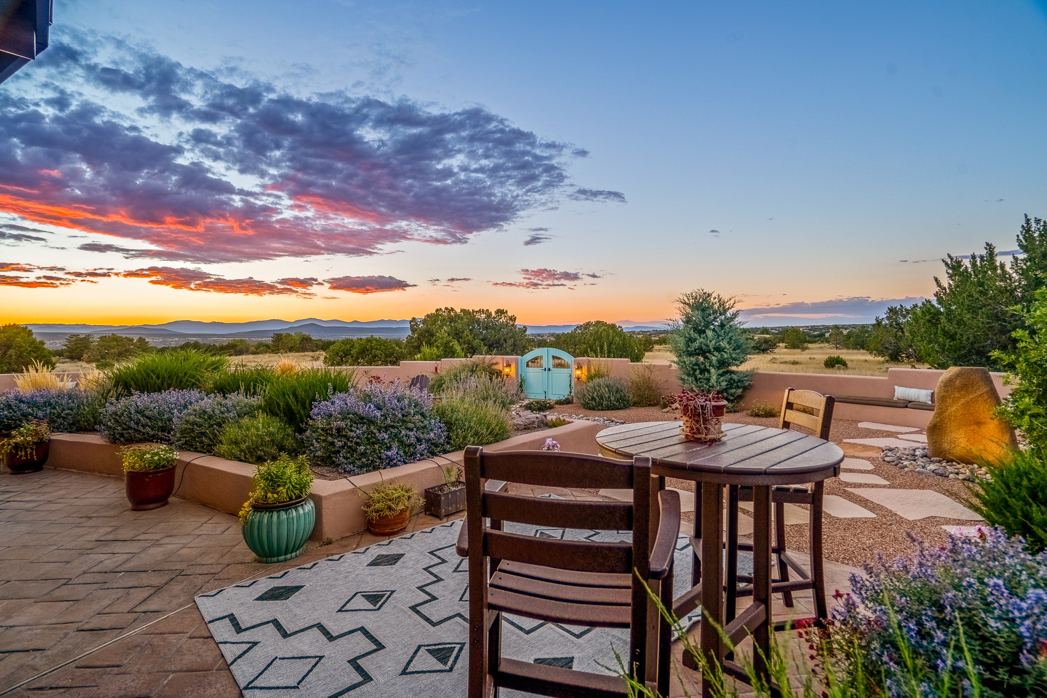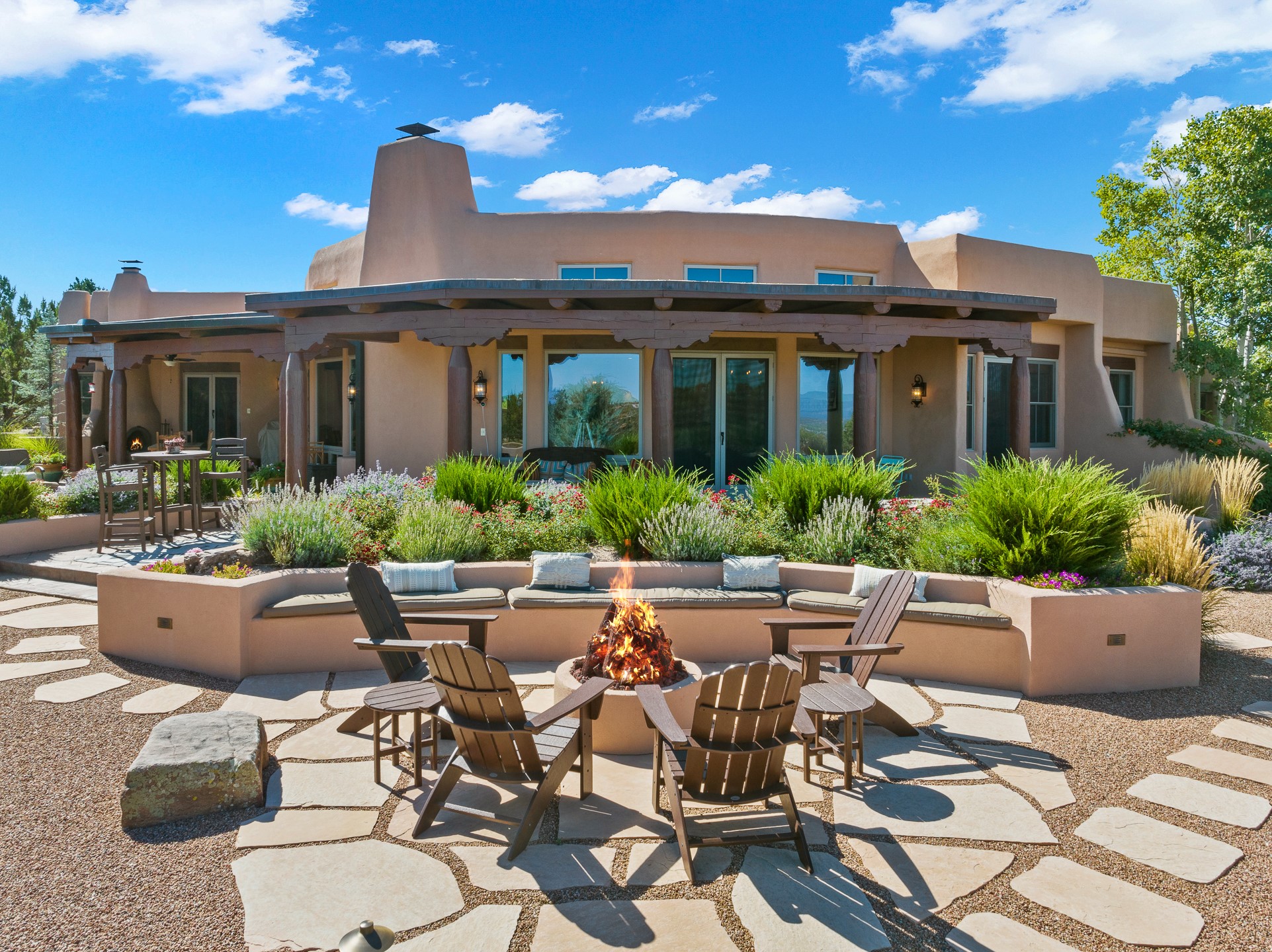 Step into luxury with this exceptional 3-bedroom, 3.5-bath home, offering an additional flex (office/media/workout) space and breathtaking sunset views from its magical back portal and yard brought to life by renowned designer Solange Serquis. Designed with both style and function in mind, this home is ideal for those who love to entertain and appreciate outdoor living. The grand entrance sets the tone for the home's sophisticated aesthetic, leading to an expansive living and dining area. The gourmet kitchen, complete with a breakfast nook, bar seating, and top-tier appliances, is a dream for any chef or host. Custom cabinetry, gleaming granite countertops, and an open layout make it the perfect space for entertaining guests while preparing meals. The outdoor spaces are as impressive as the interior, featuring a beautifully landscaped front courtyard, complete with serene water features. The rear portal offers a beautiful outdoor dining set up with a kiva fireplace. From the portal, there is direct access to a stunning landscape including gorgeous perennials, water features, a steel-log gas fire pit, a bocce ball court and private hot tub, ensuring relaxation with gorgeous views. The home's three-car garage is perfect for housing vehicles, bicycles, and providing extra workspace. The luxurious primary suite is a retreat of its own, with a cozy kiva fireplace, redesigned walk-in closet, and spa-inspired bathroom with a second kiva fireplace, creating the ultimate ambiance. Both the bedroom and the flex room offer exterior access, allowing for seamless indoor-outdoor living. The guest wing is designed for privacy and comfort, featuring two spacious ensuite bedrooms with beautiful views, making it an ideal sanctuary for visitors. Additional amenities include in-floor radiant heating, mini-splits for cooling, and great views from nearly every corner of the property. Perfect for family gatherings or elegant soires, this exquisite home is a true masterpiece of comfort, design, and luxury. A Social Membership at the Club at Las Campanas is available for separate purchase. (May be upgraded to Golf Membership). Schedule your private tour today and experience this one-of-a-kind home for yourself.