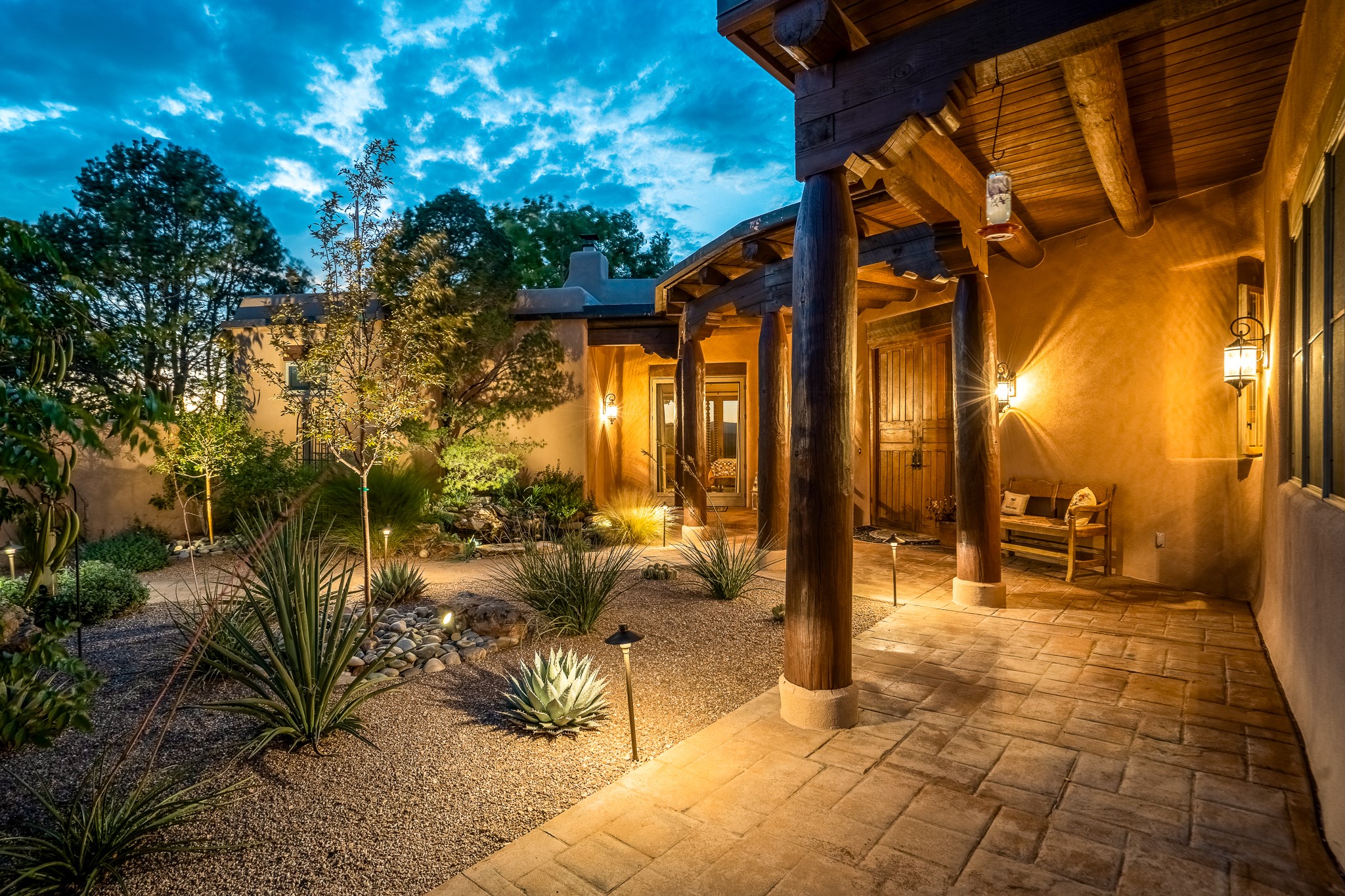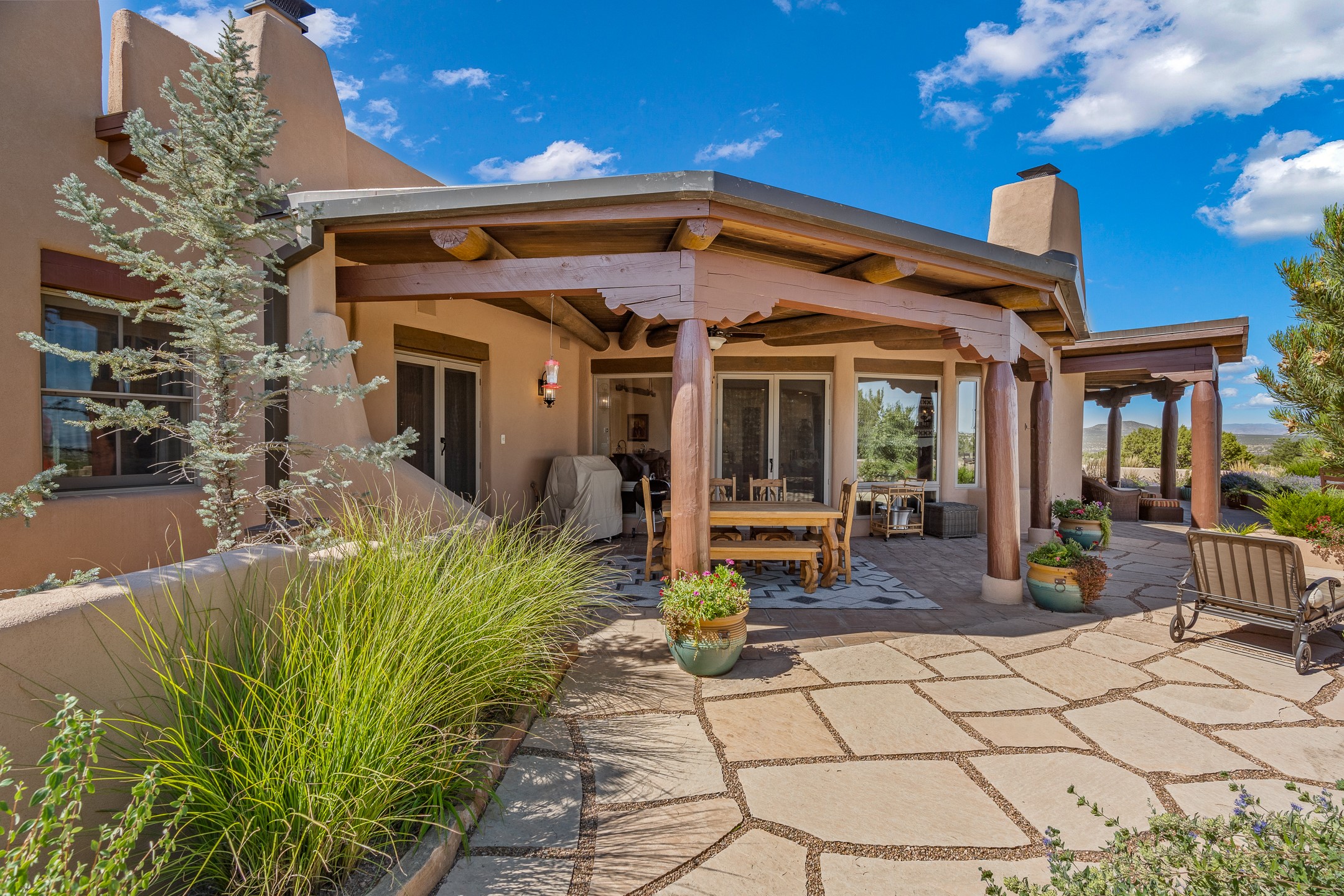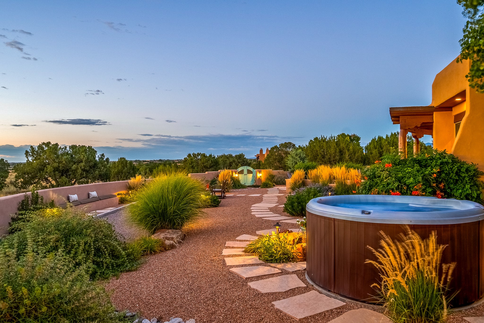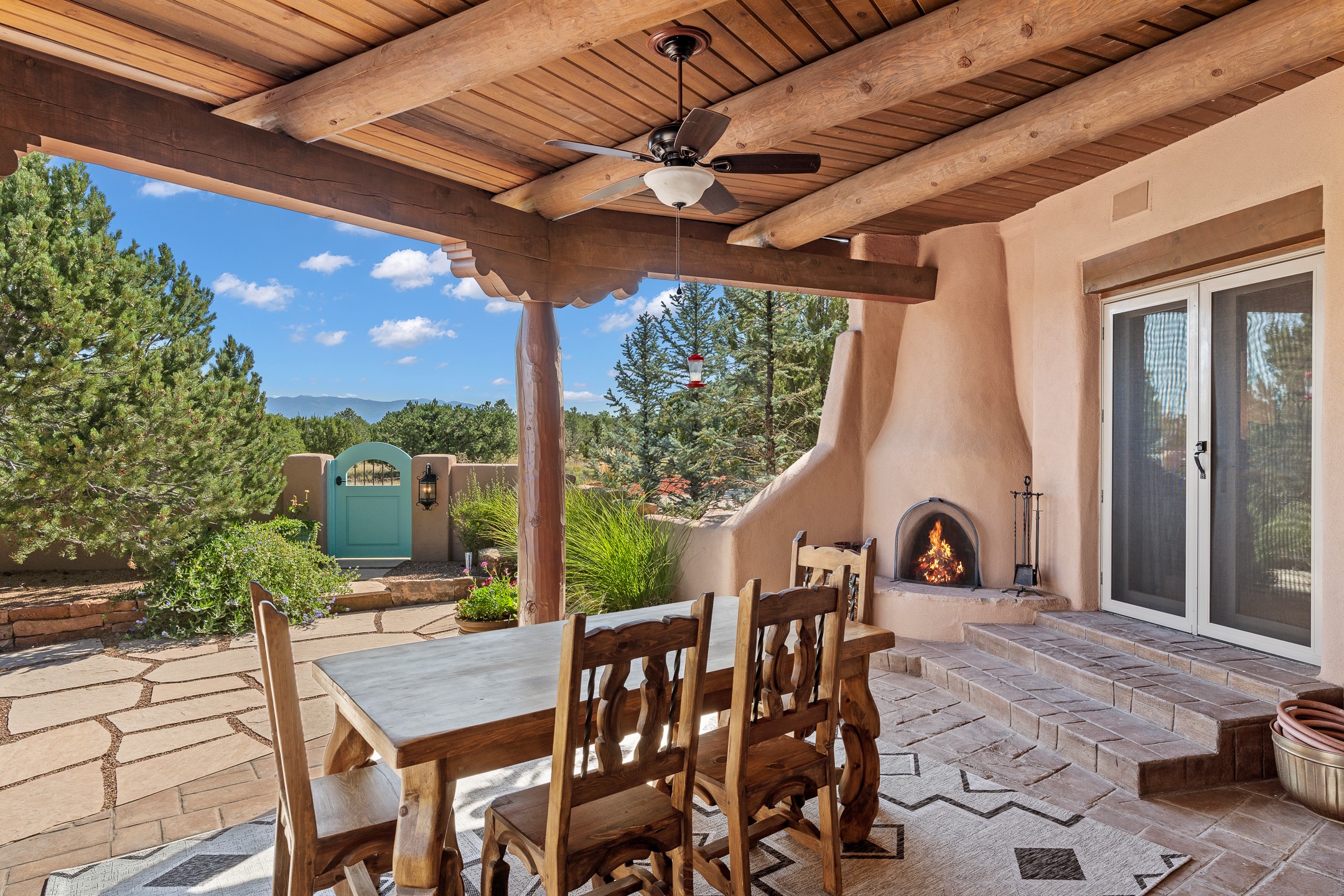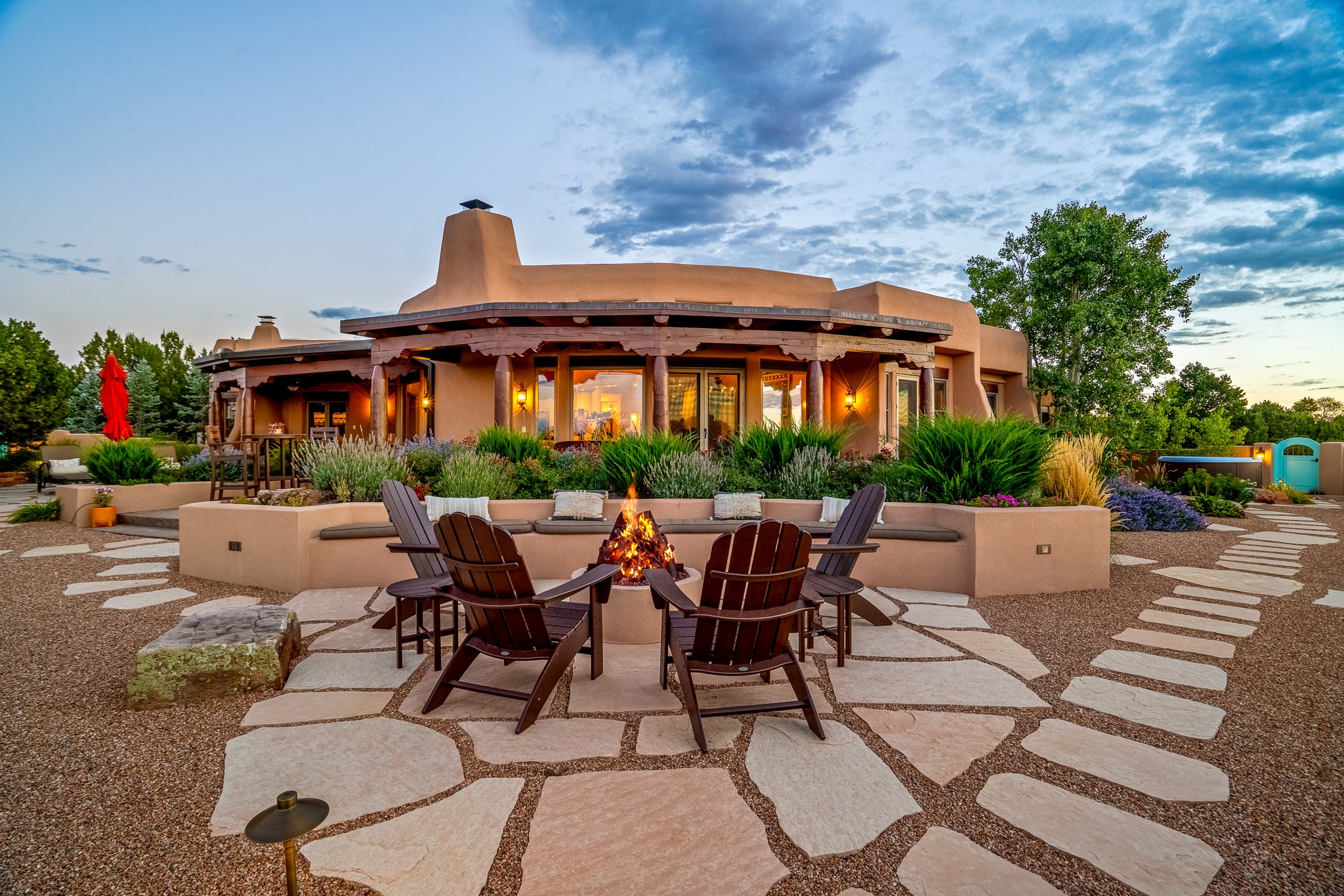 Step into luxury with this exceptional 3-bedroom, 3.5-bath home, offering an additional flex (office/media/workout) space and breathtaking sunset views from its magical back portal and yard brought to life by renowned designer Solange Serquis. Designed with both style and function in mind, this home is ideal for those who love to entertain and appreciate outdoor living. The grand entrance sets the tone for the home's sophisticated aesthetic, leading to an expansive living and dining area. The gourmet kitchen, complete with a breakfast nook, bar seating, and top-tier appliances, is a dream for any chef or host. Custom cabinetry, gleaming granite countertops, and an open layout make it the perfect space for entertaining guests while preparing meals. The outdoor spaces are as impressive as the interior, featuring a beautifully landscaped front courtyard, complete with serene water features. The rear portal offers a beautiful outdoor dining set up with a kiva fireplace. From the portal, there is direct access to a stunning landscape including gorgeous perennials, water features, a steel-log gas fire pit, a bocce ball court and private hot tub, ensuring relaxation with gorgeous views. The home's three-car garage is perfect for housing vehicles, bicycles, and providing extra workspace. The luxurious primary suite is a retreat of its own, with a cozy kiva fireplace, redesigned walk-in closet, and spa-inspired bathroom with a second kiva fireplace, creating the ultimate ambiance. Both the bedroom and the flex room offer exterior access, allowing for seamless indoor-outdoor living. The guest wing is designed for privacy and comfort, featuring two spacious ensuite bedrooms with beautiful views, making it an ideal sanctuary for visitors. Additional amenities include in-floor radiant heating, mini-splits for cooling, and great views from nearly every corner of the property. Perfect for family gatherings or elegant soires, this exquisite home is a true masterpiece of comfort, design, and luxury. A Social Membership at the Club at Las Campanas is available for separate purchase. (May be upgraded to Golf Membership). Schedule your private tour today and experience this one-of-a-kind home for yourself.