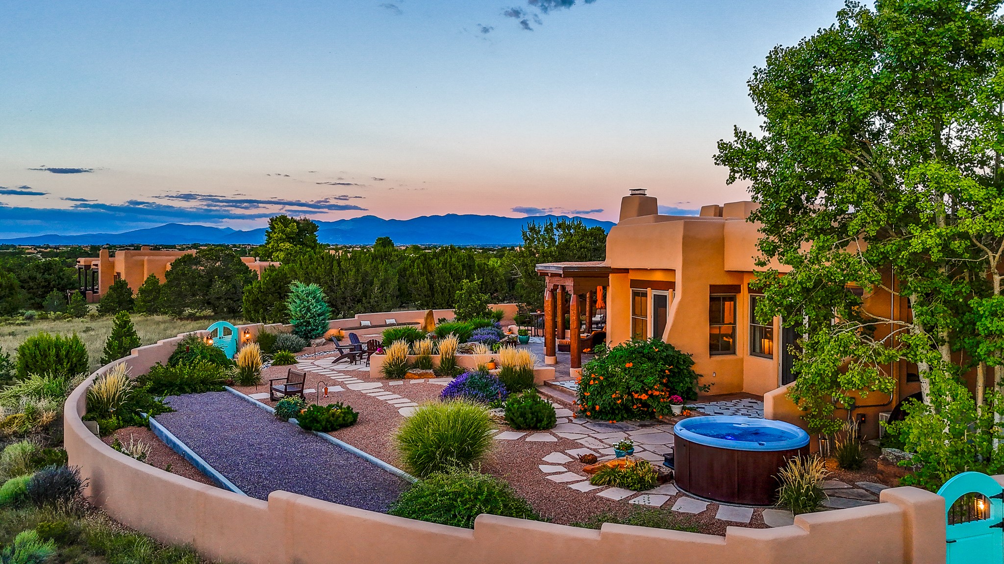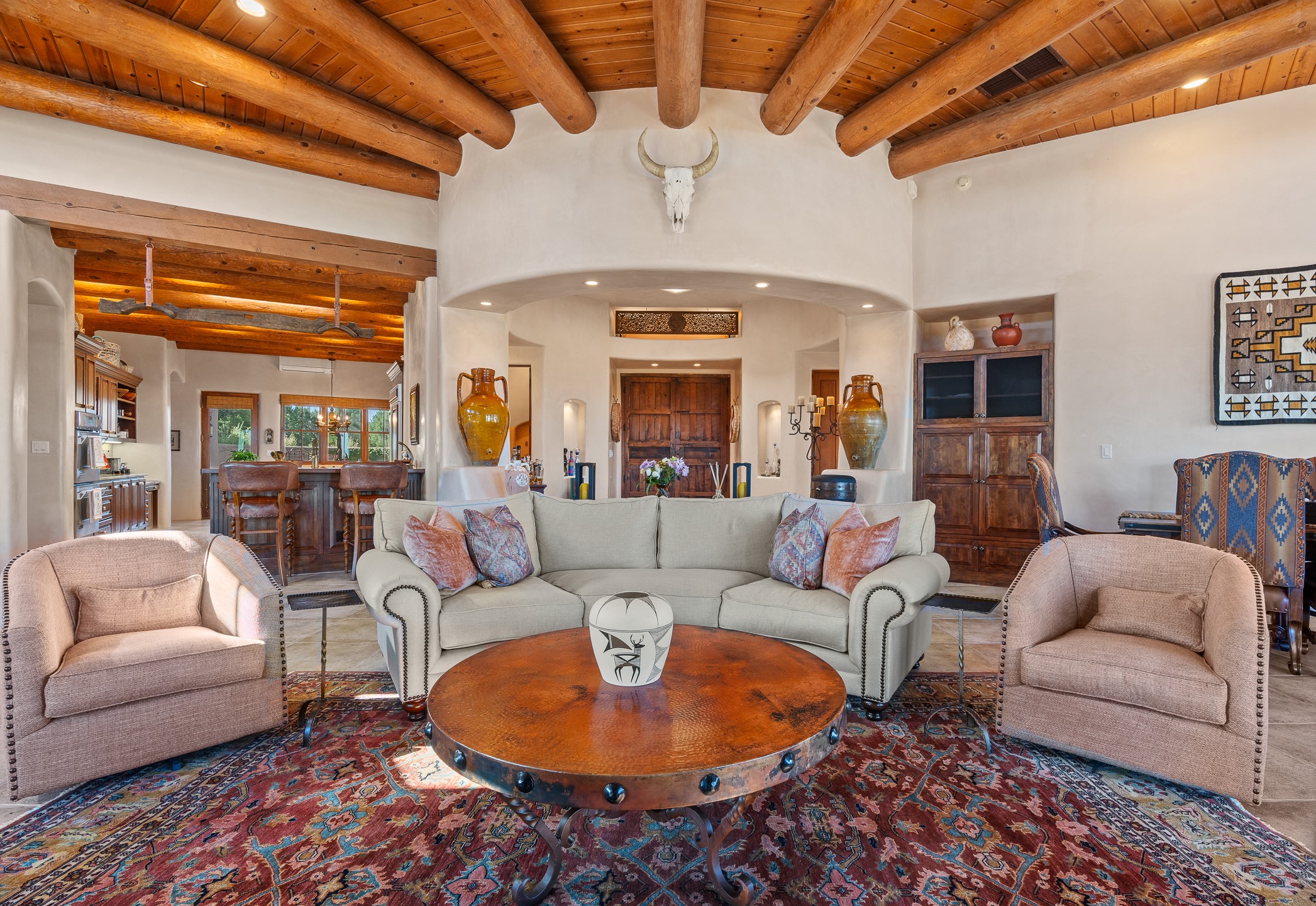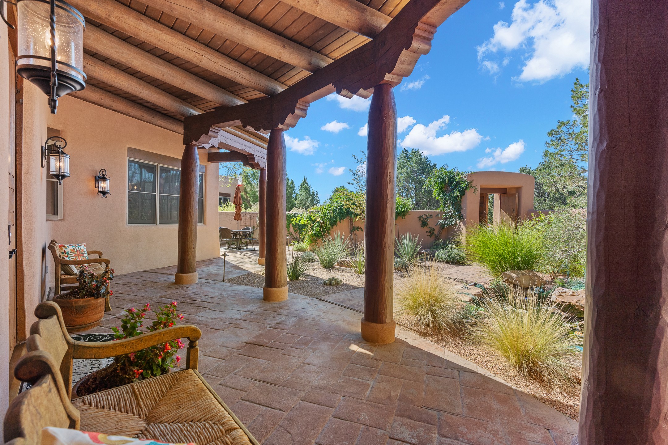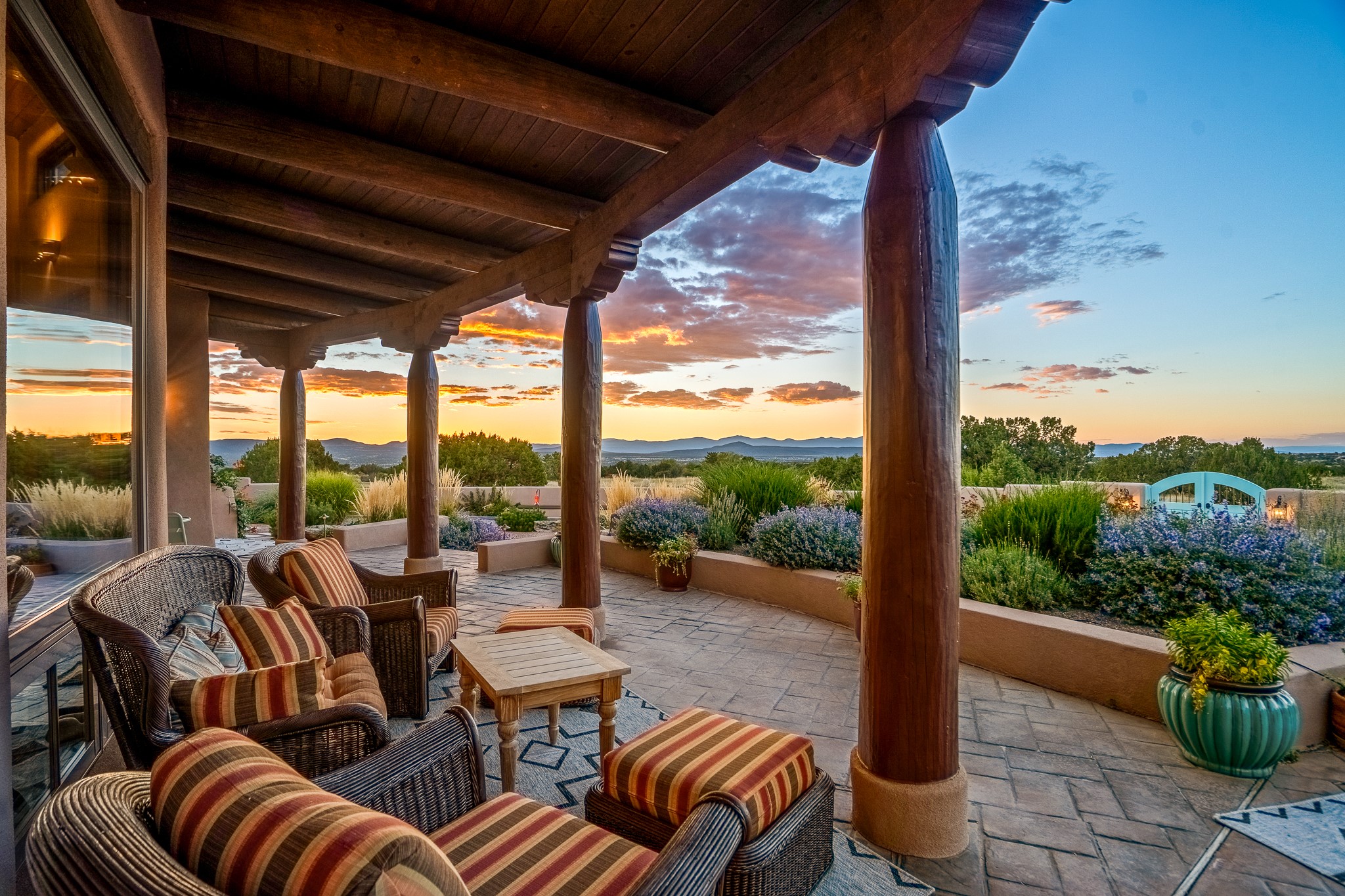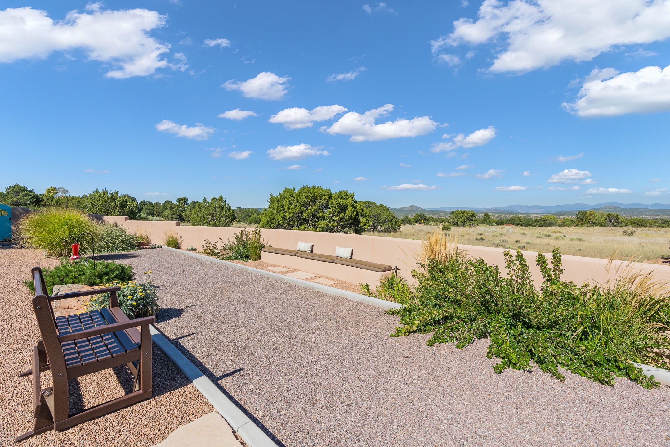 Step into luxury with this exceptional 3-bedroom, 3.5-bath home, offering an additional flex (office/media/workout) space and breathtaking sunset views from its magical back portal and yard brought to life by renowned designer Solange Serquis. Designed with both style and function in mind, this home is ideal for those who love to entertain and appreciate outdoor living. The grand entrance sets the tone for the home's sophisticated aesthetic, leading to an expansive living and dining area. The gourmet kitchen, complete with a breakfast nook, bar seating, and top-tier appliances, is a dream for any chef or host. Custom cabinetry, gleaming granite countertops, and an open layout make it the perfect space for entertaining guests while preparing meals. The outdoor spaces are as impressive as the interior, featuring a beautifully landscaped front courtyard, complete with serene water features. The rear portal offers a beautiful outdoor dining set up with a kiva fireplace. From the portal, there is direct access to a stunning landscape including gorgeous perennials, water features, a steel-log gas fire pit, a bocce ball court and private hot tub, ensuring relaxation with gorgeous views. The home's three-car garage is perfect for housing vehicles, bicycles, and providing extra workspace. The luxurious primary suite is a retreat of its own, with a cozy kiva fireplace, redesigned walk-in closet, and spa-inspired bathroom with a second kiva fireplace, creating the ultimate ambiance. Both the bedroom and the flex room offer exterior access, allowing for seamless indoor-outdoor living. The guest wing is designed for privacy and comfort, featuring two spacious ensuite bedrooms with beautiful views, making it an ideal sanctuary for visitors. Additional amenities include in-floor radiant heating, mini-splits for cooling, and great views from nearly every corner of the property. Perfect for family gatherings or elegant soires, this exquisite home is a true masterpiece of comfort, design, and luxury. A Social Membership at the Club at Las Campanas is available for separate purchase. (May be upgraded to Golf Membership). Schedule your private tour today and experience this one-of-a-kind home for yourself.
