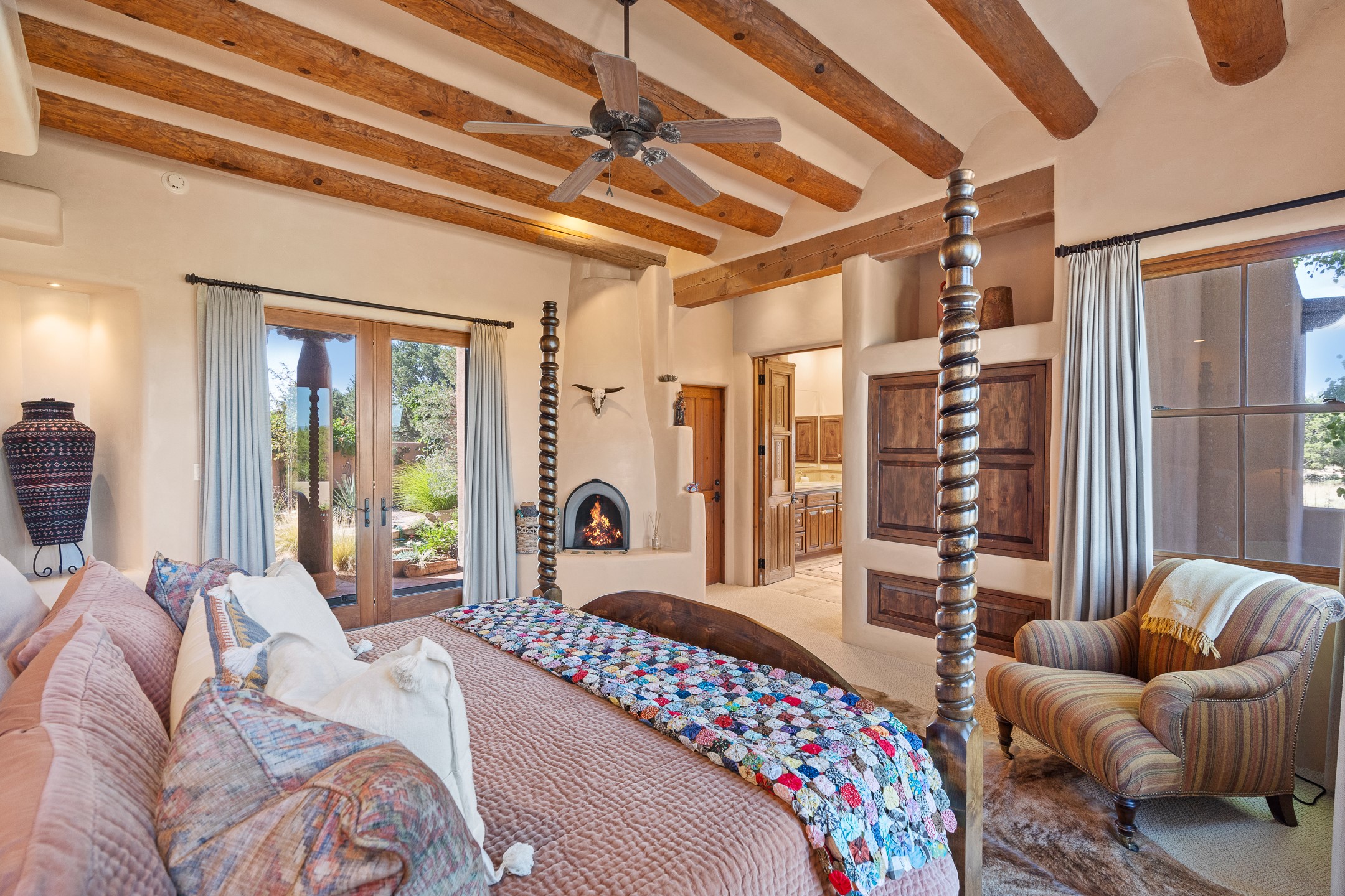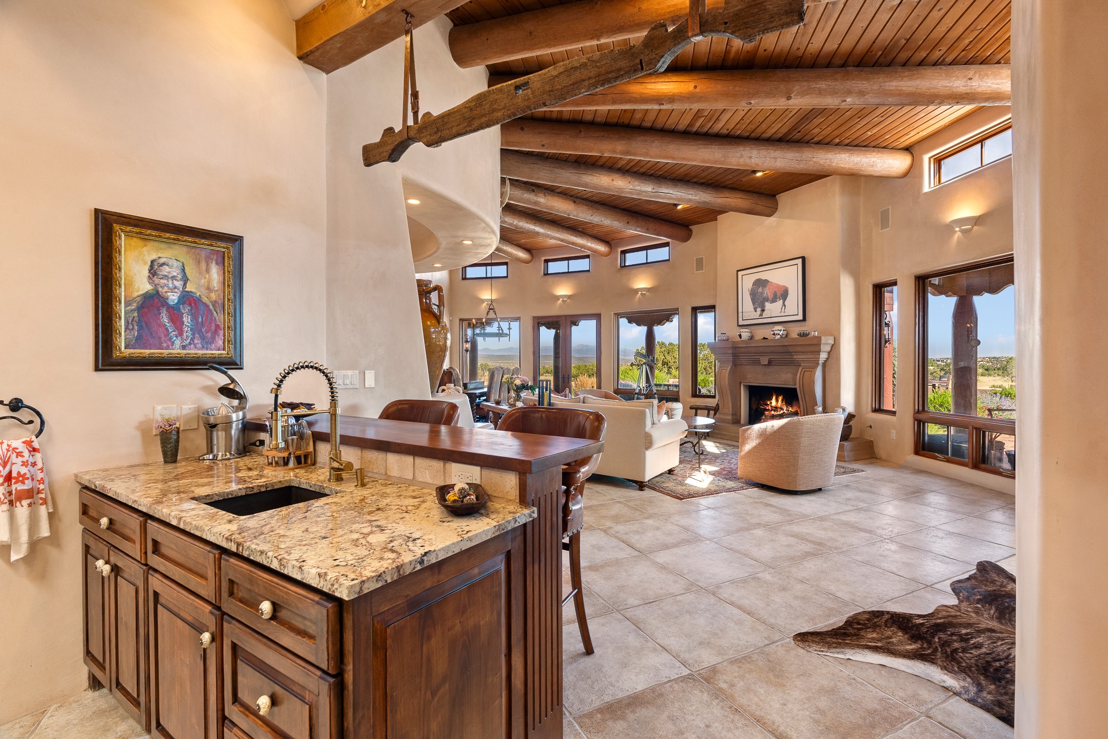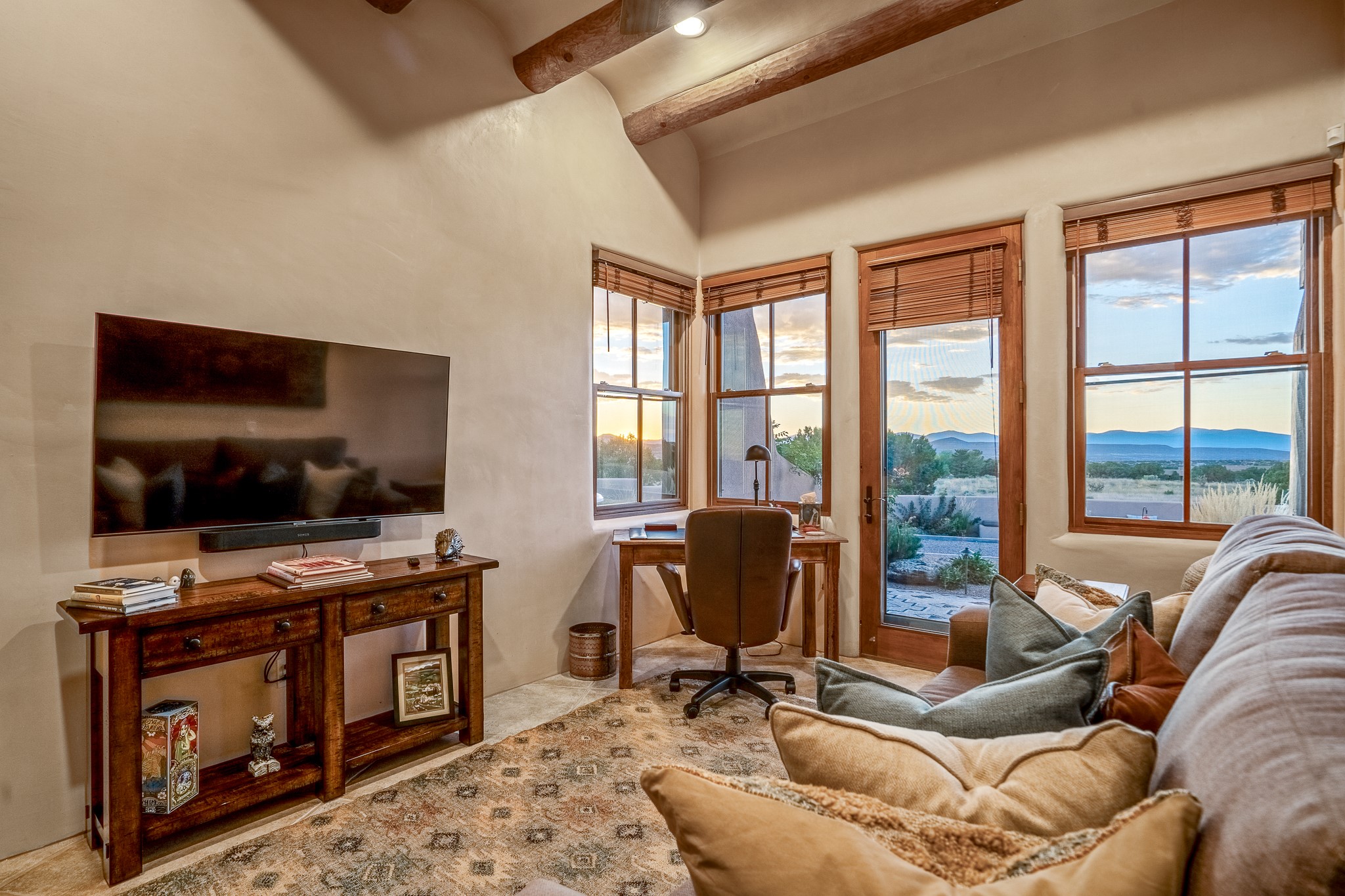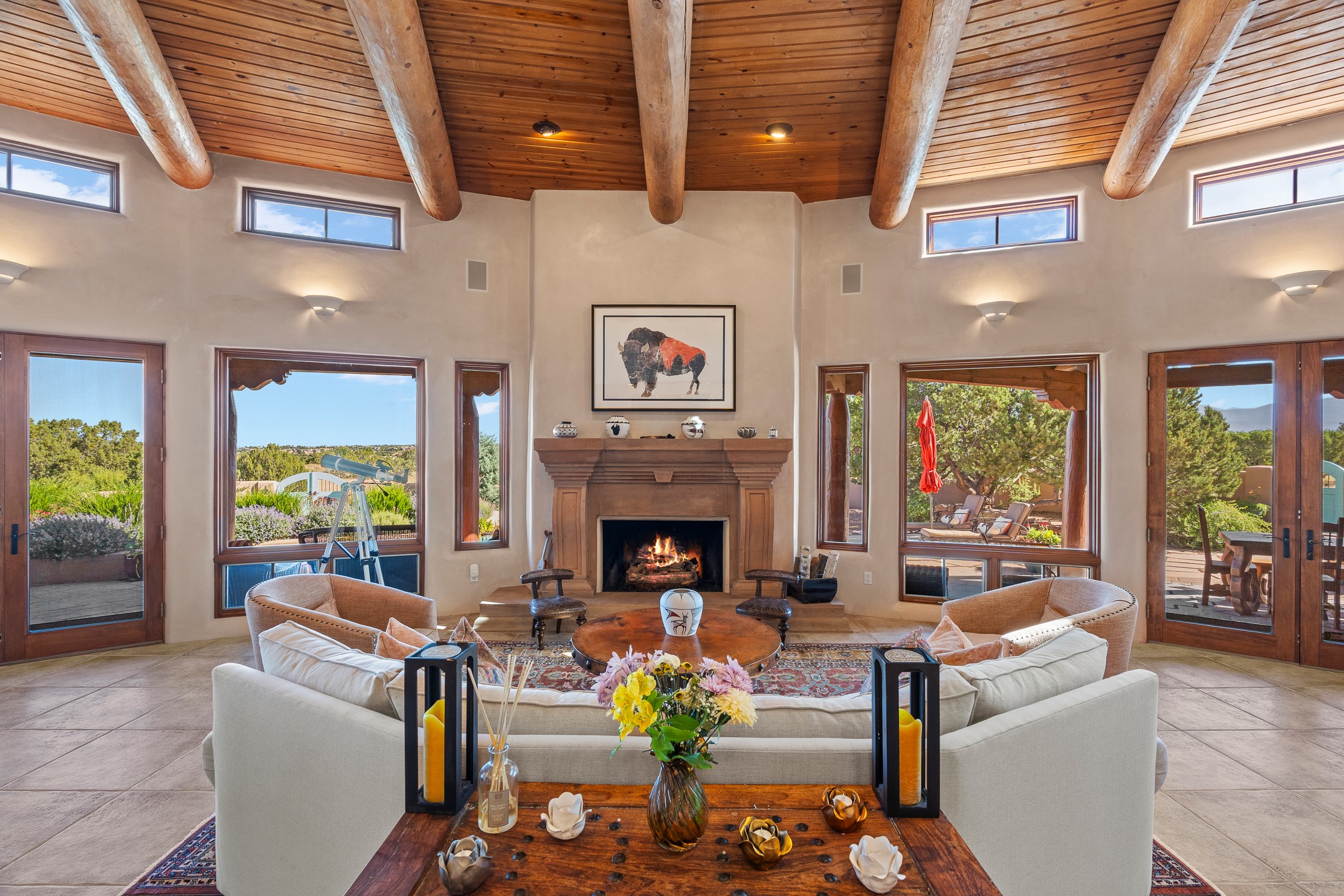 Step into luxury with this exceptional 3-bedroom, 3.5-bath home, offering an additional flex (office/media/workout) space and breathtaking sunset views from its magical back portal and yard brought to life by renowned designer Solange Serquis. Designed with both style and function in mind, this home is ideal for those who love to entertain and appreciate outdoor living. The grand entrance sets the tone for the home's sophisticated aesthetic, leading to an expansive living and dining area. The gourmet kitchen, complete with a breakfast nook, bar seating, and top-tier appliances, is a dream for any chef or host. Custom cabinetry, gleaming granite countertops, and an open layout make it the perfect space for entertaining guests while preparing meals. The outdoor spaces are as impressive as the interior, featuring a beautifully landscaped front courtyard, complete with serene water features. The rear portal offers a beautiful outdoor dining set up with a kiva fireplace. From the portal, there is direct access to a stunning landscape including gorgeous perennials, water features, a steel-log gas fire pit, a bocce ball court and private hot tub, ensuring relaxation with gorgeous views. The home's three-car garage is perfect for housing vehicles, bicycles, and providing extra workspace. The luxurious primary suite is a retreat of its own, with a cozy kiva fireplace, redesigned walk-in closet, and spa-inspired bathroom with a second kiva fireplace, creating the ultimate ambiance. Both the bedroom and the flex room offer exterior access, allowing for seamless indoor-outdoor living. The guest wing is designed for privacy and comfort, featuring two spacious ensuite bedrooms with beautiful views, making it an ideal sanctuary for visitors. Additional amenities include in-floor radiant heating, mini-splits for cooling, and great views from nearly every corner of the property. Perfect for family gatherings or elegant soires, this exquisite home is a true masterpiece of comfort, design, and luxury. A Social Membership at the Club at Las Campanas is available for separate purchase. (May be upgraded to Golf Membership). Schedule your private tour today and experience this one-of-a-kind home for yourself.