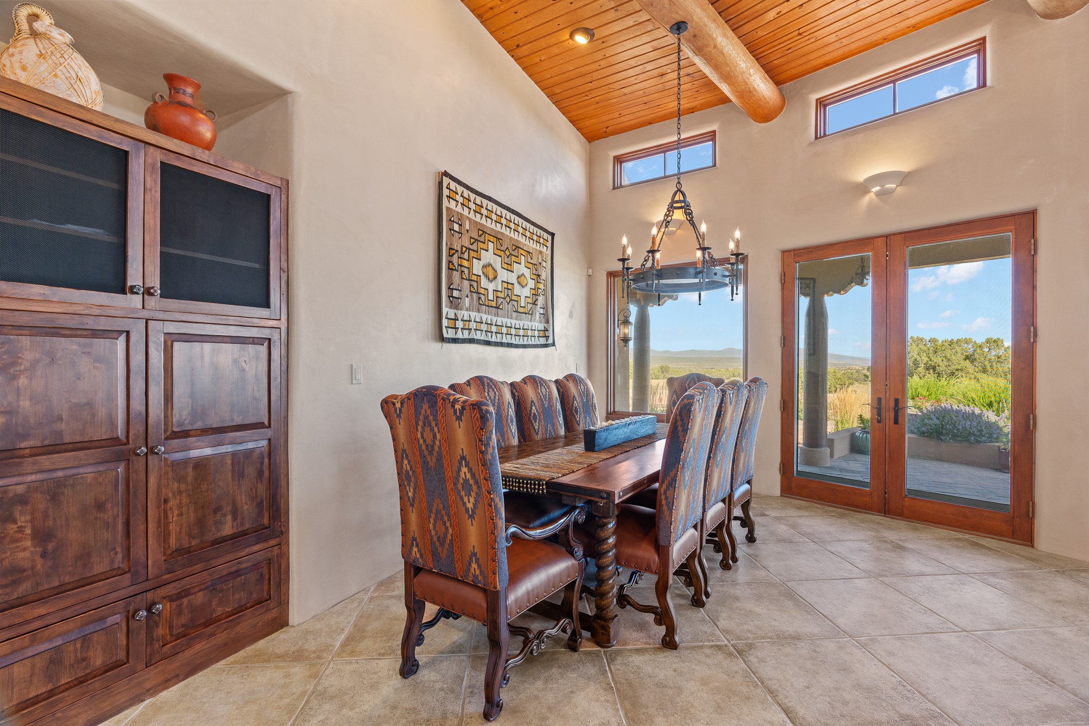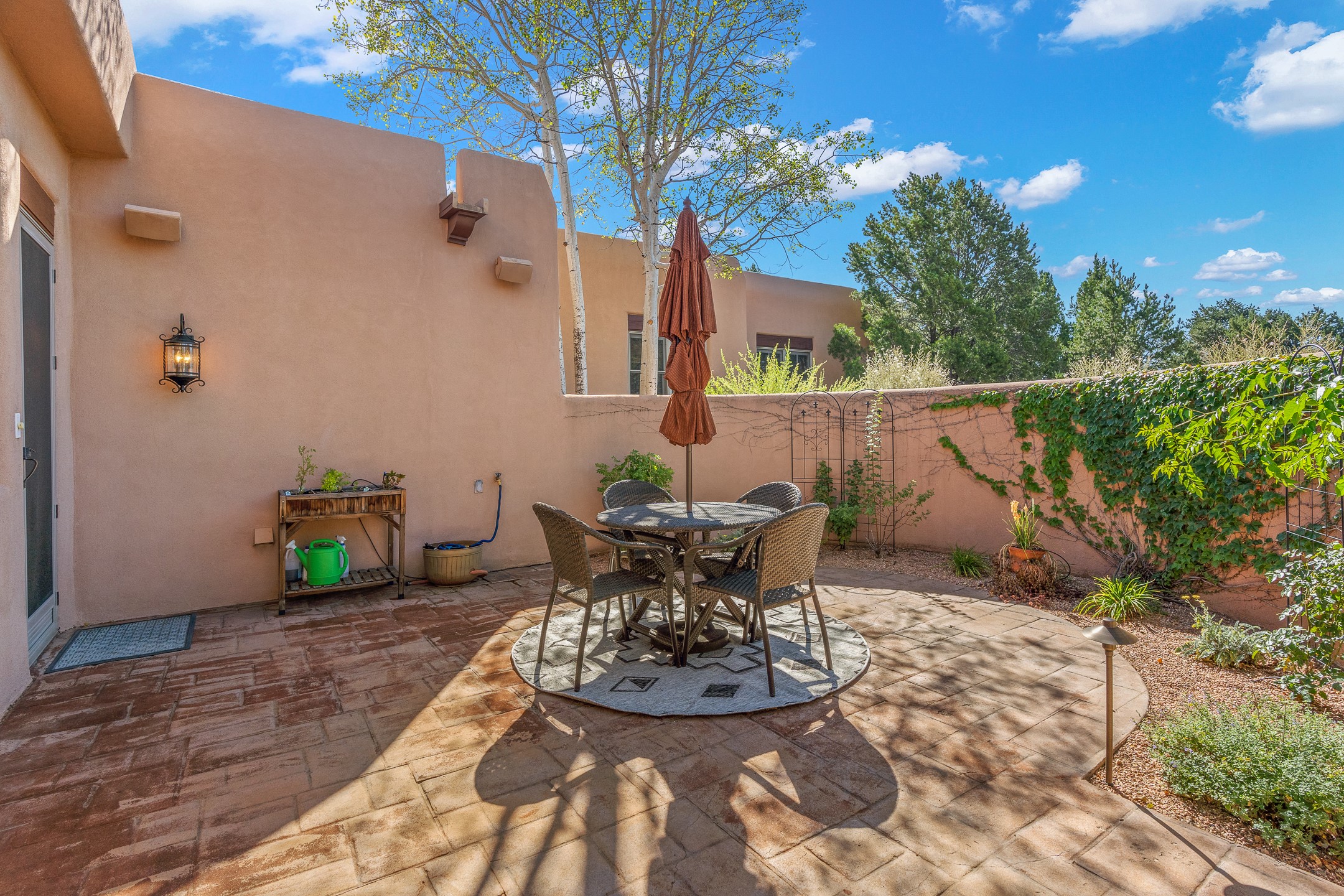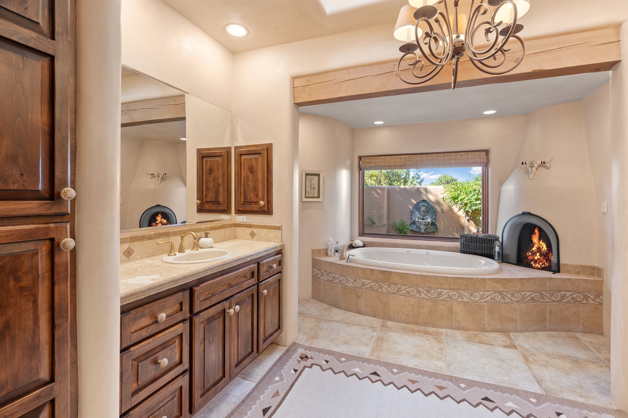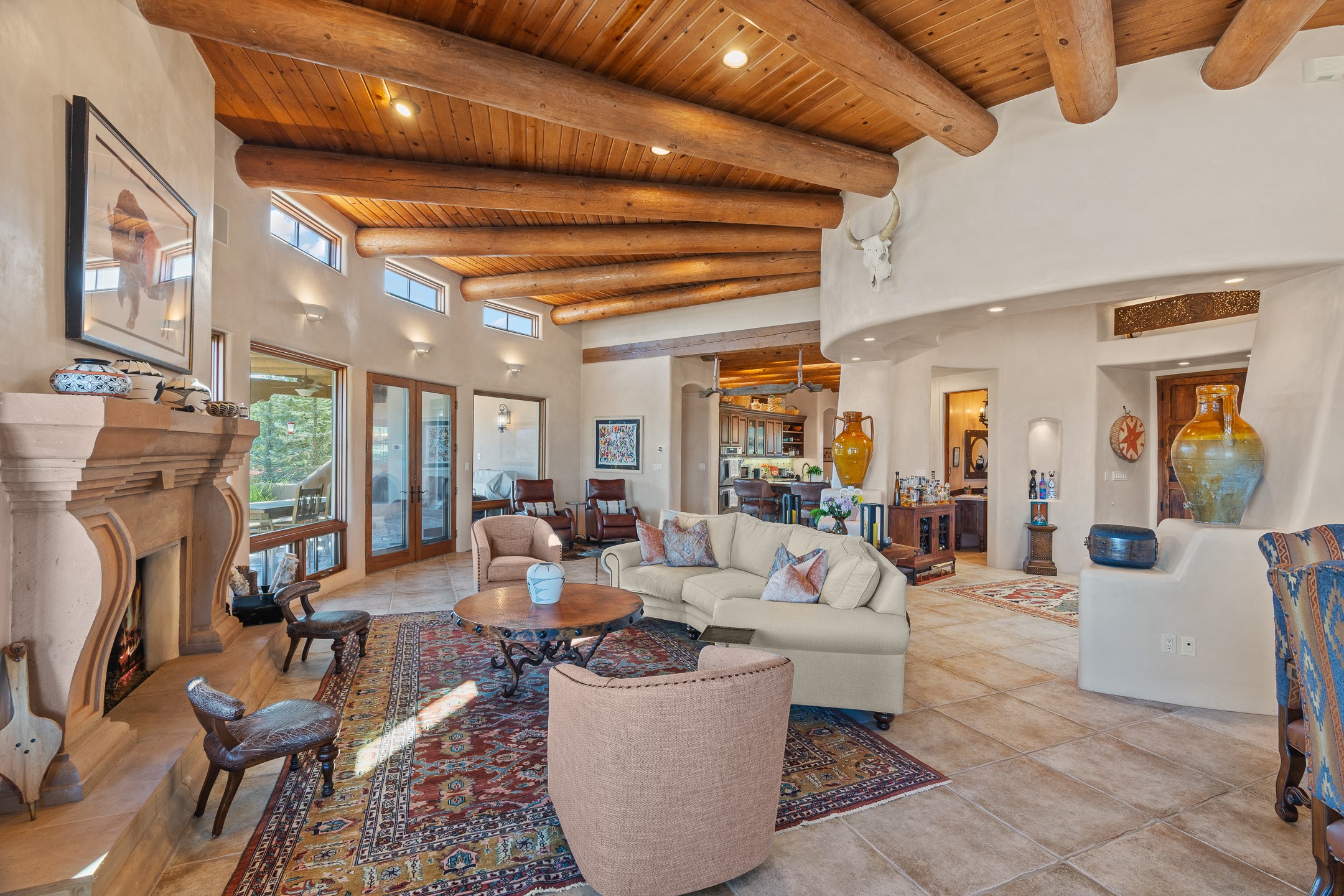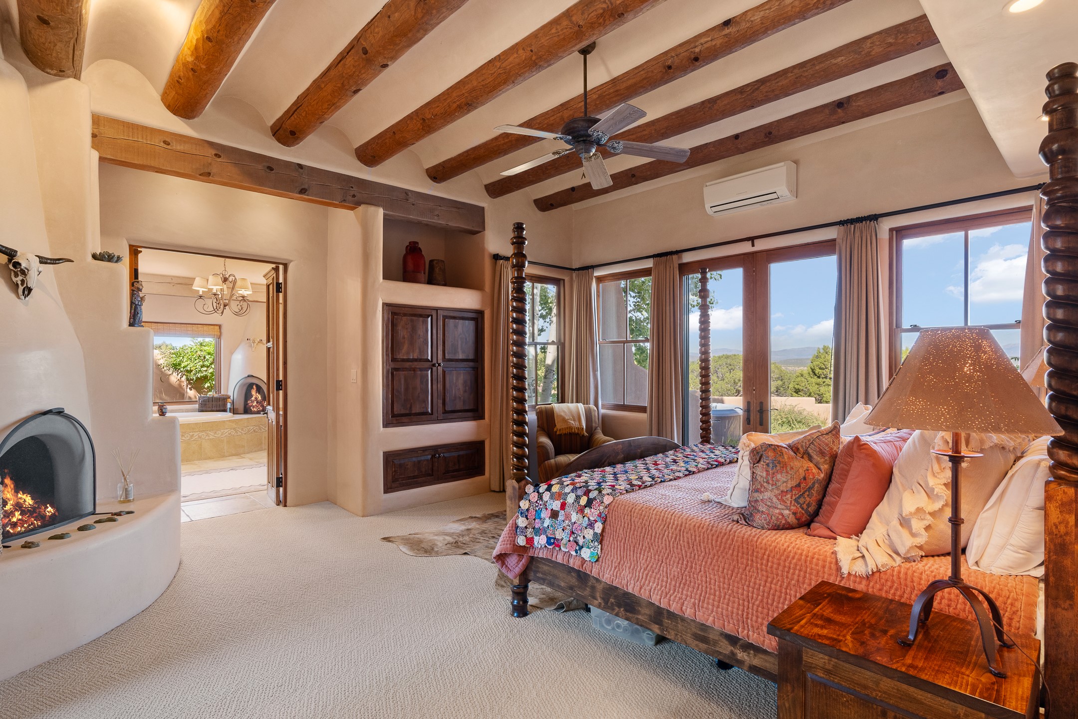 Step into luxury with this exceptional 3-bedroom, 3.5-bath home, offering an additional flex (office/media/workout) space and breathtaking sunset views from its magical back portal and yard brought to life by renowned designer Solange Serquis. Designed with both style and function in mind, this home is ideal for those who love to entertain and appreciate outdoor living. The grand entrance sets the tone for the home's sophisticated aesthetic, leading to an expansive living and dining area. The gourmet kitchen, complete with a breakfast nook, bar seating, and top-tier appliances, is a dream for any chef or host. Custom cabinetry, gleaming granite countertops, and an open layout make it the perfect space for entertaining guests while preparing meals. The outdoor spaces are as impressive as the interior, featuring a beautifully landscaped front courtyard, complete with serene water features. The rear portal offers a beautiful outdoor dining set up with a kiva fireplace. From the portal, there is direct access to a stunning landscape including gorgeous perennials, water features, a steel-log gas fire pit, a bocce ball court and private hot tub, ensuring relaxation with gorgeous views. The home's three-car garage is perfect for housing vehicles, bicycles, and providing extra workspace. The luxurious primary suite is a retreat of its own, with a cozy kiva fireplace, redesigned walk-in closet, and spa-inspired bathroom with a second kiva fireplace, creating the ultimate ambiance. Both the bedroom and the flex room offer exterior access, allowing for seamless indoor-outdoor living. The guest wing is designed for privacy and comfort, featuring two spacious ensuite bedrooms with beautiful views, making it an ideal sanctuary for visitors. Additional amenities include in-floor radiant heating, mini-splits for cooling, and great views from nearly every corner of the property. Perfect for family gatherings or elegant soires, this exquisite home is a true masterpiece of comfort, design, and luxury. A Social Membership at the Club at Las Campanas is available for separate purchase. (May be upgraded to Golf Membership). Schedule your private tour today and experience this one-of-a-kind home for yourself.