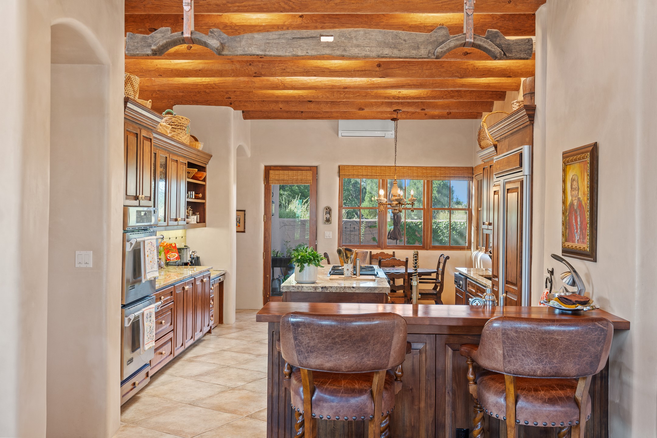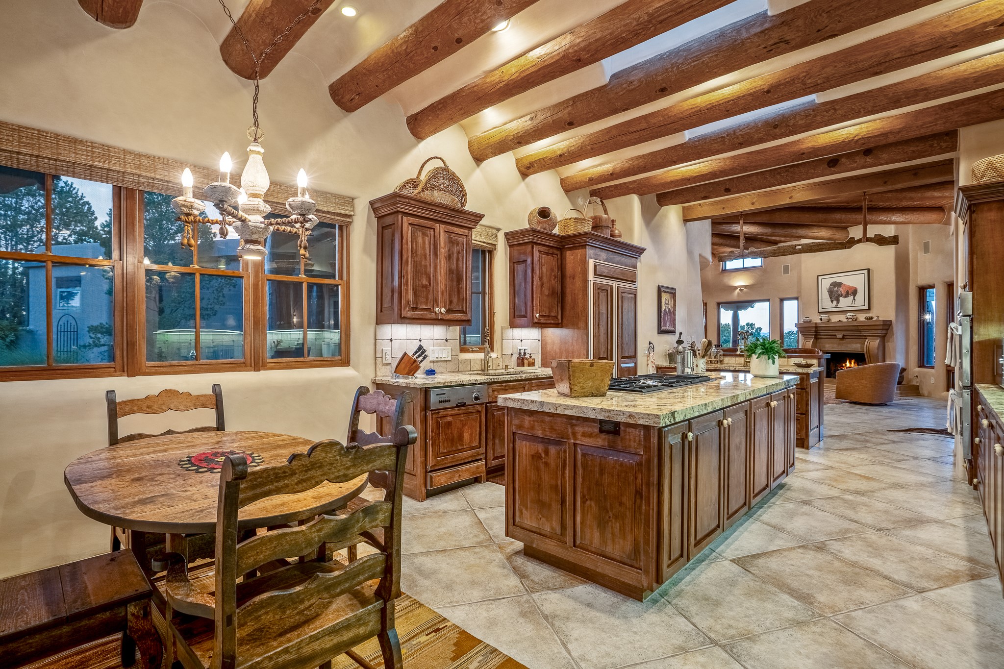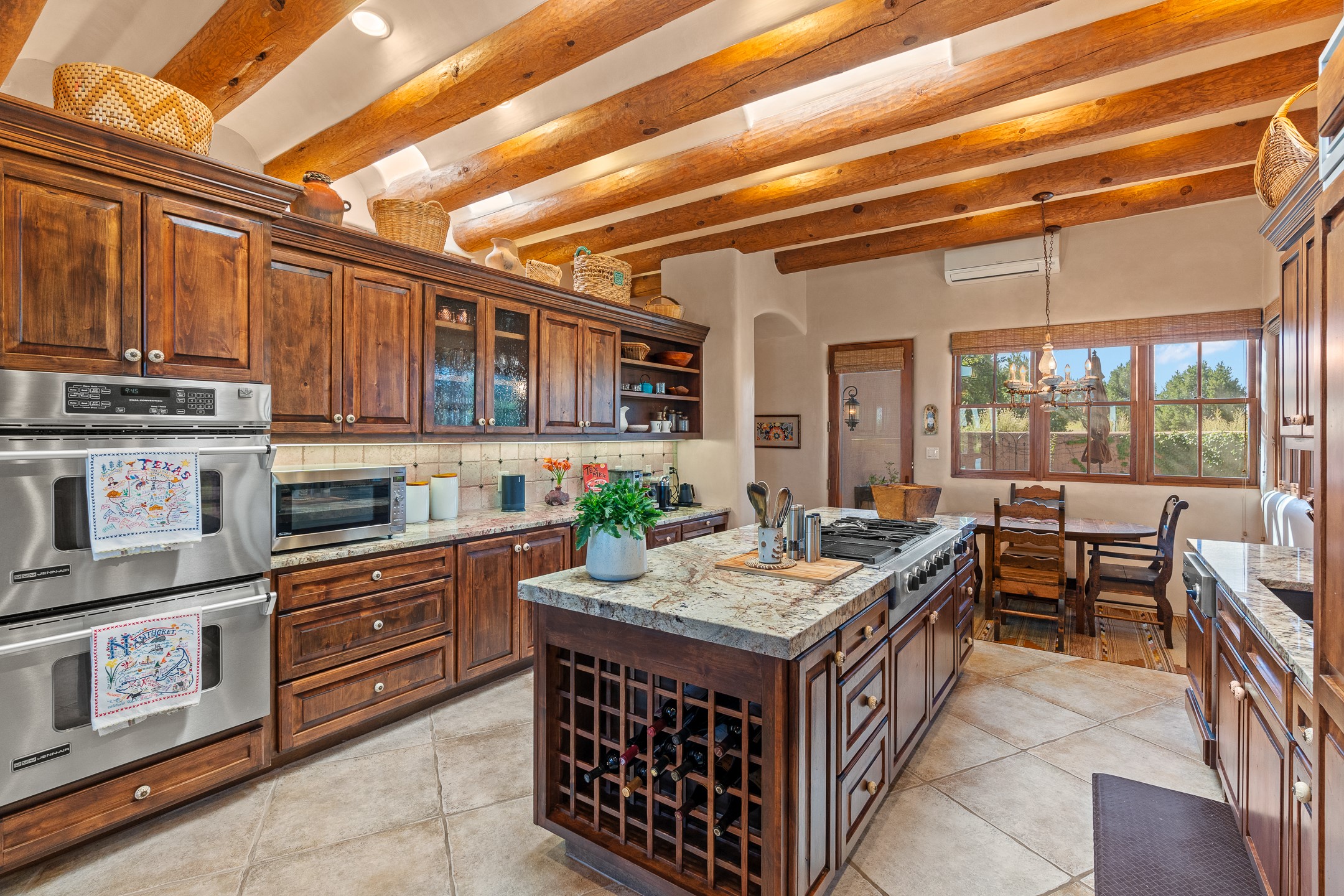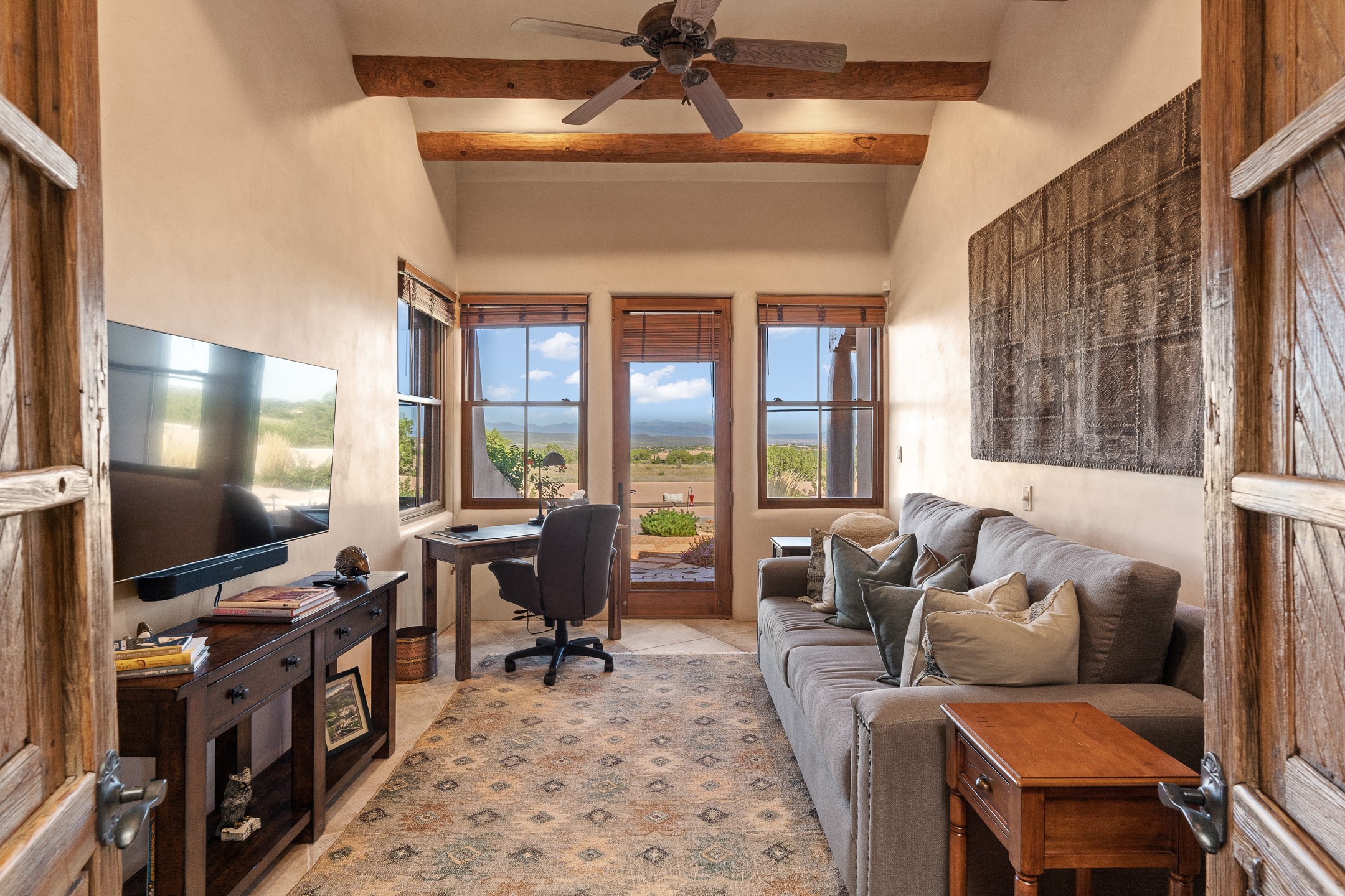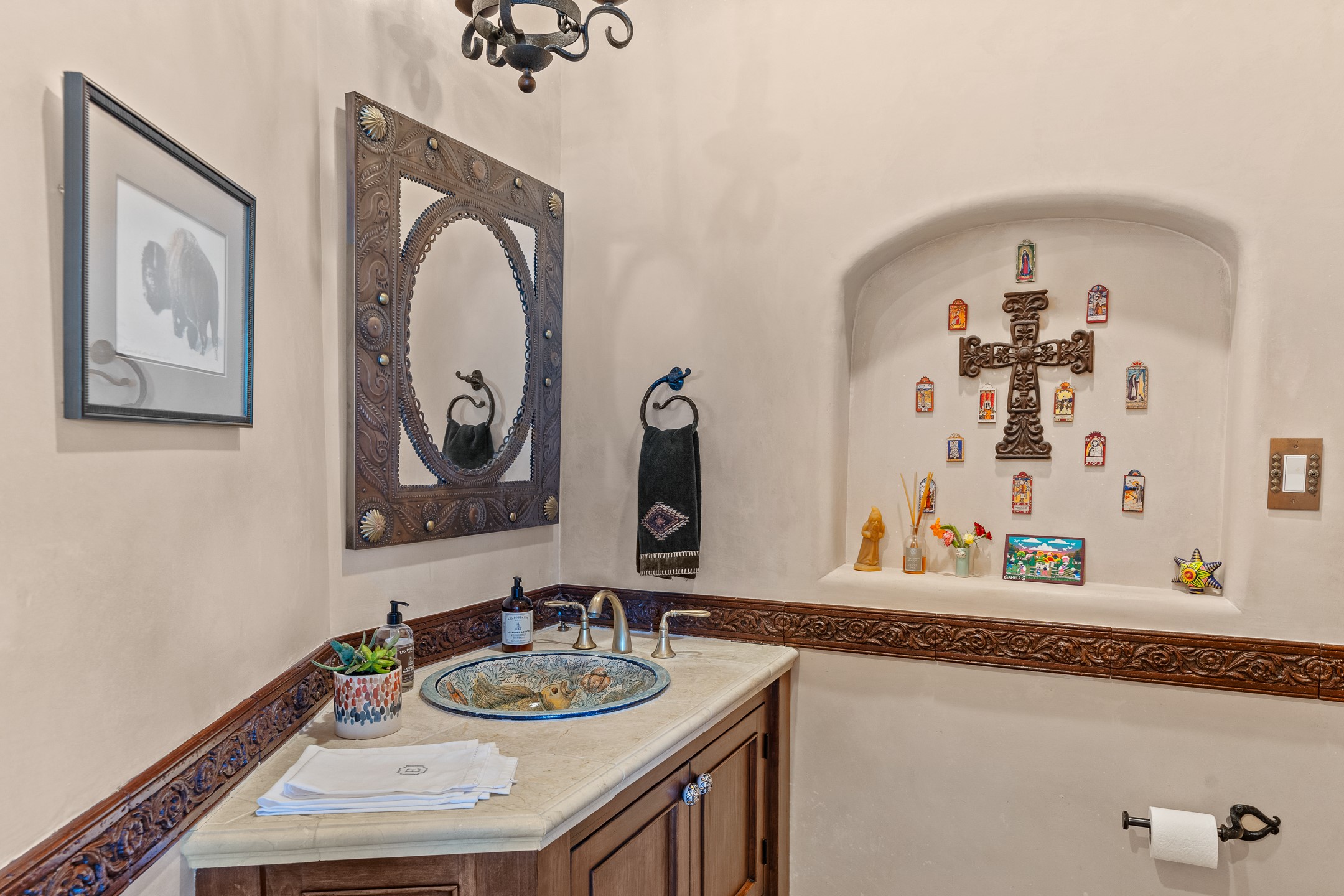 Step into luxury with this exceptional 3-bedroom, 3.5-bath home, offering an additional flex (office/media/workout) space and breathtaking sunset views from its magical back portal and yard brought to life by renowned designer Solange Serquis. Designed with both style and function in mind, this home is ideal for those who love to entertain and appreciate outdoor living. The grand entrance sets the tone for the home's sophisticated aesthetic, leading to an expansive living and dining area. The gourmet kitchen, complete with a breakfast nook, bar seating, and top-tier appliances, is a dream for any chef or host. Custom cabinetry, gleaming granite countertops, and an open layout make it the perfect space for entertaining guests while preparing meals. The outdoor spaces are as impressive as the interior, featuring a beautifully landscaped front courtyard, complete with serene water features. The rear portal offers a beautiful outdoor dining set up with a kiva fireplace. From the portal, there is direct access to a stunning landscape including gorgeous perennials, water features, a steel-log gas fire pit, a bocce ball court and private hot tub, ensuring relaxation with gorgeous views. The home's three-car garage is perfect for housing vehicles, bicycles, and providing extra workspace. The luxurious primary suite is a retreat of its own, with a cozy kiva fireplace, redesigned walk-in closet, and spa-inspired bathroom with a second kiva fireplace, creating the ultimate ambiance. Both the bedroom and the flex room offer exterior access, allowing for seamless indoor-outdoor living. The guest wing is designed for privacy and comfort, featuring two spacious ensuite bedrooms with beautiful views, making it an ideal sanctuary for visitors. Additional amenities include in-floor radiant heating, mini-splits for cooling, and great views from nearly every corner of the property. Perfect for family gatherings or elegant soires, this exquisite home is a true masterpiece of comfort, design, and luxury. A Social Membership at the Club at Las Campanas is available for separate purchase. (May be upgraded to Golf Membership). Schedule your private tour today and experience this one-of-a-kind home for yourself.