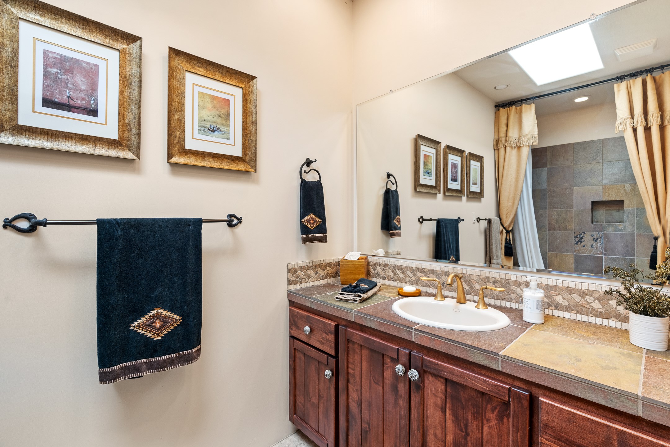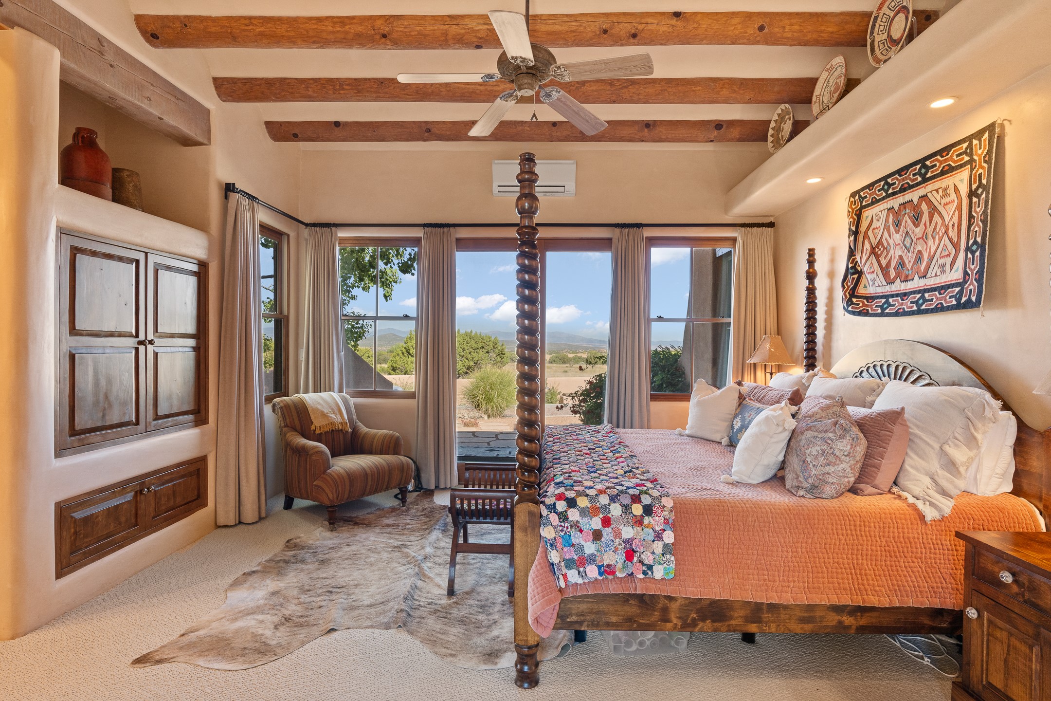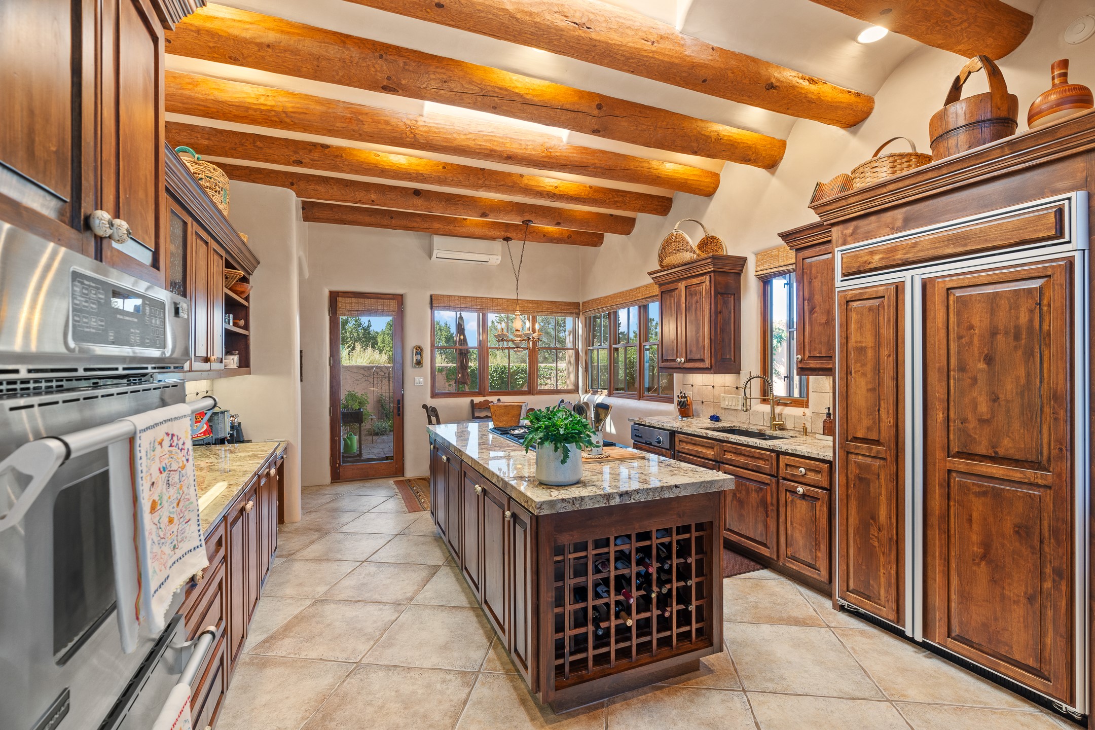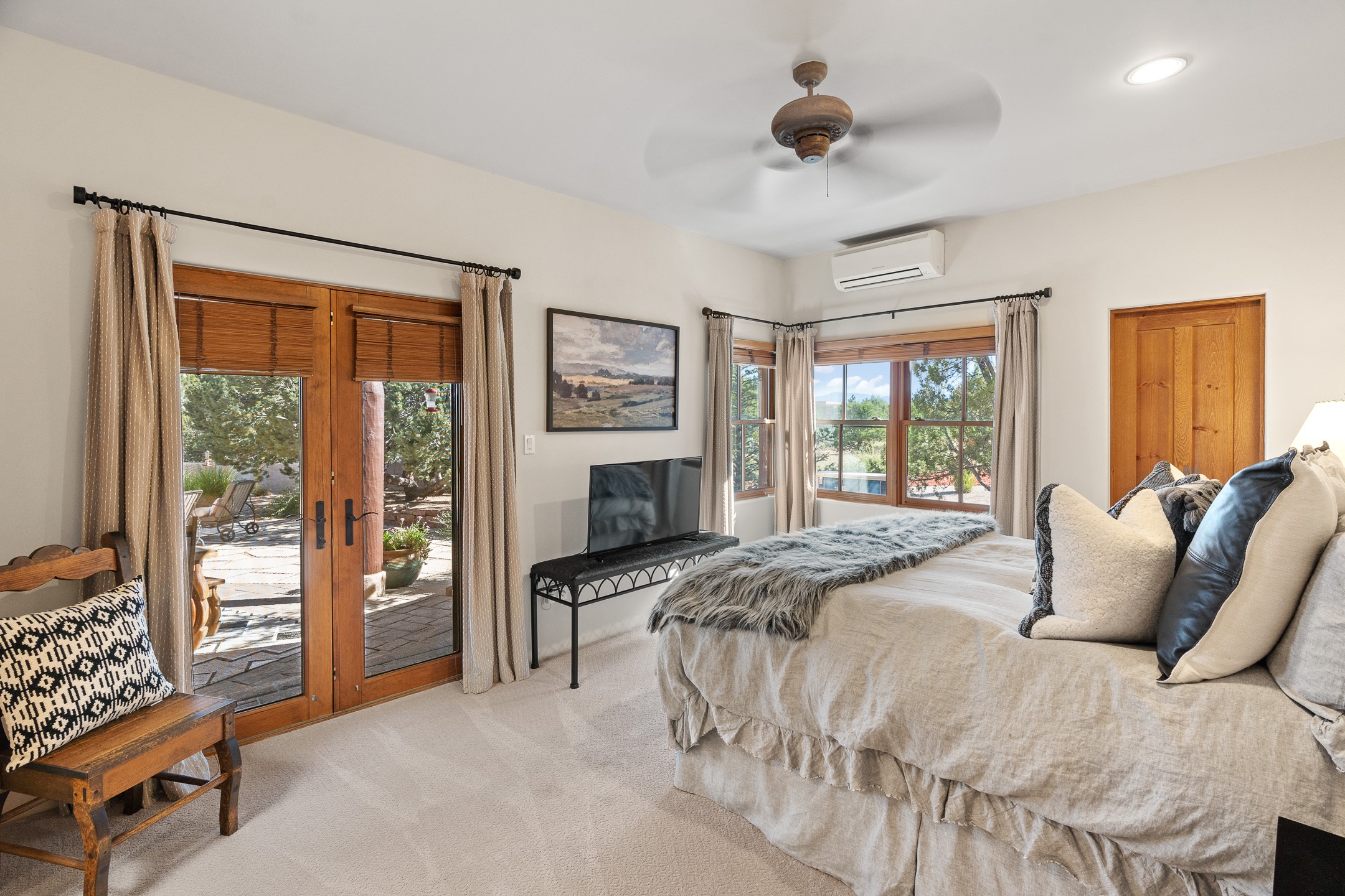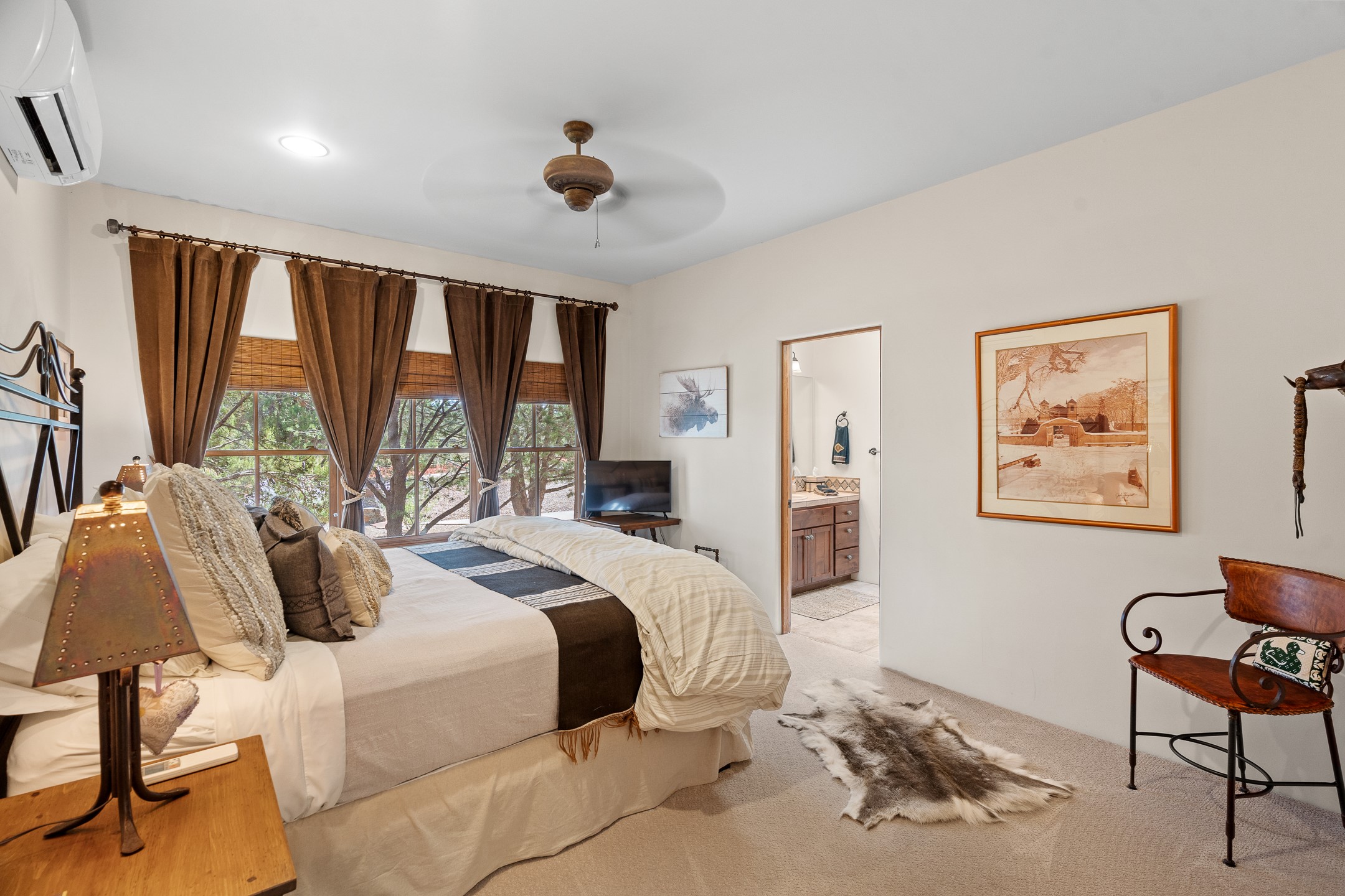 Step into luxury with this exceptional 3-bedroom, 3.5-bath home, offering an additional flex (office/media/workout) space and breathtaking sunset views from its magical back portal and yard brought to life by renowned designer Solange Serquis. Designed with both style and function in mind, this home is ideal for those who love to entertain and appreciate outdoor living. The grand entrance sets the tone for the home's sophisticated aesthetic, leading to an expansive living and dining area. The gourmet kitchen, complete with a breakfast nook, bar seating, and top-tier appliances, is a dream for any chef or host. Custom cabinetry, gleaming granite countertops, and an open layout make it the perfect space for entertaining guests while preparing meals. The outdoor spaces are as impressive as the interior, featuring a beautifully landscaped front courtyard, complete with serene water features. The rear portal offers a beautiful outdoor dining set up with a kiva fireplace. From the portal, there is direct access to a stunning landscape including gorgeous perennials, water features, a steel-log gas fire pit, a bocce ball court and private hot tub, ensuring relaxation with gorgeous views. The home's three-car garage is perfect for housing vehicles, bicycles, and providing extra workspace. The luxurious primary suite is a retreat of its own, with a cozy kiva fireplace, redesigned walk-in closet, and spa-inspired bathroom with a second kiva fireplace, creating the ultimate ambiance. Both the bedroom and the flex room offer exterior access, allowing for seamless indoor-outdoor living. The guest wing is designed for privacy and comfort, featuring two spacious ensuite bedrooms with beautiful views, making it an ideal sanctuary for visitors. Additional amenities include in-floor radiant heating, mini-splits for cooling, and great views from nearly every corner of the property. Perfect for family gatherings or elegant soires, this exquisite home is a true masterpiece of comfort, design, and luxury. A Social Membership at the Club at Las Campanas is available for separate purchase. (May be upgraded to Golf Membership). Schedule your private tour today and experience this one-of-a-kind home for yourself.