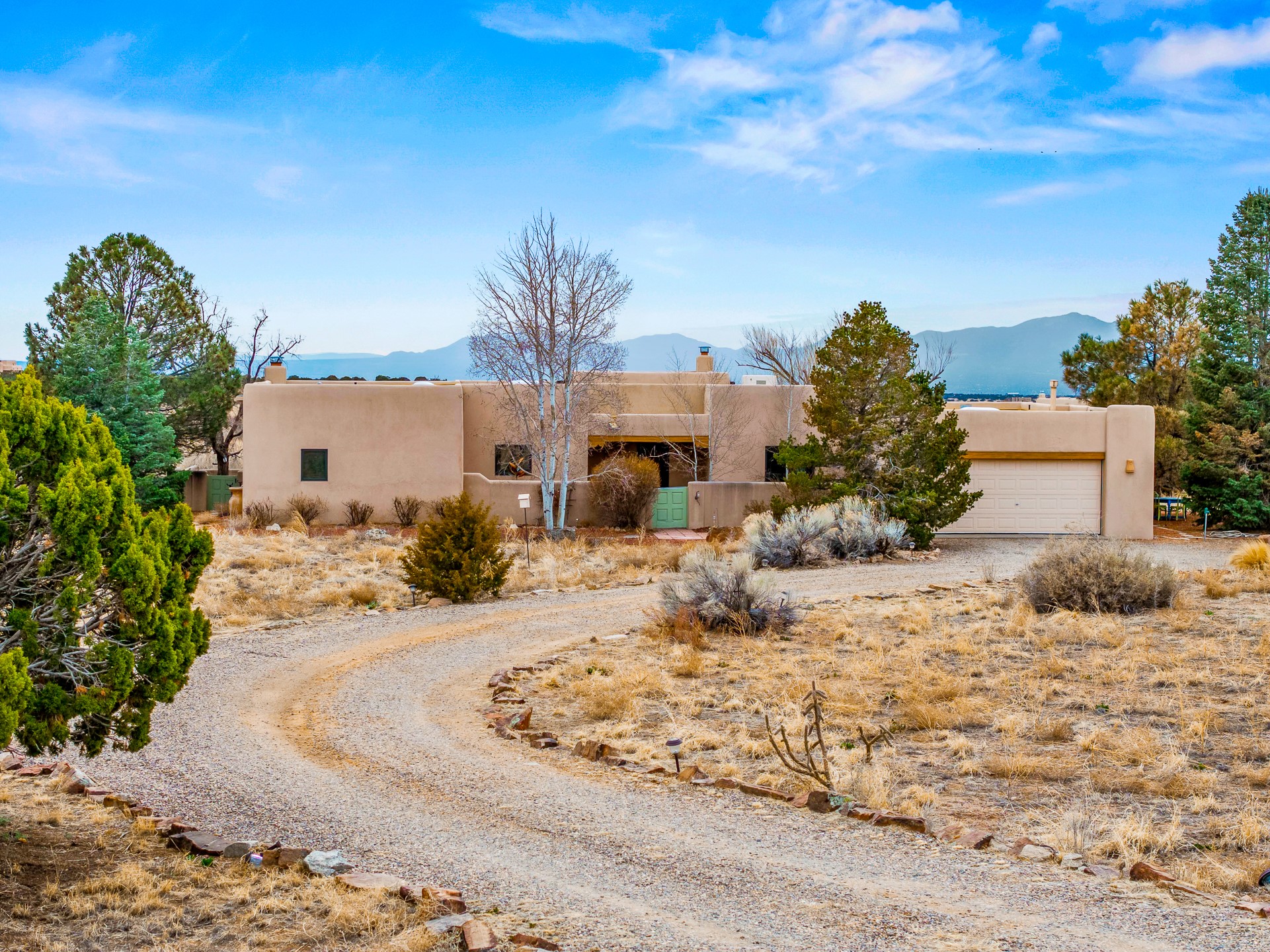 Experience the perfect blend of elegance, comfort, and breathtaking views in this stunning 4 bedroom, 2 bath home, set on a premier 6.85 acre lot in the sought after La Paz at Eldorado. Overlooking the Ortiz and Sandia mountains, this residence offers a peaceful retreat with unparalleled New Mexico sunrises and sunsets. Step inside to a light-filled living area featuring high ceilings, vigas, and a charming kiva fireplace. The well-appointed kitchen boasts stainless steel appliances, granite countertops, and an inviting dining area. The spacious primary suite is a private sanctuary, complete with its own kiva fireplace, a luxurious bath with a soaking tub and walk-in shower, a California closet system, and French doors leading to the serene rear courtyard. The three additional bedrooms provide versatility and ample space, with one currently serving as the Seller's inspiring art studio. Outdoor, a covered patio, pergola, and walled courtyard create an intimate setting for relaxation or entertaining, seamlessly extending your living space into the natural beauty of Northern New Mexico. This exceptional home offers the best of Santa Fe living. https://38-carissa-road.robyntyra.com