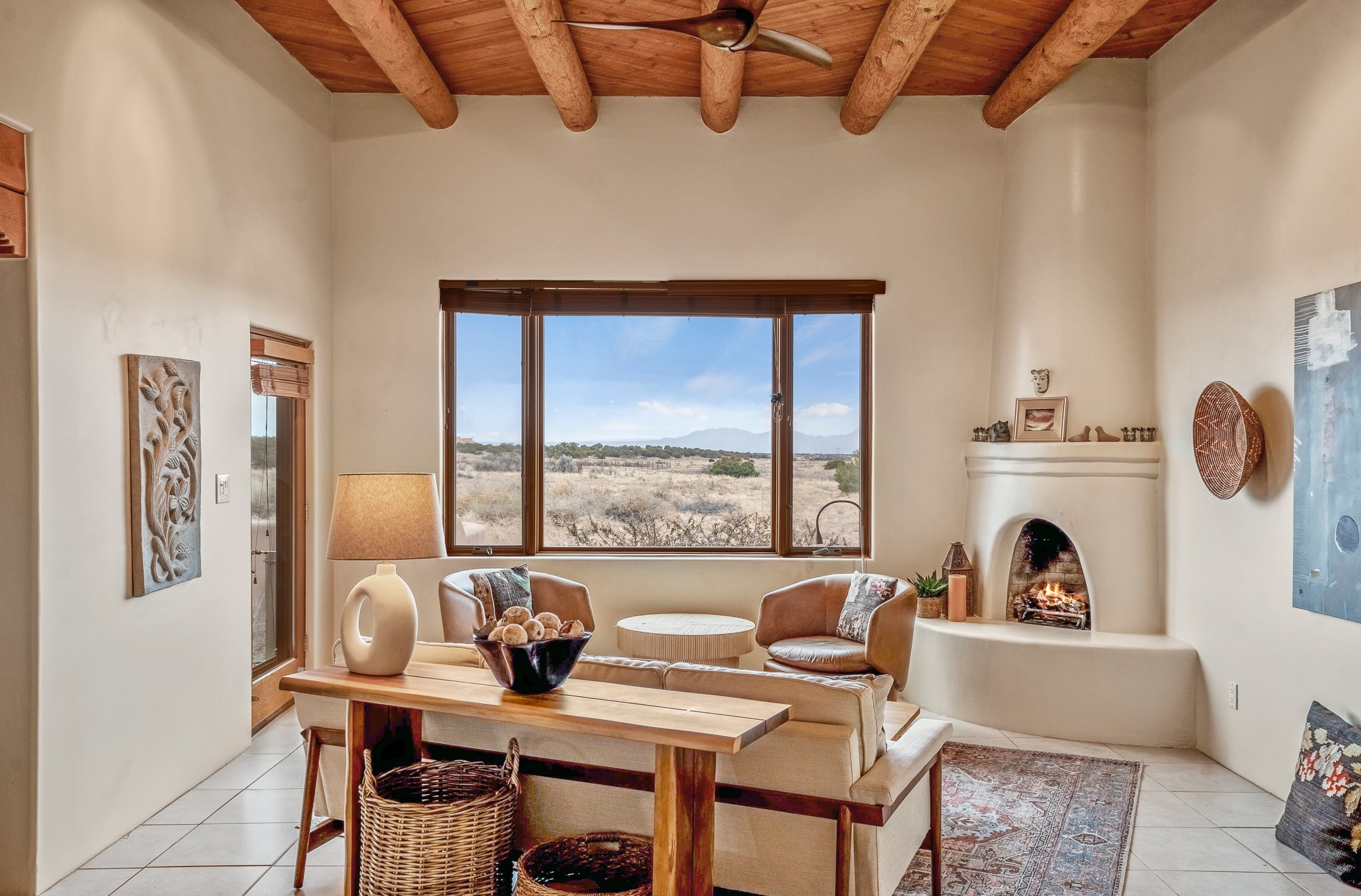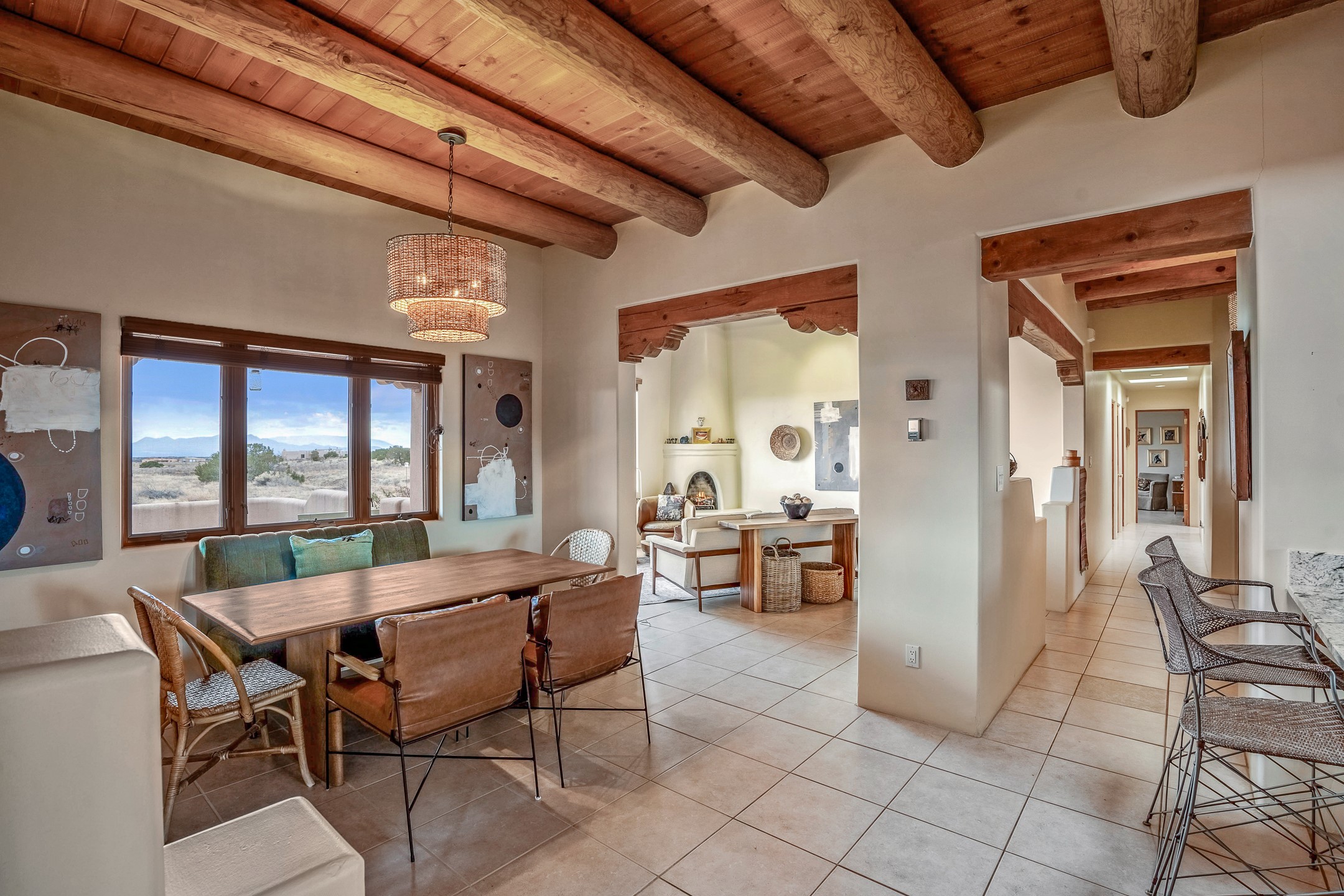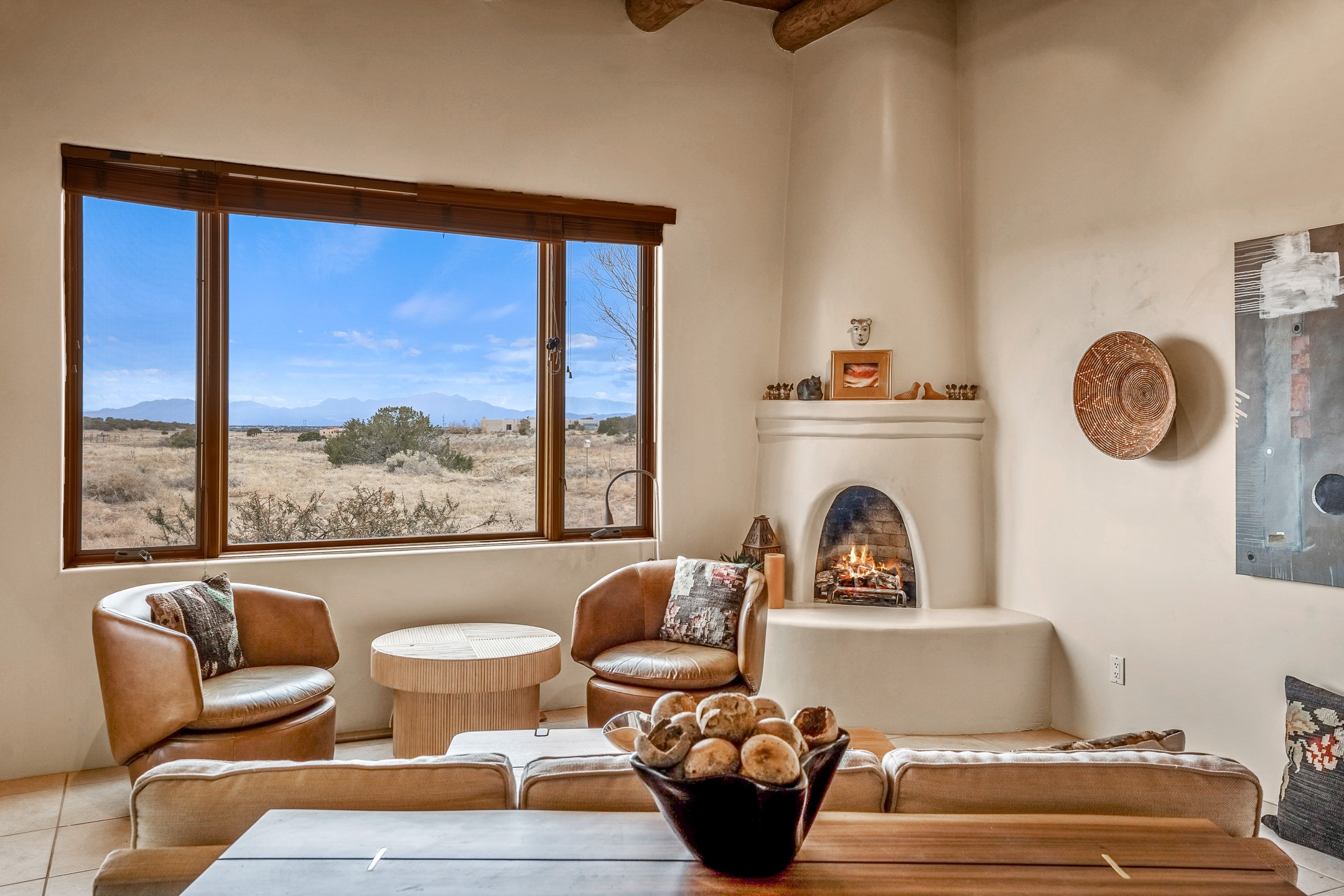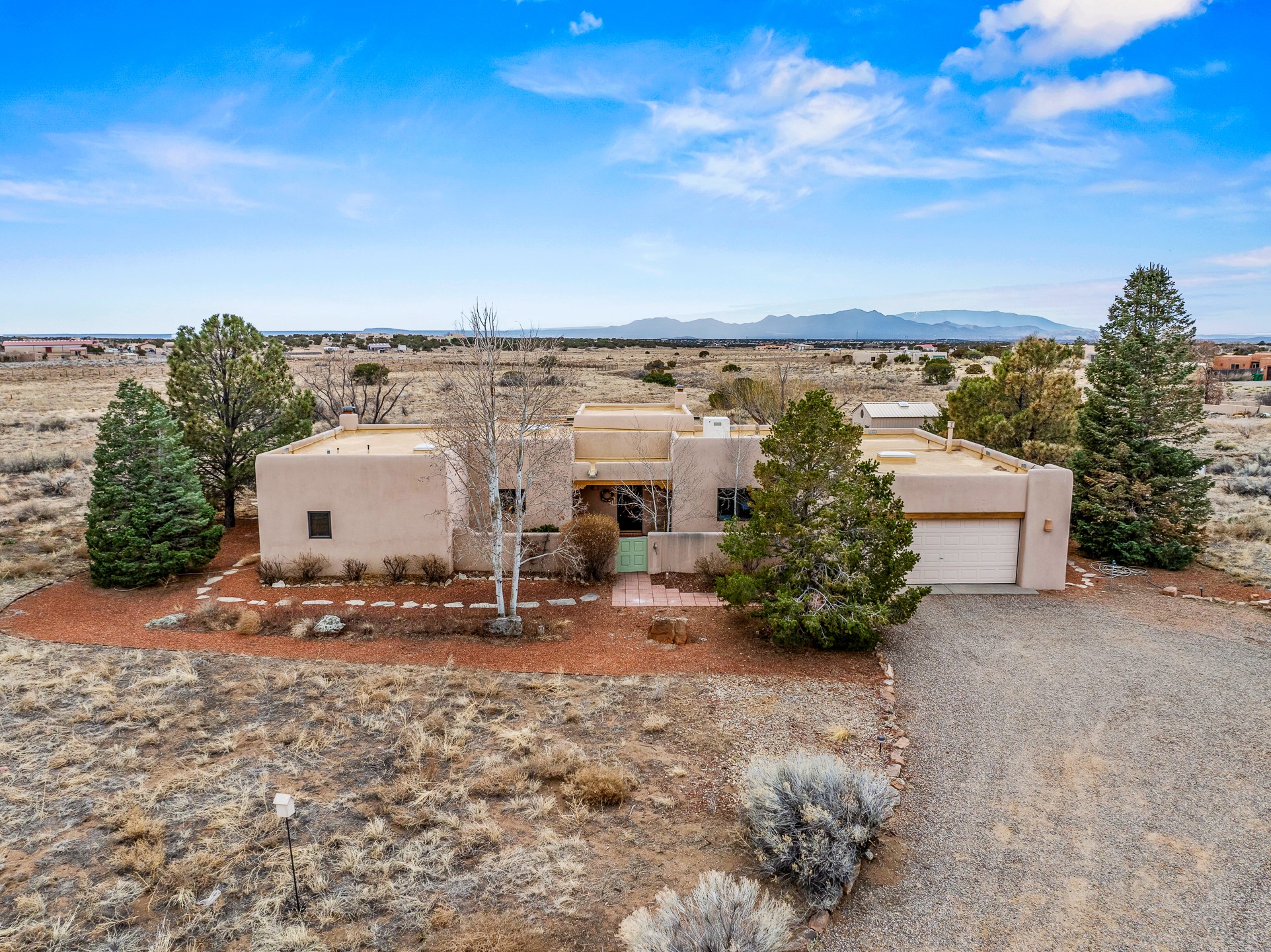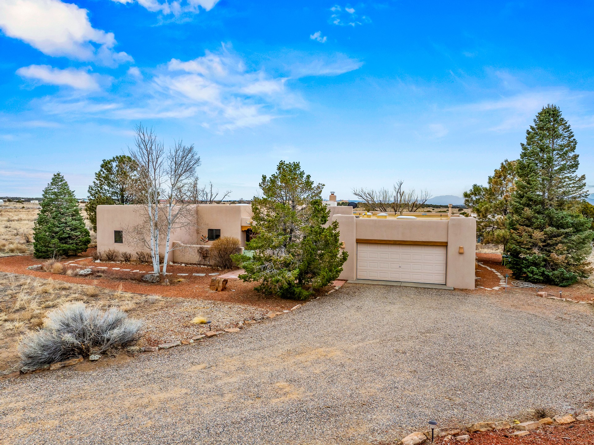Experience the perfect blend of elegance, comfort, and breathtaking views in this stunning 4 bedroom, 2 bath home, set on a premier 6.85 acre lot in the sought after La Paz at Eldorado. Overlooking the Ortiz and Sandia mountains, this residence offers a peaceful retreat with unparalleled New Mexico sunrises and sunsets. Step inside to a light-filled living area featuring high ceilings, vigas, and a charming kiva fireplace. The well-appointed kitchen boasts stainless steel appliances, granite countertops, and an inviting dining area. The spacious primary suite is a private sanctuary, complete with its own kiva fireplace, a luxurious bath with a soaking tub and walk-in shower, a California closet system, and French doors leading to the serene rear courtyard. The three additional bedrooms provide versatility and ample space, with one currently serving as the Seller's inspiring art studio. Outdoor, a covered patio, pergola, and walled courtyard create an intimate setting for relaxation or entertaining, seamlessly extending your living space into the natural beauty of Northern New Mexico. This exceptional home offers the best of Santa Fe living. https://38-carissa-road.robyntyra.com