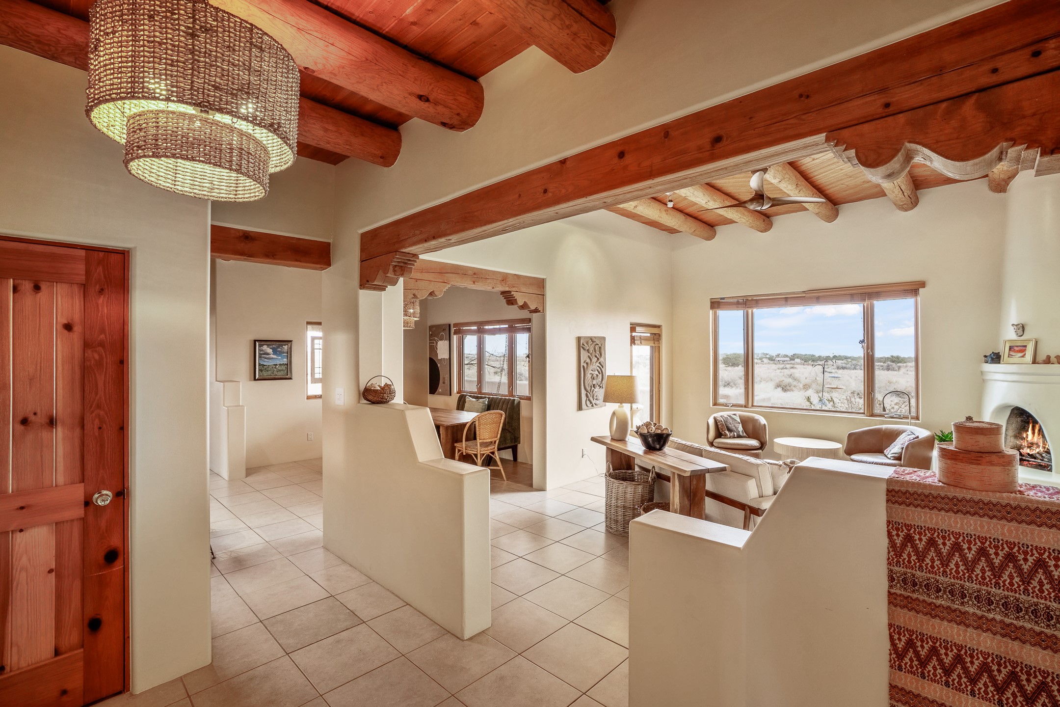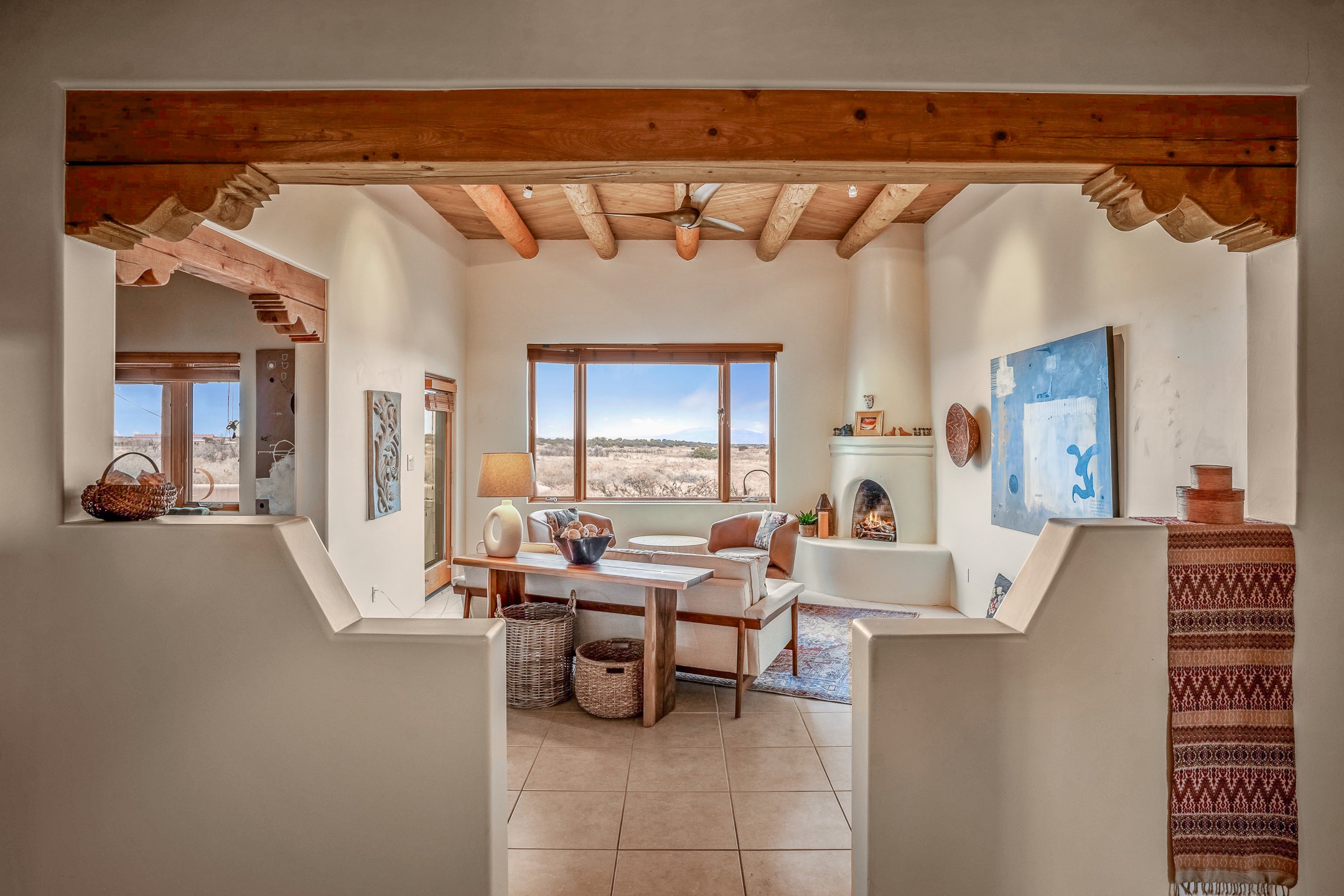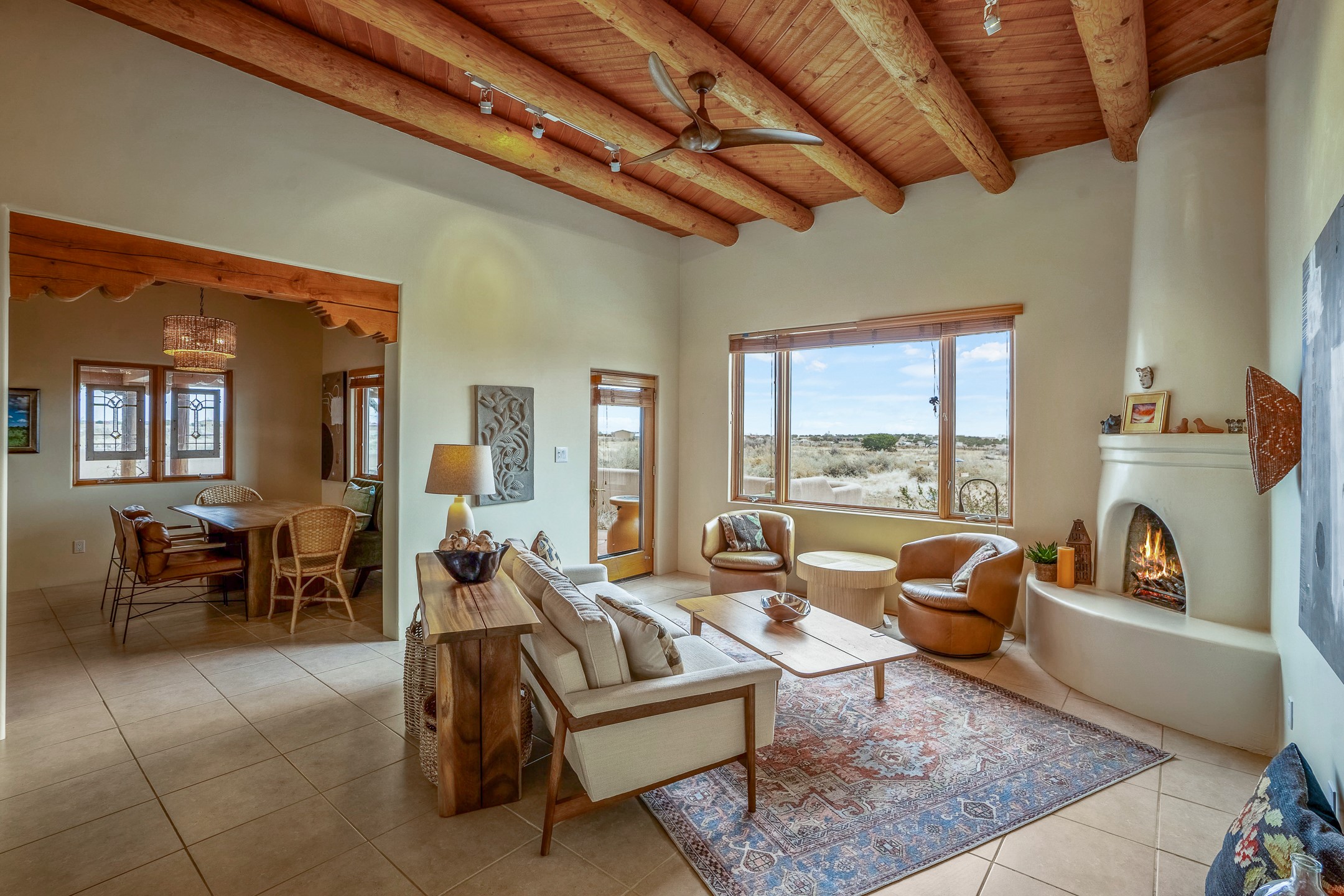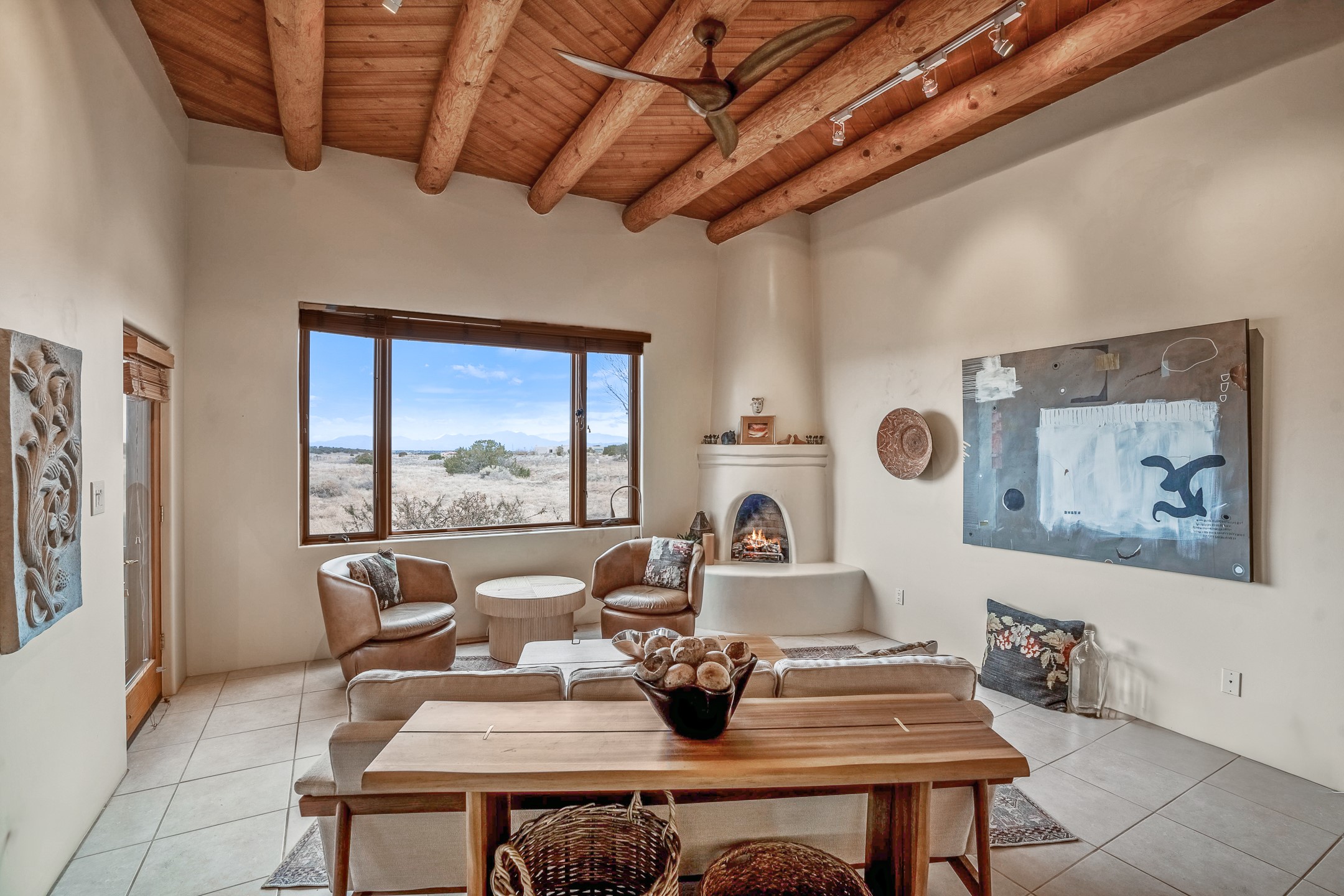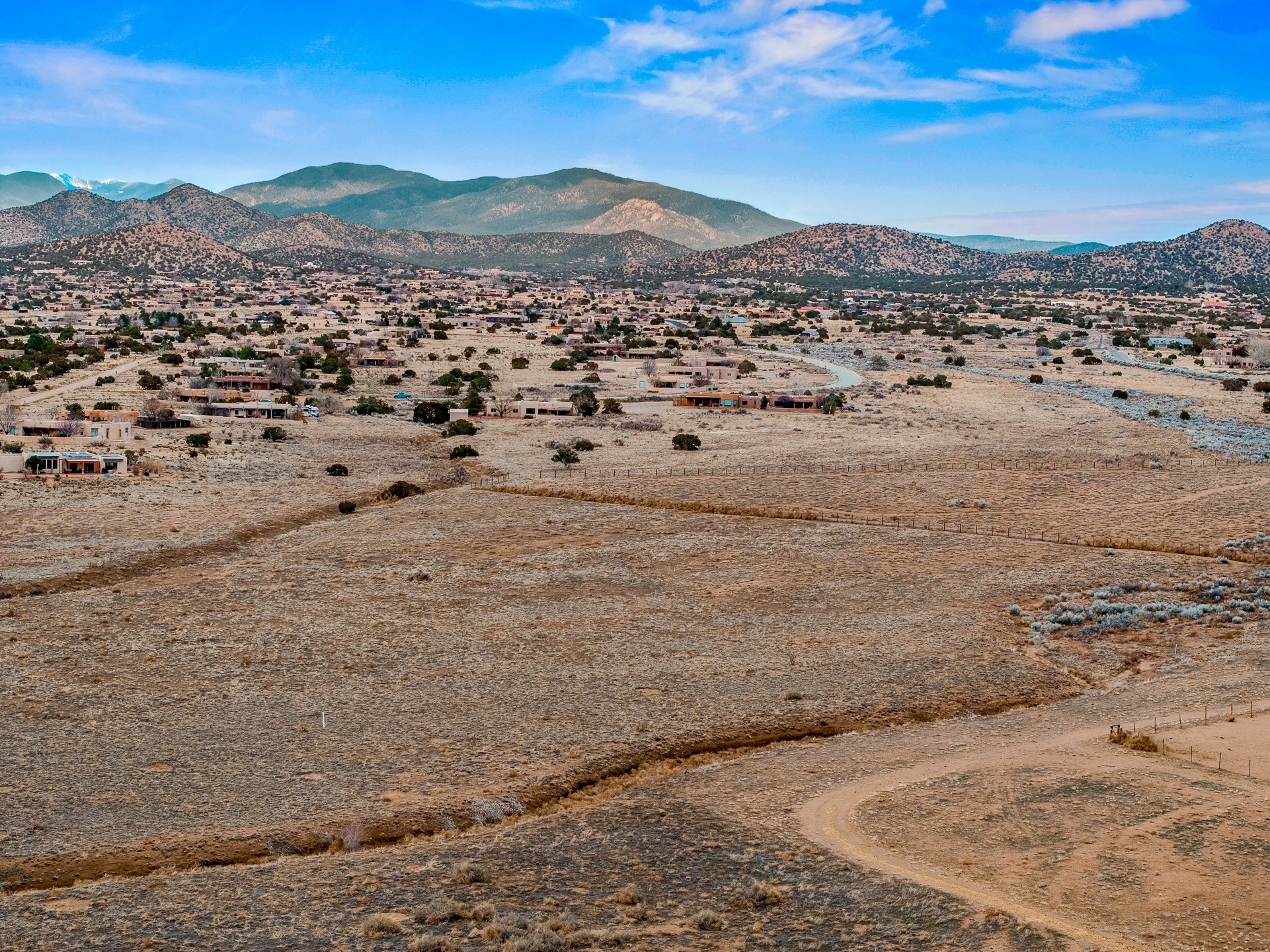 Experience the perfect blend of elegance, comfort, and breathtaking views in this stunning 4 bedroom, 2 bath home, set on a premier 6.85 acre lot in the sought after La Paz at Eldorado. Overlooking the Ortiz and Sandia mountains, this residence offers a peaceful retreat with unparalleled New Mexico sunrises and sunsets. Step inside to a light-filled living area featuring high ceilings, vigas, and a charming kiva fireplace. The well-appointed kitchen boasts stainless steel appliances, granite countertops, and an inviting dining area. The spacious primary suite is a private sanctuary, complete with its own kiva fireplace, a luxurious bath with a soaking tub and walk-in shower, a California closet system, and French doors leading to the serene rear courtyard. The three additional bedrooms provide versatility and ample space, with one currently serving as the Seller's inspiring art studio. Outdoor, a covered patio, pergola, and walled courtyard create an intimate setting for relaxation or entertaining, seamlessly extending your living space into the natural beauty of Northern New Mexico. This exceptional home offers the best of Santa Fe living. https://38-carissa-road.robyntyra.com