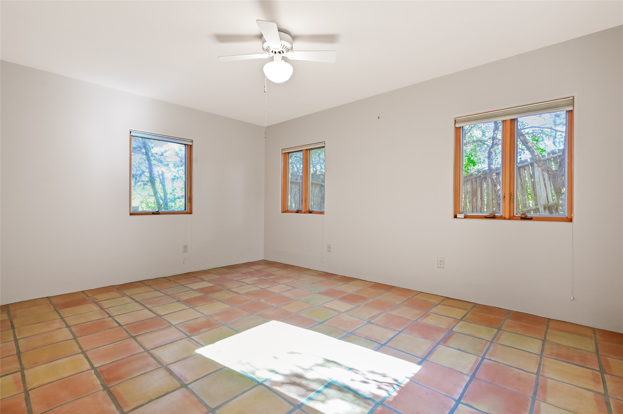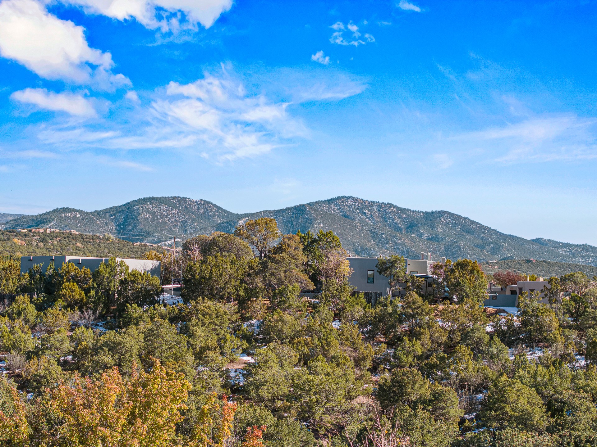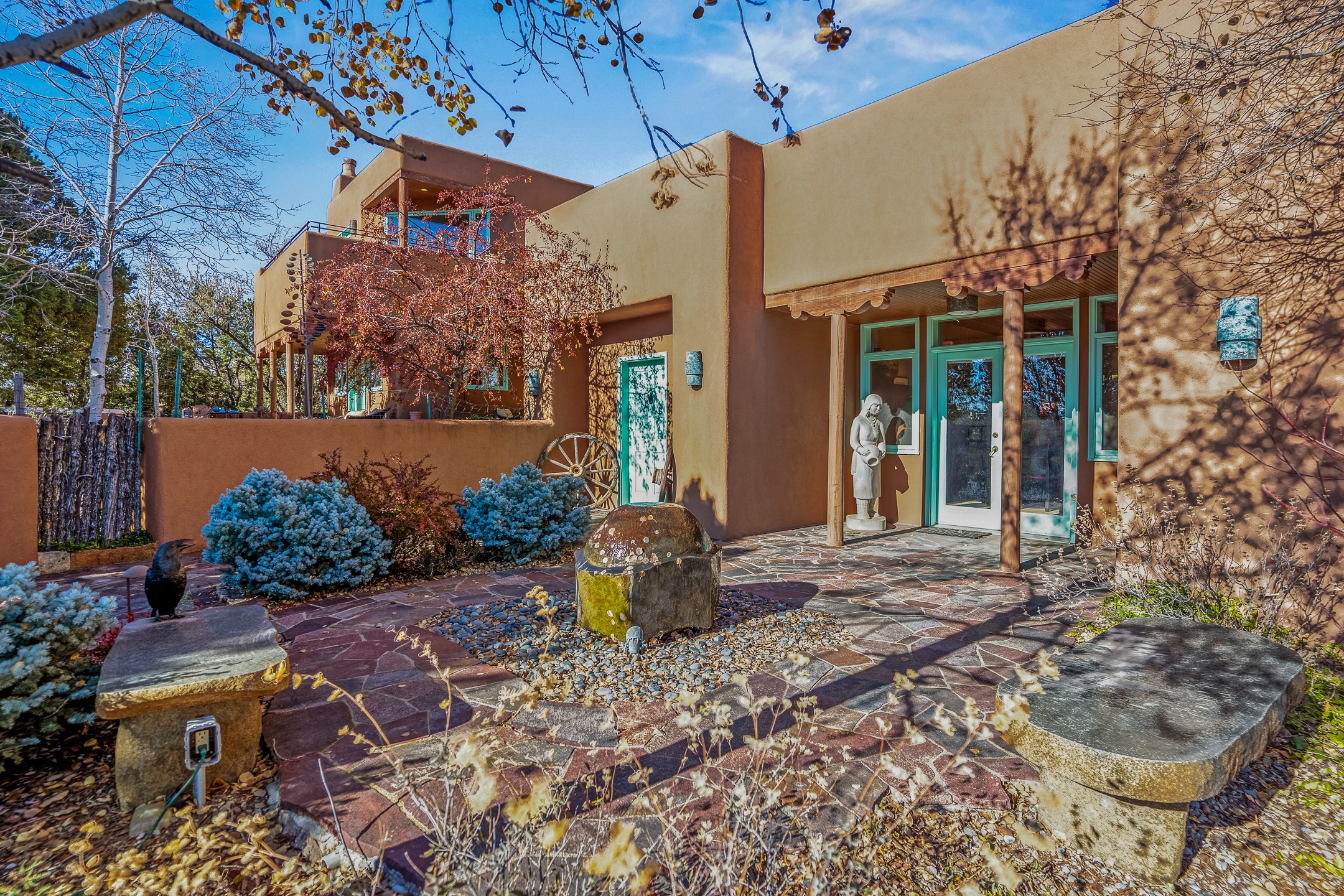 This oasis of a home is located close to downtown but far enough that you feel like you are at a private retreat. With multiple living areas inside and outside, this house can be a quiet space or offer an entertaining opportunity. With soaring ceilings, (some with tongue and groove, some with beams), plaster walls, saltillo tile, granite counters, fireplaces, and windows allowing the outside in throughout, this home is one to see and claim as your own. The outdoor spaces offer views, quiet time options and areas to enjoy family and friends throughout many of the months in Santa Fe. The upper level has an extra bedroom and a bonus room that currently operates as a workout room. Storage options abound throughout the house. From the kitchen window, you can watch the flowing fountain while you create that gourmet meal. The property is gated and has parking for at least 3 outside of the garages. Come and see it for yourself and you won't want to leave.
