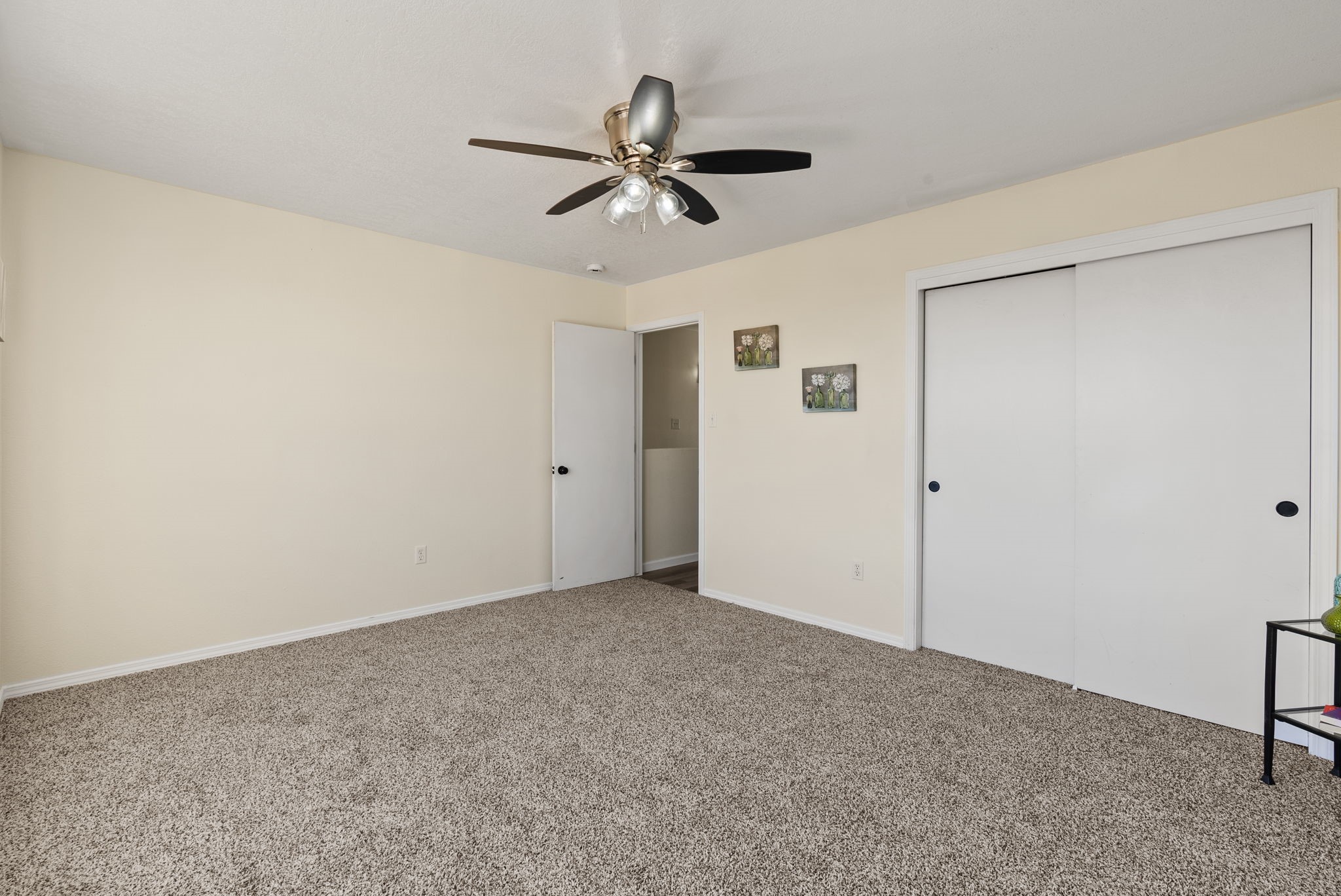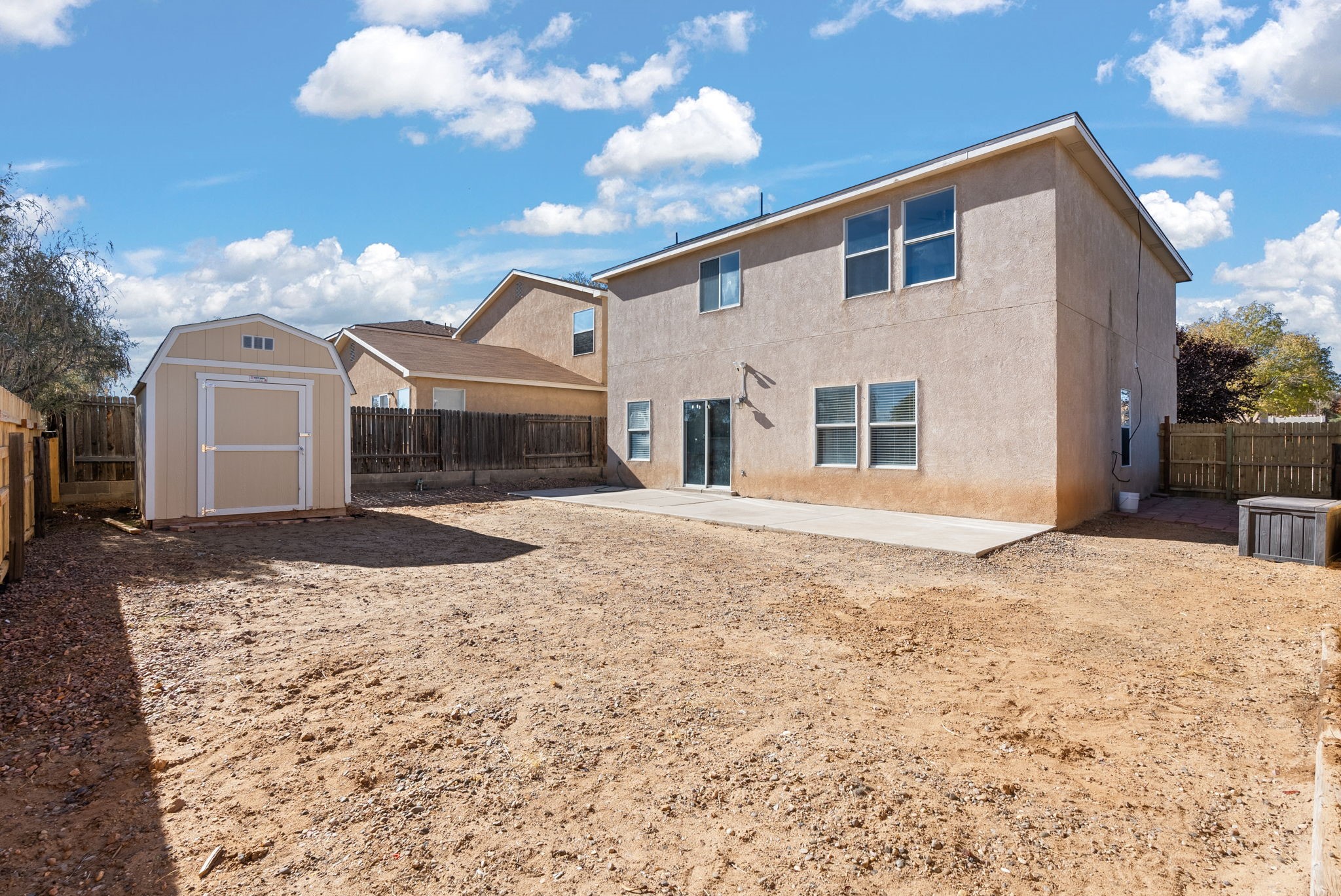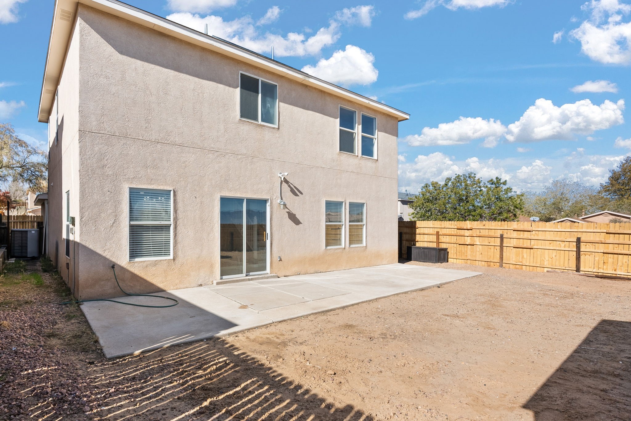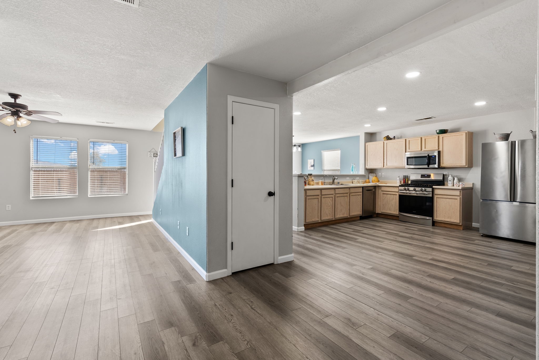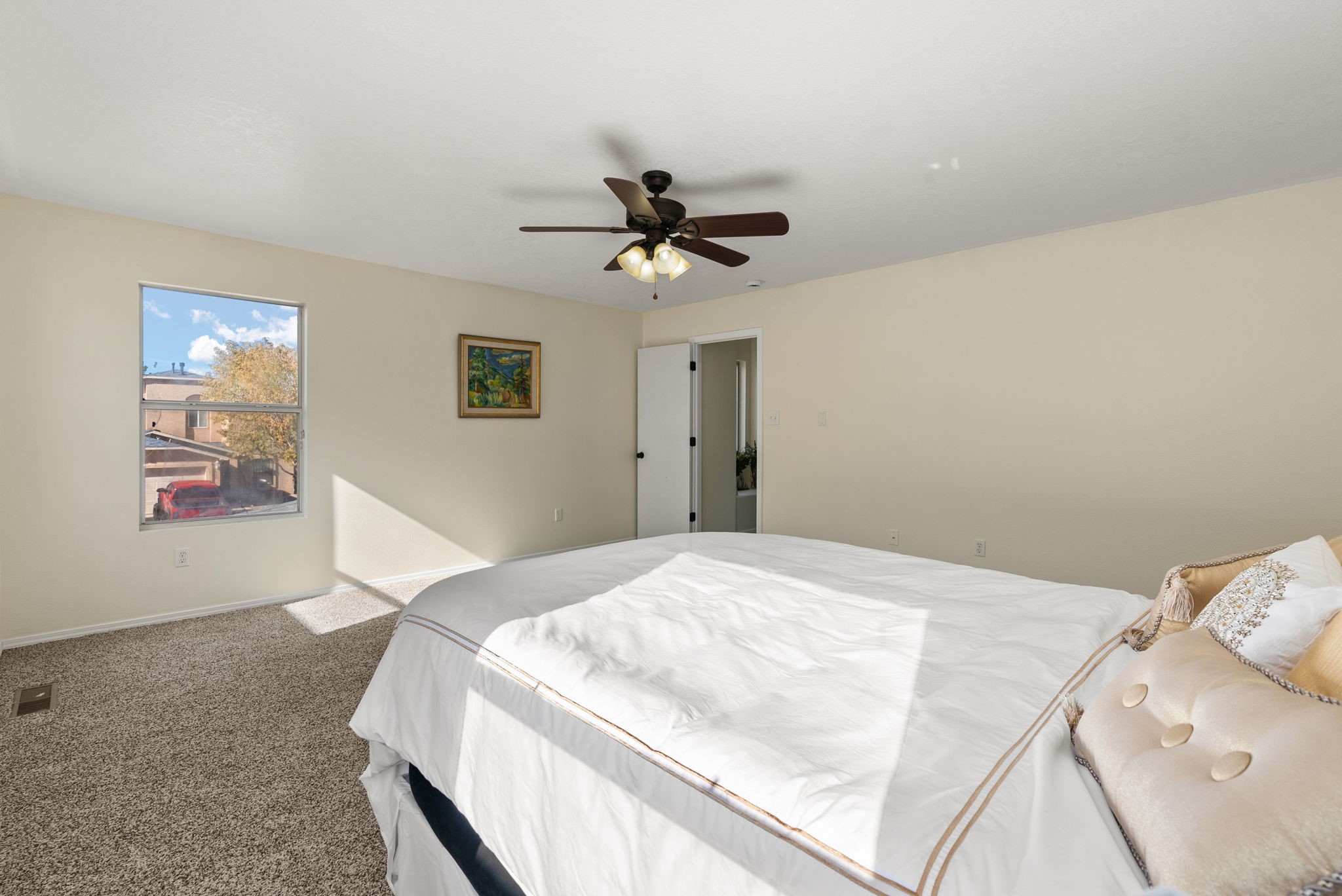 Discover this stunning move-in-ready 2-story home in Albuquerque's desirable area, perfect for entertaining or large family living. This 4-bedroom, 3-bathroom, 2,125 sq. ft. home features an open floor plan that seamlessly combines functionality and style. Enjoy newer flooring, upgraded lighting, and refrigerated air installed in 2022. The kitchen shines with all newer appliances, complemented by stylish new blinds throughout. Ceiling fans in all bedrooms and a unique "Harry Potter Storage" space add charm and comfort. Relax in the fully fenced corner lot, offering plenty of privacy. Take in the scenic views from this well-situated property. The insulated crawl space enhances energy efficiency, while proximity to the interstate ensures effortless commuting. Nearby restaurants and conveniences complete this incredible offering.