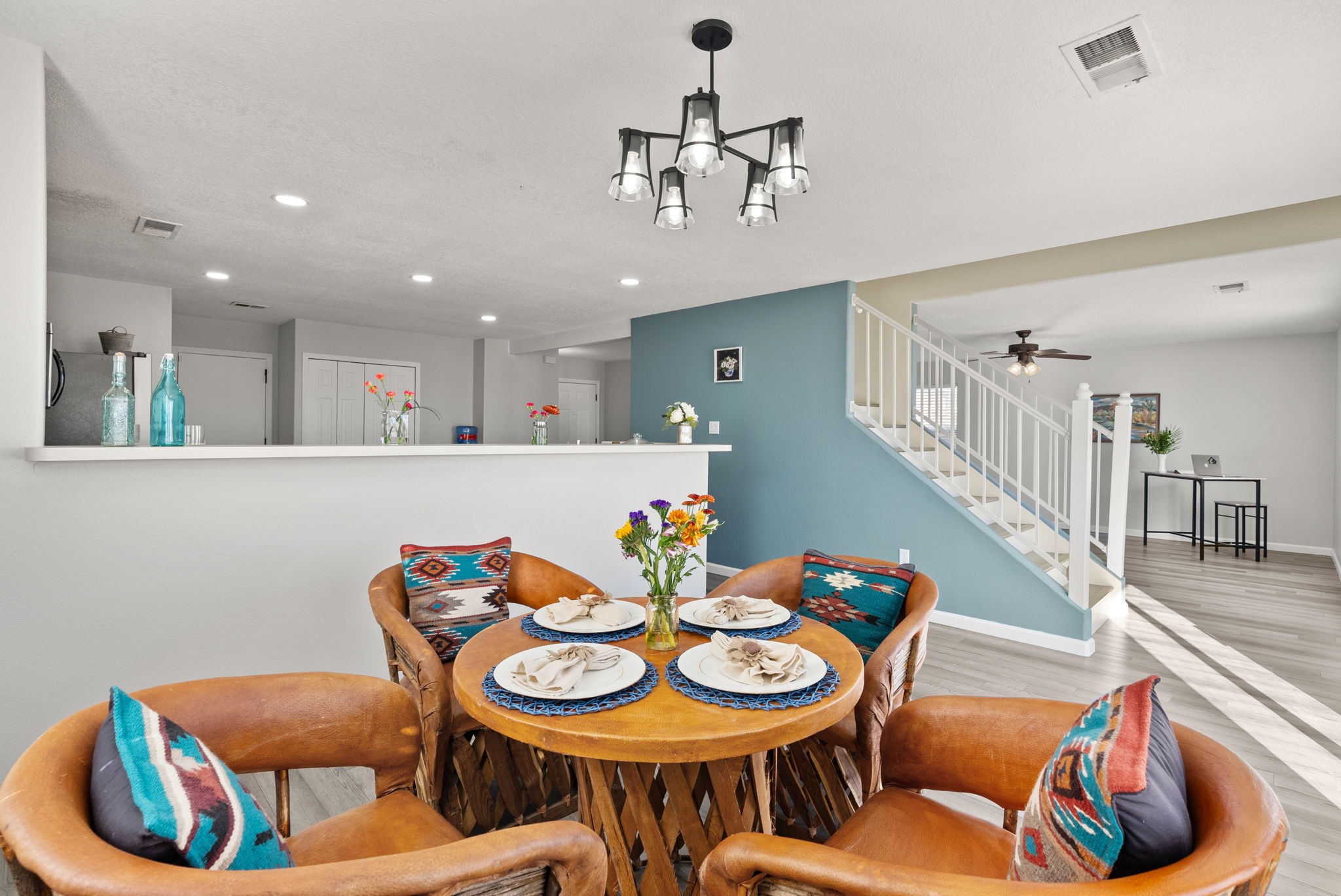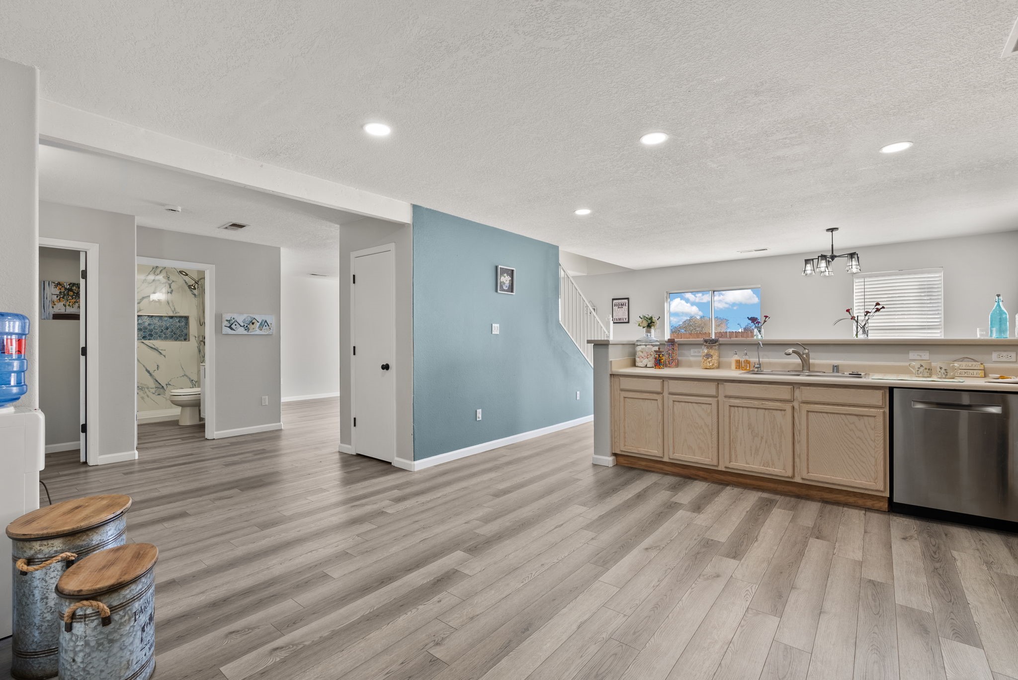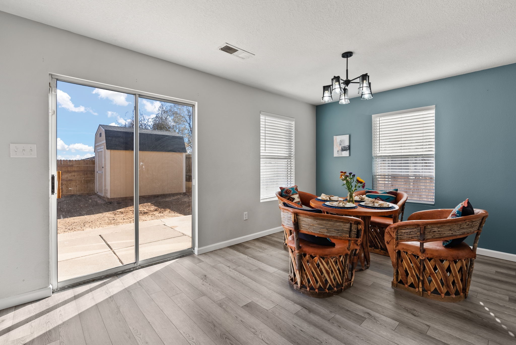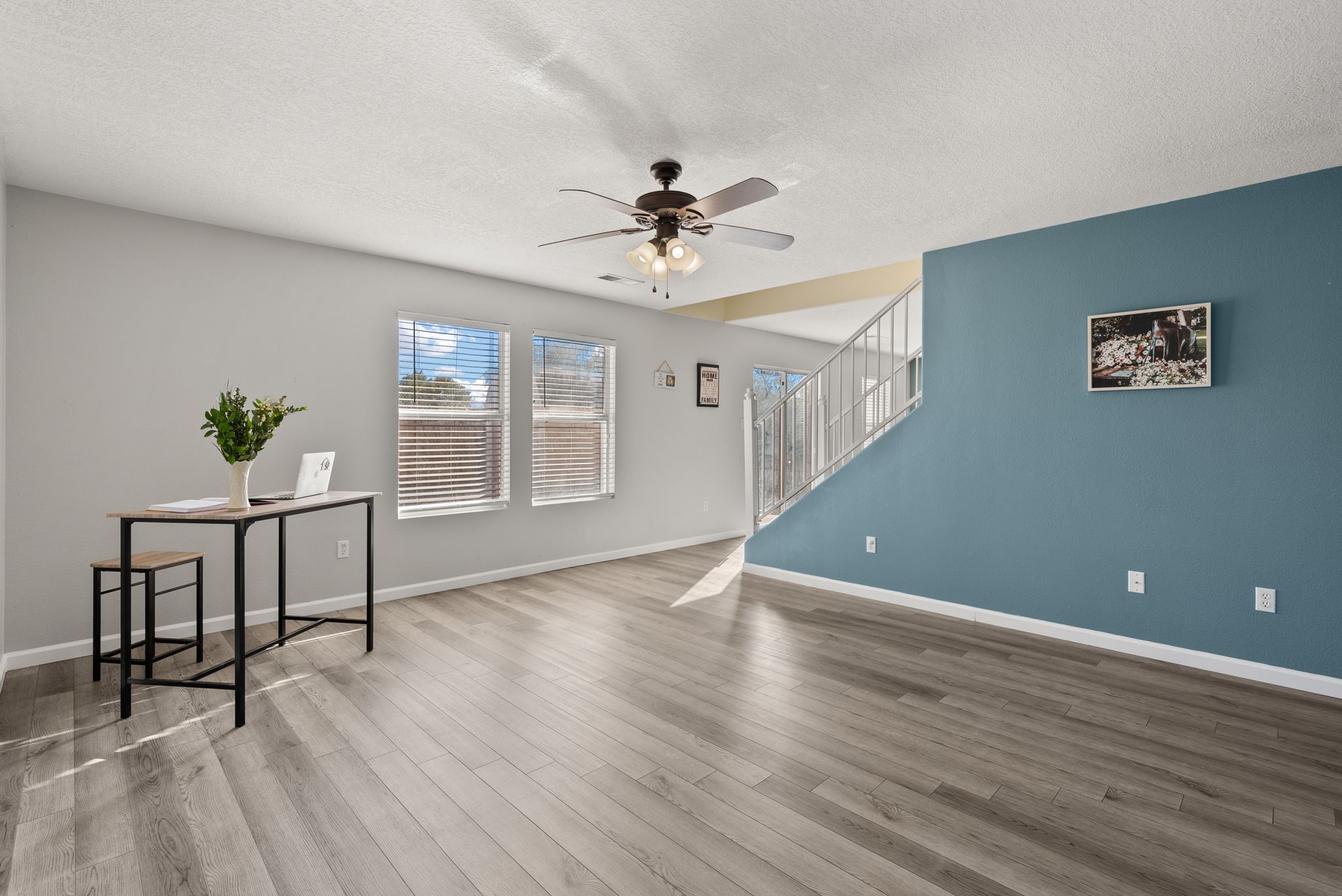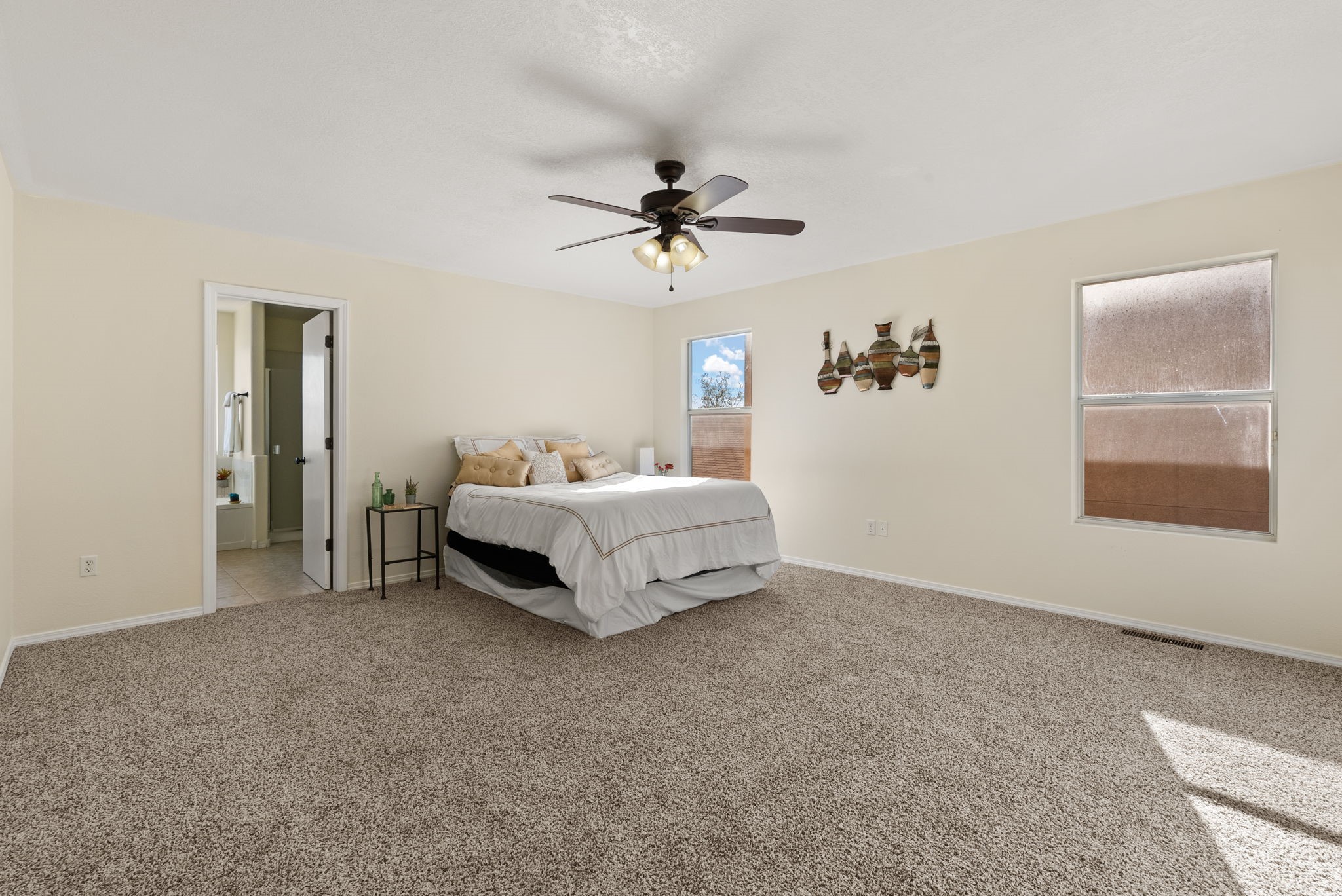 Discover this stunning move-in-ready 2-story home in Albuquerque's desirable area, perfect for entertaining or large family living. This 4-bedroom, 3-bathroom, 2,125 sq. ft. home features an open floor plan that seamlessly combines functionality and style. Enjoy newer flooring, upgraded lighting, and refrigerated air installed in 2022. The kitchen shines with all newer appliances, complemented by stylish new blinds throughout. Ceiling fans in all bedrooms and a unique "Harry Potter Storage" space add charm and comfort. Relax in the fully fenced corner lot, offering plenty of privacy. Take in the scenic views from this well-situated property. The insulated crawl space enhances energy efficiency, while proximity to the interstate ensures effortless commuting. Nearby restaurants and conveniences complete this incredible offering.