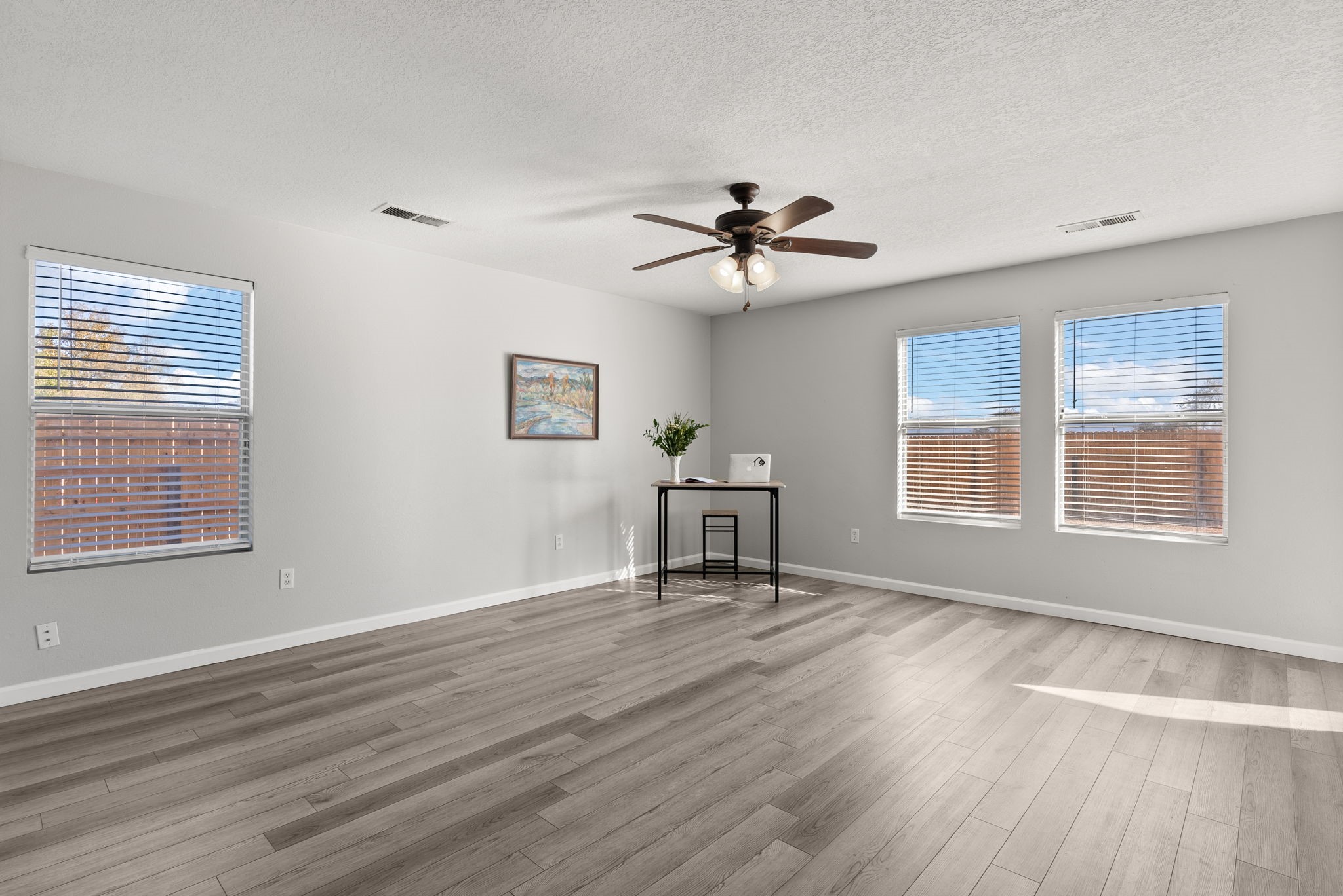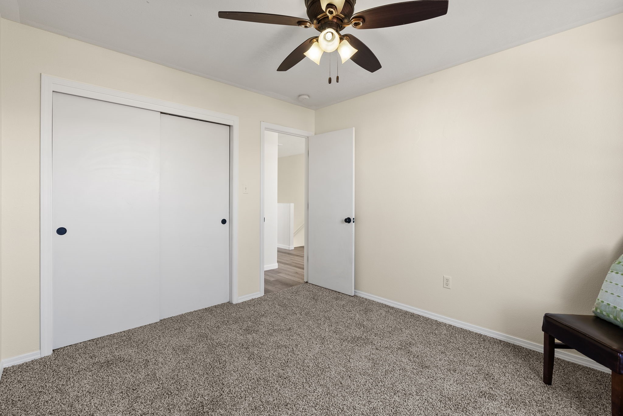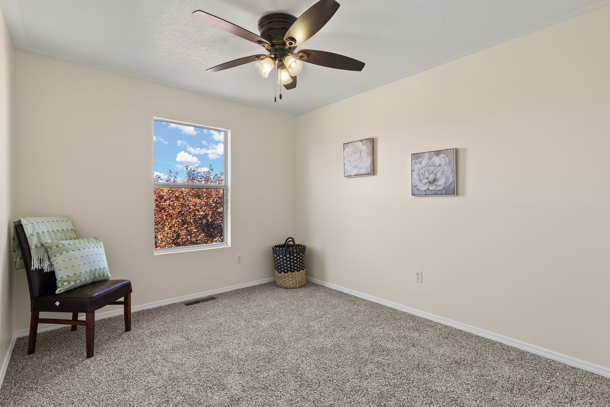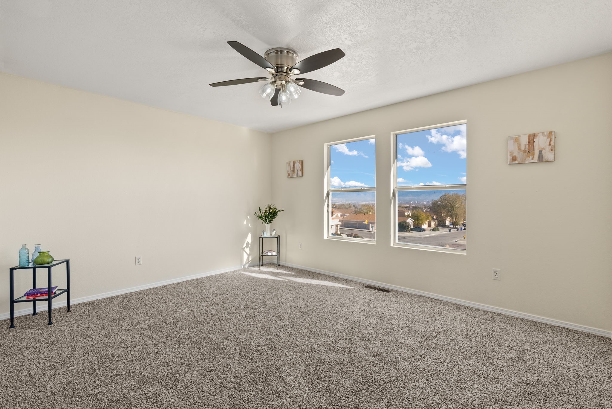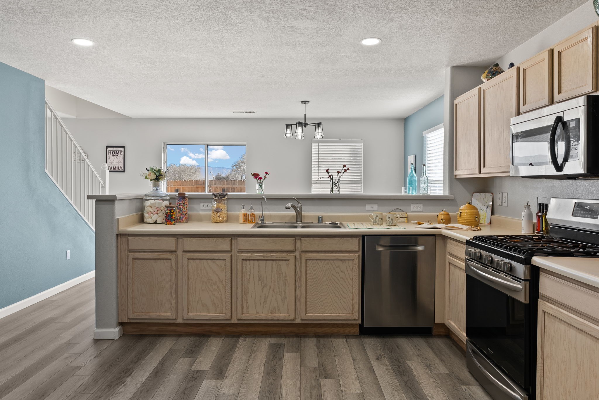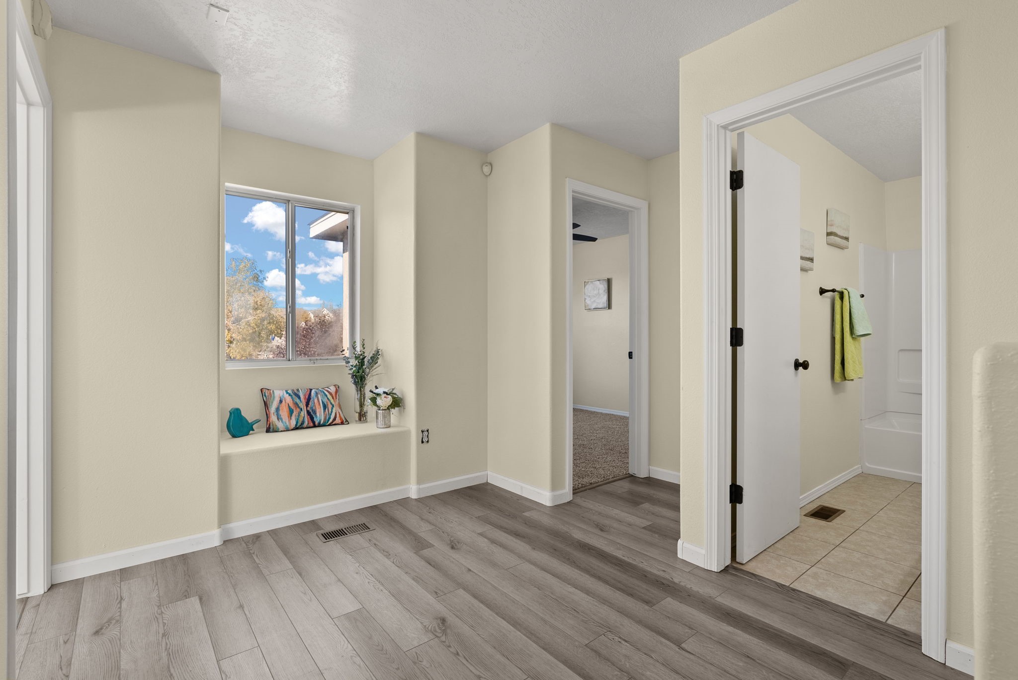 Discover this stunning move-in-ready 2-story home in Albuquerque's desirable area, perfect for entertaining or large family living. This 4-bedroom, 3-bathroom, 2,125 sq. ft. home features an open floor plan that seamlessly combines functionality and style. Enjoy newer flooring, upgraded lighting, and refrigerated air installed in 2022. The kitchen shines with all newer appliances, complemented by stylish new blinds throughout. Ceiling fans in all bedrooms and a unique "Harry Potter Storage" space add charm and comfort. Relax in the fully fenced corner lot, offering plenty of privacy. Take in the scenic views from this well-situated property. The insulated crawl space enhances energy efficiency, while proximity to the interstate ensures effortless commuting. Nearby restaurants and conveniences complete this incredible offering.