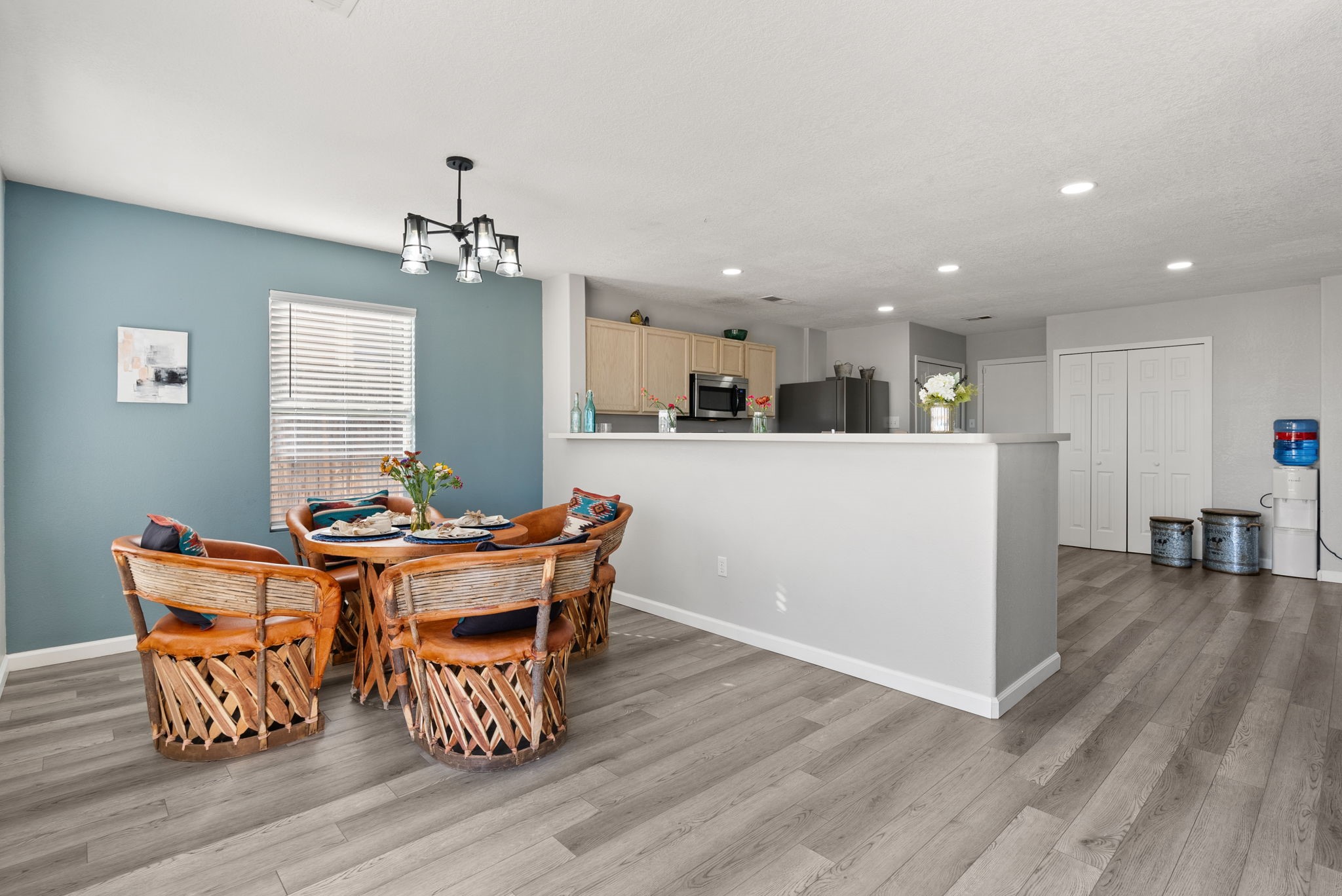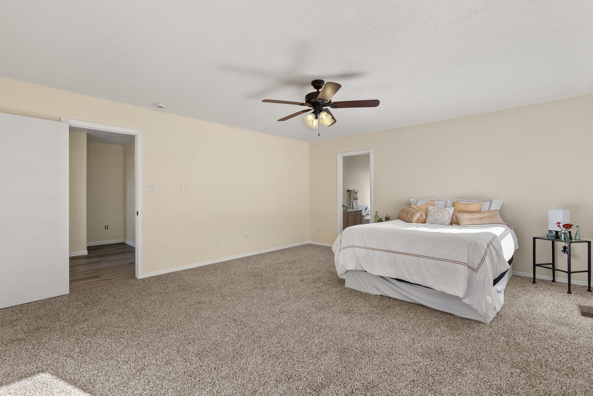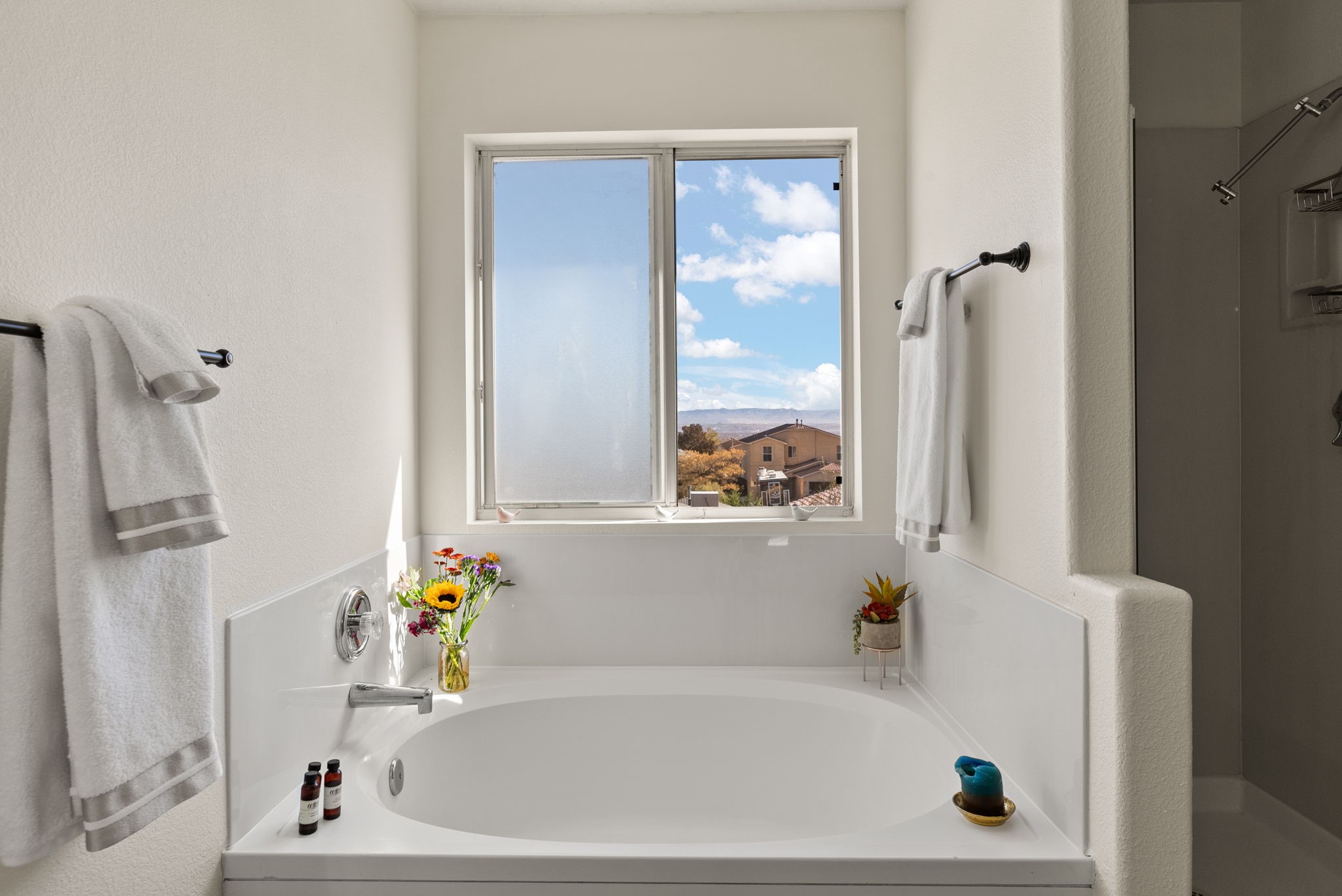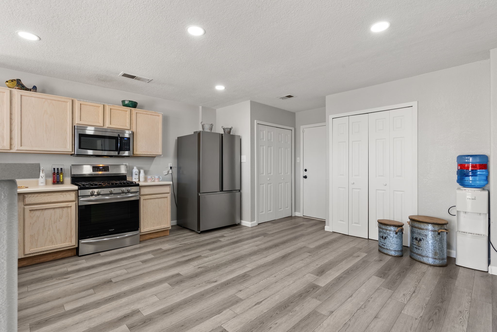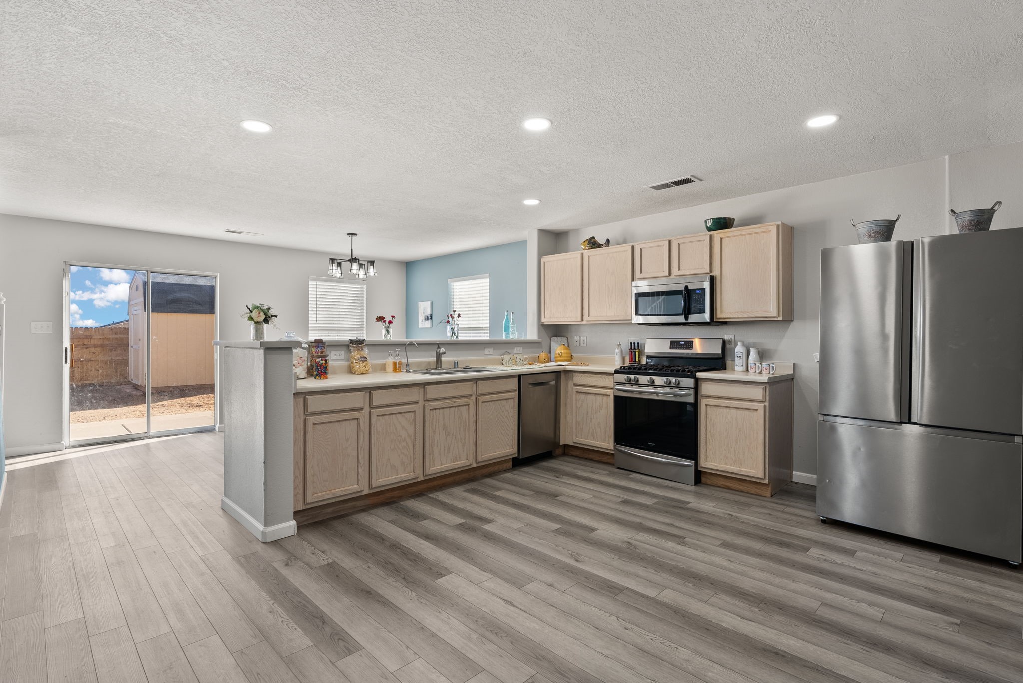 Discover this stunning move-in-ready 2-story home in Albuquerque's desirable area, perfect for entertaining or large family living. This 4-bedroom, 3-bathroom, 2,125 sq. ft. home features an open floor plan that seamlessly combines functionality and style. Enjoy newer flooring, upgraded lighting, and refrigerated air installed in 2022. The kitchen shines with all newer appliances, complemented by stylish new blinds throughout. Ceiling fans in all bedrooms and a unique "Harry Potter Storage" space add charm and comfort. Relax in the fully fenced corner lot, offering plenty of privacy. Take in the scenic views from this well-situated property. The insulated crawl space enhances energy efficiency, while proximity to the interstate ensures effortless commuting. Nearby restaurants and conveniences complete this incredible offering.