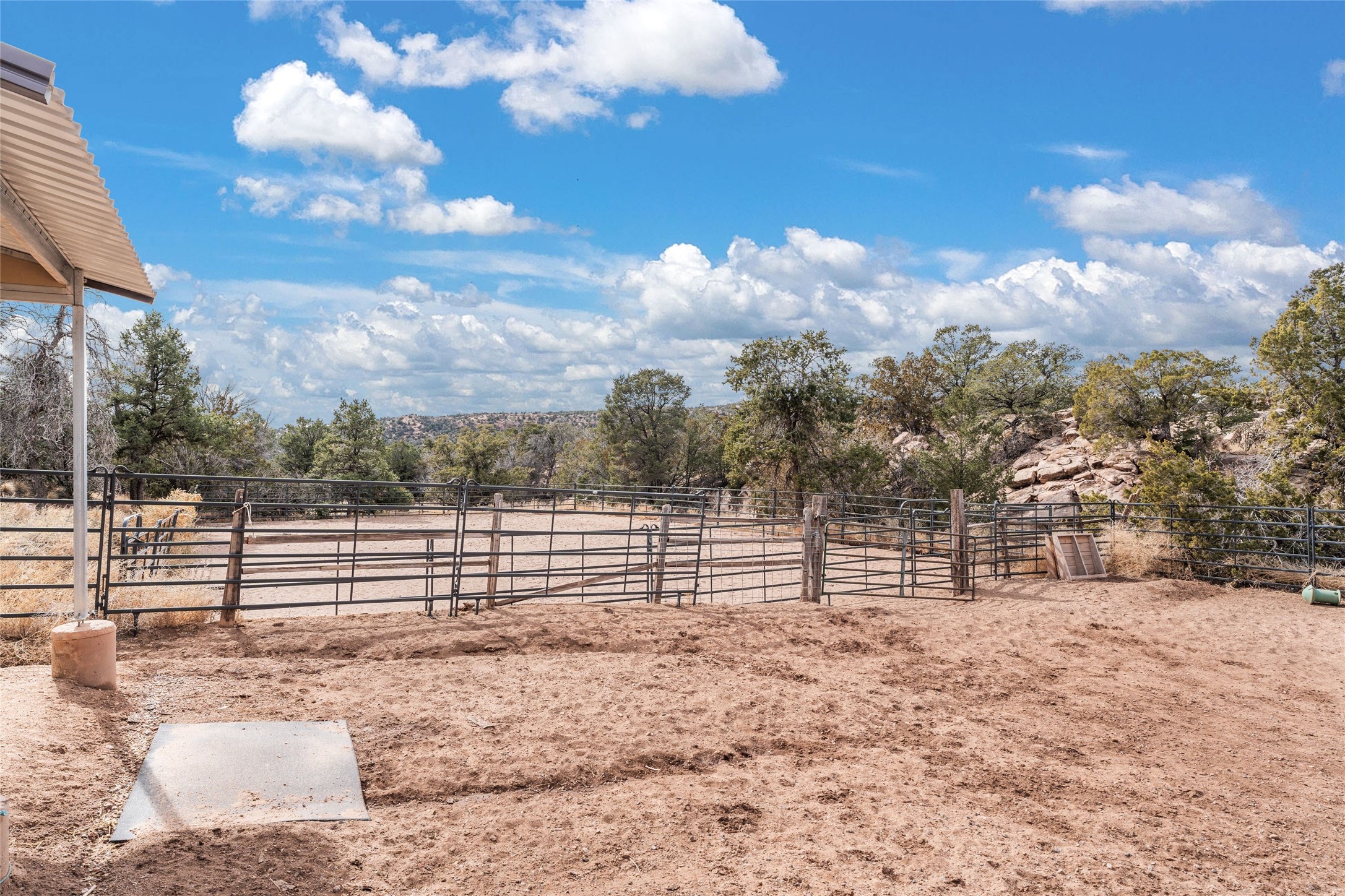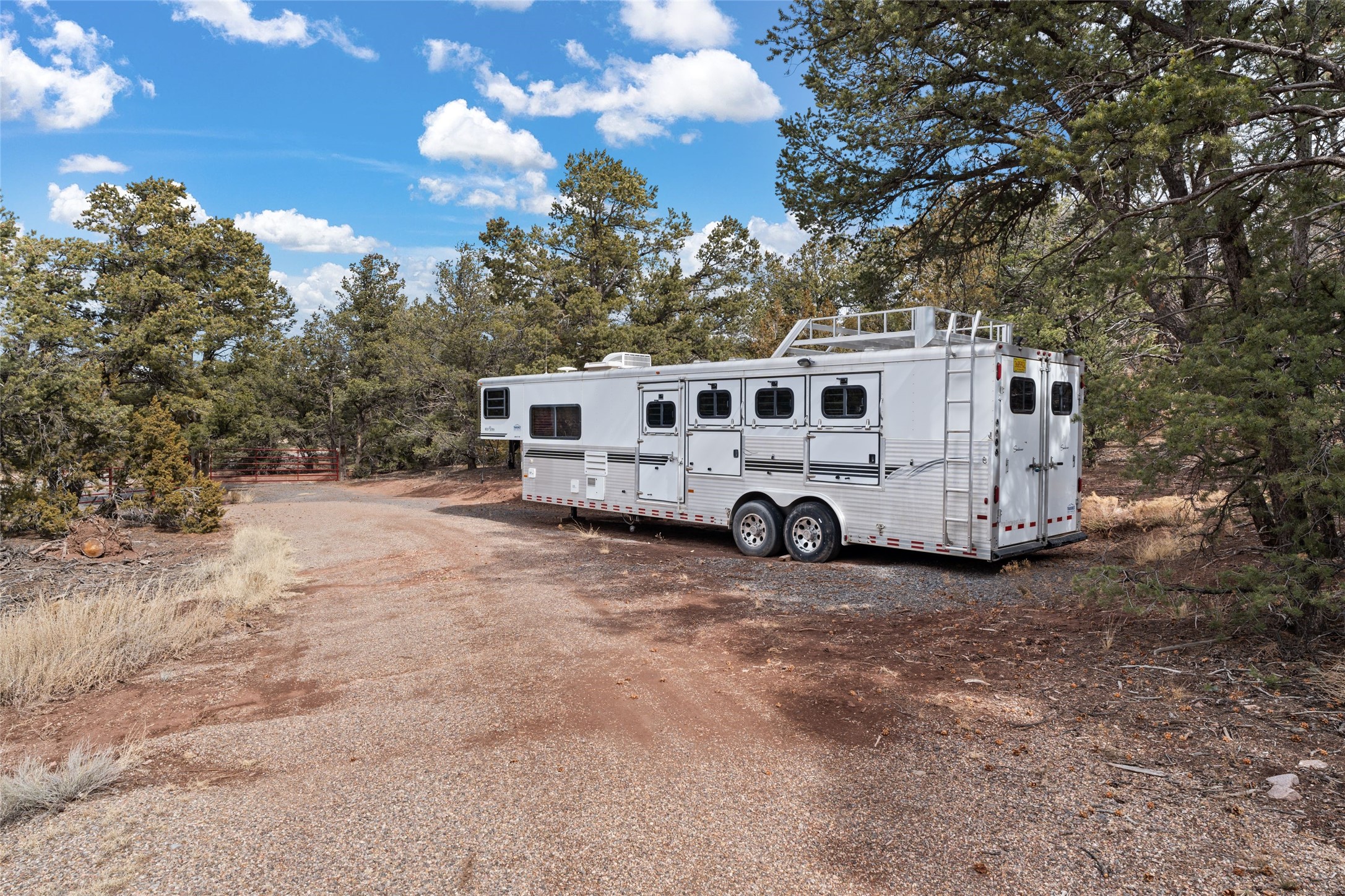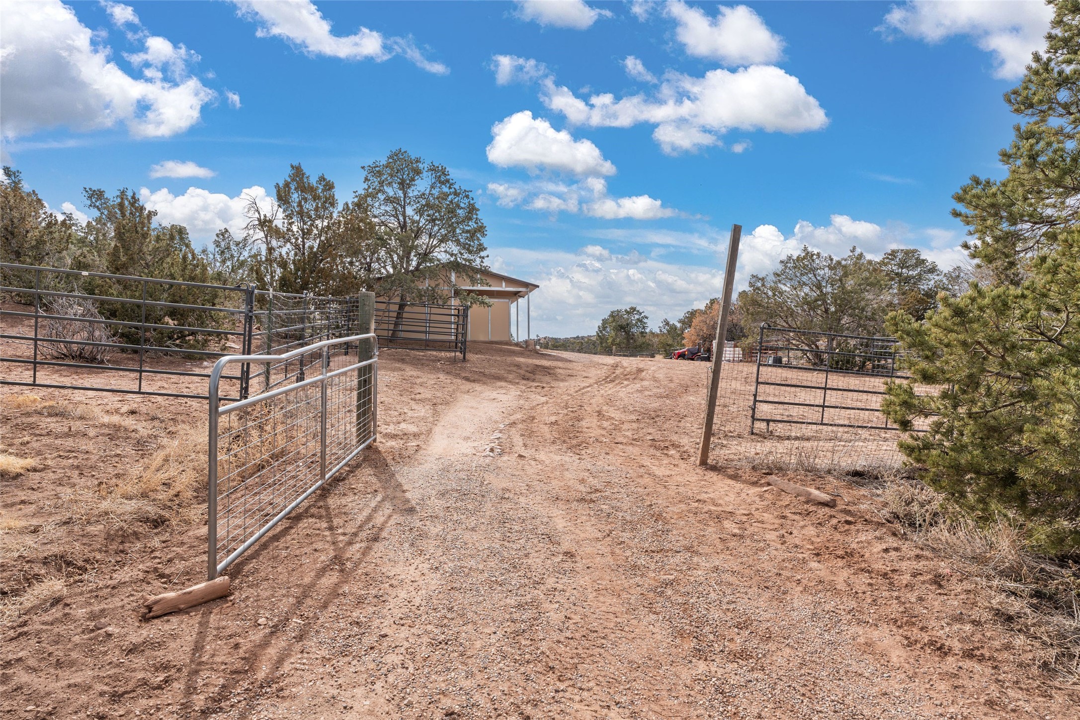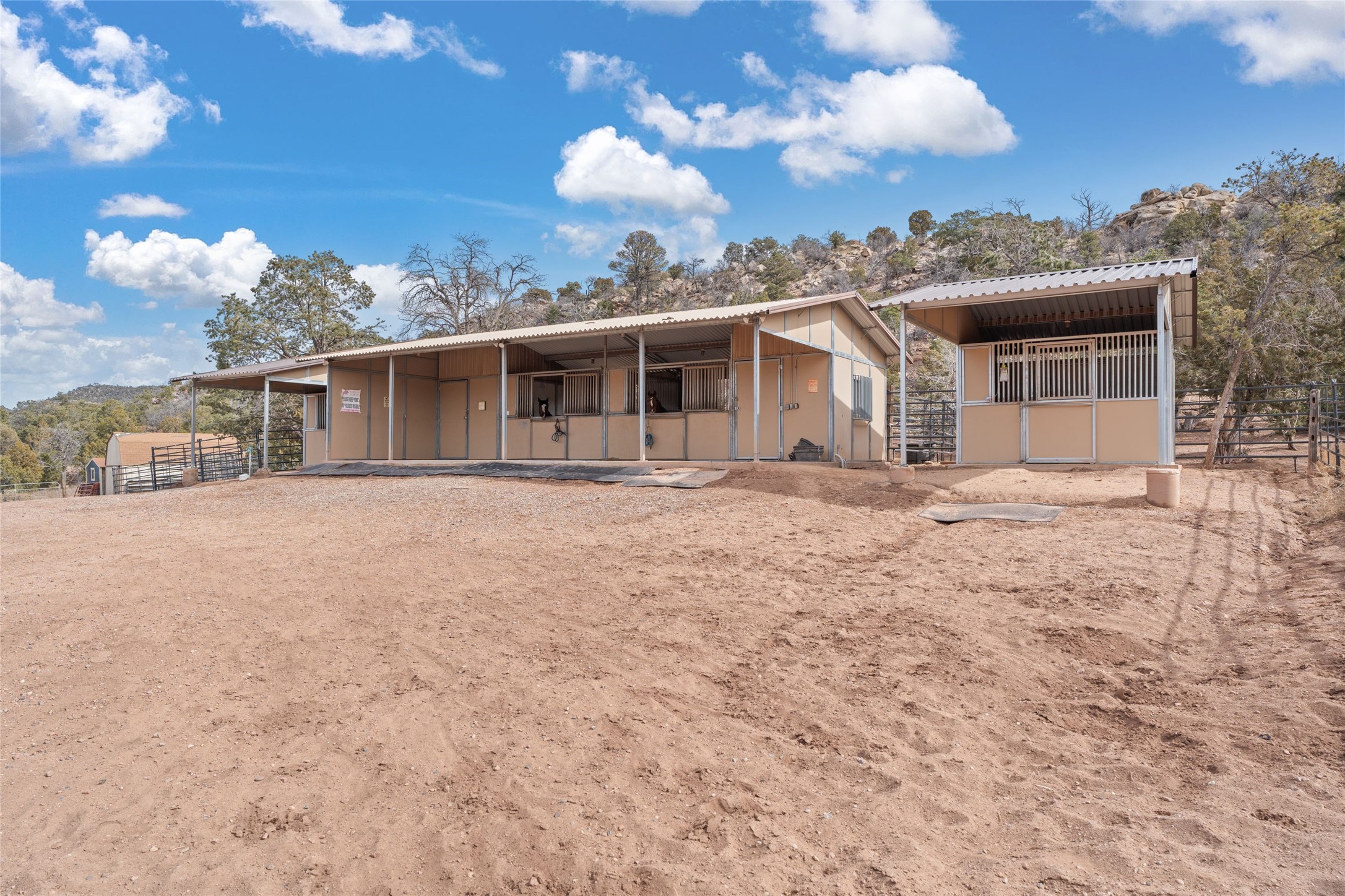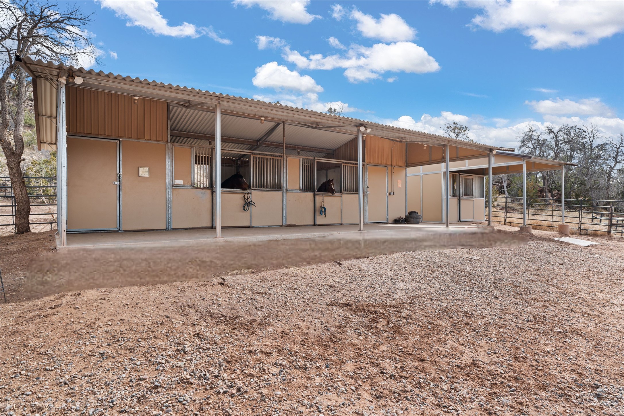 Beautiful, 15 Acre Horse Property nestled within a cozy valley surrounded by trees and boulder outcroppings, with main house & detached guest casita situated close to riding trails and just a 20 minute drive to Santa Fe. "Casa Caballos del Canoncito" offers Horse Lovers a spacious single level main house with traditional Santa Fe Style features and finishes: Vigas and Beams, Brick and Wood flooring throughout, Talavera tile accents, three bedrooms, two baths, spacious living areas, and an open concept 'great room' with Kitchen and Dining for family and friends to gather. Warm colored plaster walls, high ceilings, three fireplaces, skylights, and multiple living areas offer flexible entertaining and relaxation spaces and are highlights of the home. The detached Guest Casita has its own entrance, kitchen, full sized living area with fireplace, and a full bath. Horse Facilities include: 4 stall barn (up to 6 horses are allowed), turn out, arena with split pipe fencing, two storage sheds for tack, hay. There is a private and separate driveway to access the stables and park a large trailer if needed. Private well, forced air heat in Main House, electric baseboard in Guest House. Nearby access to rural riding trails from the property.