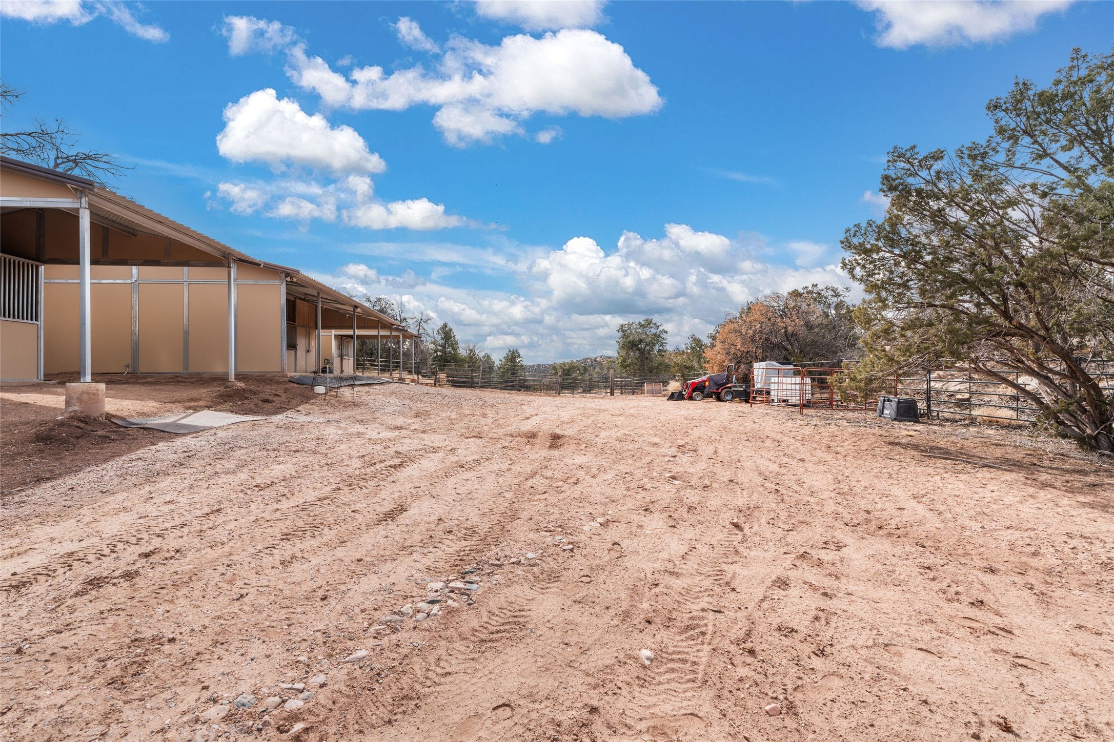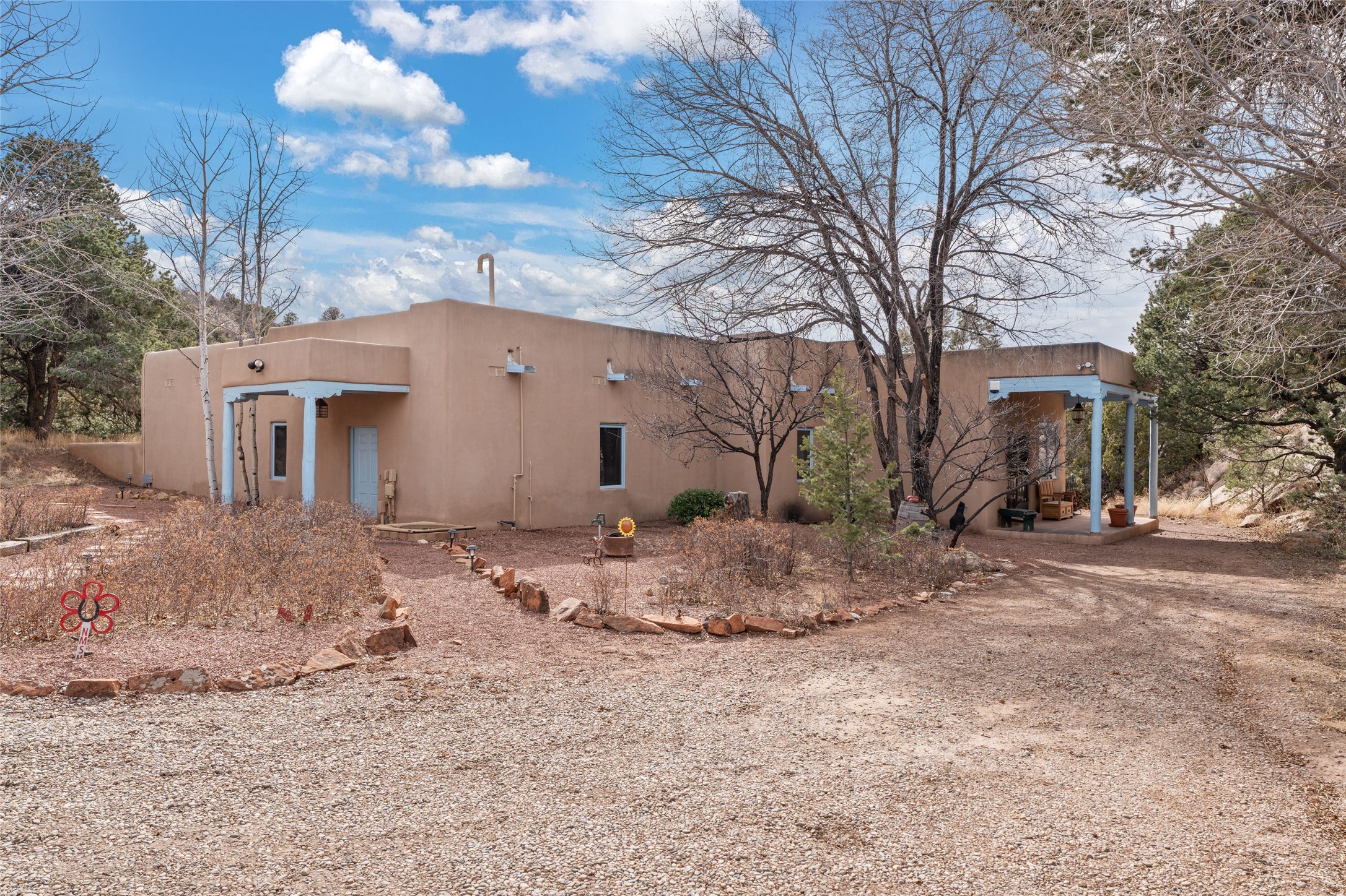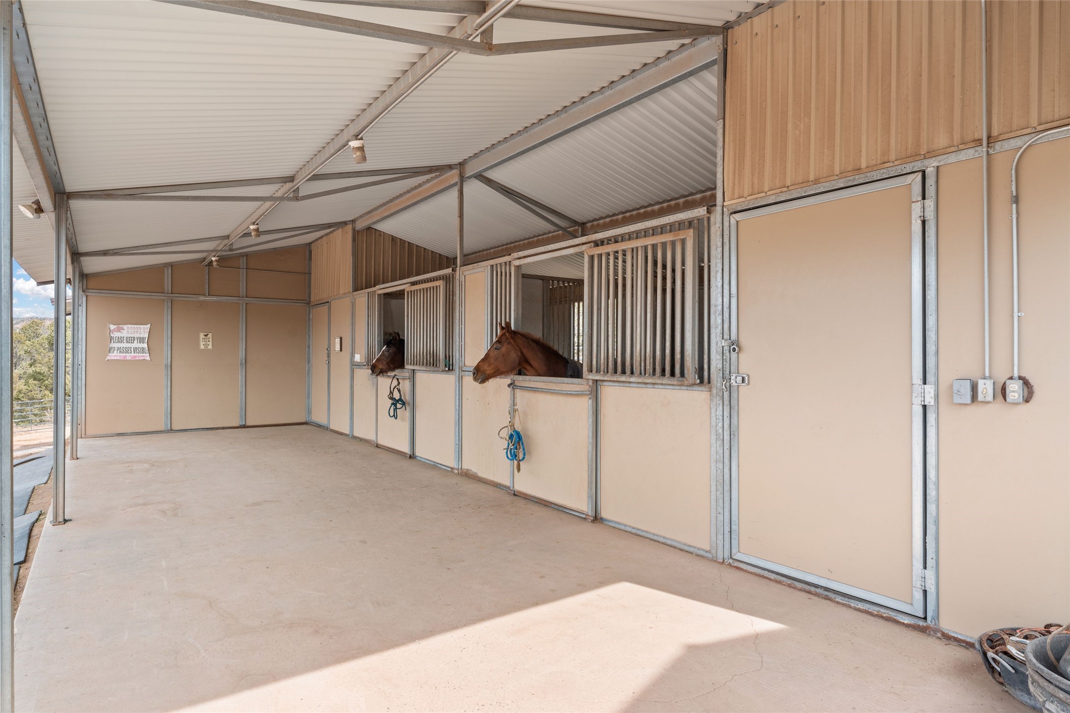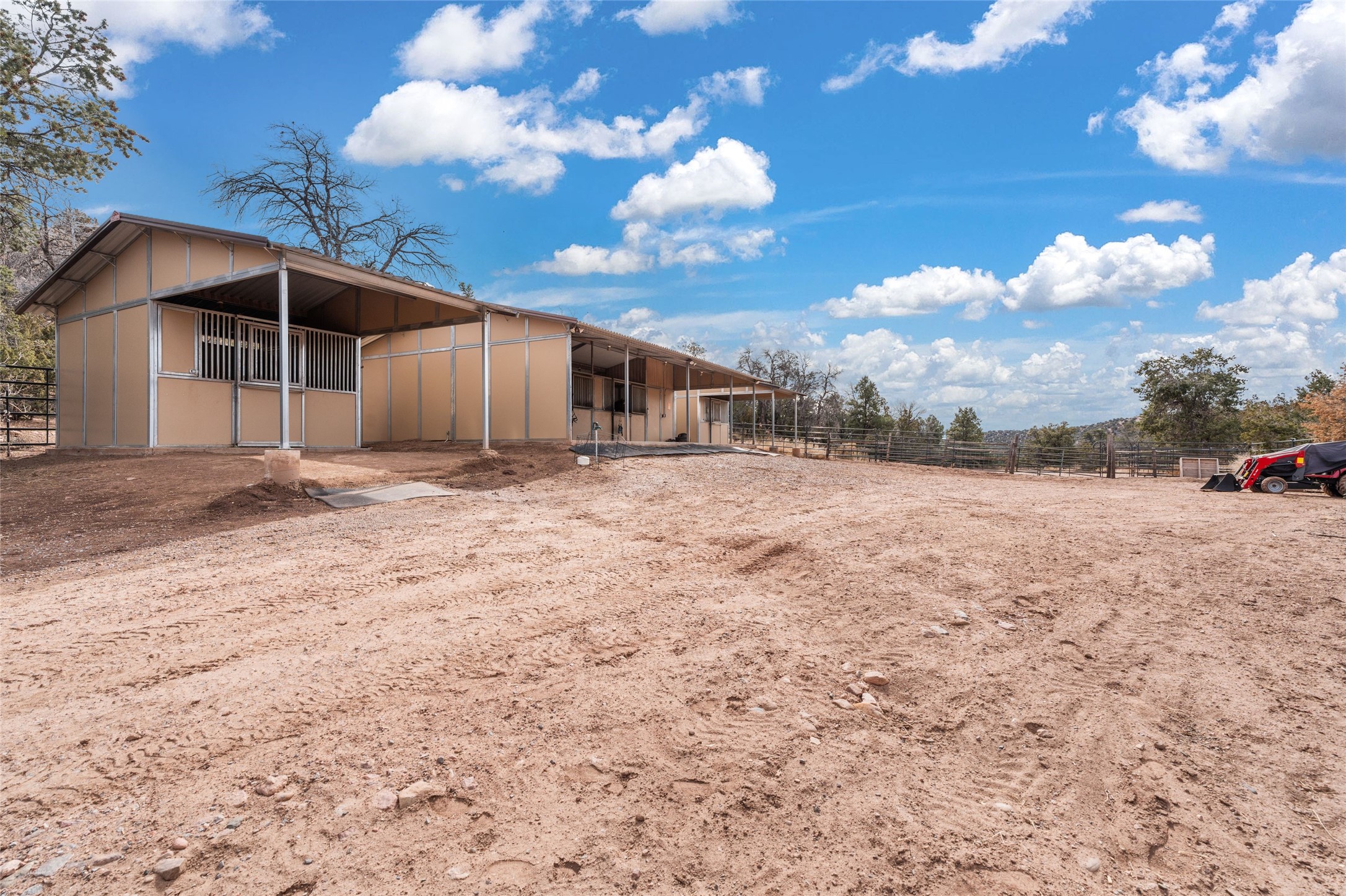 Beautiful, 15 Acre Horse Property nestled within a cozy valley surrounded by trees and boulder outcroppings, with main house & detached guest casita situated close to riding trails and just a 20 minute drive to Santa Fe. "Casa Caballos del Canoncito" offers Horse Lovers a spacious single level main house with traditional Santa Fe Style features and finishes: Vigas and Beams, Brick and Wood flooring throughout, Talavera tile accents, three bedrooms, two baths, spacious living areas, and an open concept 'great room' with Kitchen and Dining for family and friends to gather. Warm colored plaster walls, high ceilings, three fireplaces, skylights, and multiple living areas offer flexible entertaining and relaxation spaces and are highlights of the home. The detached Guest Casita has its own entrance, kitchen, full sized living area with fireplace, and a full bath. Horse Facilities include: 4 stall barn (up to 6 horses are allowed), turn out, arena with split pipe fencing, two storage sheds for tack, hay. There is a private and separate driveway to access the stables and park a large trailer if needed. Private well, forced air heat in Main House, electric baseboard in Guest House. Nearby access to rural riding trails from the property.