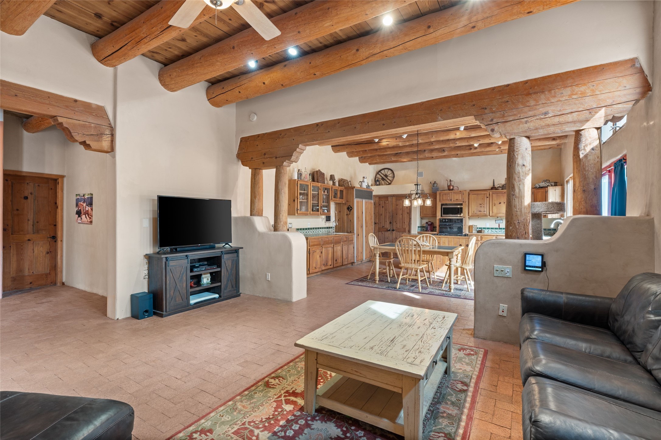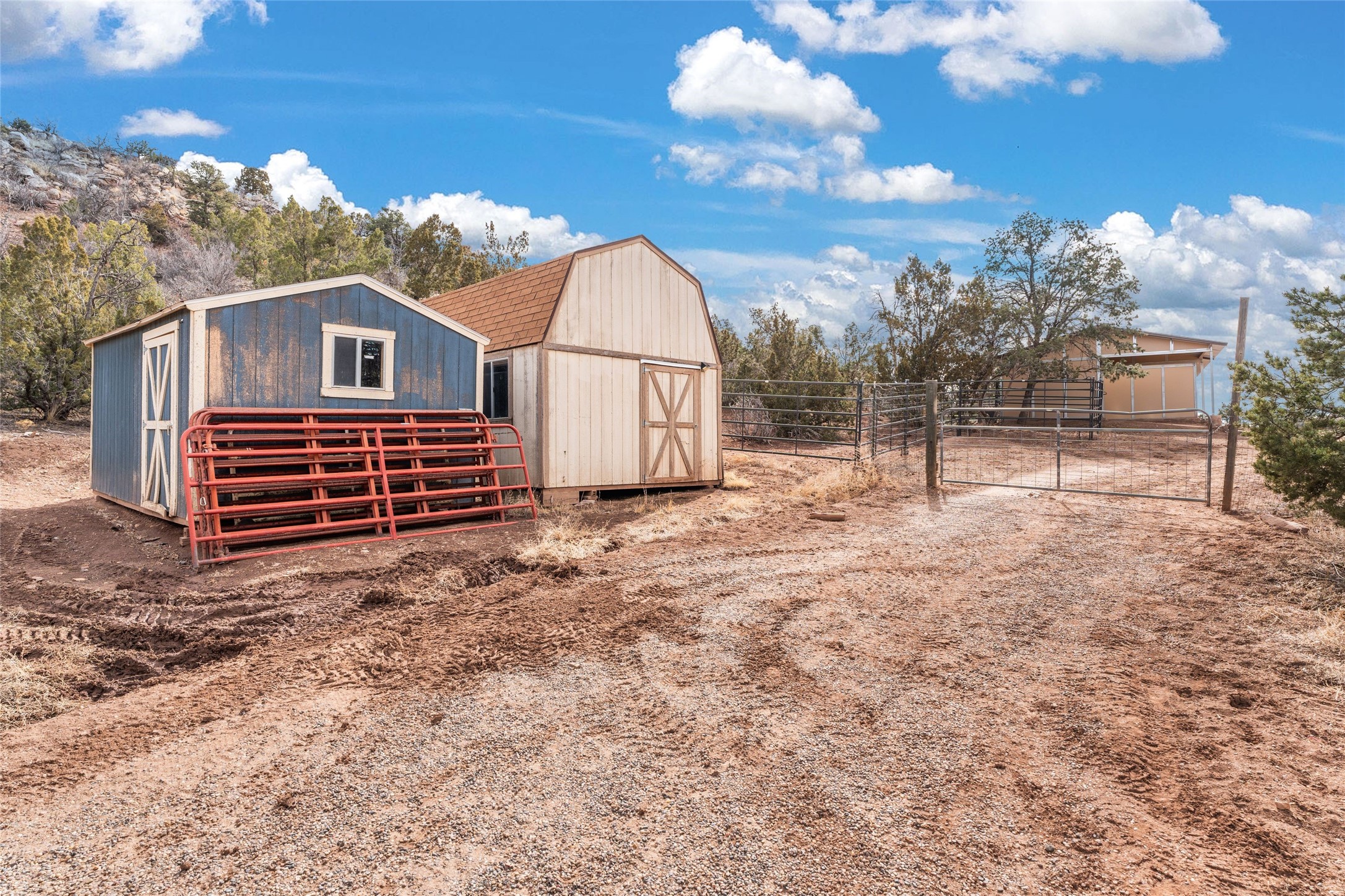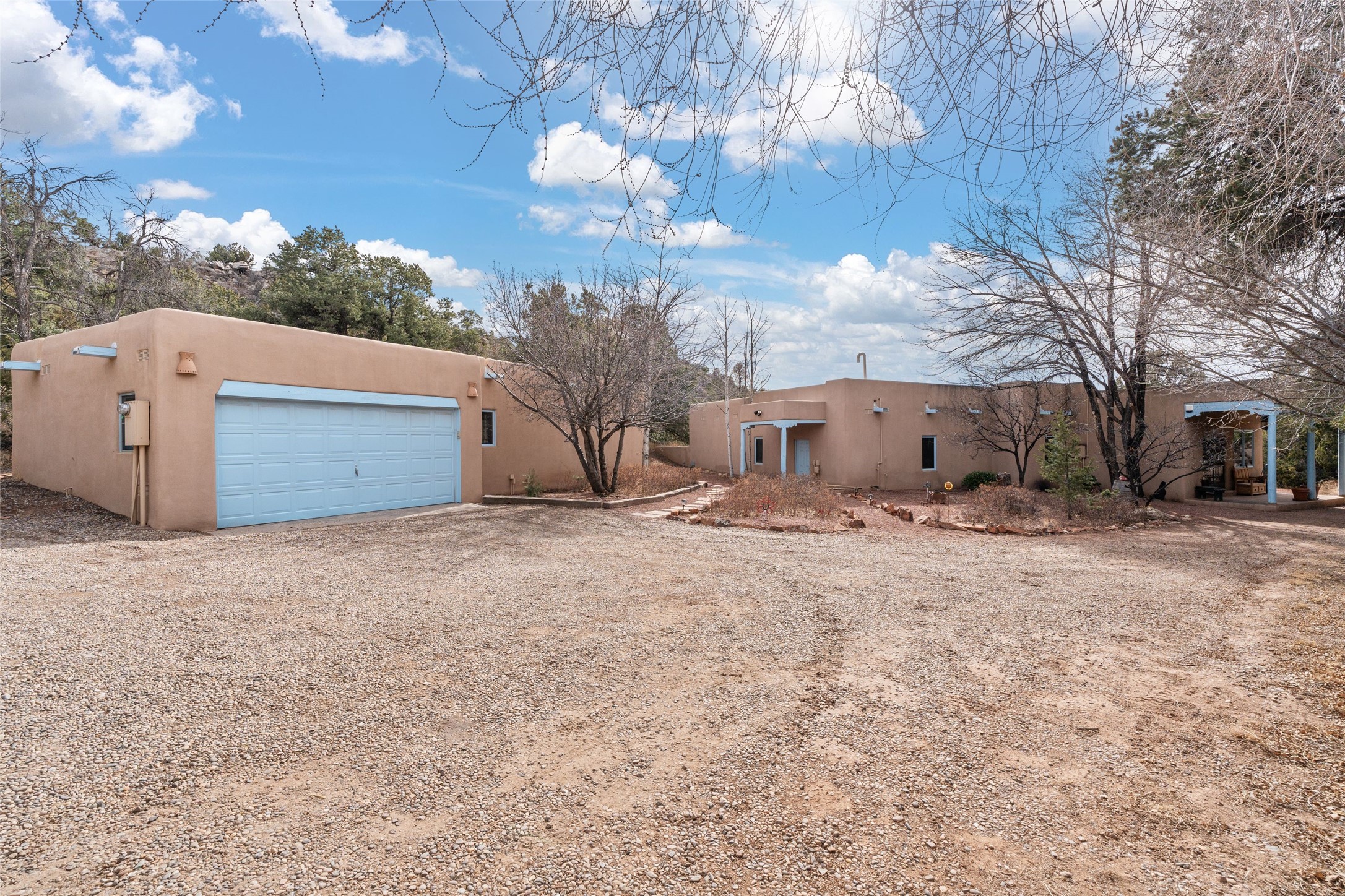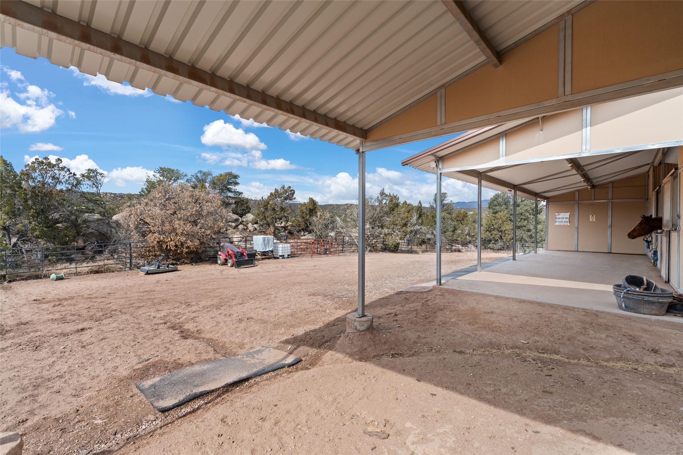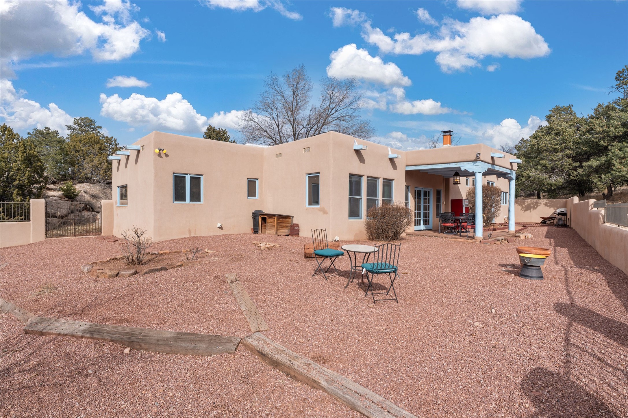 Beautiful, 15 Acre Horse Property nestled within a cozy valley surrounded by trees and boulder outcroppings, with main house & detached guest casita situated close to riding trails and just a 20 minute drive to Santa Fe. "Casa Caballos del Canoncito" offers Horse Lovers a spacious single level main house with traditional Santa Fe Style features and finishes: Vigas and Beams, Brick and Wood flooring throughout, Talavera tile accents, three bedrooms, two baths, spacious living areas, and an open concept 'great room' with Kitchen and Dining for family and friends to gather. Warm colored plaster walls, high ceilings, three fireplaces, skylights, and multiple living areas offer flexible entertaining and relaxation spaces and are highlights of the home. The detached Guest Casita has its own entrance, kitchen, full sized living area with fireplace, and a full bath. Horse Facilities include: 4 stall barn (up to 6 horses are allowed), turn out, arena with split pipe fencing, two storage sheds for tack, hay. There is a private and separate driveway to access the stables and park a large trailer if needed. Private well, forced air heat in Main House, electric baseboard in Guest House. Nearby access to rural riding trails from the property.