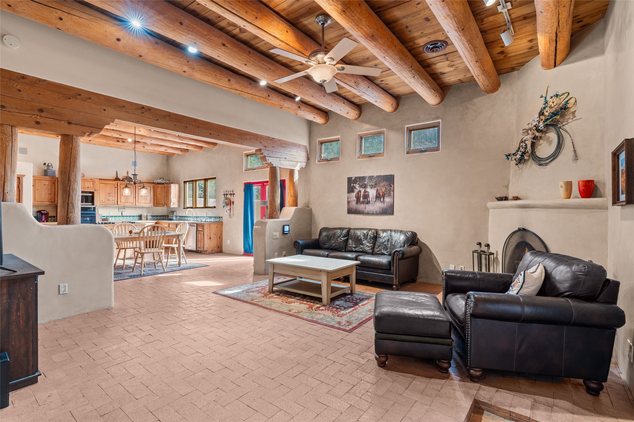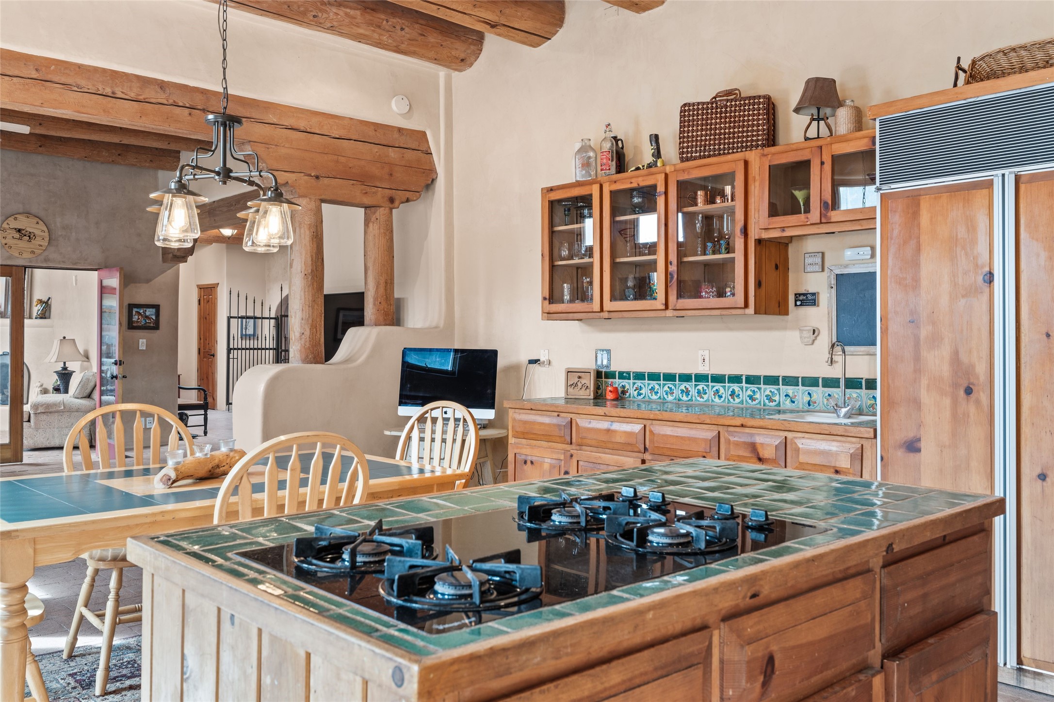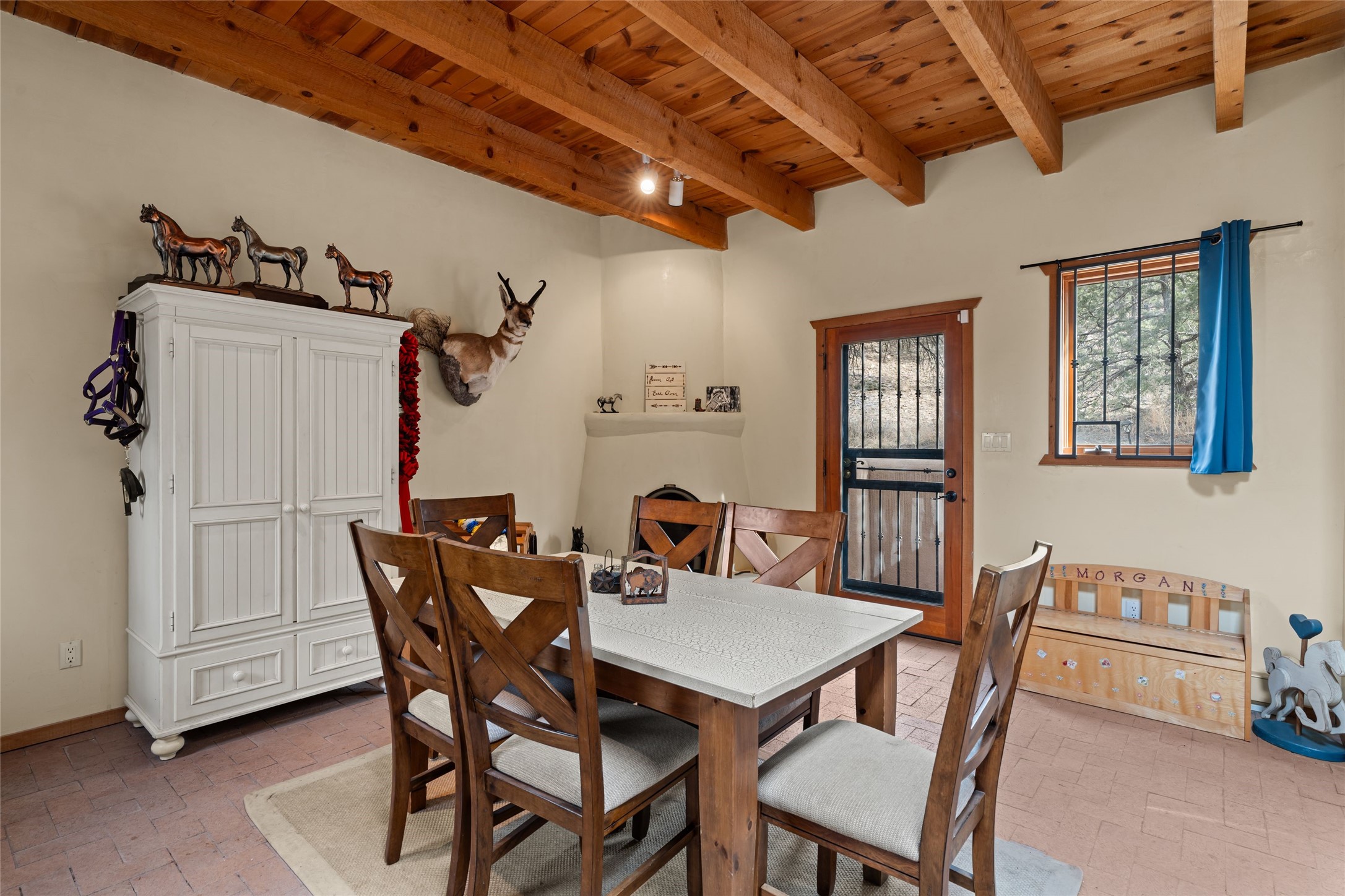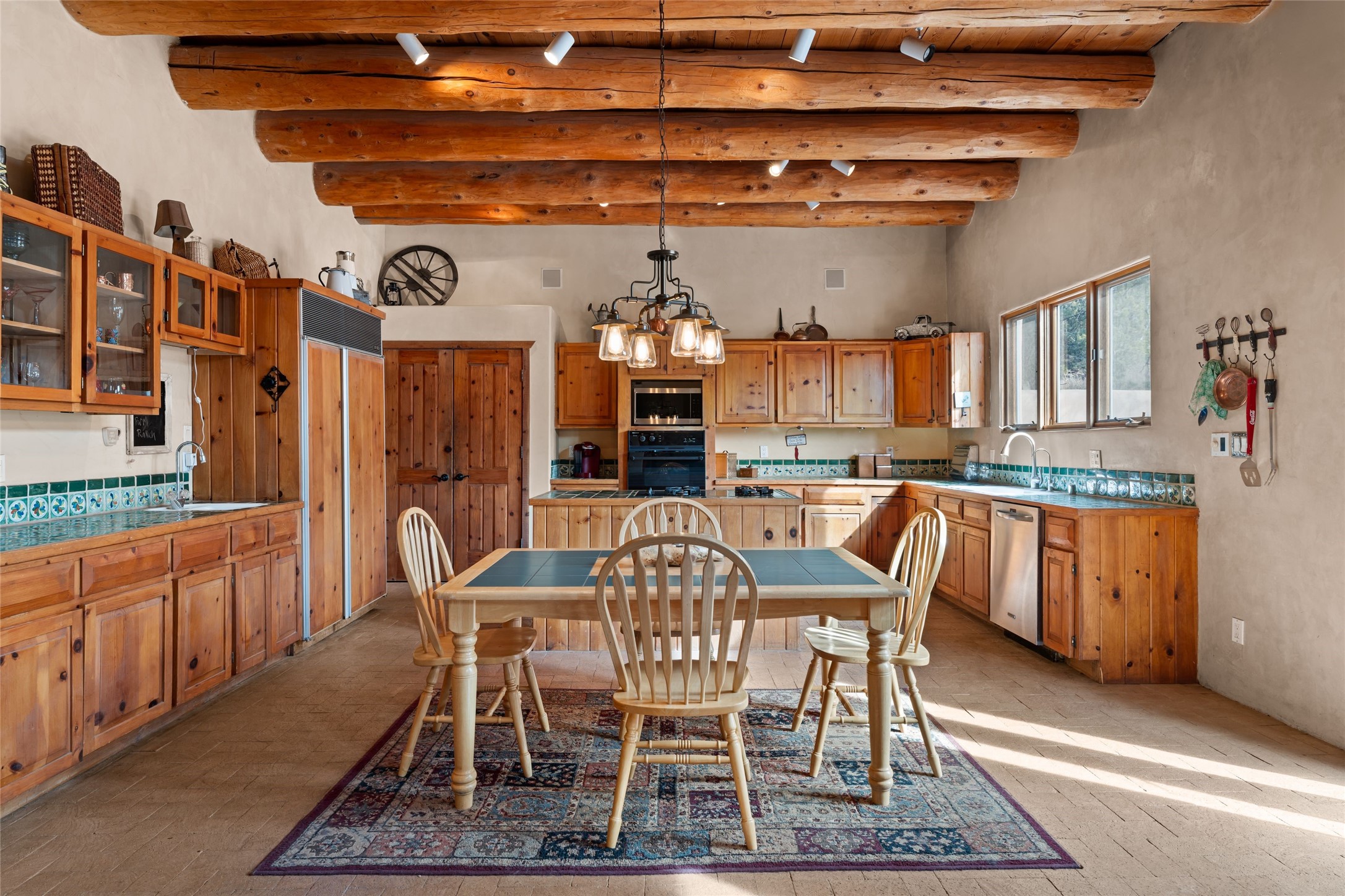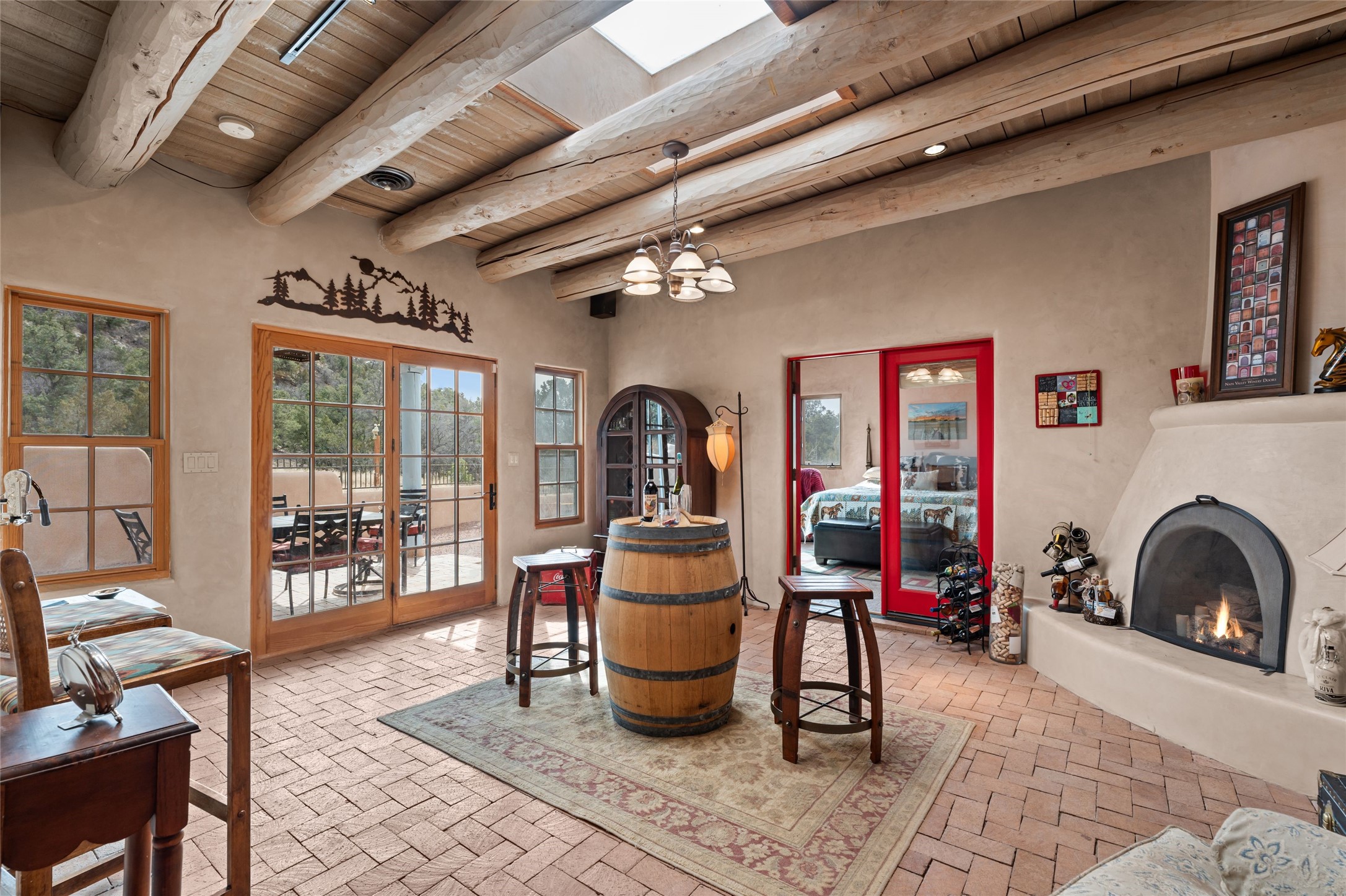 Beautiful, 15 Acre Horse Property nestled within a cozy valley surrounded by trees and boulder outcroppings, with main house & detached guest casita situated close to riding trails and just a 20 minute drive to Santa Fe. "Casa Caballos del Canoncito" offers Horse Lovers a spacious single level main house with traditional Santa Fe Style features and finishes: Vigas and Beams, Brick and Wood flooring throughout, Talavera tile accents, three bedrooms, two baths, spacious living areas, and an open concept 'great room' with Kitchen and Dining for family and friends to gather. Warm colored plaster walls, high ceilings, three fireplaces, skylights, and multiple living areas offer flexible entertaining and relaxation spaces and are highlights of the home. The detached Guest Casita has its own entrance, kitchen, full sized living area with fireplace, and a full bath. Horse Facilities include: 4 stall barn (up to 6 horses are allowed), turn out, arena with split pipe fencing, two storage sheds for tack, hay. There is a private and separate driveway to access the stables and park a large trailer if needed. Private well, forced air heat in Main House, electric baseboard in Guest House. Nearby access to rural riding trails from the property.