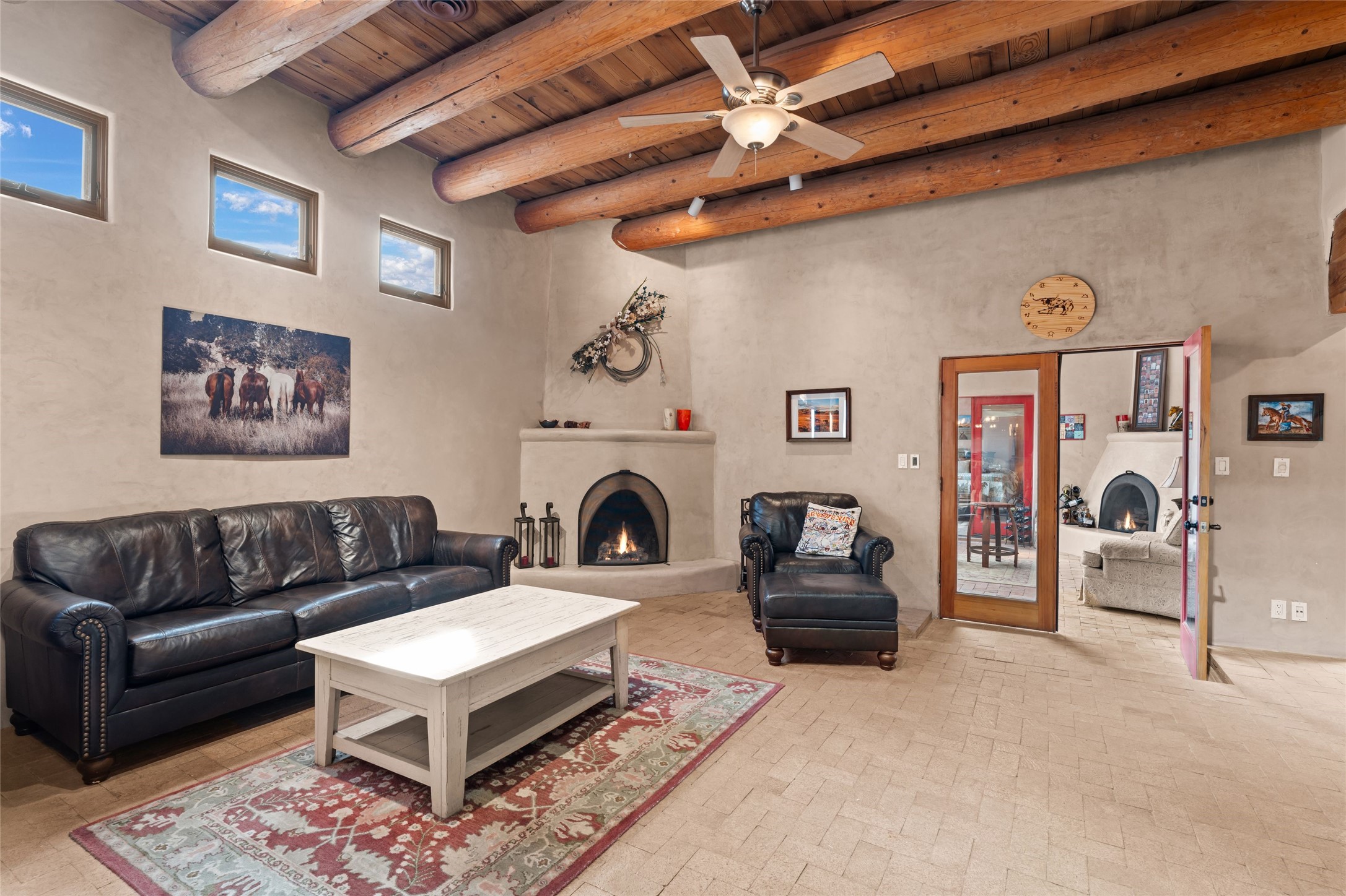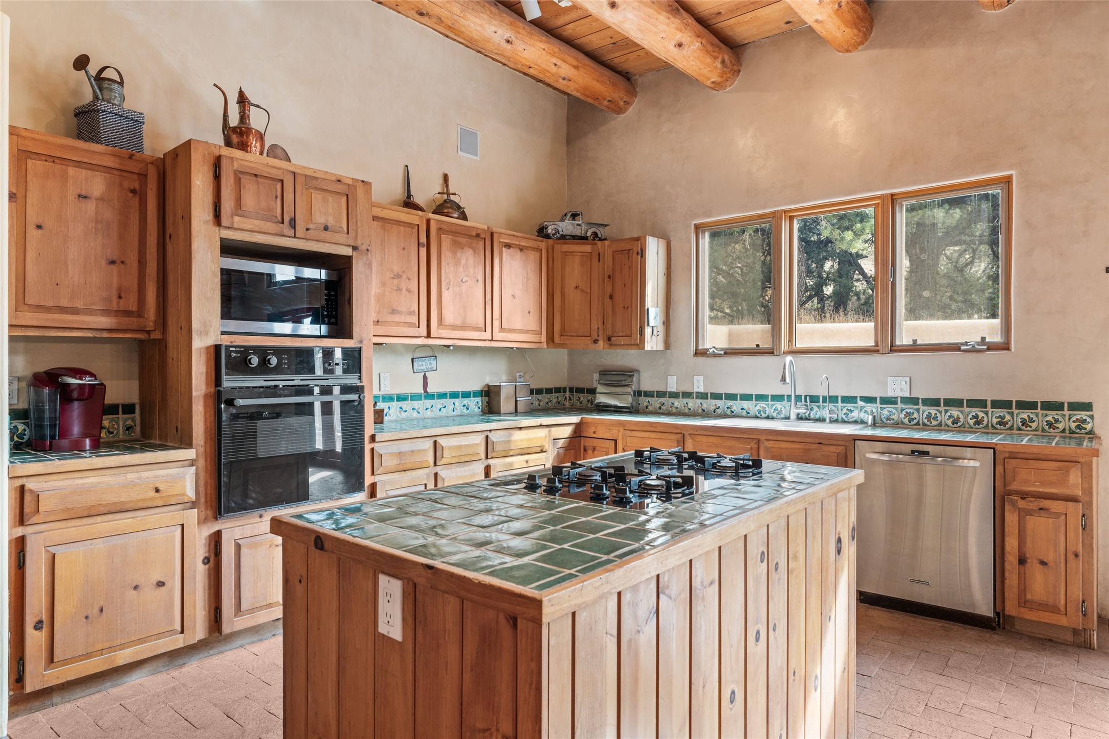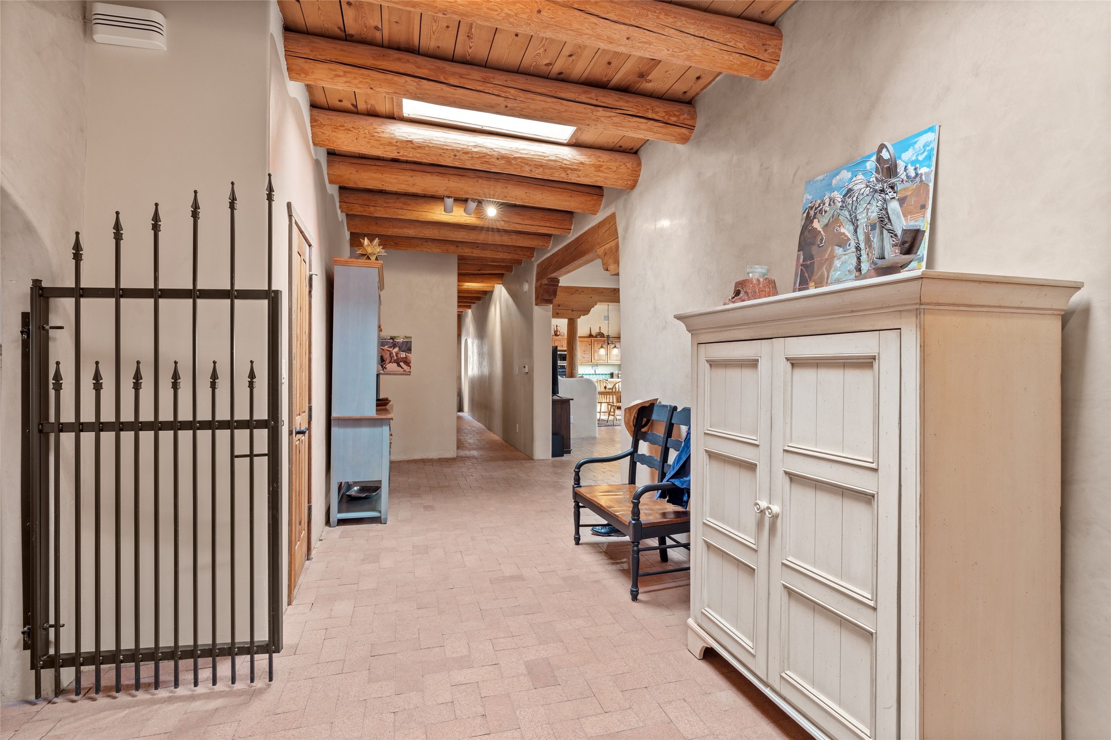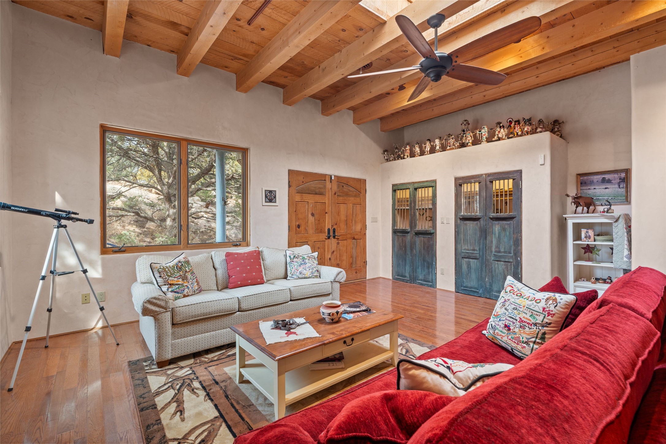 Beautiful, 15 Acre Horse Property nestled within a cozy valley surrounded by trees and boulder outcroppings, with main house & detached guest casita situated close to riding trails and just a 20 minute drive to Santa Fe. "Casa Caballos del Canoncito" offers Horse Lovers a spacious single level main house with traditional Santa Fe Style features and finishes: Vigas and Beams, Brick and Wood flooring throughout, Talavera tile accents, three bedrooms, two baths, spacious living areas, and an open concept 'great room' with Kitchen and Dining for family and friends to gather. Warm colored plaster walls, high ceilings, three fireplaces, skylights, and multiple living areas offer flexible entertaining and relaxation spaces and are highlights of the home. The detached Guest Casita has its own entrance, kitchen, full sized living area with fireplace, and a full bath. Horse Facilities include: 4 stall barn (up to 6 horses are allowed), turn out, arena with split pipe fencing, two storage sheds for tack, hay. There is a private and separate driveway to access the stables and park a large trailer if needed. Private well, forced air heat in Main House, electric baseboard in Guest House. Nearby access to rural riding trails from the property.