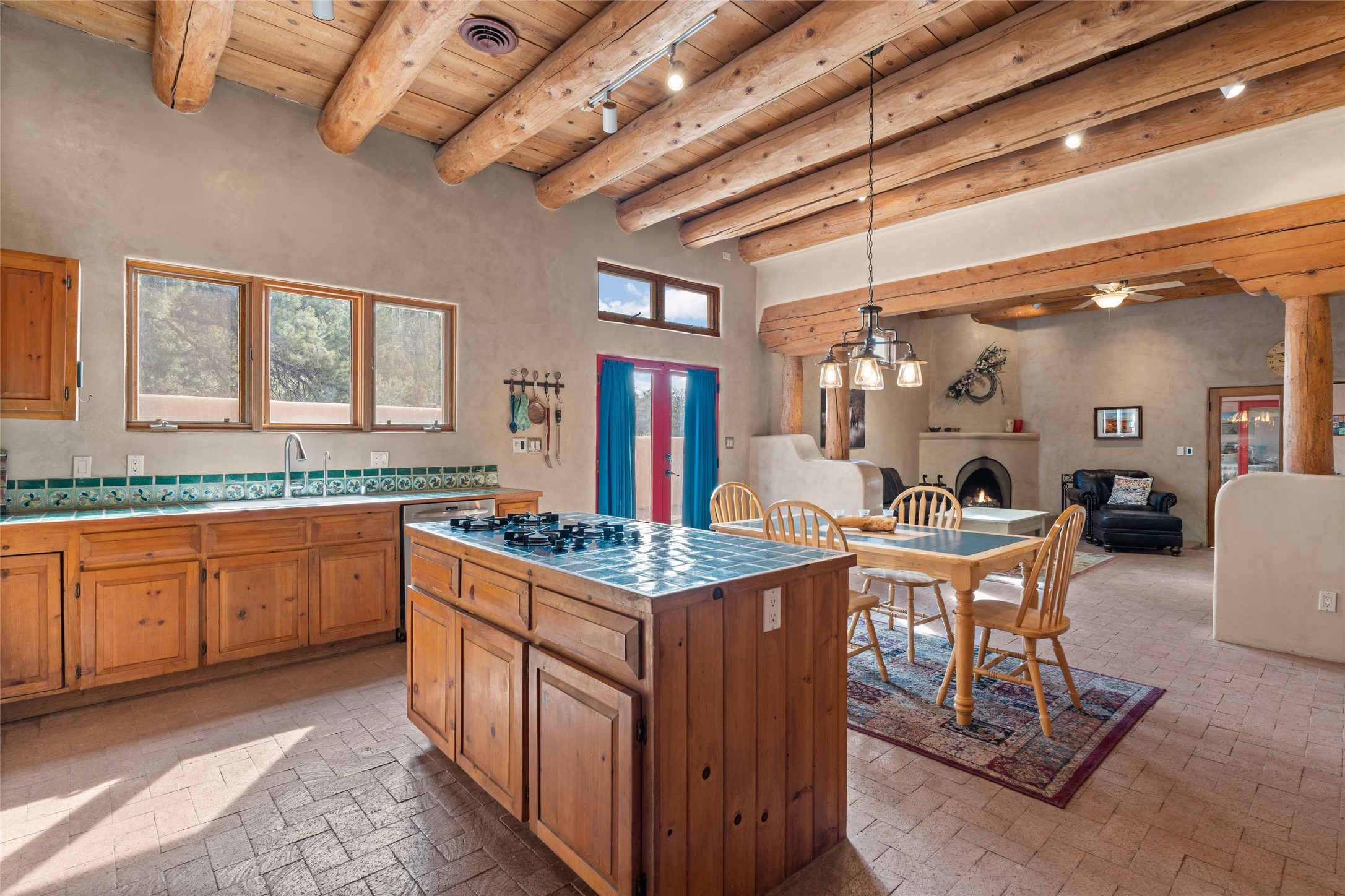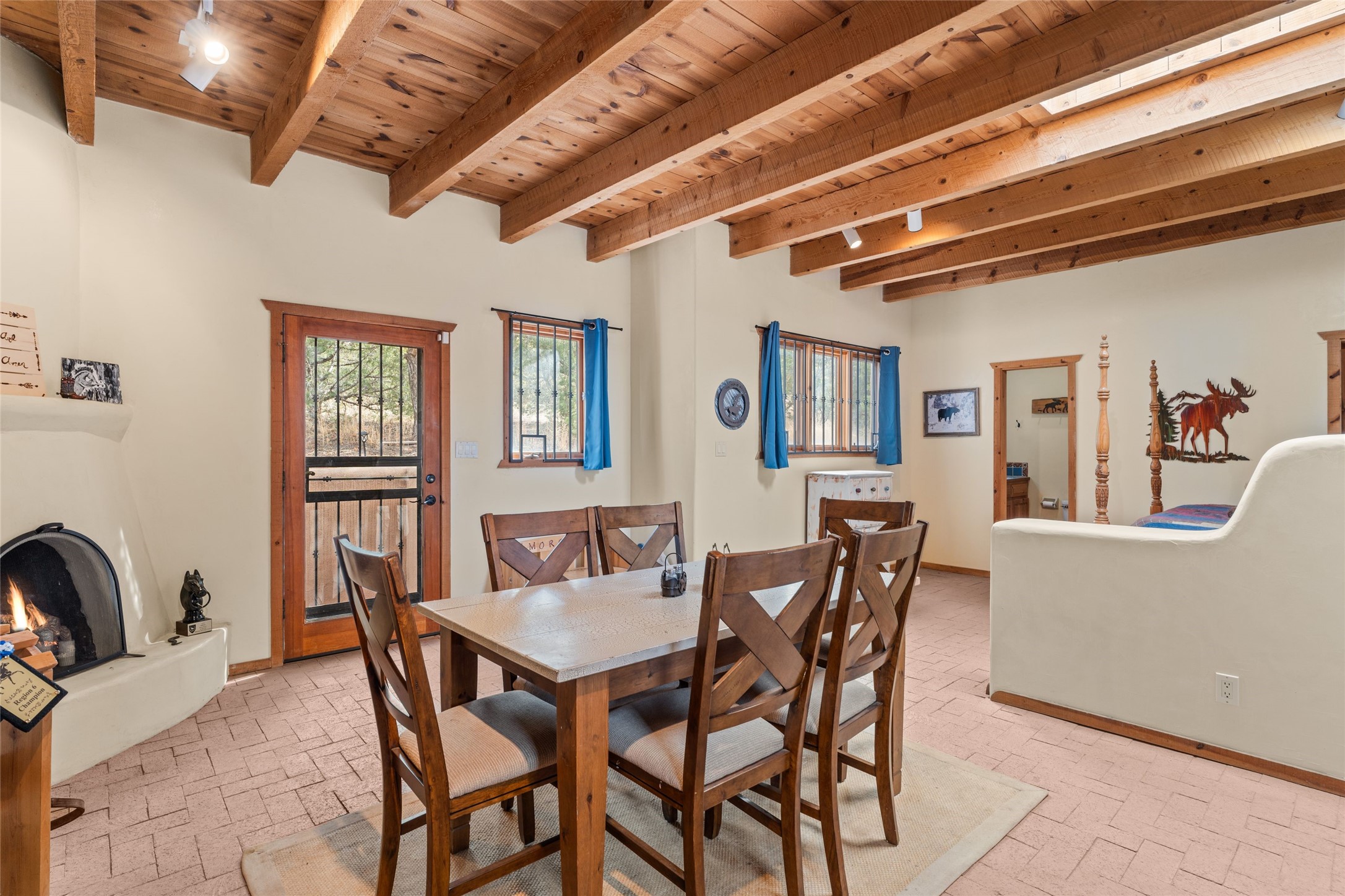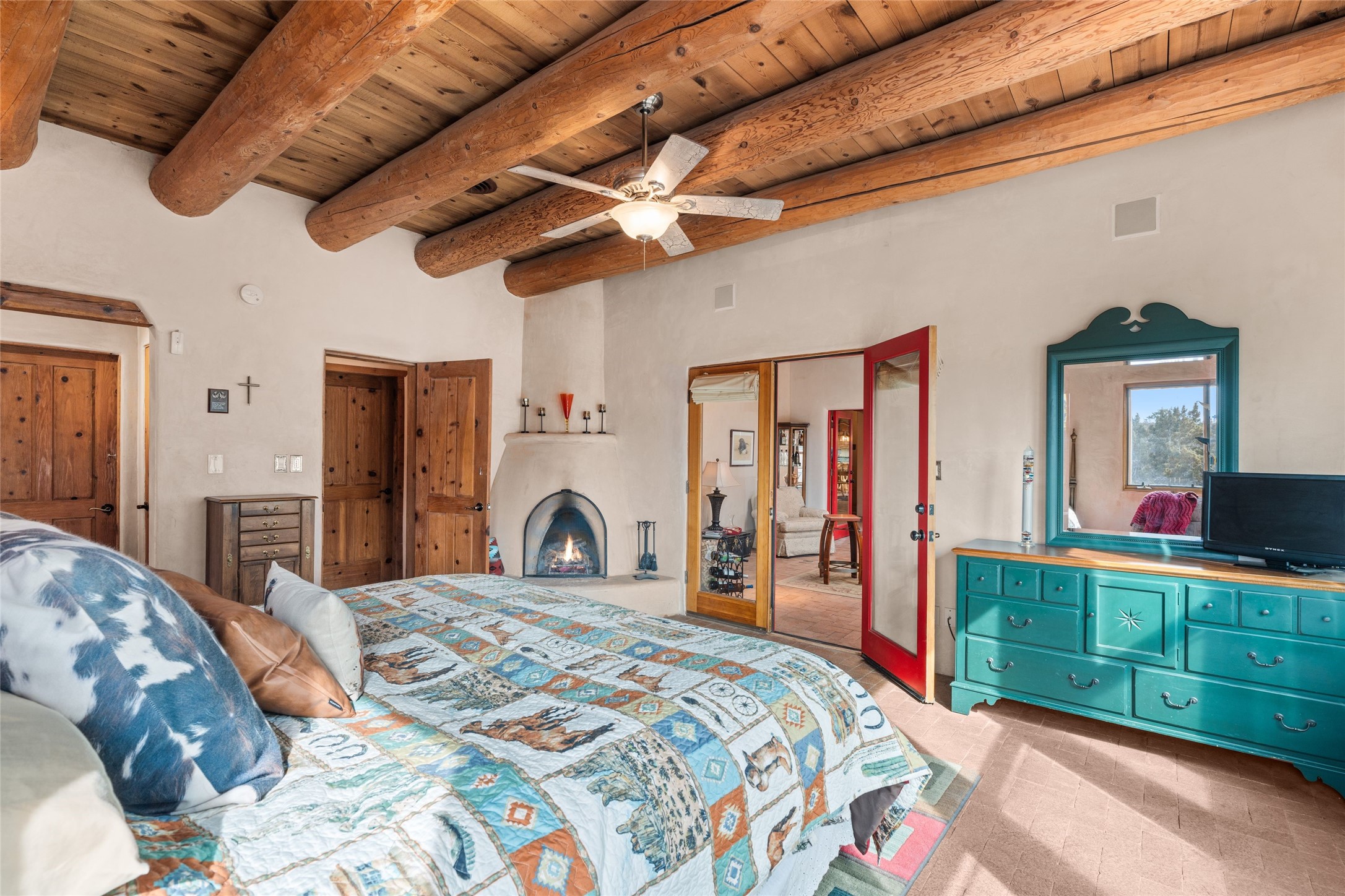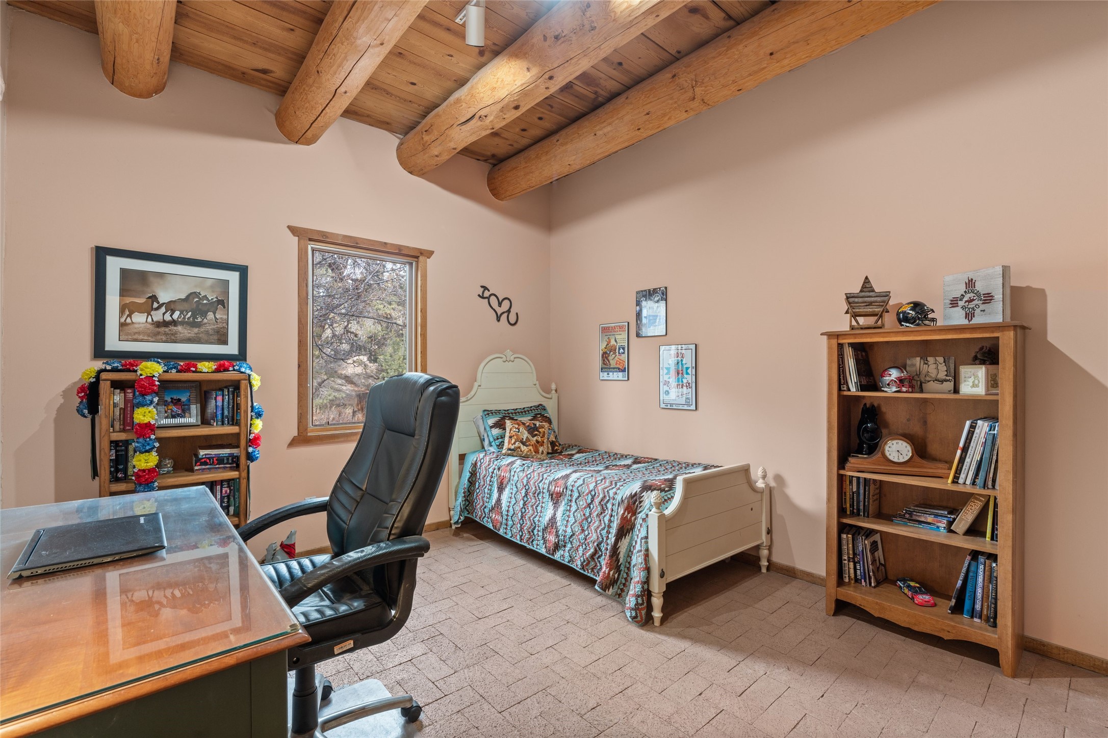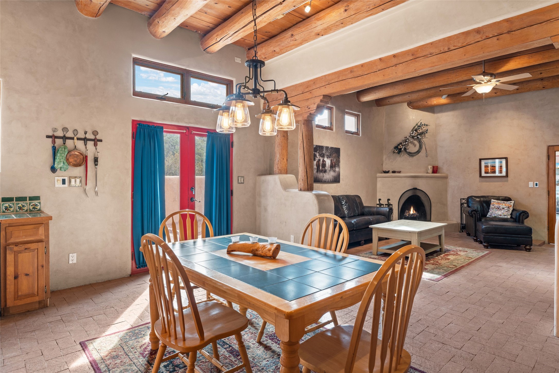 Beautiful, 15 Acre Horse Property nestled within a cozy valley surrounded by trees and boulder outcroppings, with main house & detached guest casita situated close to riding trails and just a 20 minute drive to Santa Fe. "Casa Caballos del Canoncito" offers Horse Lovers a spacious single level main house with traditional Santa Fe Style features and finishes: Vigas and Beams, Brick and Wood flooring throughout, Talavera tile accents, three bedrooms, two baths, spacious living areas, and an open concept 'great room' with Kitchen and Dining for family and friends to gather. Warm colored plaster walls, high ceilings, three fireplaces, skylights, and multiple living areas offer flexible entertaining and relaxation spaces and are highlights of the home. The detached Guest Casita has its own entrance, kitchen, full sized living area with fireplace, and a full bath. Horse Facilities include: 4 stall barn (up to 6 horses are allowed), turn out, arena with split pipe fencing, two storage sheds for tack, hay. There is a private and separate driveway to access the stables and park a large trailer if needed. Private well, forced air heat in Main House, electric baseboard in Guest House. Nearby access to rural riding trails from the property.