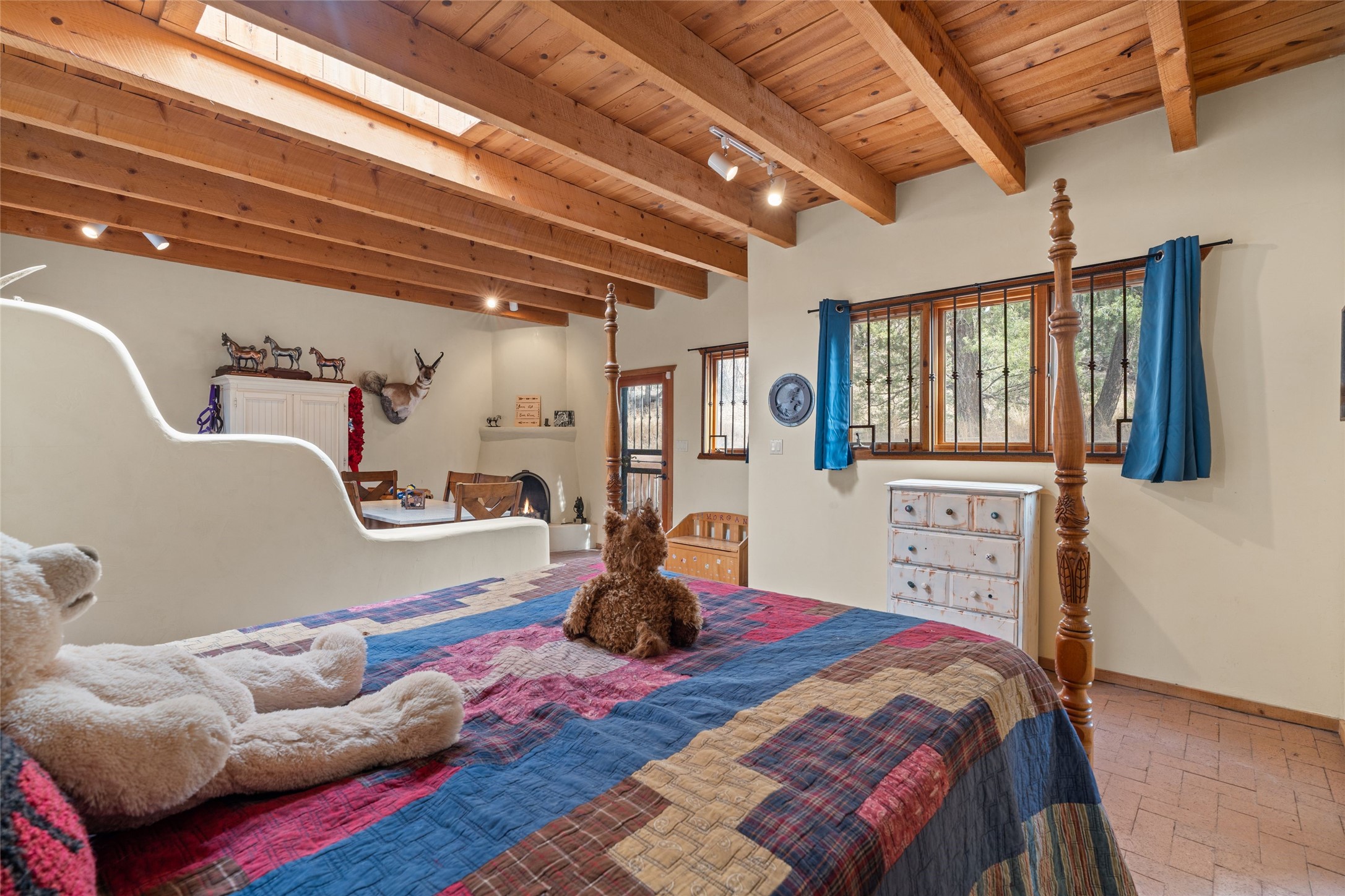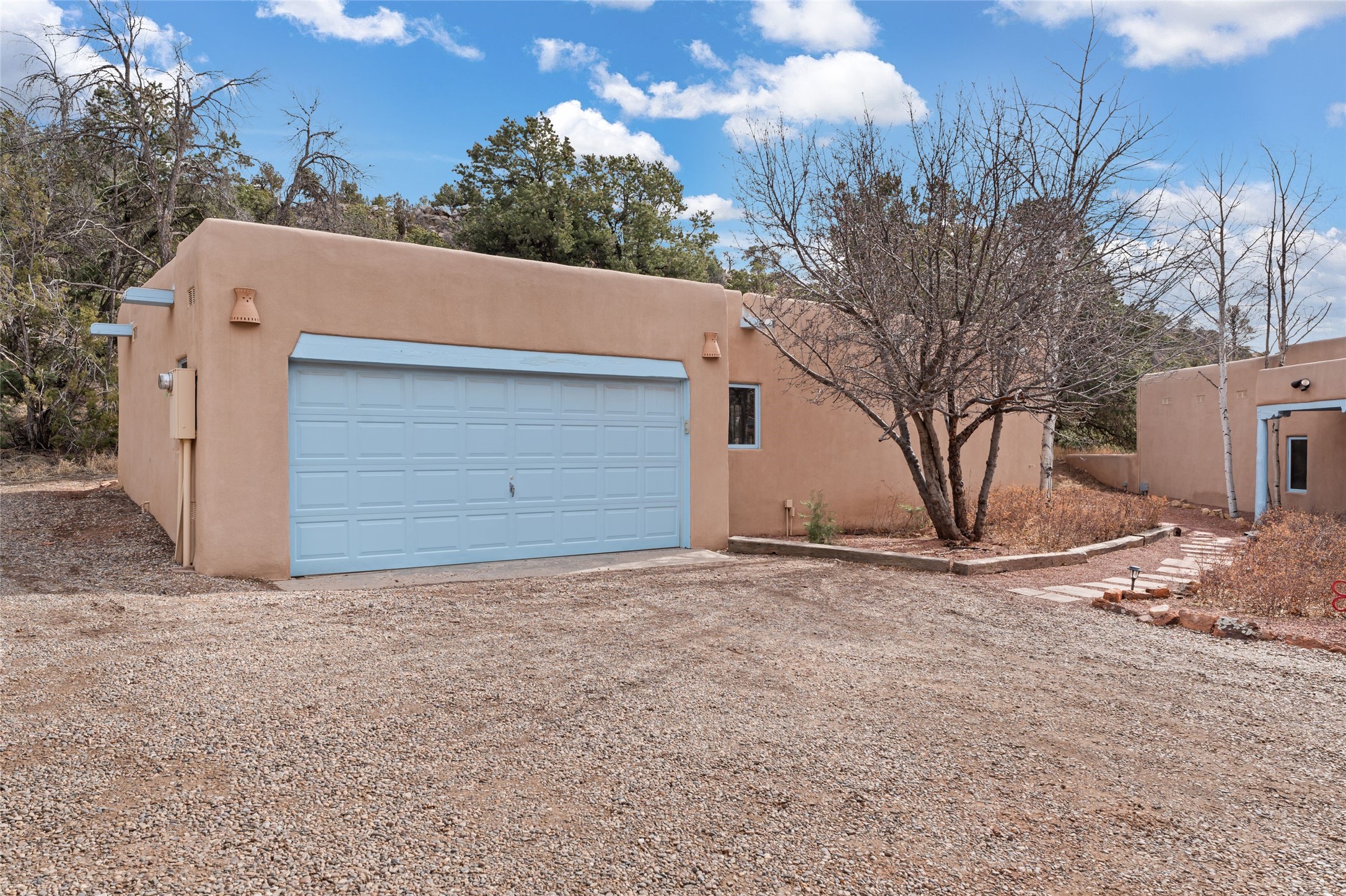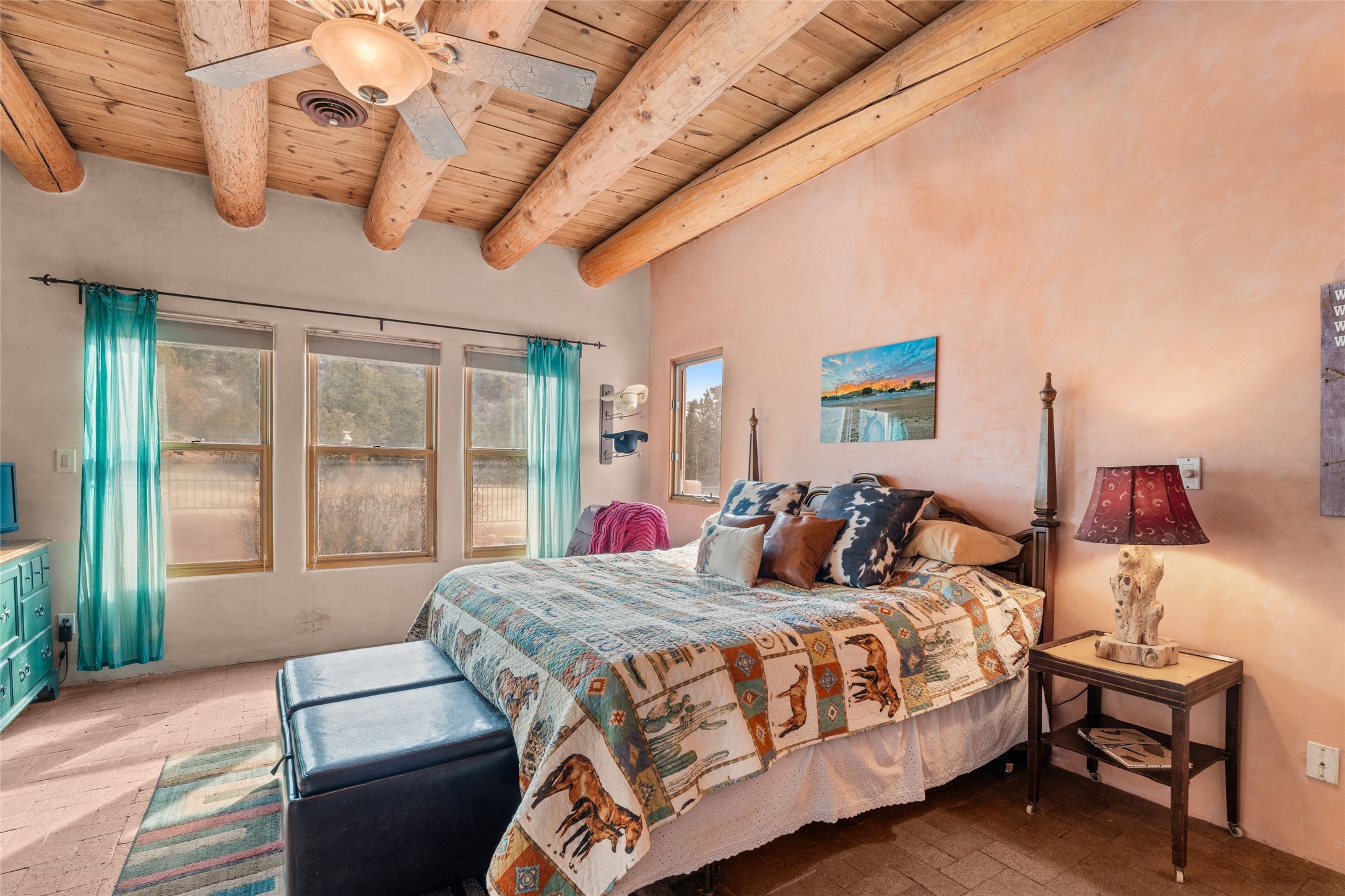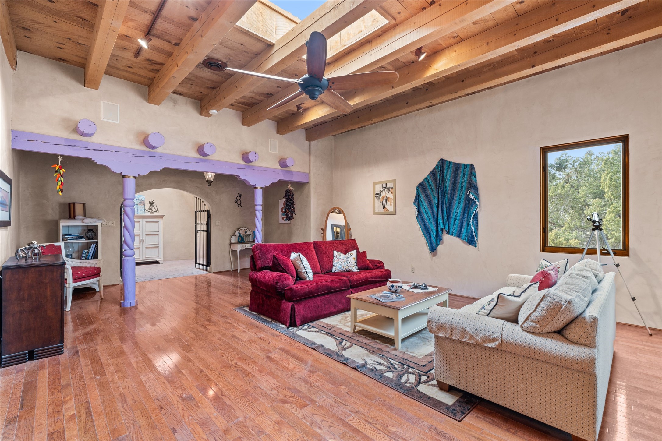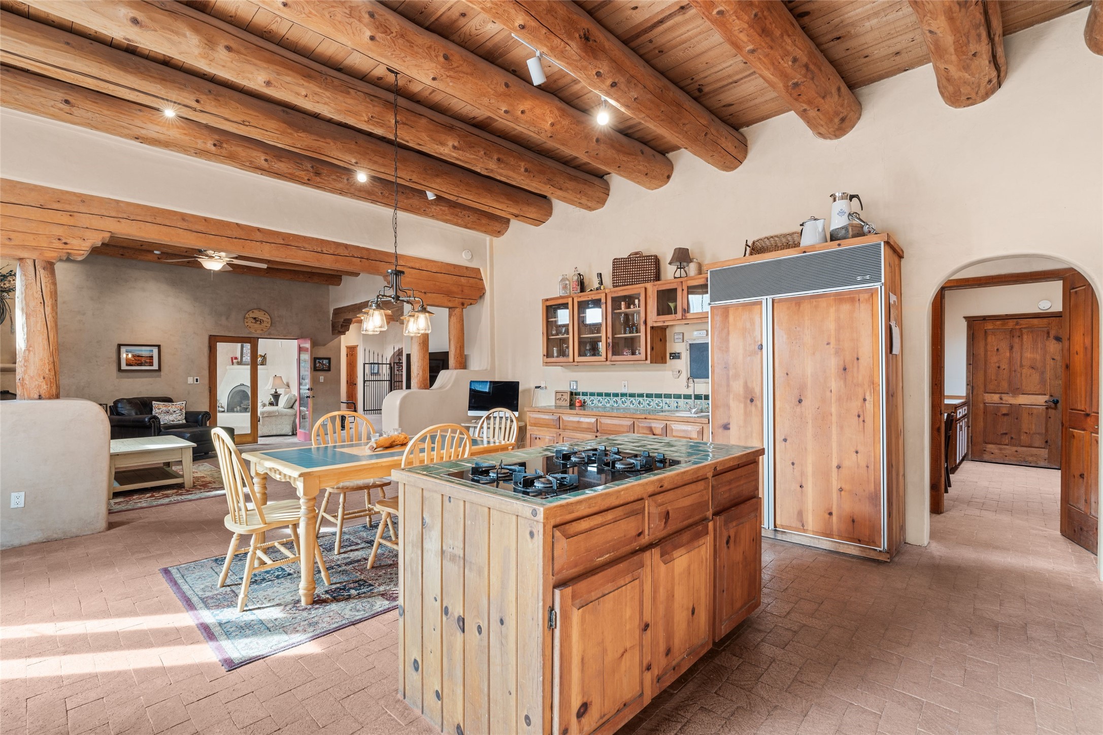 Beautiful, 15 Acre Horse Property nestled within a cozy valley surrounded by trees and boulder outcroppings, with main house & detached guest casita situated close to riding trails and just a 20 minute drive to Santa Fe. "Casa Caballos del Canoncito" offers Horse Lovers a spacious single level main house with traditional Santa Fe Style features and finishes: Vigas and Beams, Brick and Wood flooring throughout, Talavera tile accents, three bedrooms, two baths, spacious living areas, and an open concept 'great room' with Kitchen and Dining for family and friends to gather. Warm colored plaster walls, high ceilings, three fireplaces, skylights, and multiple living areas offer flexible entertaining and relaxation spaces and are highlights of the home. The detached Guest Casita has its own entrance, kitchen, full sized living area with fireplace, and a full bath. Horse Facilities include: 4 stall barn (up to 6 horses are allowed), turn out, arena with split pipe fencing, two storage sheds for tack, hay. There is a private and separate driveway to access the stables and park a large trailer if needed. Private well, forced air heat in Main House, electric baseboard in Guest House. Nearby access to rural riding trails from the property.
