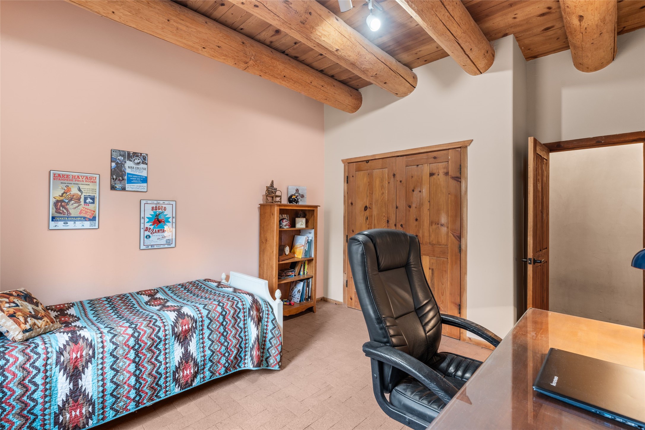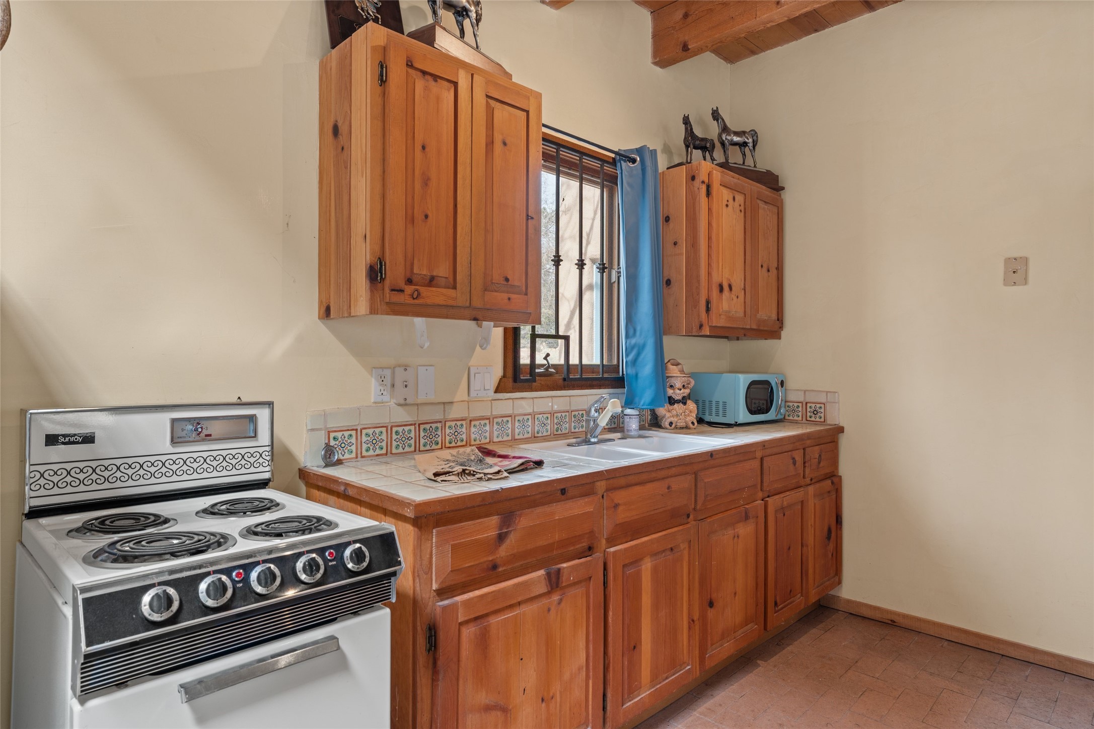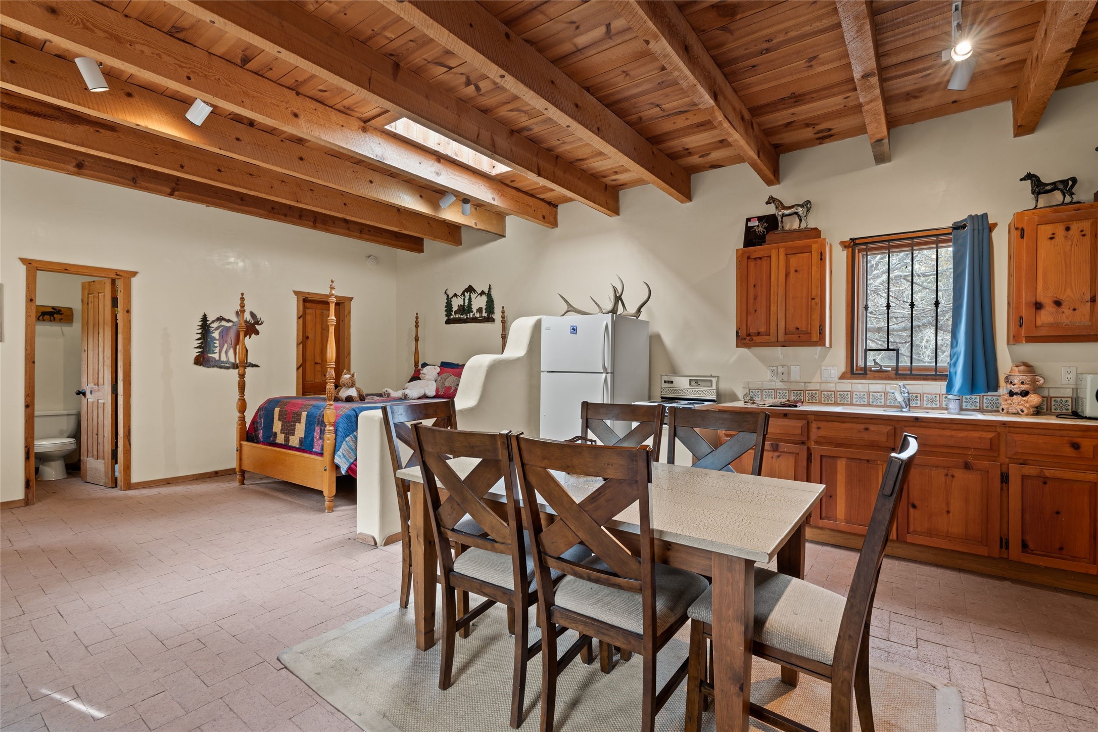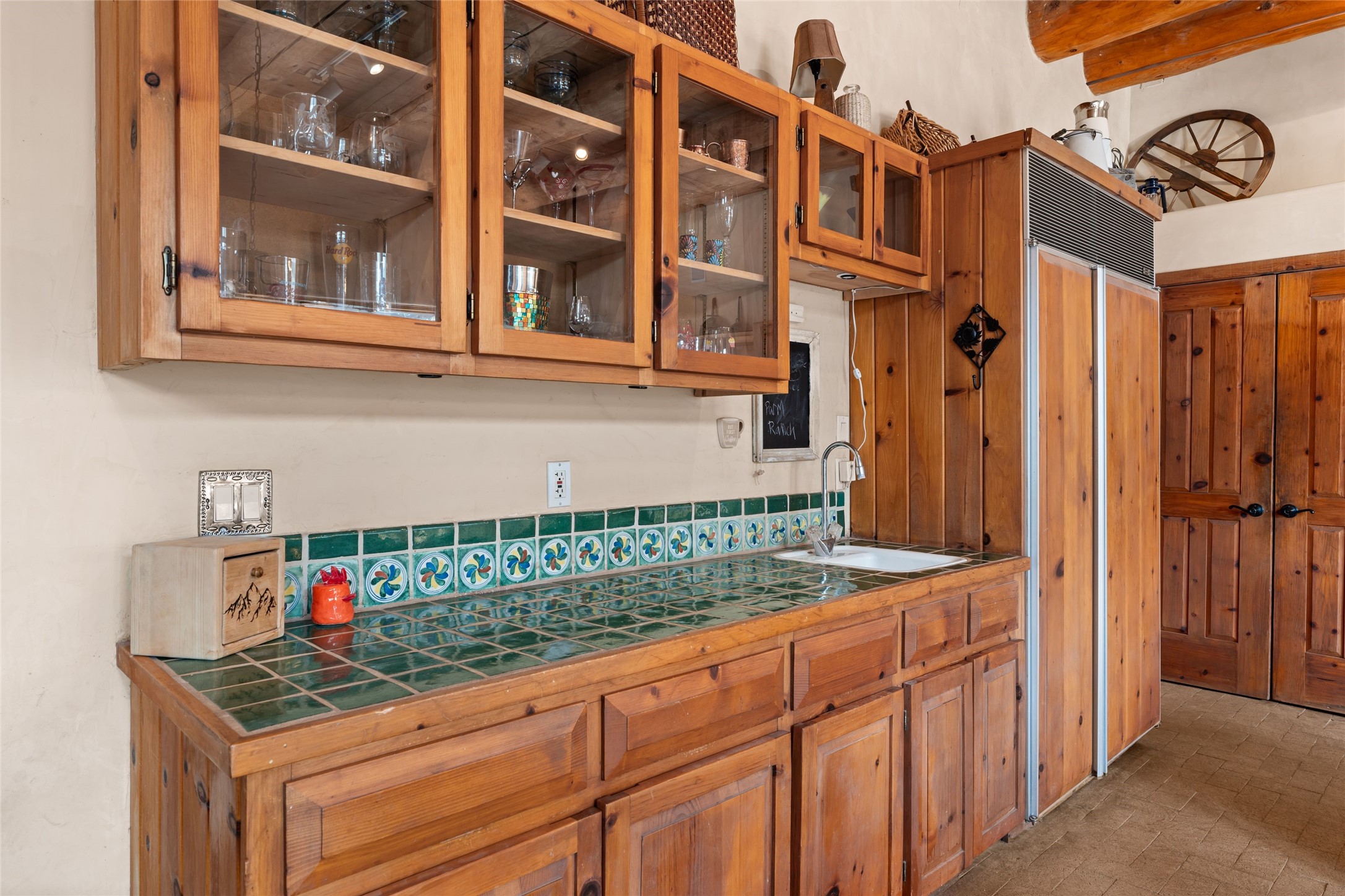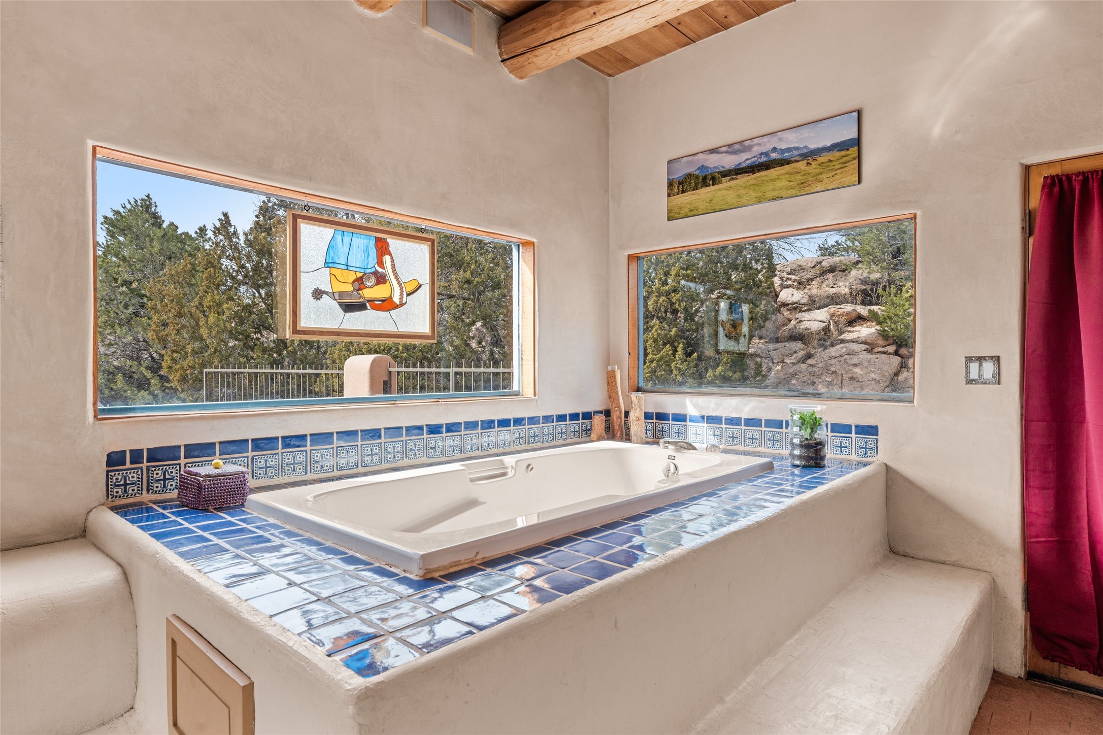Beautiful, 15 Acre Horse Property nestled within a cozy valley surrounded by trees and boulder outcroppings, with main house & detached guest casita situated close to riding trails and just a 20 minute drive to Santa Fe. "Casa Caballos del Canoncito" offers Horse Lovers a spacious single level main house with traditional Santa Fe Style features and finishes: Vigas and Beams, Brick and Wood flooring throughout, Talavera tile accents, three bedrooms, two baths, spacious living areas, and an open concept 'great room' with Kitchen and Dining for family and friends to gather. Warm colored plaster walls, high ceilings, three fireplaces, skylights, and multiple living areas offer flexible entertaining and relaxation spaces and are highlights of the home. The detached Guest Casita has its own entrance, kitchen, full sized living area with fireplace, and a full bath. Horse Facilities include: 4 stall barn (up to 6 horses are allowed), turn out, arena with split pipe fencing, two storage sheds for tack, hay. There is a private and separate driveway to access the stables and park a large trailer if needed. Private well, forced air heat in Main House, electric baseboard in Guest House. Nearby access to rural riding trails from the property.