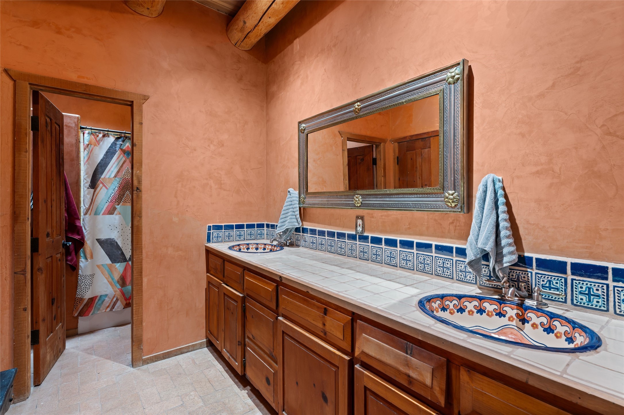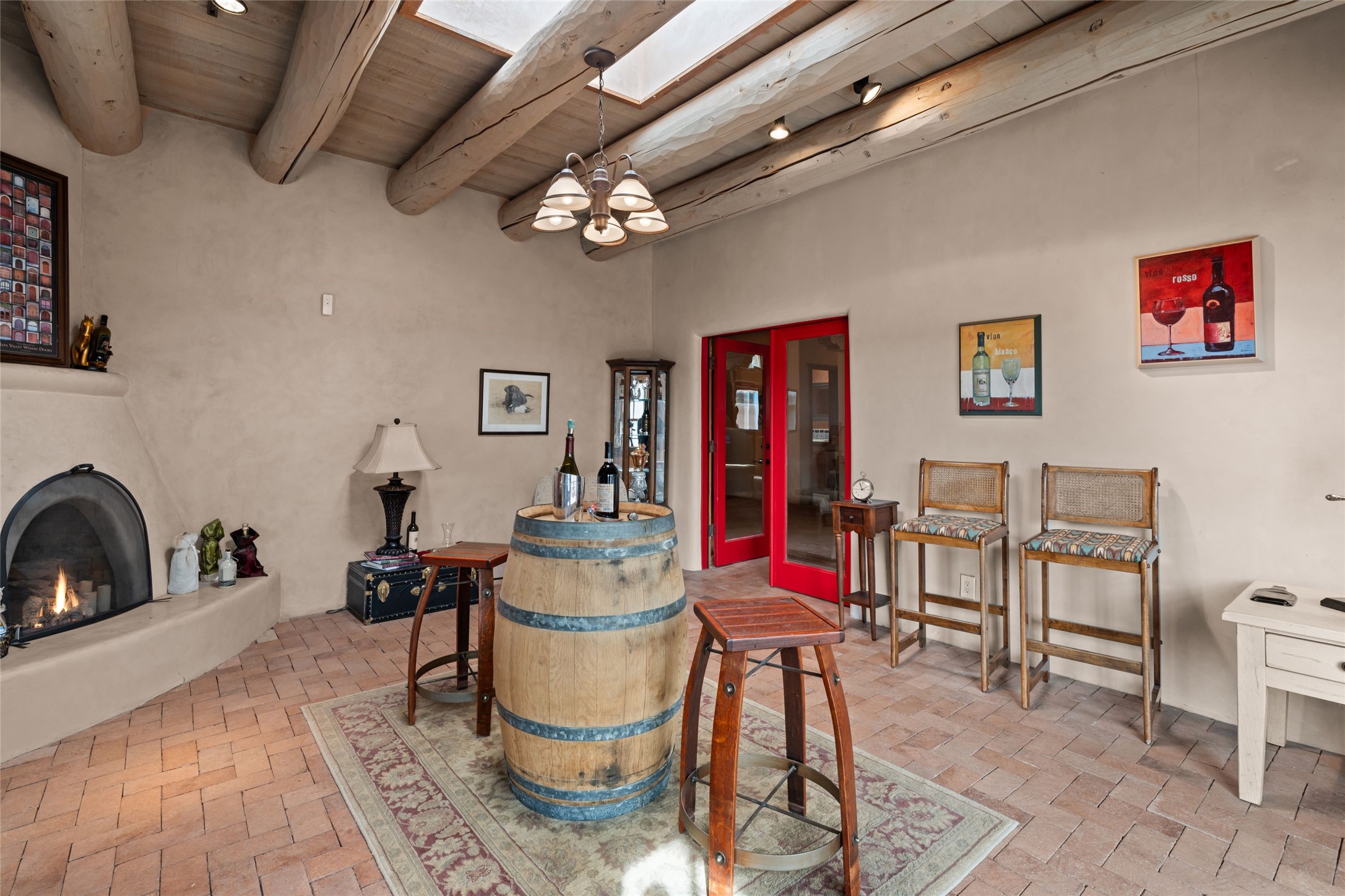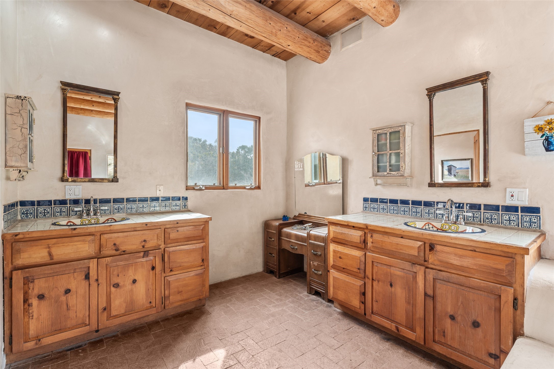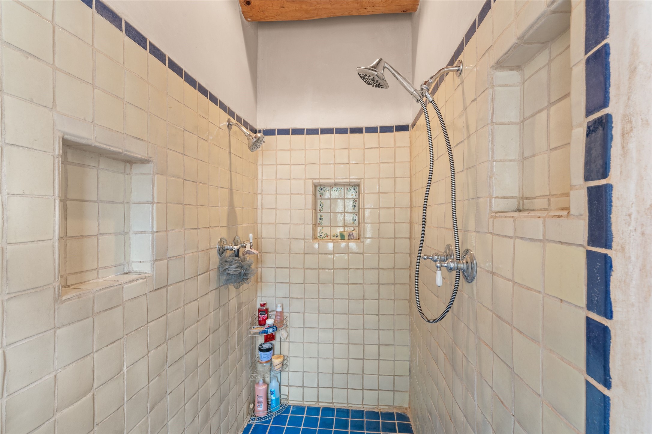 Beautiful, 15 Acre Horse Property nestled within a cozy valley surrounded by trees and boulder outcroppings, with main house & detached guest casita situated close to riding trails and just a 20 minute drive to Santa Fe. "Casa Caballos del Canoncito" offers Horse Lovers a spacious single level main house with traditional Santa Fe Style features and finishes: Vigas and Beams, Brick and Wood flooring throughout, Talavera tile accents, three bedrooms, two baths, spacious living areas, and an open concept 'great room' with Kitchen and Dining for family and friends to gather. Warm colored plaster walls, high ceilings, three fireplaces, skylights, and multiple living areas offer flexible entertaining and relaxation spaces and are highlights of the home. The detached Guest Casita has its own entrance, kitchen, full sized living area with fireplace, and a full bath. Horse Facilities include: 4 stall barn (up to 6 horses are allowed), turn out, arena with split pipe fencing, two storage sheds for tack, hay. There is a private and separate driveway to access the stables and park a large trailer if needed. Private well, forced air heat in Main House, electric baseboard in Guest House. Nearby access to rural riding trails from the property.