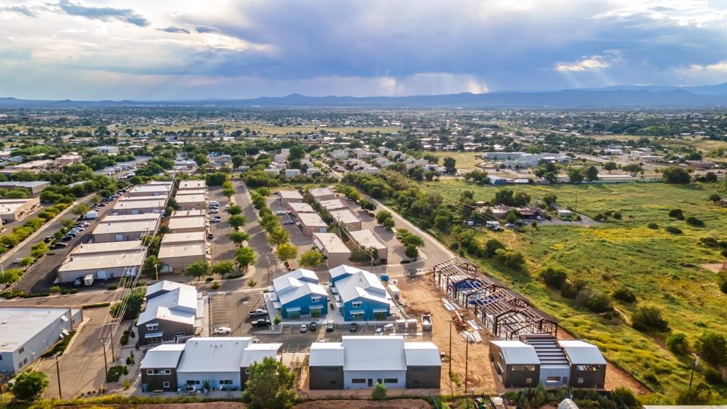 The Studios at Parkway Phase 2, currently under construction, is Santa Fe's newest commercial, industrial, and flex-use condominium development in the thriving Siler/Rufina Warehouse, Art & Innovation District.Designed with an industrial aesthetic, The Studios offer open, light-filled spaces with contemporary touches that create an inspiring environment for business. Each unit spans nearly 1,677 square feet, including 1,587 square feet of interior space ("walls in"), and features tall ceilings, large aluminum glass roll-up garage doors, expansive storefront windows, and finished concrete floors. Inside, you'll find LED lighting, handcrafted steel staircases with wood treads, and smooth drywall finishes. The ground floor encompasses 1,092 square feet, while the second story adds 584 square feet.These units are designed with flexibility in mind, with an option for Live-Work as an accessory to commercial use. Each unit has separately metered utilities, kitchen-ready hookups, a designated area for a shower, and thoughtfully landscaped grounds tailored for shipping and receiving. Zoned I-1, these state-of-the-art condominiums are suitable for a range of uses, from offices, galleries, and artist studios to warehouses, wellness businesses, and light industry. Additionally, the roof is prepared for solar PV installation, and the property is located in a Federal Opportunity Zone.