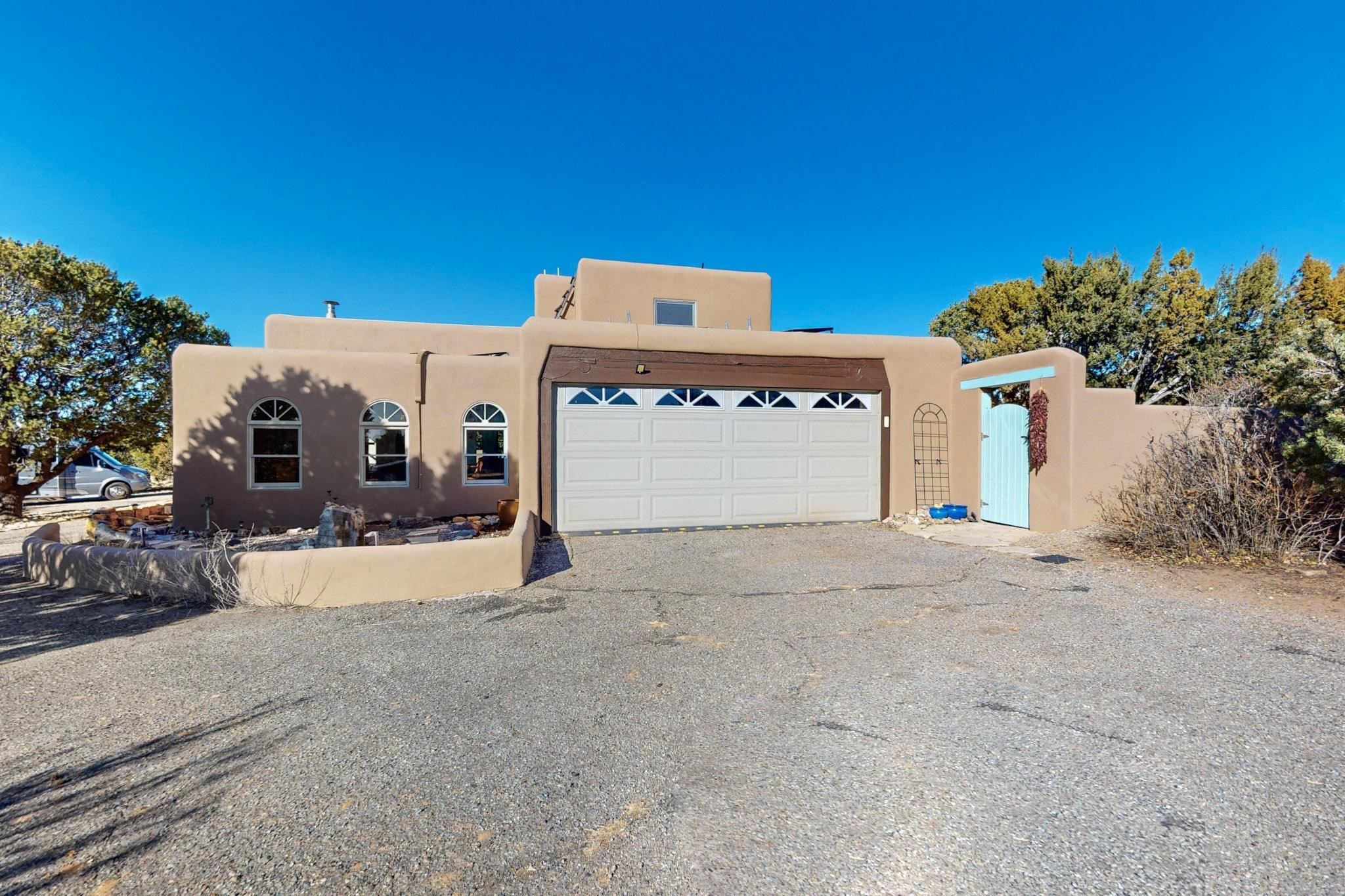 New roof, new stucco including the walls in 2023, new 4 Minisplits, a new total house filter system and new hot water heater in 2023. 22 owned solar panels seriously minimize the electric bills.On a cul de sac in a remarkably private setting stands this romantic pueblo/spanish style hacienda. If you saw it before, just wait til you see it now! Fabulously refreshed throughout this flexible 2 story floor plan accommodates 4 bedrooms, 4 baths. The owners suite and an extra bedroom are on the main floor with two additional guest bedrooms and bath upstairs. The large Kiva room has an additional office/den area and ideal for many purposes-studio, work, playroom or music. An ideal large entertainers kitchen with a central cooking island, large walk in pantry and separate laundry with sink. The dramatic great room with central massive stone gas fireplace flows to the elegant party dining room. There is a mountain view deck for sunsets and two private patios and garden. The 2 car garage is accessed by a paved driveway with loads of extra parking. Even the grounds have been carefully groomed against fire yet maintaining the rural wildlife refuge. Easy paved road access to both Eldorado amenities and local shopping and services, only minutes into Santa Fe. Wow, a must see!