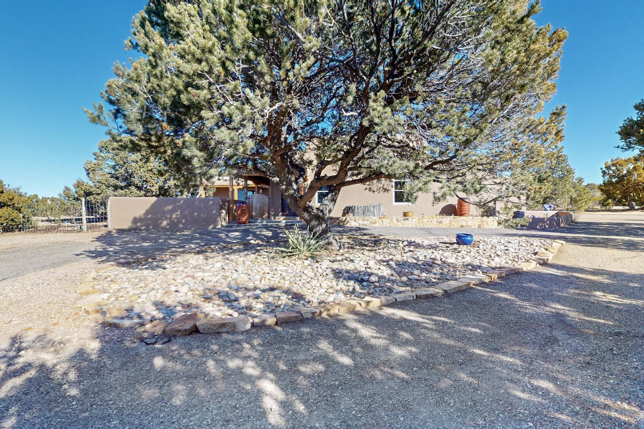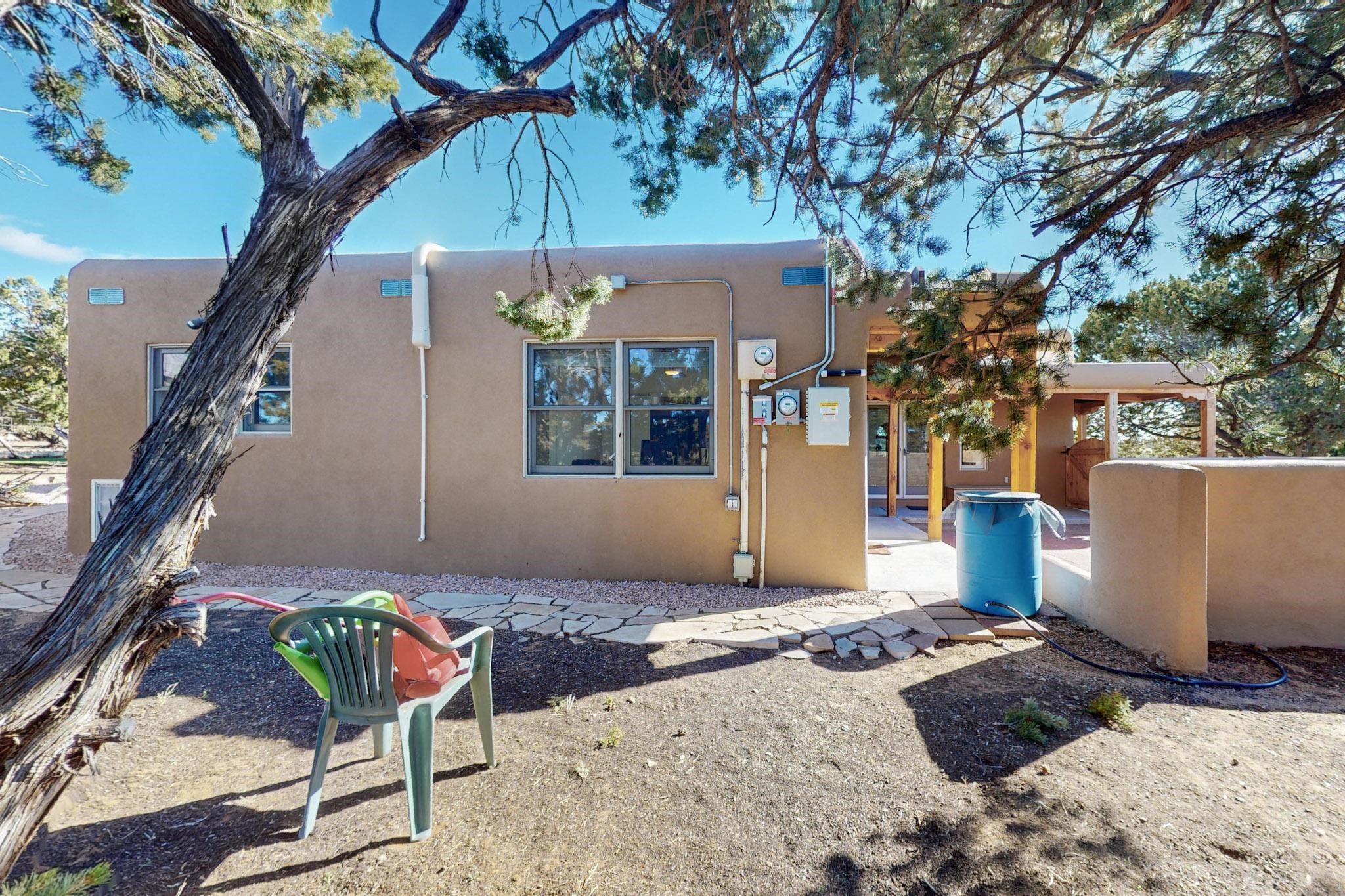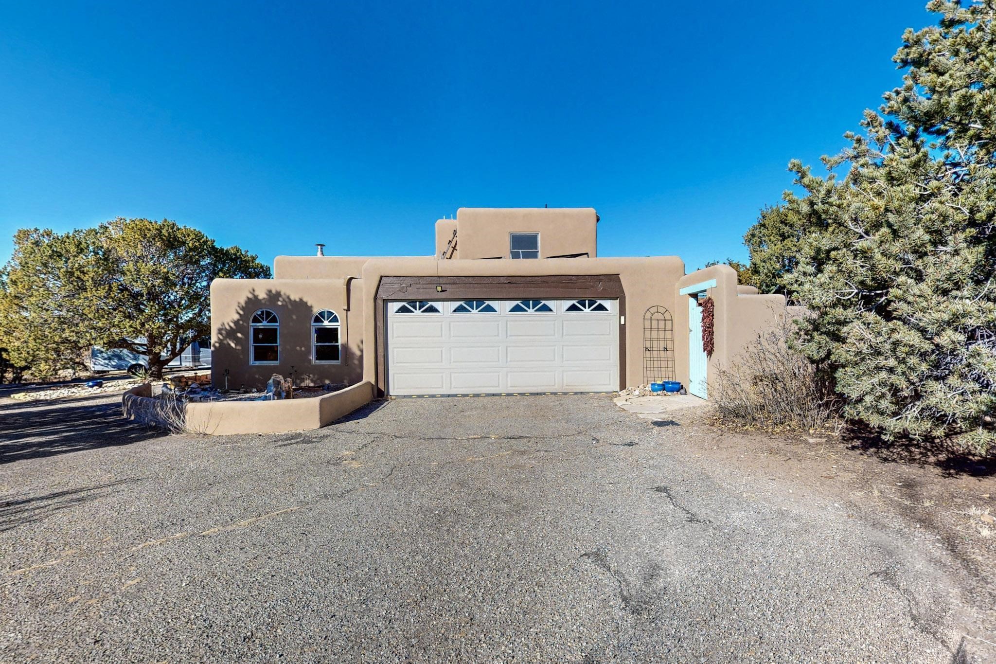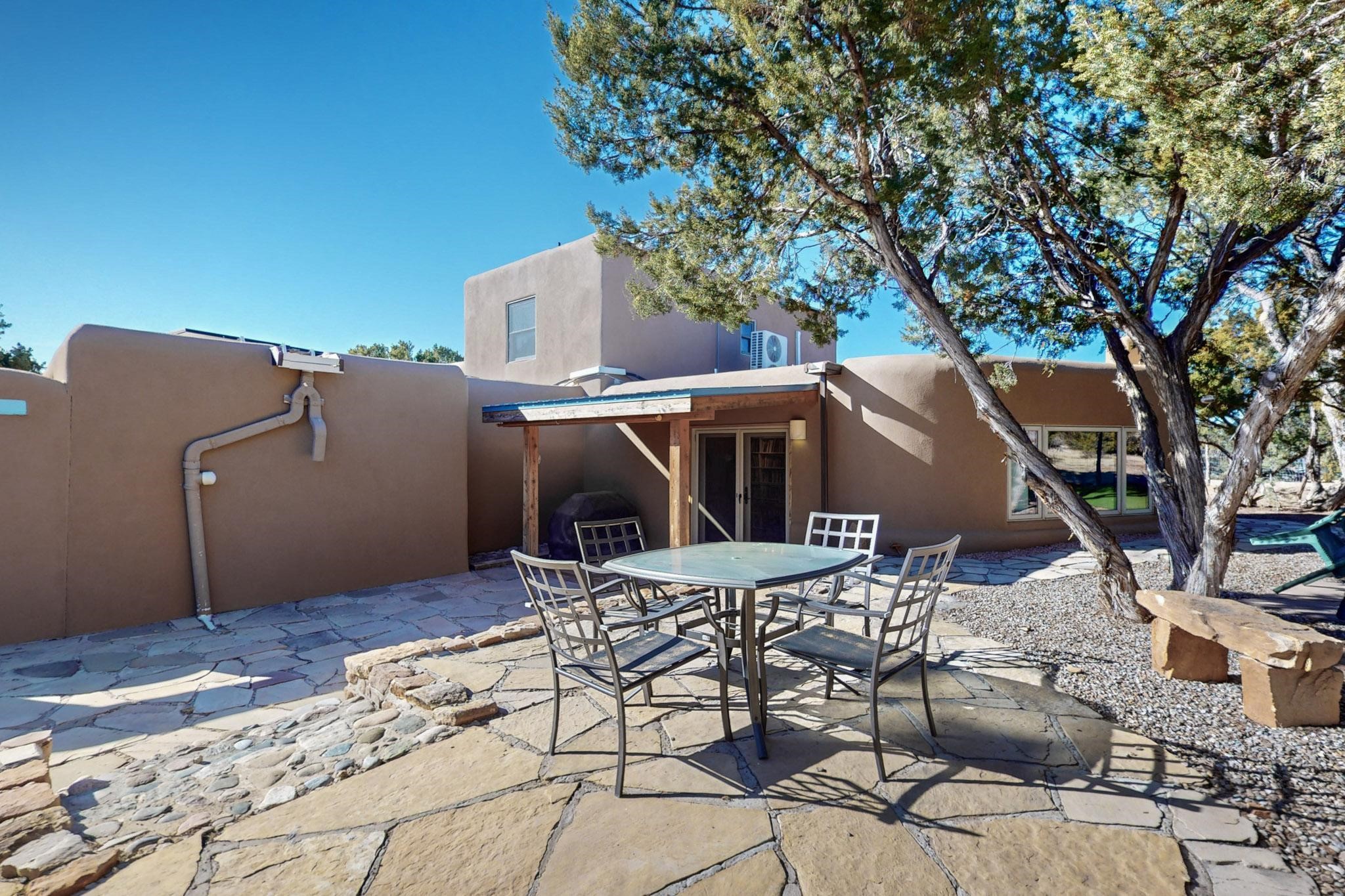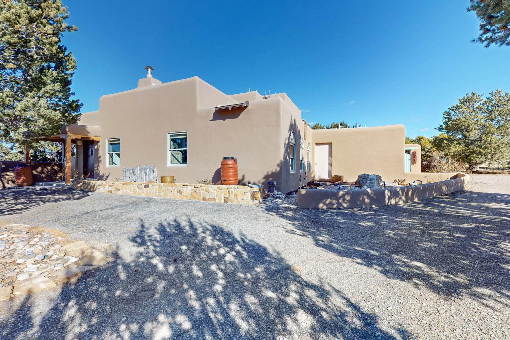 New roof, new stucco including the walls in 2023, new 4 Minisplits, a new total house filter system and new hot water heater in 2023. 22 owned solar panels seriously minimize the electric bills.On a cul de sac in a remarkably private setting stands this romantic pueblo/spanish style hacienda. If you saw it before, just wait til you see it now! Fabulously refreshed throughout this flexible 2 story floor plan accommodates 4 bedrooms, 4 baths. The owners suite and an extra bedroom are on the main floor with two additional guest bedrooms and bath upstairs. The large Kiva room has an additional office/den area and ideal for many purposes-studio, work, playroom or music. An ideal large entertainers kitchen with a central cooking island, large walk in pantry and separate laundry with sink. The dramatic great room with central massive stone gas fireplace flows to the elegant party dining room. There is a mountain view deck for sunsets and two private patios and garden. The 2 car garage is accessed by a paved driveway with loads of extra parking. Even the grounds have been carefully groomed against fire yet maintaining the rural wildlife refuge. Easy paved road access to both Eldorado amenities and local shopping and services, only minutes into Santa Fe. Wow, a must see!