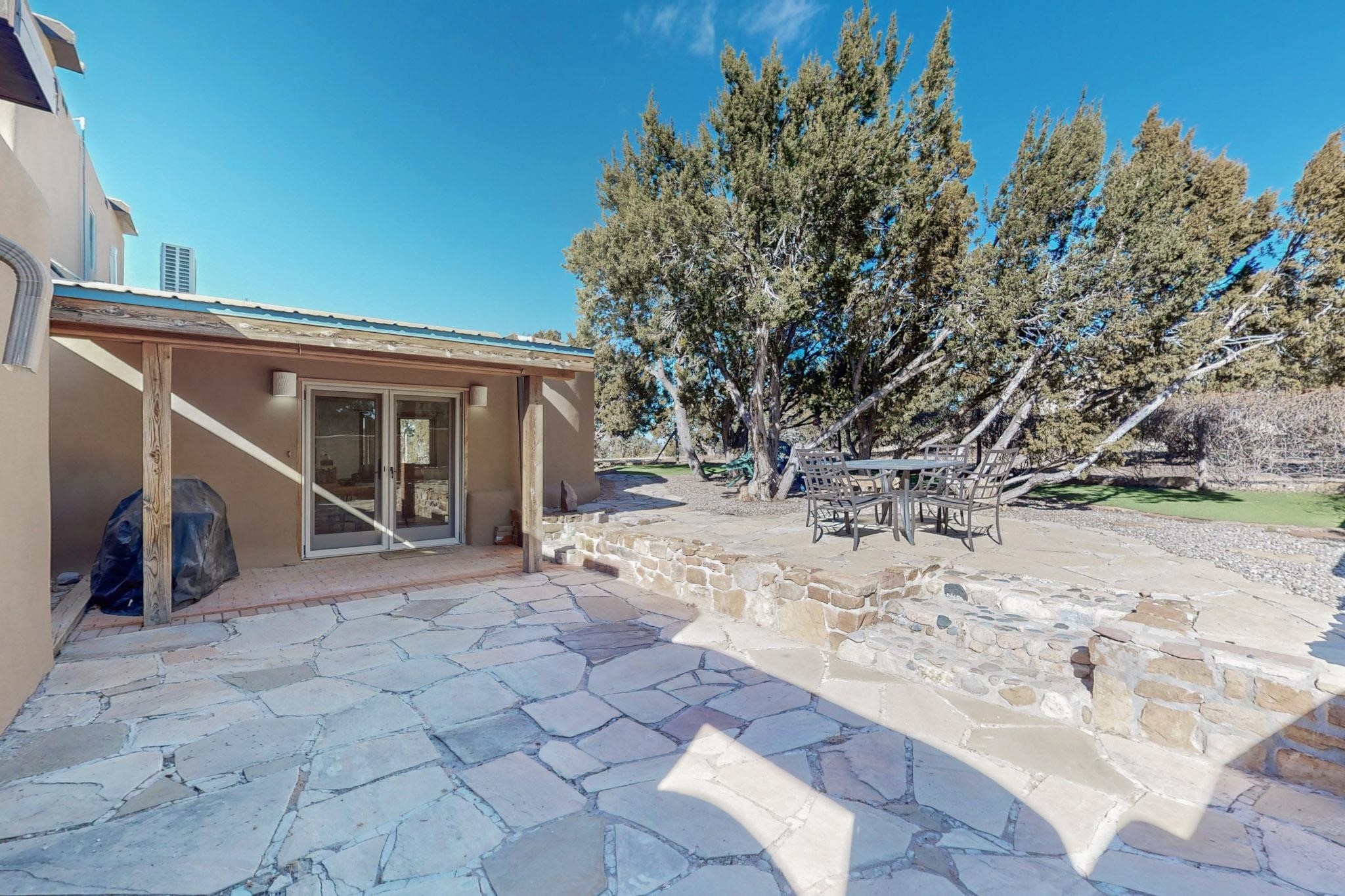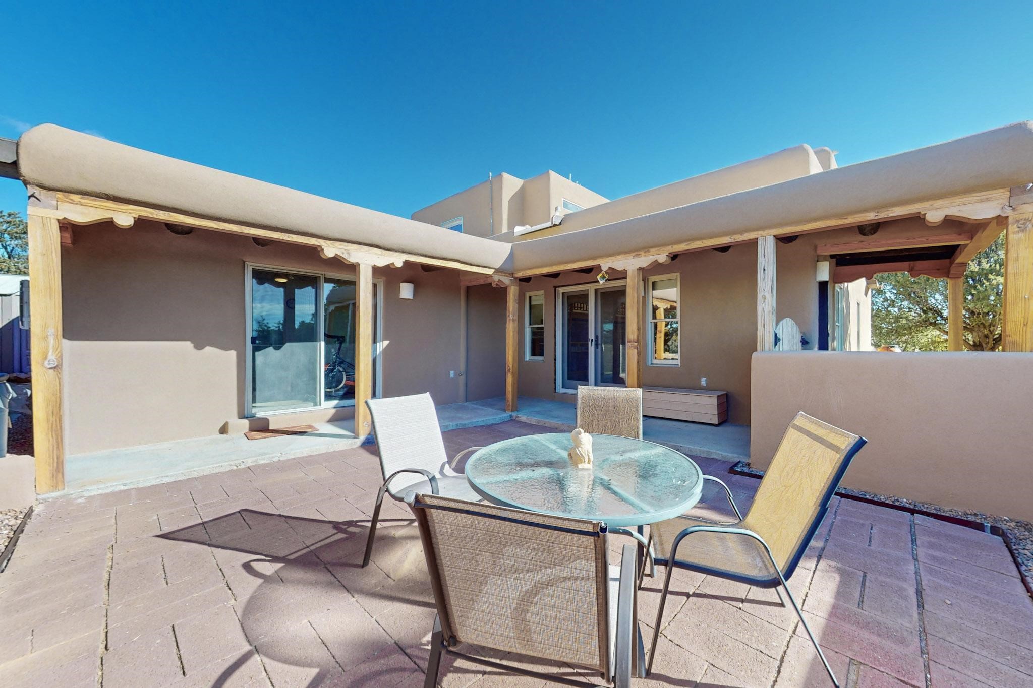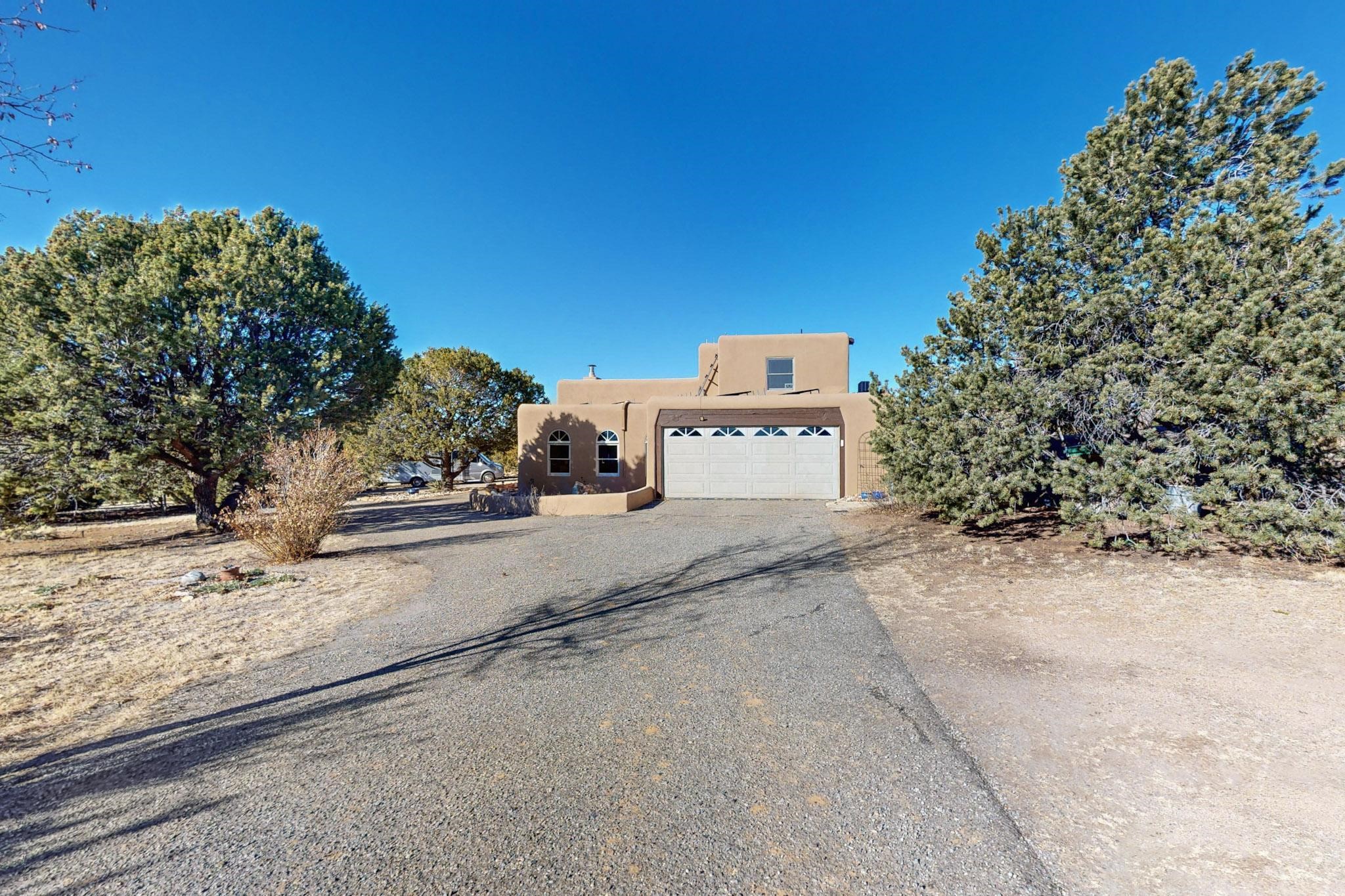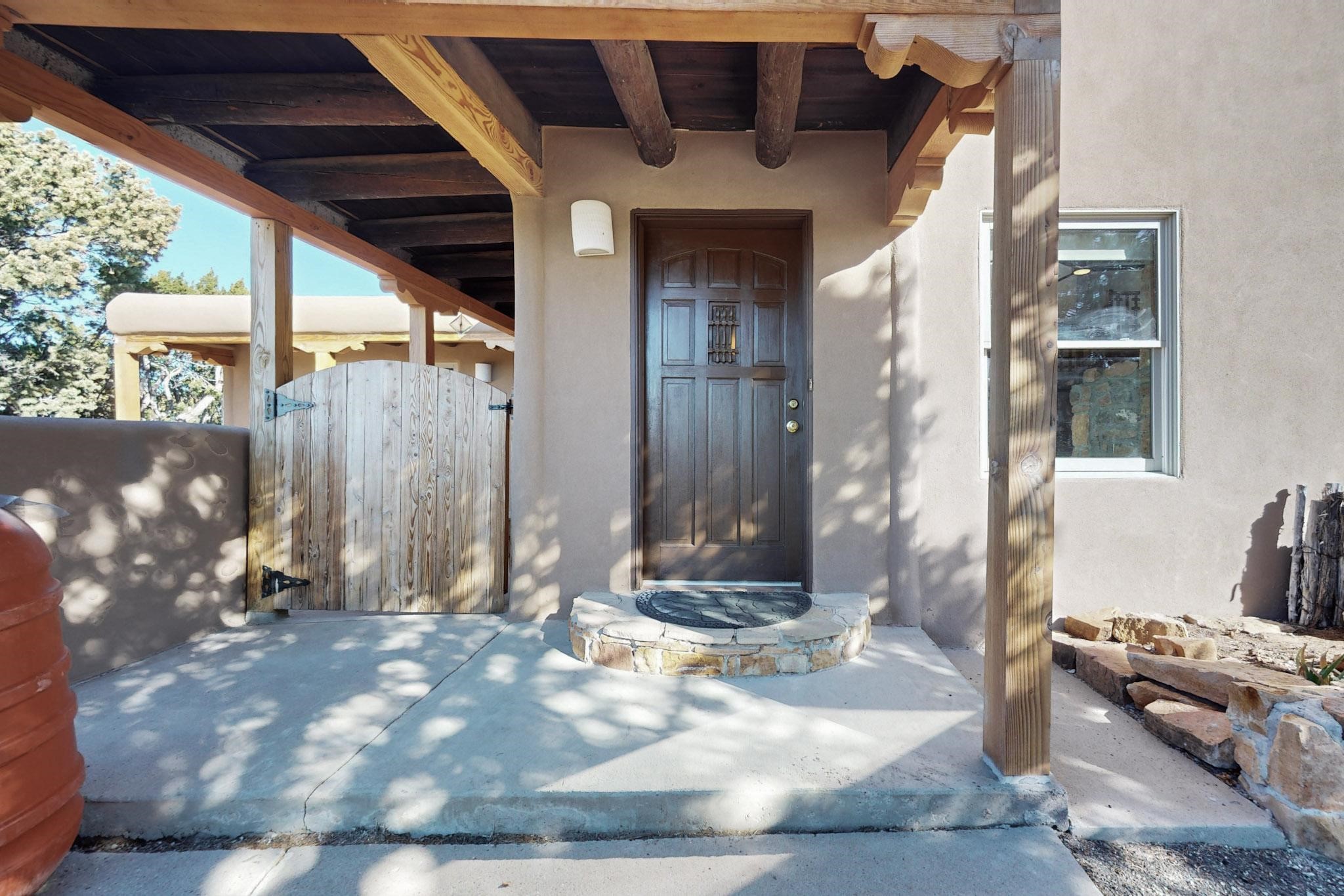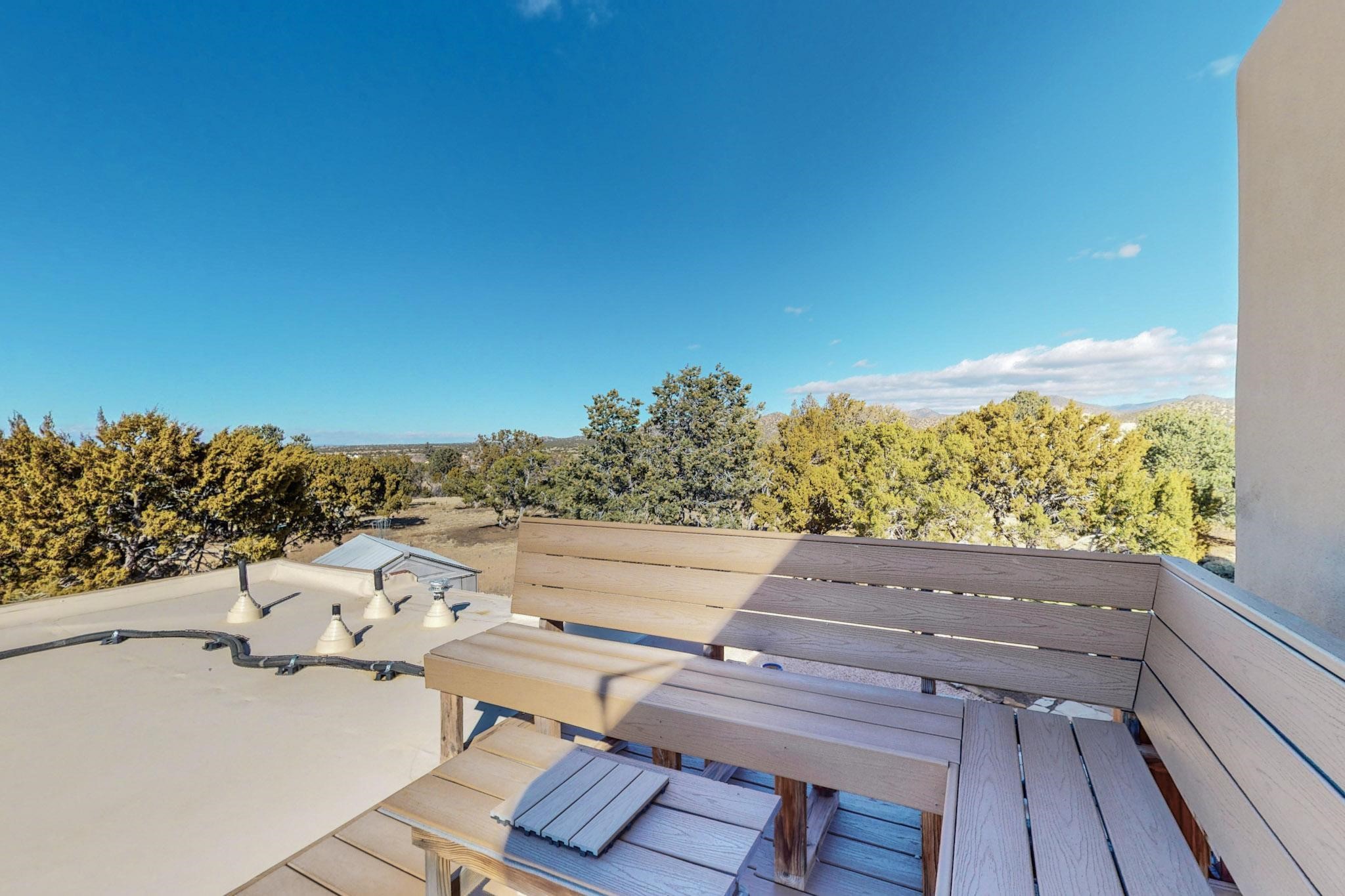 New roof, new stucco including the walls in 2023, new 4 Minisplits, a new total house filter system and new hot water heater in 2023. 22 owned solar panels seriously minimize the electric bills.On a cul de sac in a remarkably private setting stands this romantic pueblo/spanish style hacienda. If you saw it before, just wait til you see it now! Fabulously refreshed throughout this flexible 2 story floor plan accommodates 4 bedrooms, 4 baths. The owners suite and an extra bedroom are on the main floor with two additional guest bedrooms and bath upstairs. The large Kiva room has an additional office/den area and ideal for many purposes-studio, work, playroom or music. An ideal large entertainers kitchen with a central cooking island, large walk in pantry and separate laundry with sink. The dramatic great room with central massive stone gas fireplace flows to the elegant party dining room. There is a mountain view deck for sunsets and two private patios and garden. The 2 car garage is accessed by a paved driveway with loads of extra parking. Even the grounds have been carefully groomed against fire yet maintaining the rural wildlife refuge. Easy paved road access to both Eldorado amenities and local shopping and services, only minutes into Santa Fe. Wow, a must see!